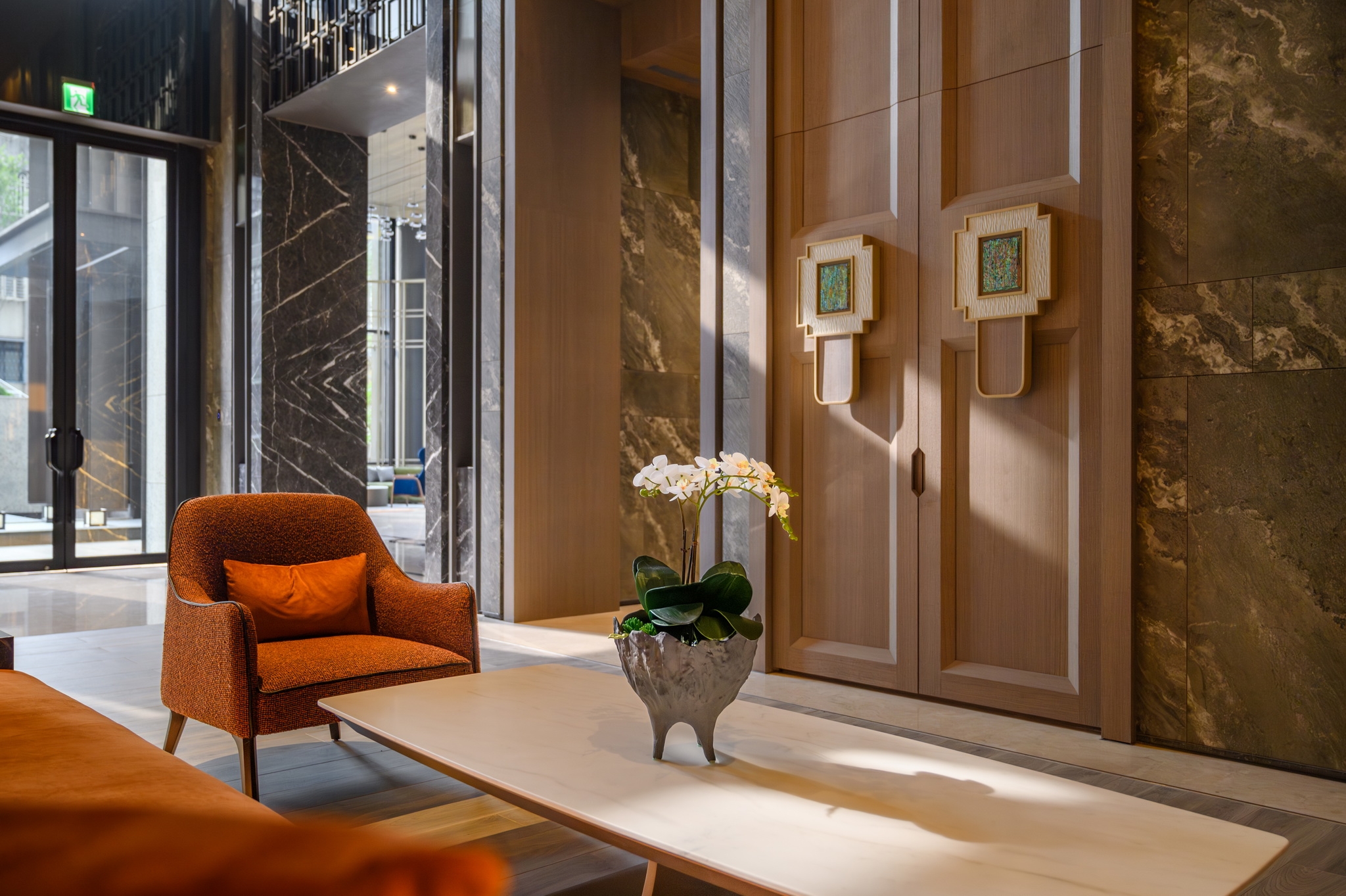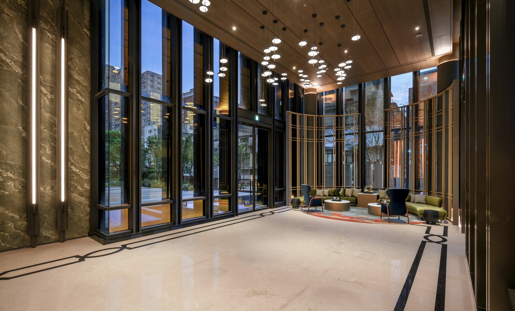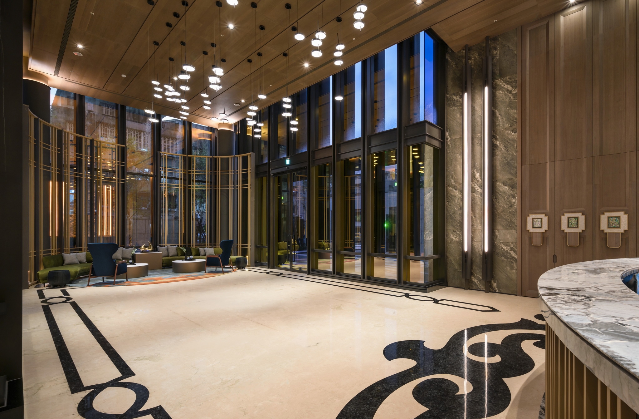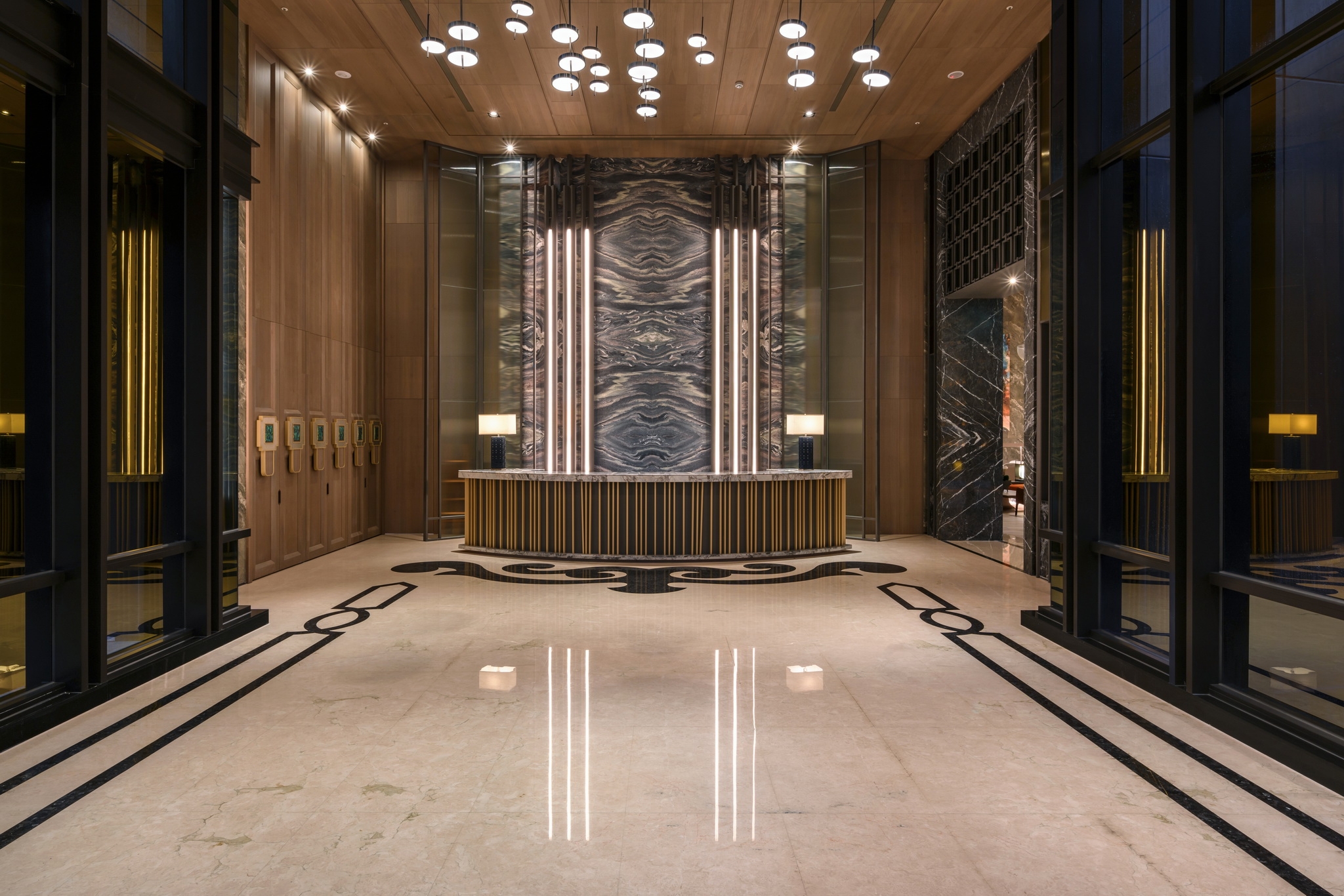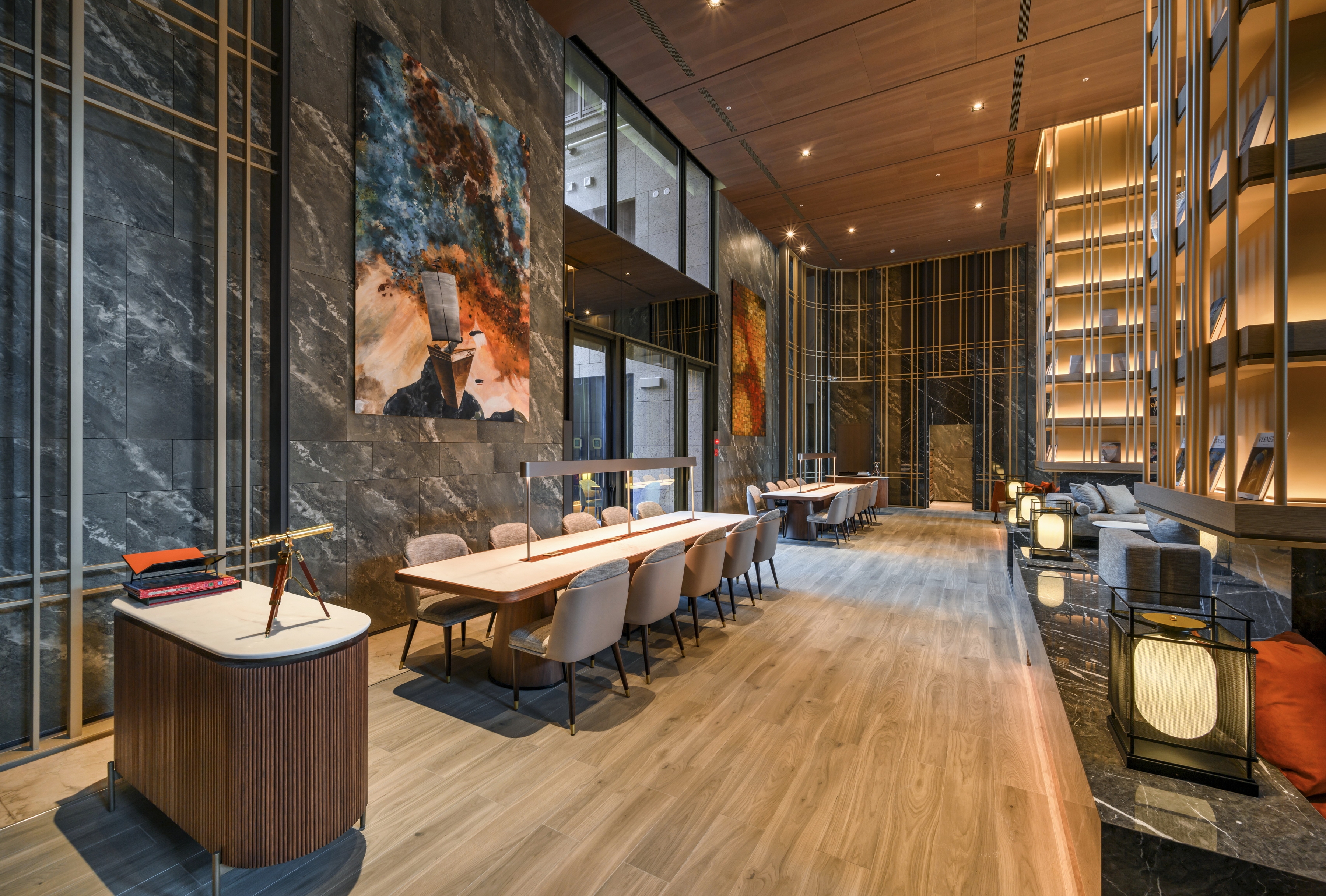 In the Nautical Chart Lobby, a carpet unfurls like a treasure map. Behind the reception desk, a feature wall themed on "ballast stones" is inlaid with flowing lights. Above, lens-like sculptures reminiscent of Renaissance explorers hang in midair, their curious gaze brimming with anticipation.