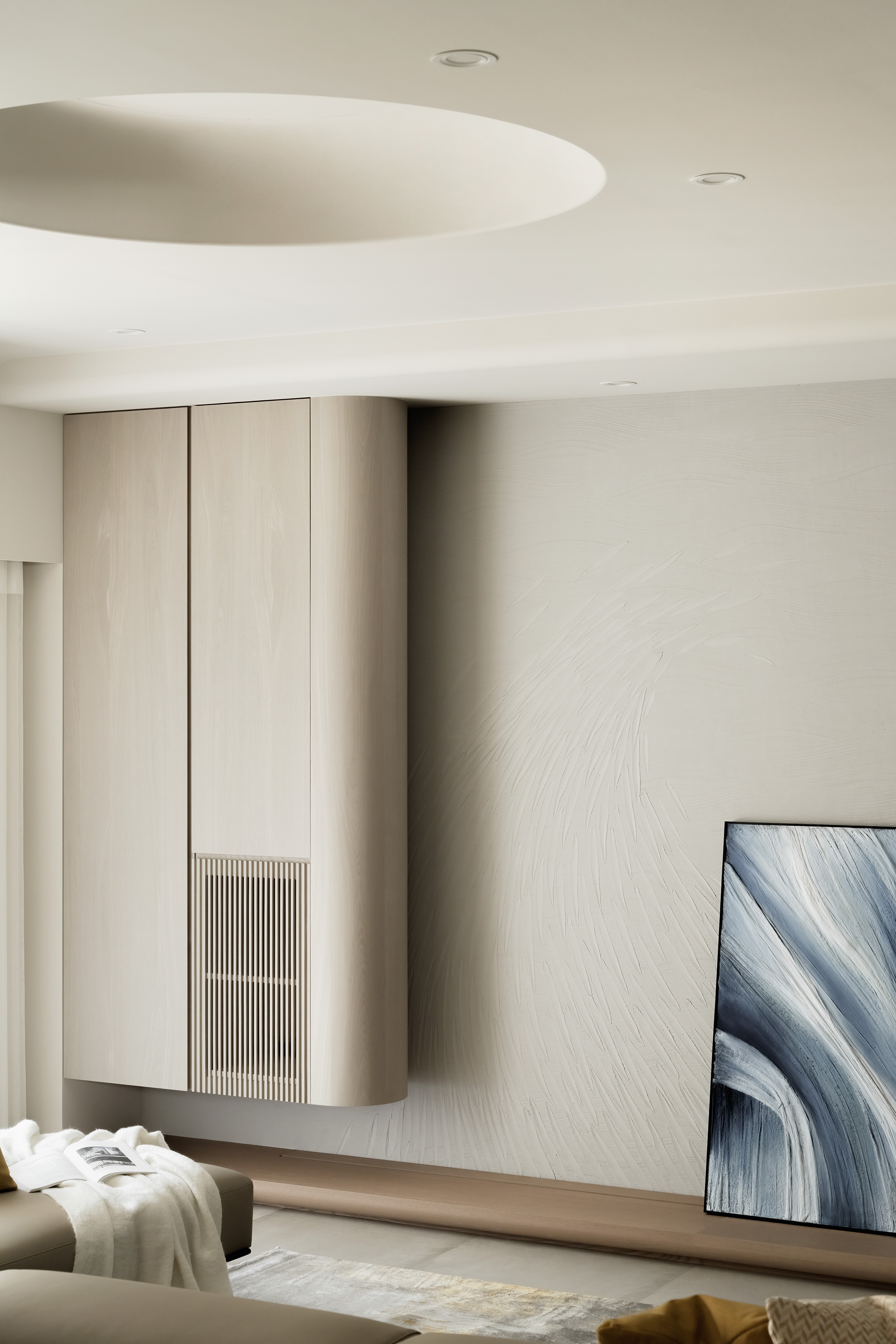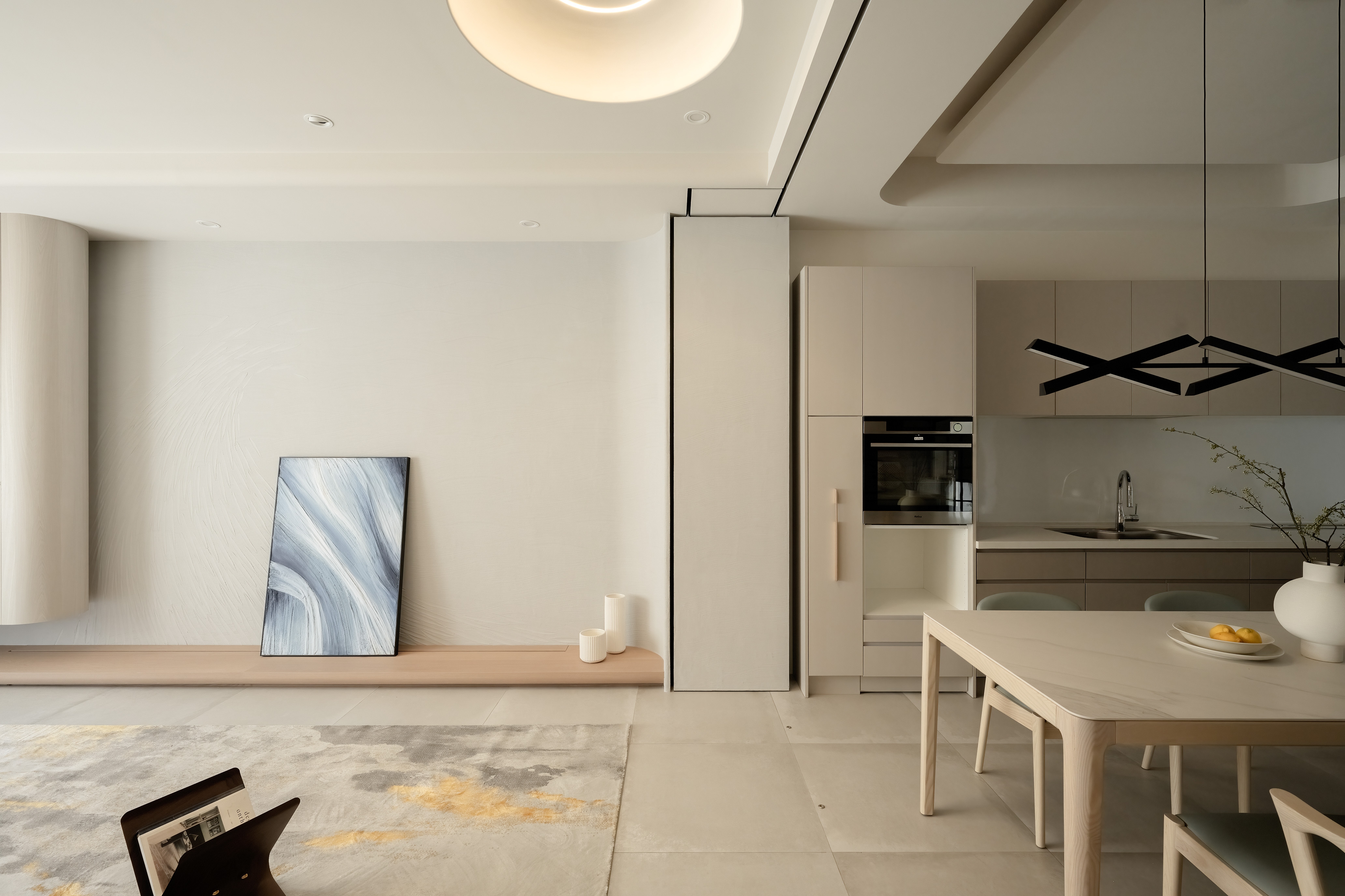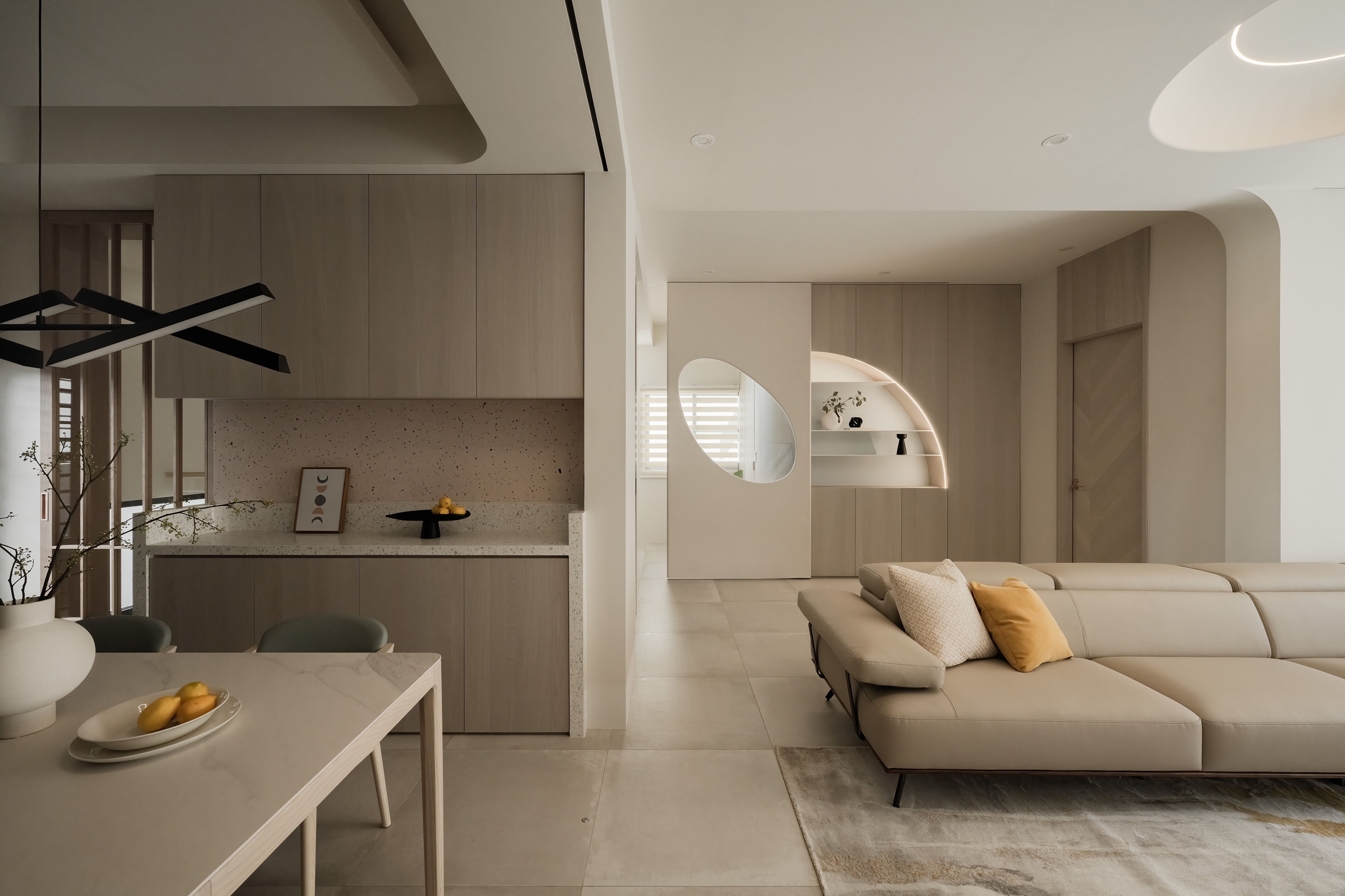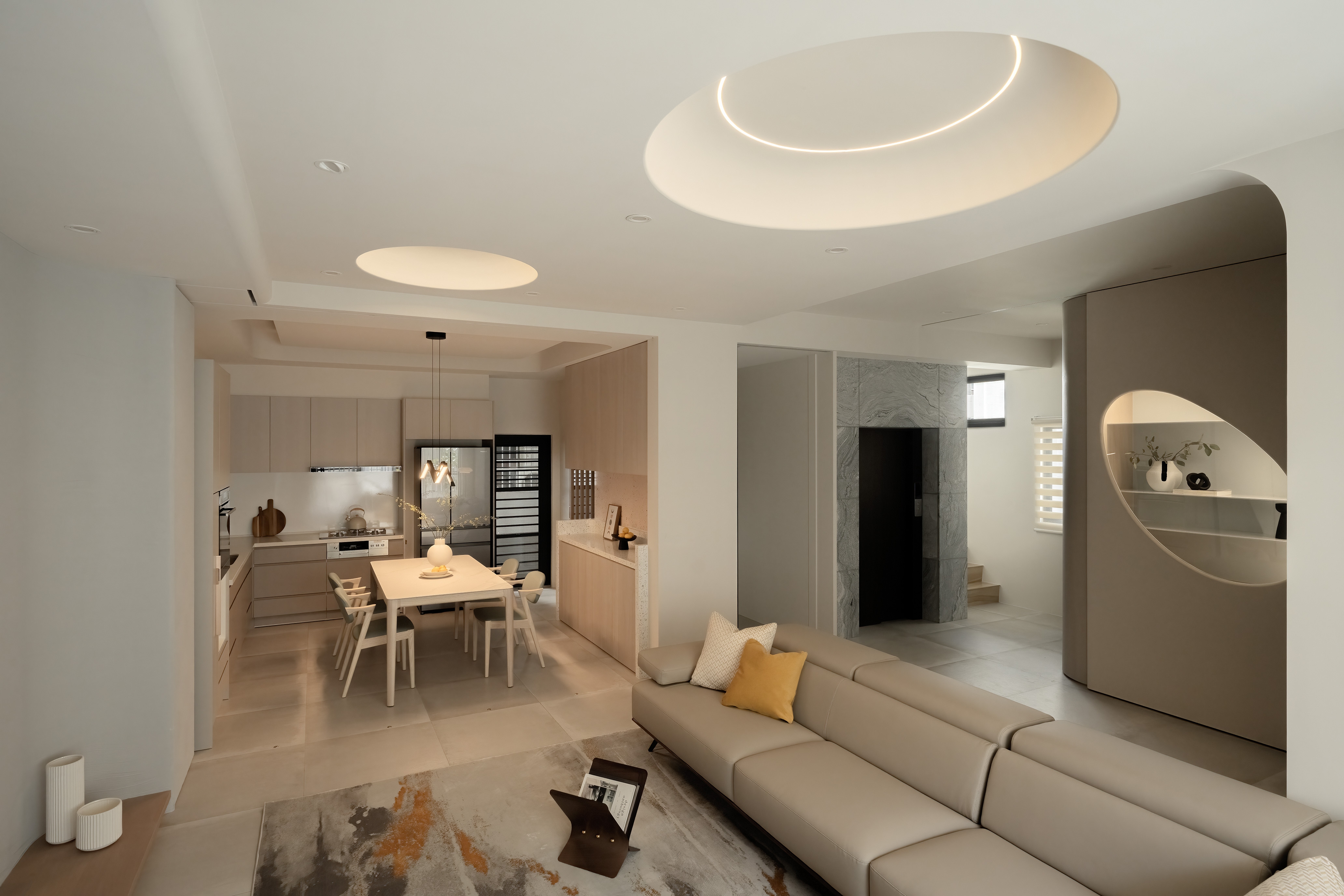 This 290 sqm, four-story townhouse, originally two narrow 30-year-old structures, was transformed into an open, airy family haven. The design emphasizes warmth, longevity, and family connection, using natural wood tones, soft-gray palettes, and high-quality coatings like Italian art paint and Japanese humidity-regulating paint. Curves and circles are a pervasive motif, seen in a 3-meter-tall entryway storage unit, a concealed bathroom cabinet, an egg-shaped display cabinet, and circular ceiling cutouts symbolizing the family of four. Children's growth was a key consideration, with flexible room designs and playful elements. Despite renovation challenges, natural light and ventilation are prioritized, with strategic blinds reportedly reducing indoor temperatures. The residence is a narrative of family, growth, and enduring design.