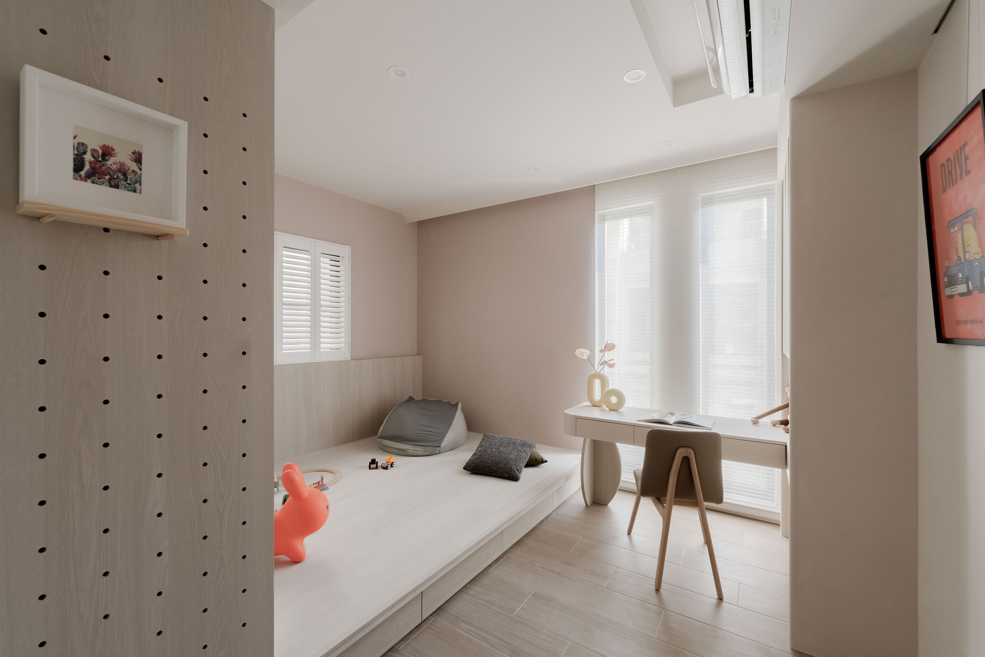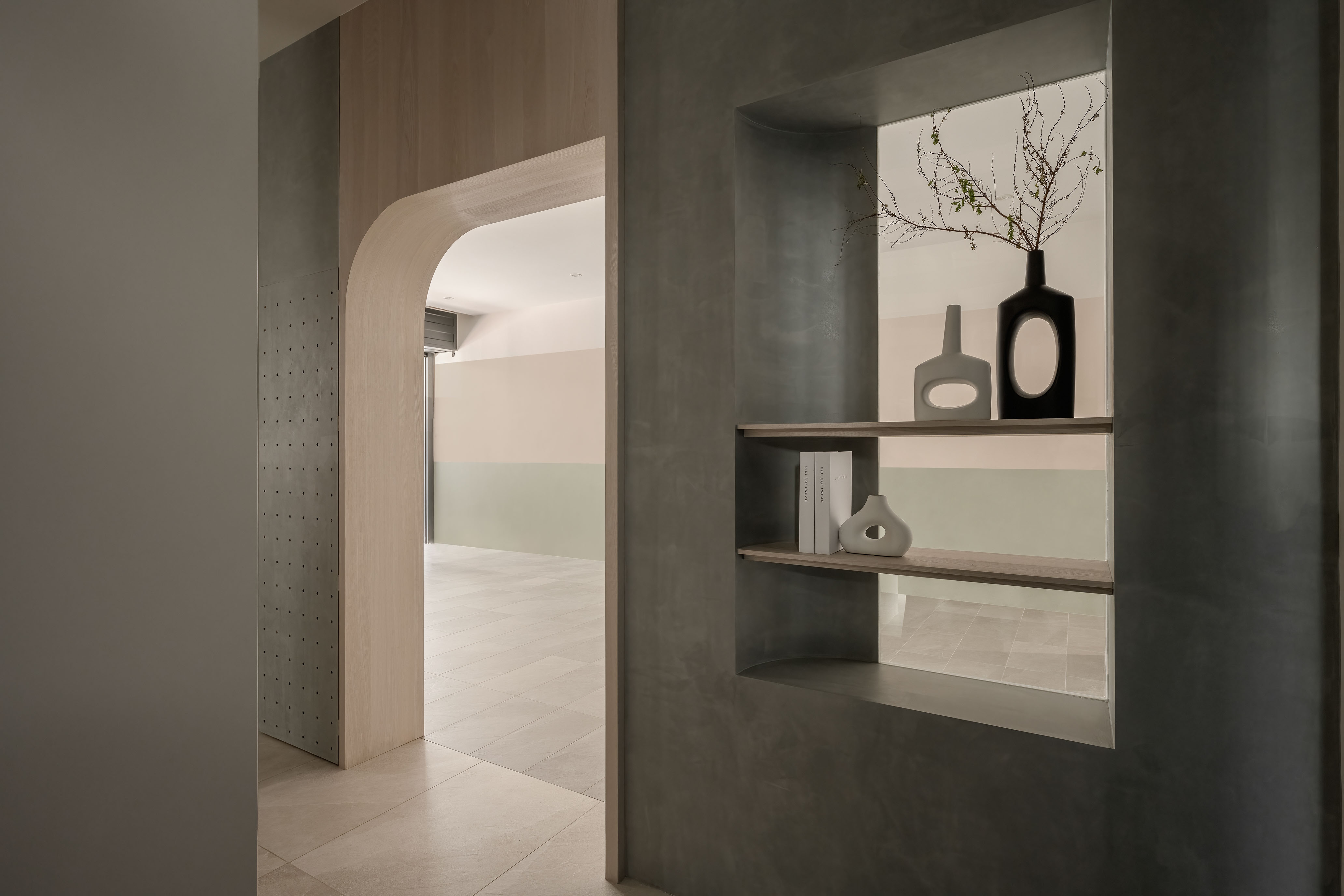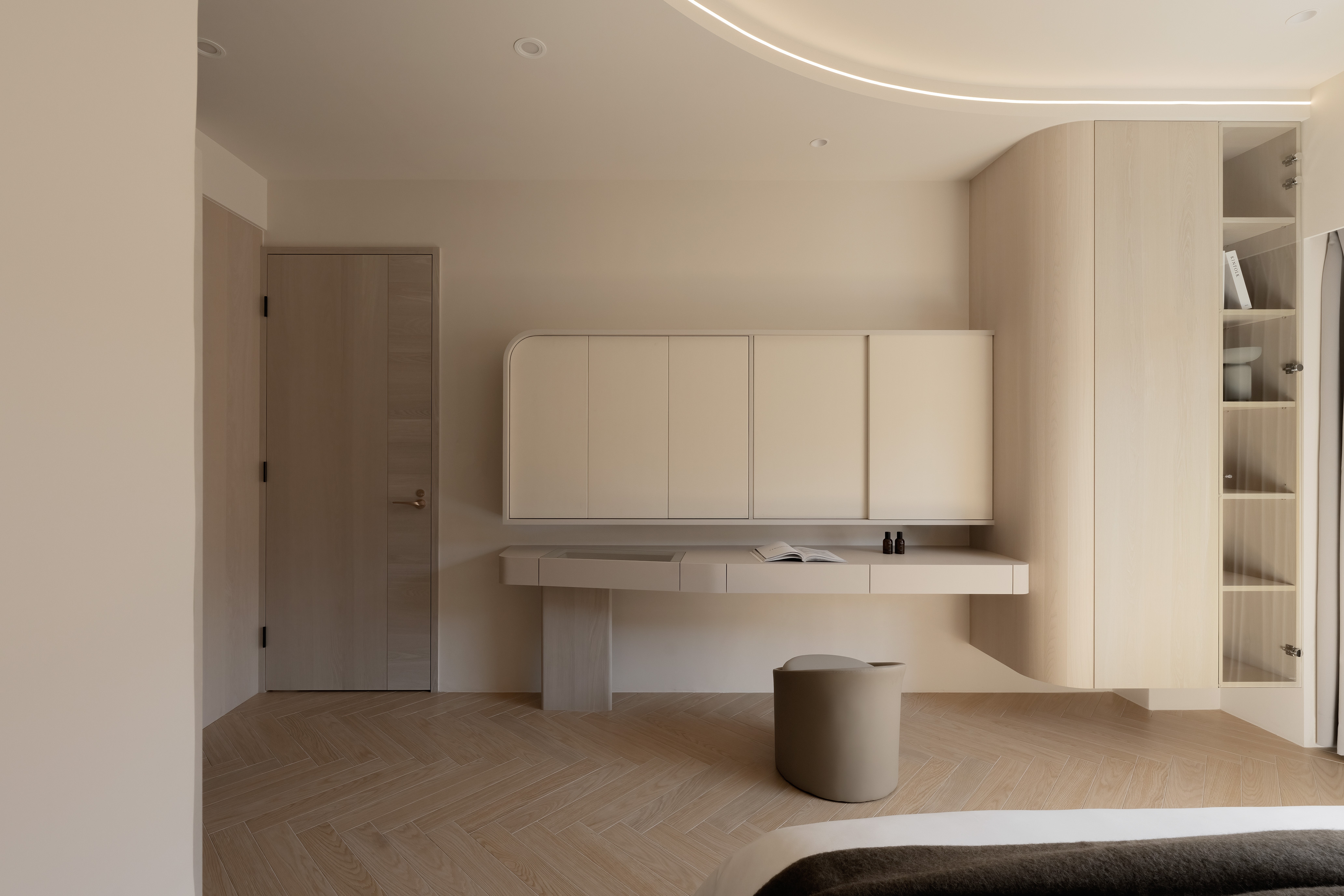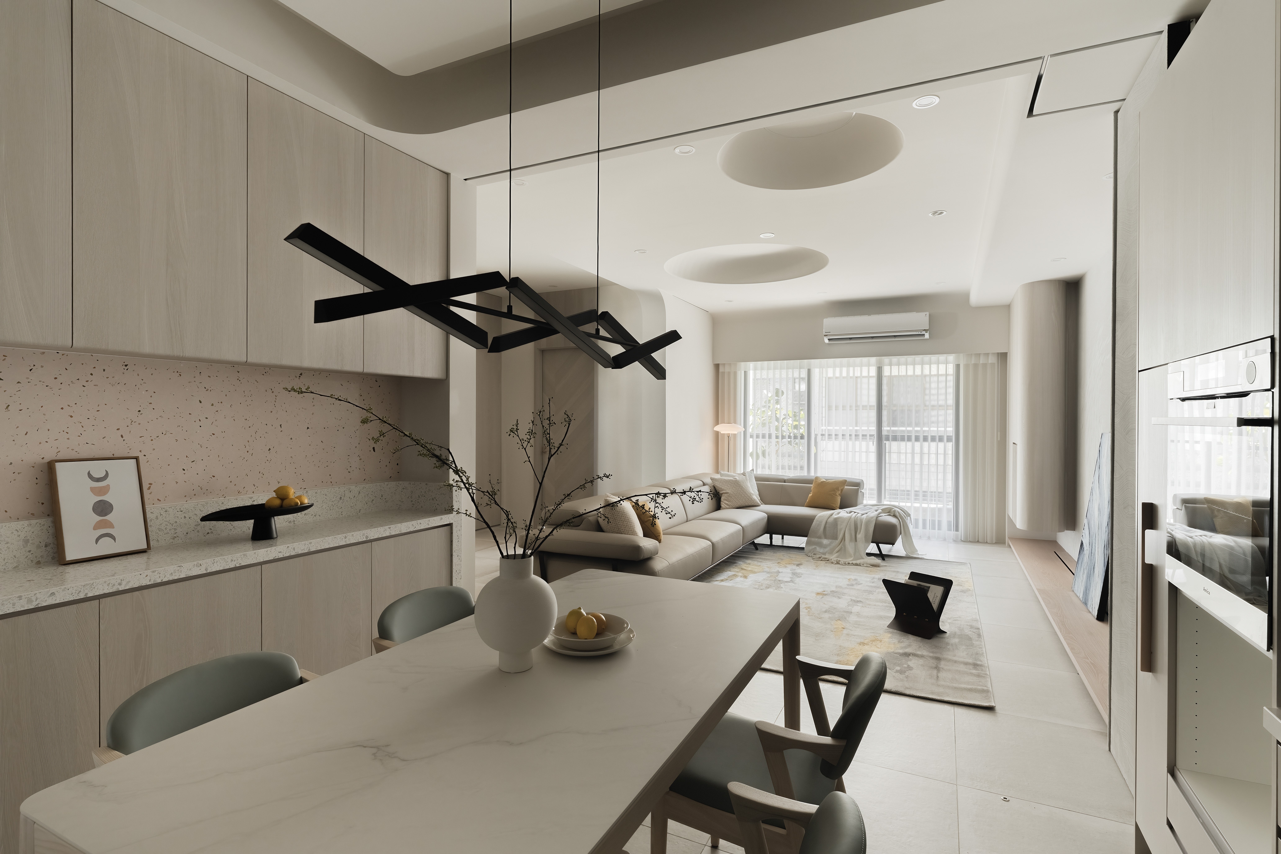 This 290 sqm, four-story townhouse, originally two narrow 30-year-old structures, was transformed into an open, airy family haven. The design emphasizes warmth, longevity, and family connection, using natural wood tones, soft-gray palettes, and high-quality coatings like Italian art paint and Japanese humidity-regulating paint. Curves and circles are a pervasive motif, seen in a 3-meter-tall entryway storage unit, a concealed bathroom cabinet, an egg-shaped display cabinet, and circular ceiling cutouts symbolizing the family of four. Children's growth was a key consideration, with flexible room designs and playful elements. Despite renovation challenges, natural light and ventilation are prioritized, with strategic blinds reportedly reducing indoor temperatures. The residence is a narrative of family, growth, and enduring design.