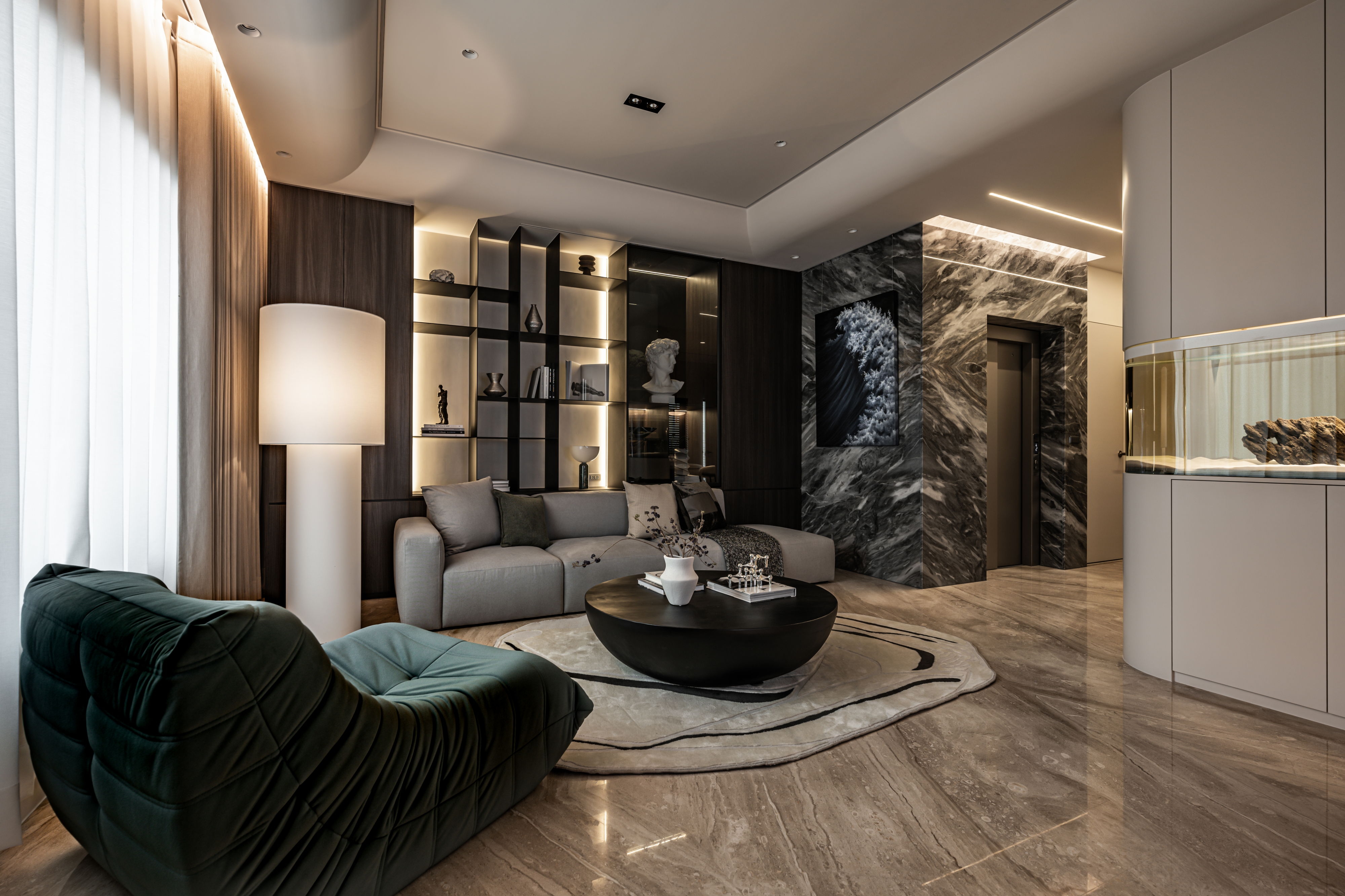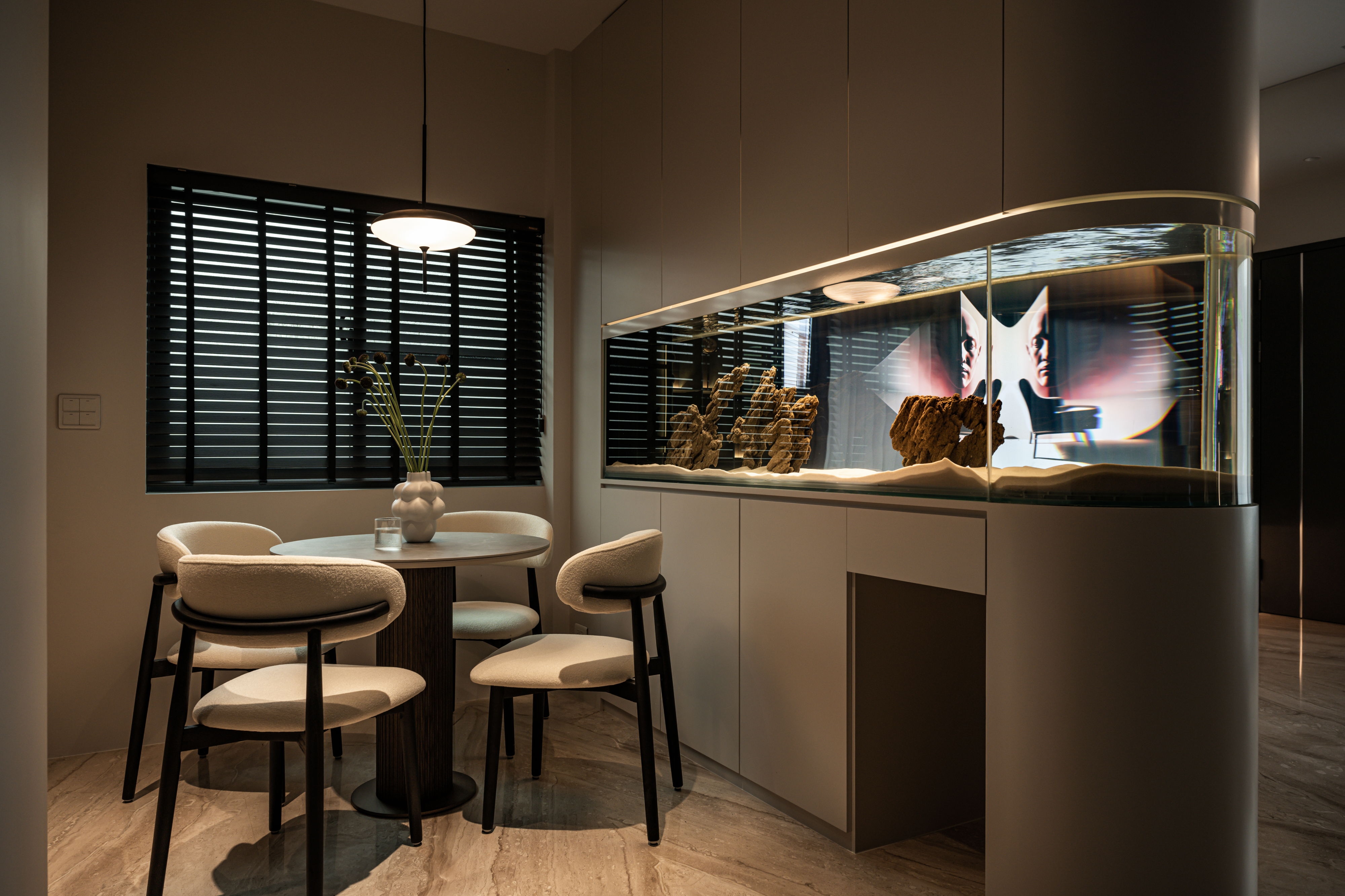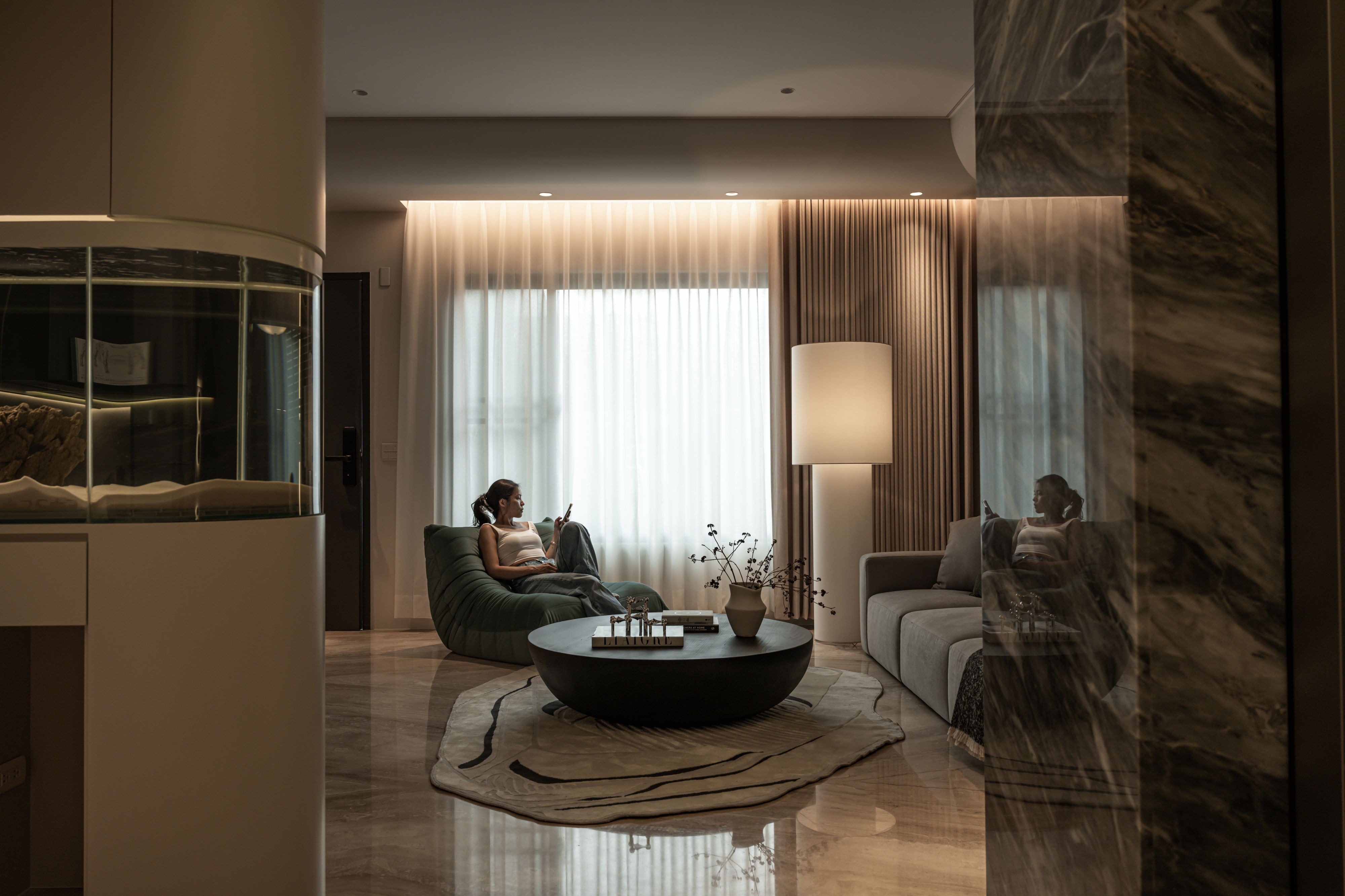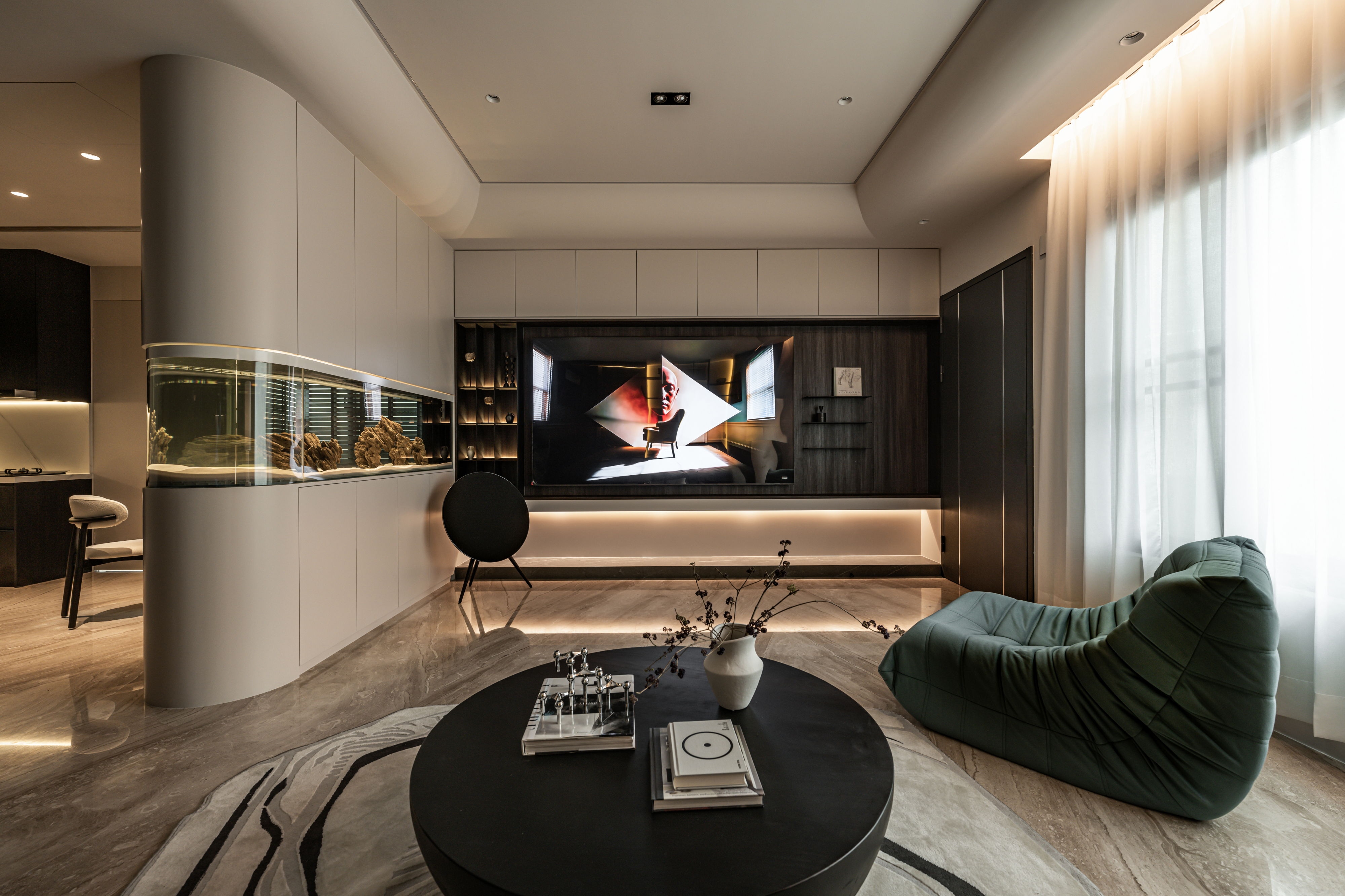 The centerpiece of the home is a monumental, custom-built aquarium that serves as a living art installation. This "lonely movie," as the designer describes it, is not merely decorative but a functional partition that screens the kitchen from the entrance, a key Feng Shui consideration. Its rounded form softens the space, while its transparent nature maintains a sense of openness, creating a visual connection between the social and private realms. The carefully orchestrated play of light, from the linear LED strips that guide the eye to the oversized, cloud-like pendant that envelops the living area, crafts an atmosphere of serene intimacy.