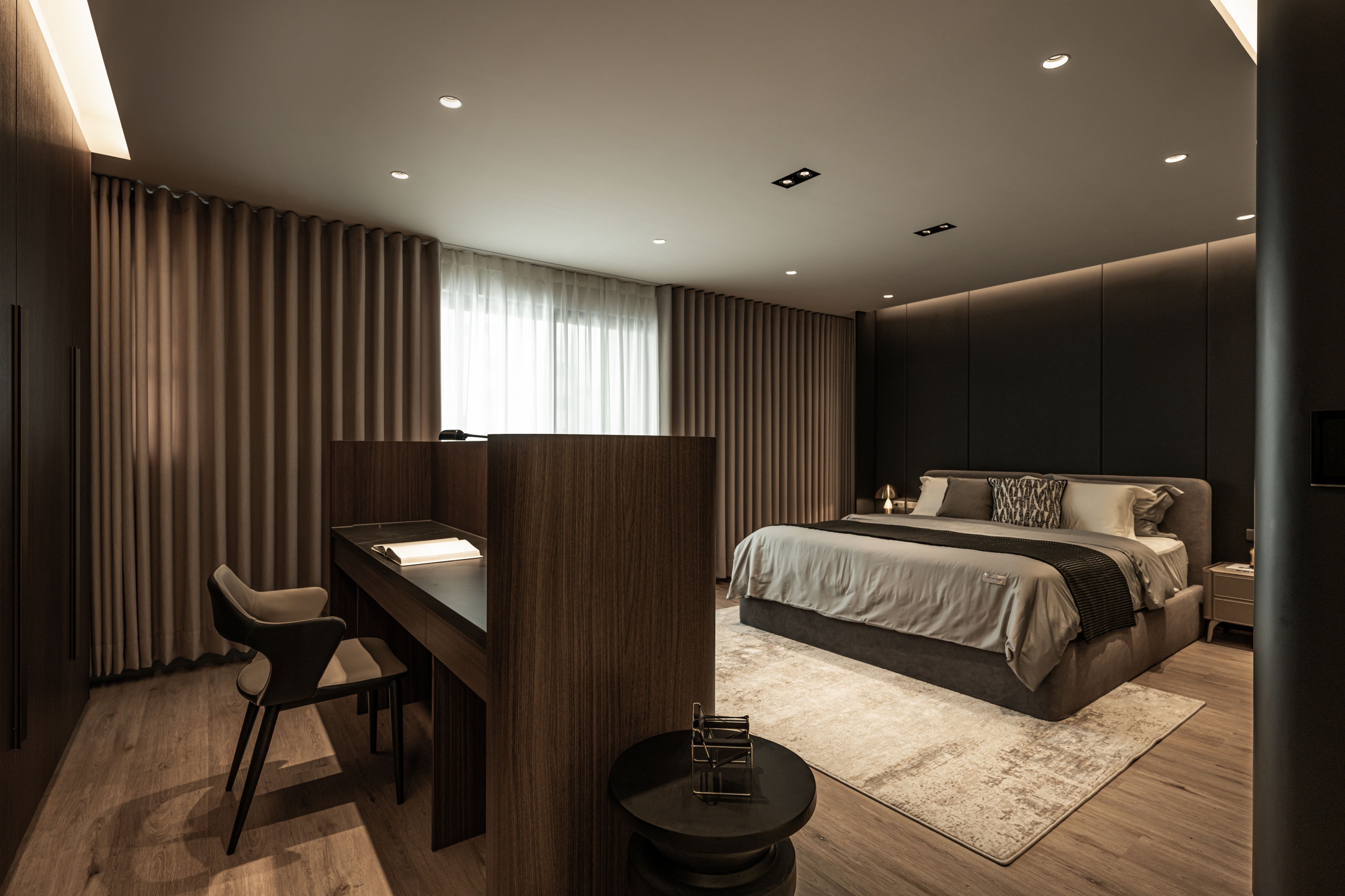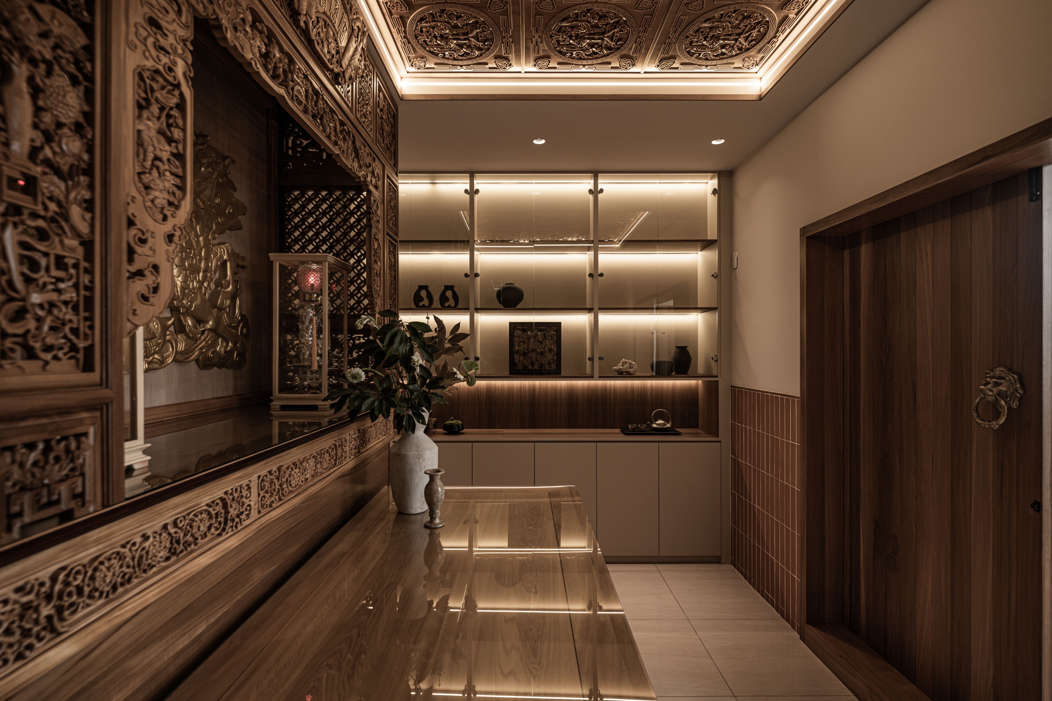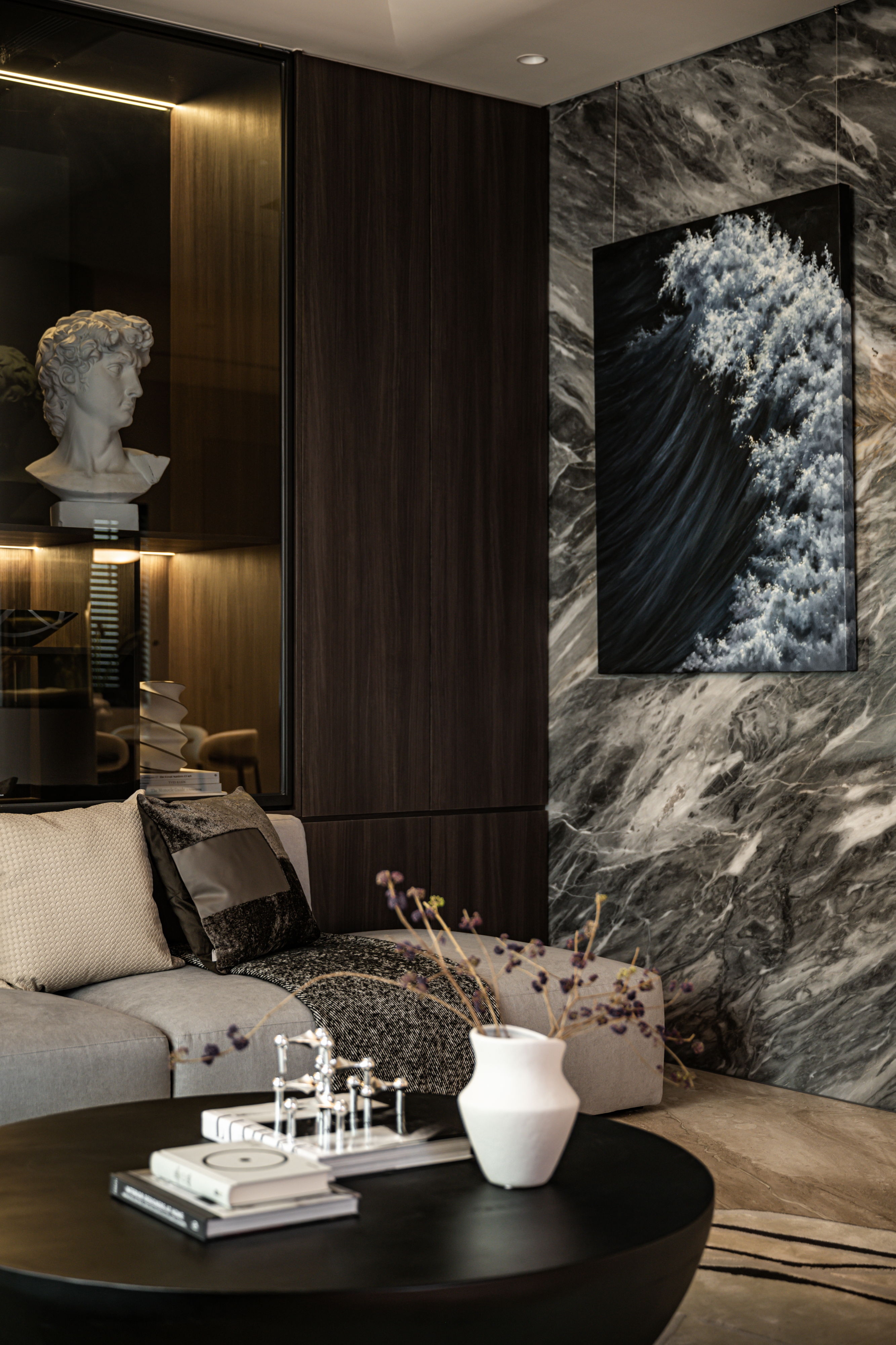 The centerpiece of the home is a monumental, custom-built aquarium that serves as a living art installation. This "lonely movie," as the designer describes it, is not merely decorative but a functional partition that screens the kitchen from the entrance, a key Feng Shui consideration. Its rounded form softens the space, while its transparent nature maintains a sense of openness, creating a visual connection between the social and private realms. The carefully orchestrated play of light, from the linear LED strips that guide the eye to the oversized, cloud-like pendant that envelops the living area, crafts an atmosphere of serene intimacy.