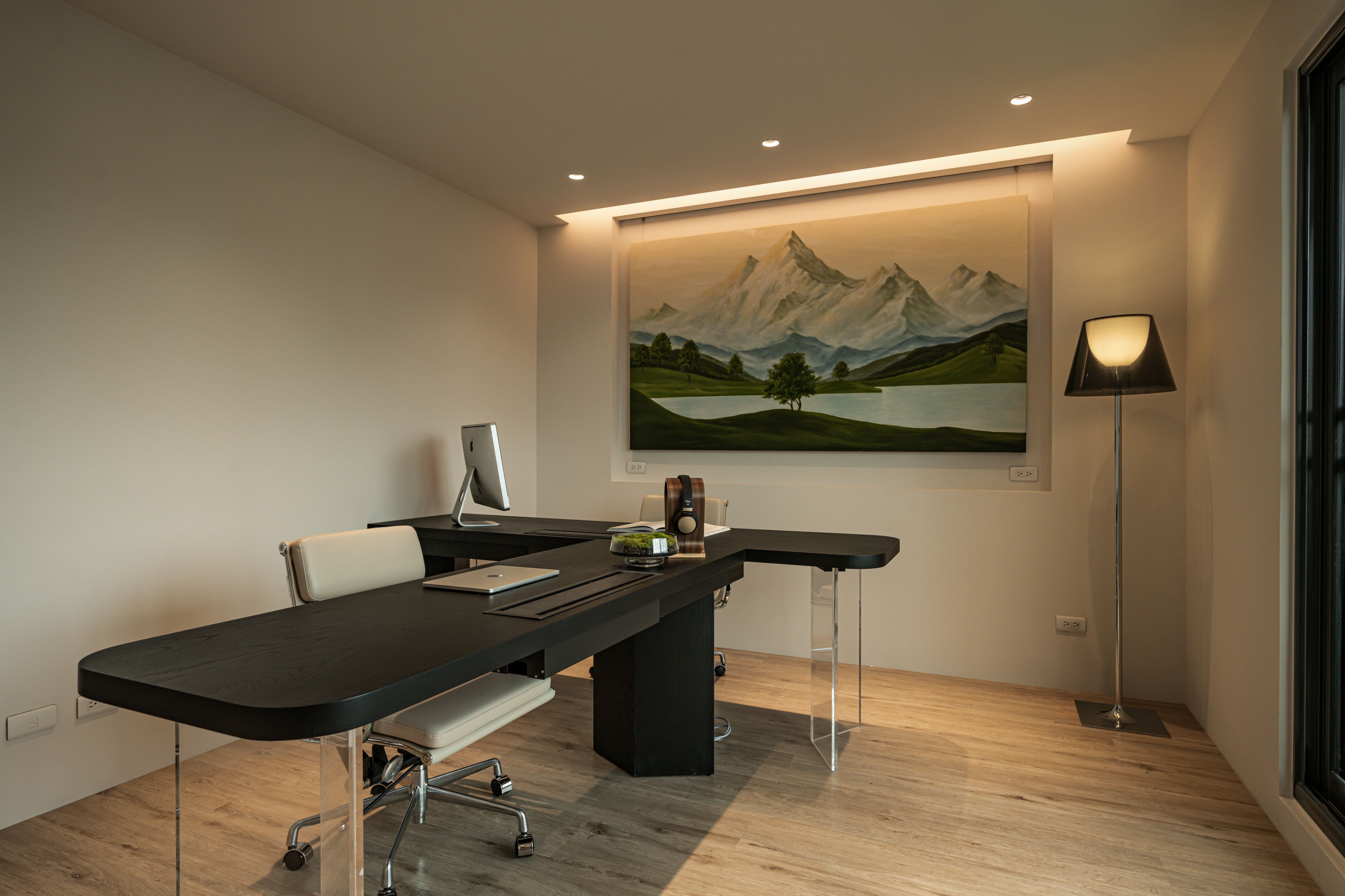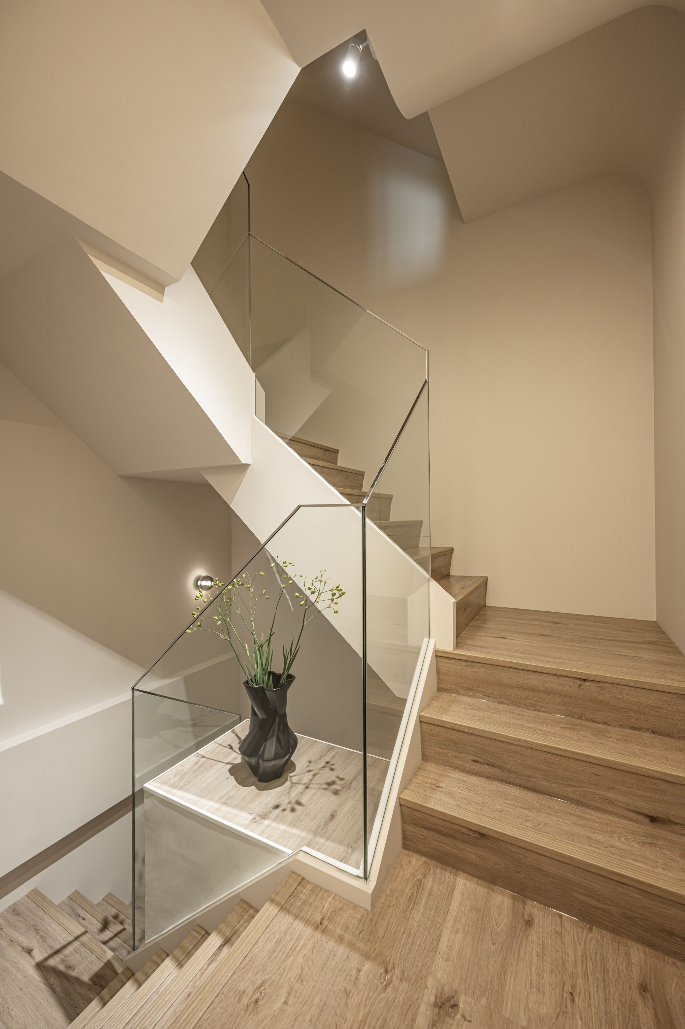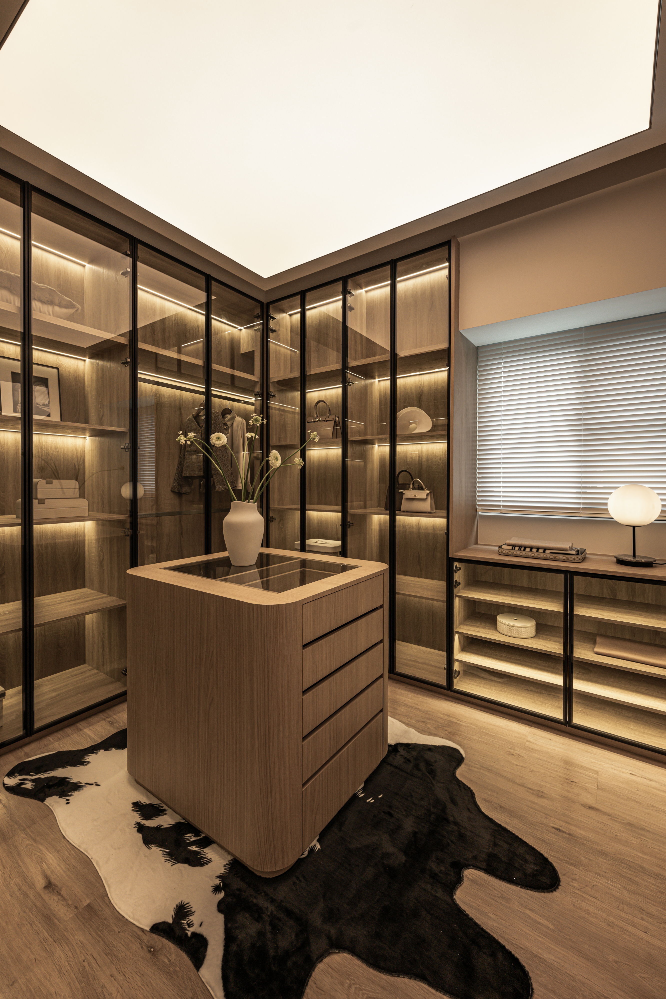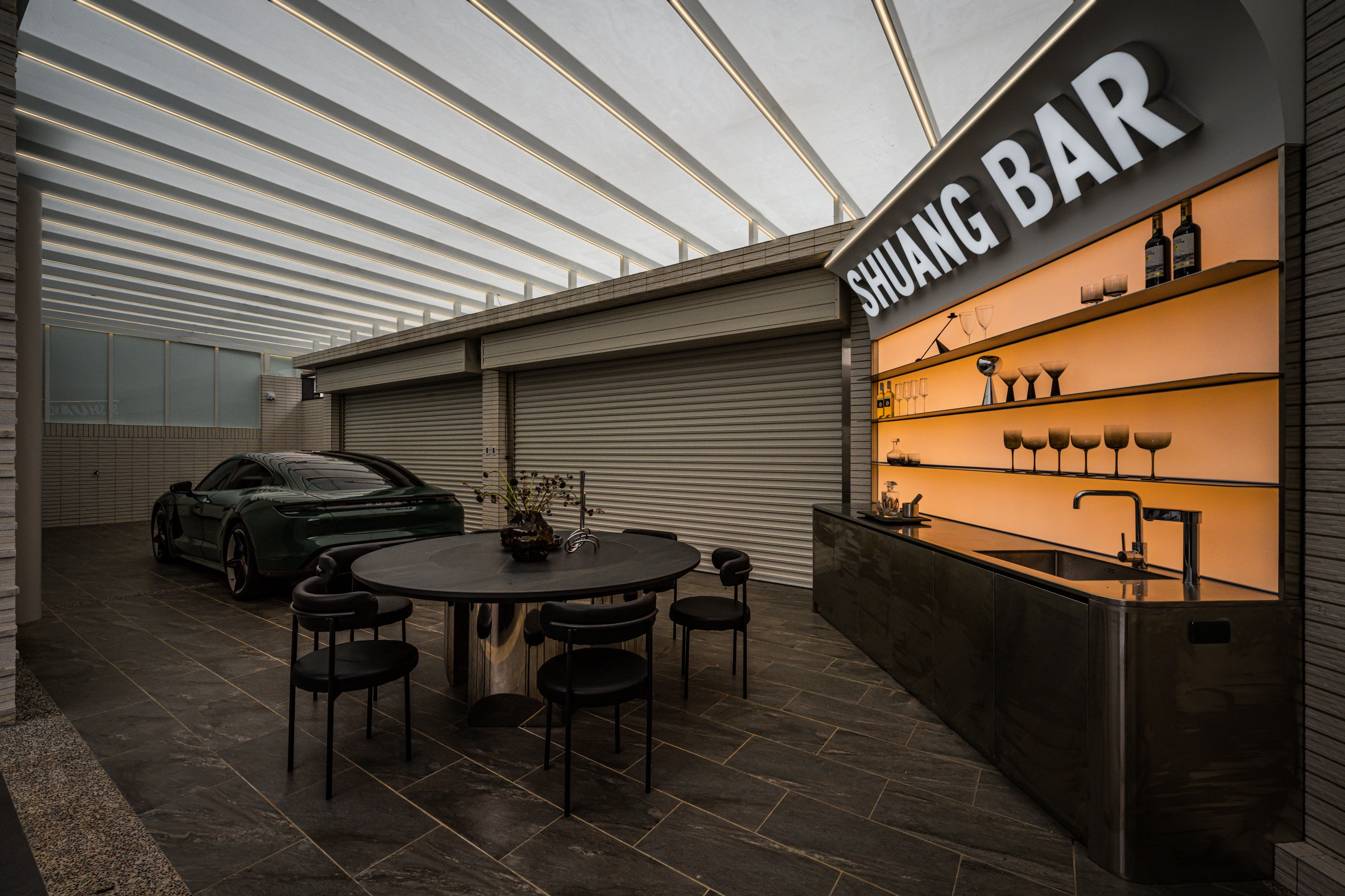 The centerpiece of the home is a monumental, custom-built aquarium that serves as a living art installation. This "lonely movie," as the designer describes it, is not merely decorative but a functional partition that screens the kitchen from the entrance, a key Feng Shui consideration. Its rounded form softens the space, while its transparent nature maintains a sense of openness, creating a visual connection between the social and private realms. The carefully orchestrated play of light, from the linear LED strips that guide the eye to the oversized, cloud-like pendant that envelops the living area, crafts an atmosphere of serene intimacy.