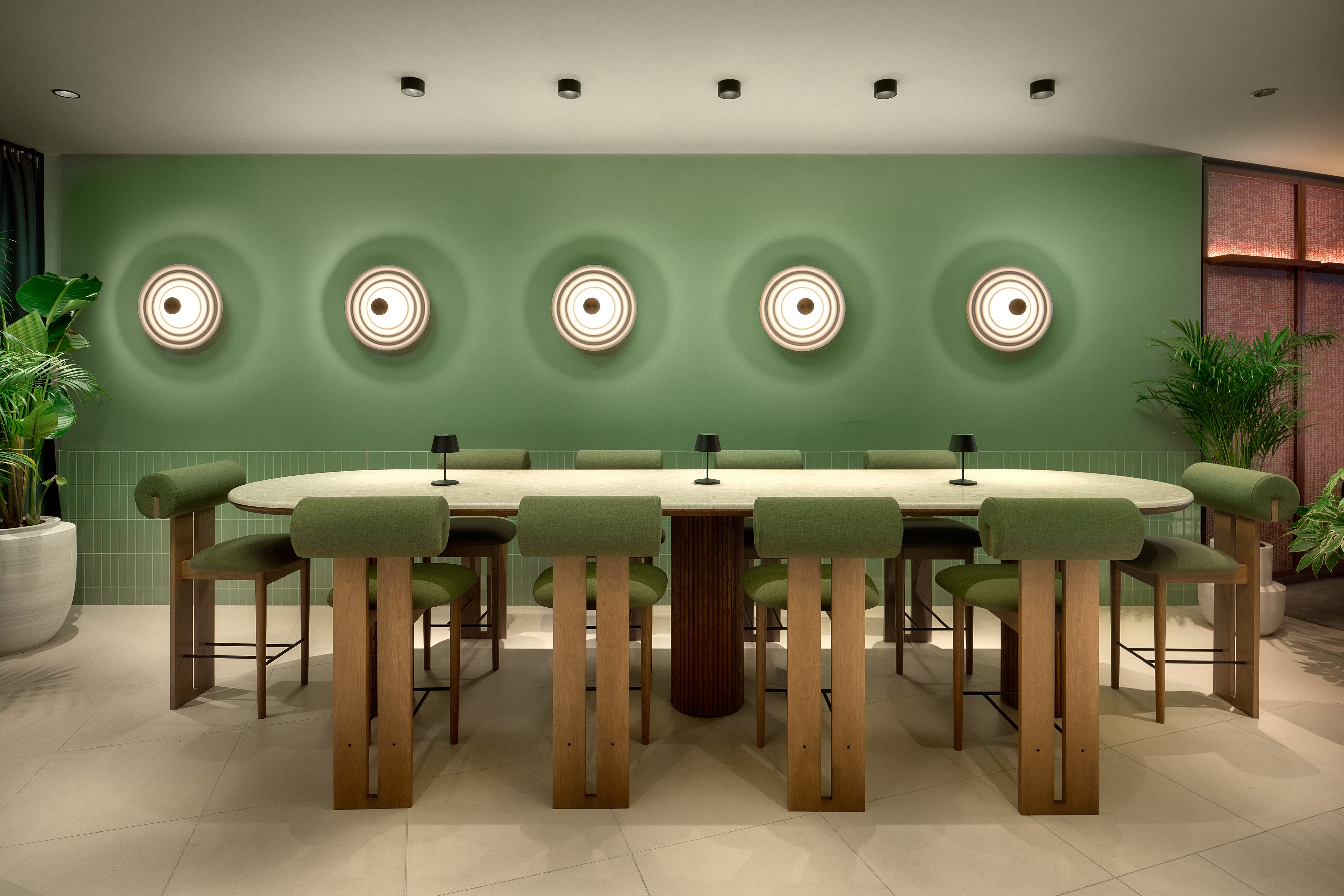 A custom stone communal table with Nor11 bar stools creates an intimate space, while Aroma del Campo wall lighting sets the mood. The interior features layered panels, tactile wallpapers, and bespoke rope artworks by Madidah Art, reinforcing the artistic design.