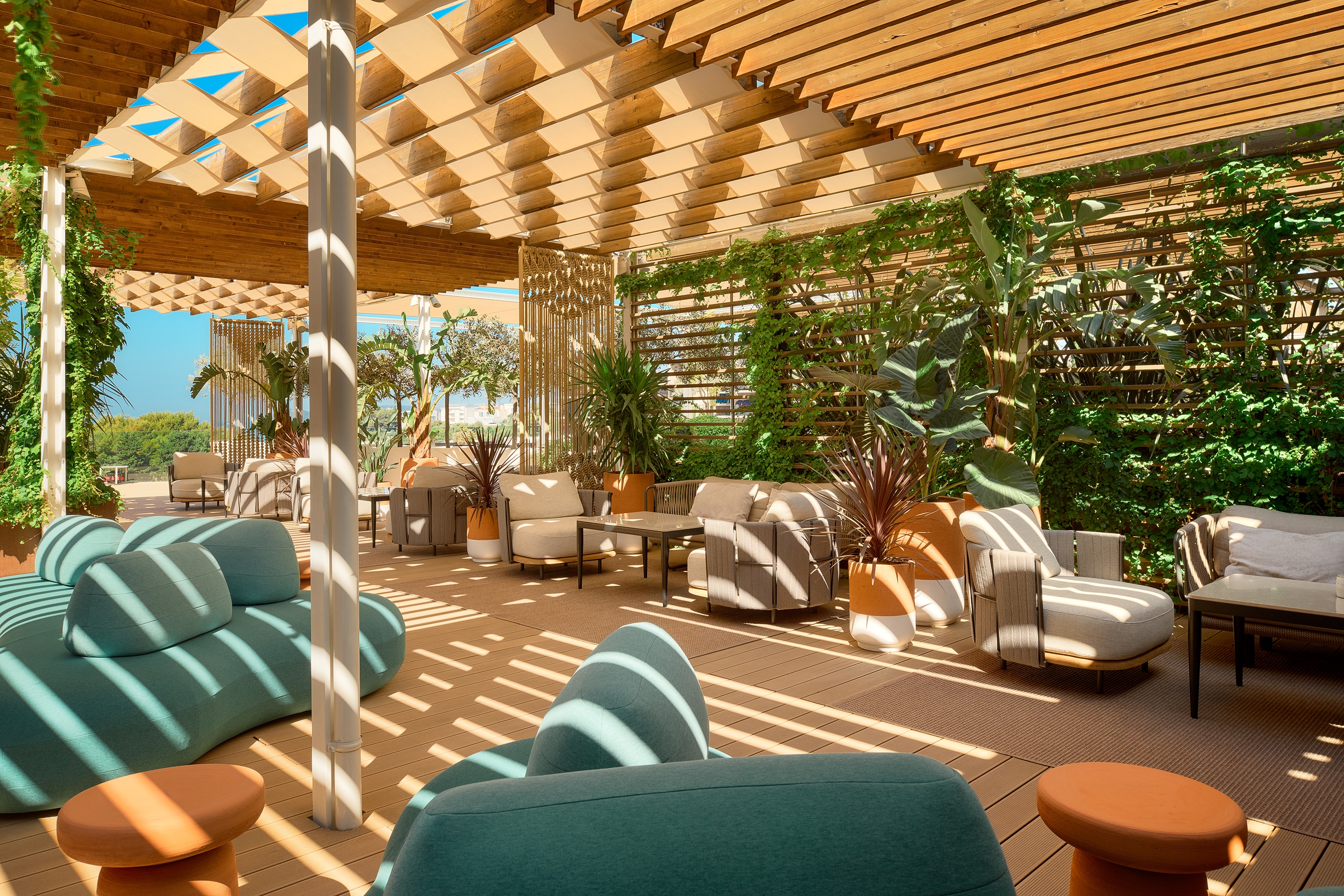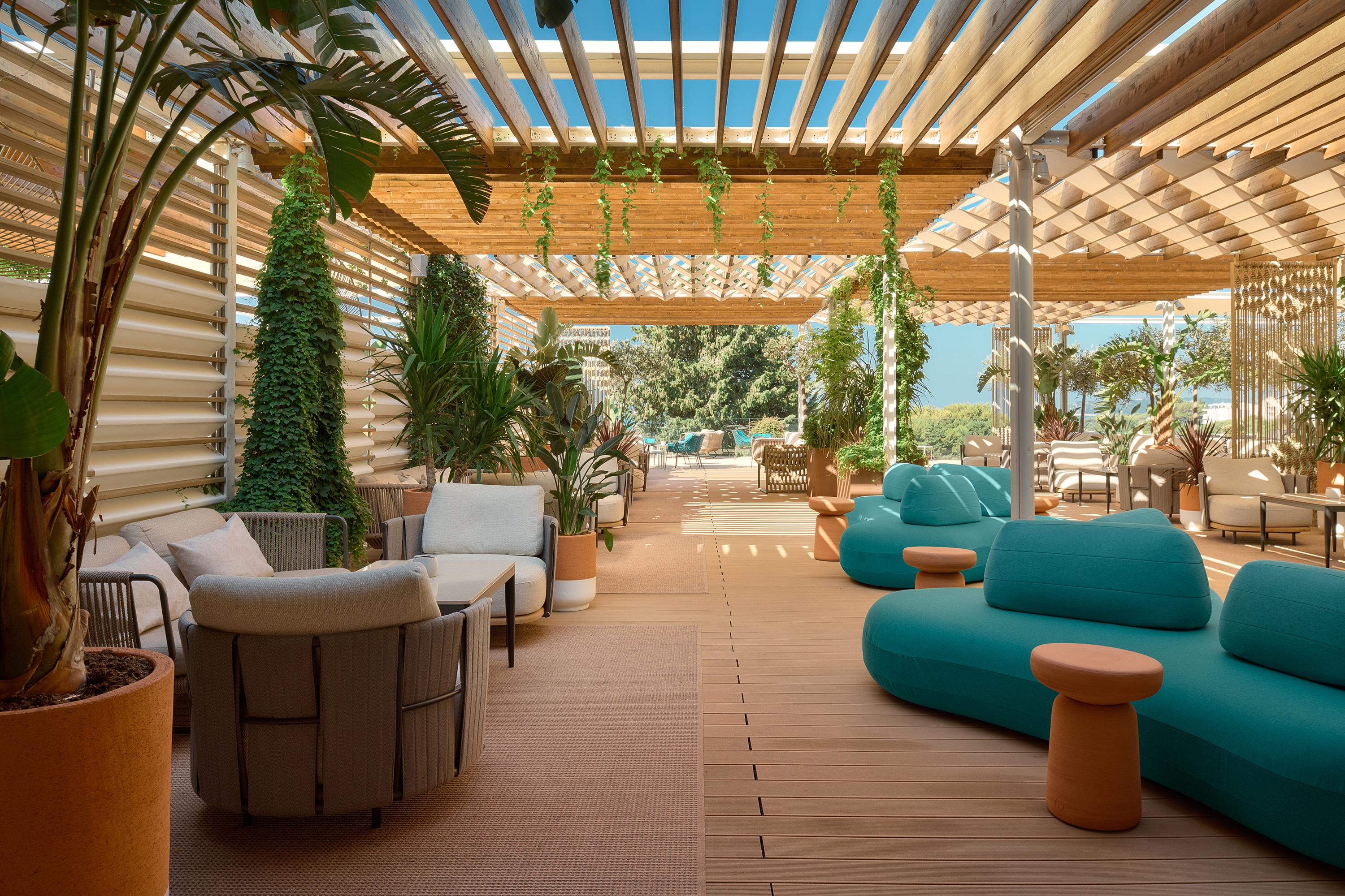 Flanking the bar are lounge areas with pink and green armchairs, plush sofas, and lush greenery, enhancing comfort. The terrace offers an outdoor sanctuary with rope-detailed lounge chairs, deep green sofas, and thoughtful touches like macrame dividers, completing the garden-like ambiance.