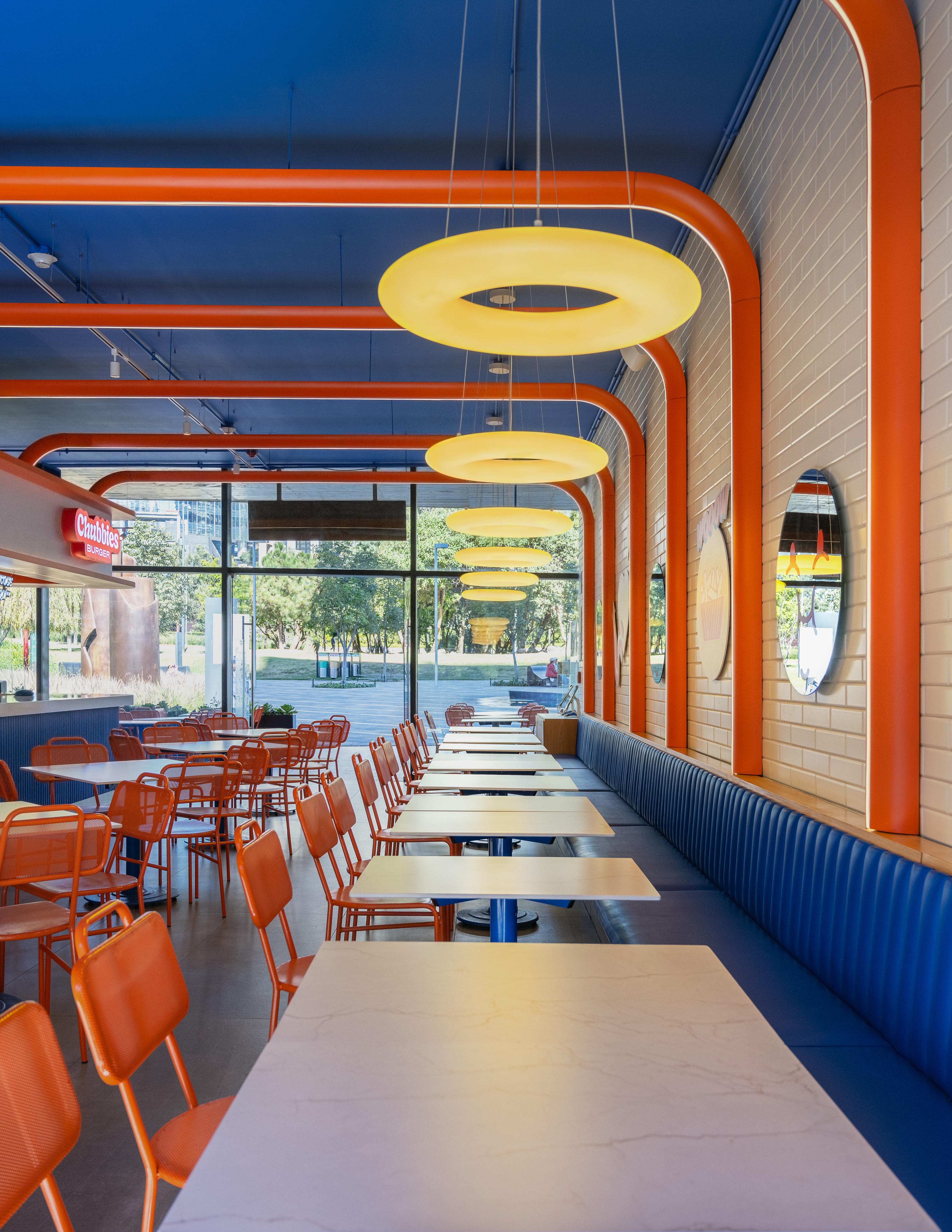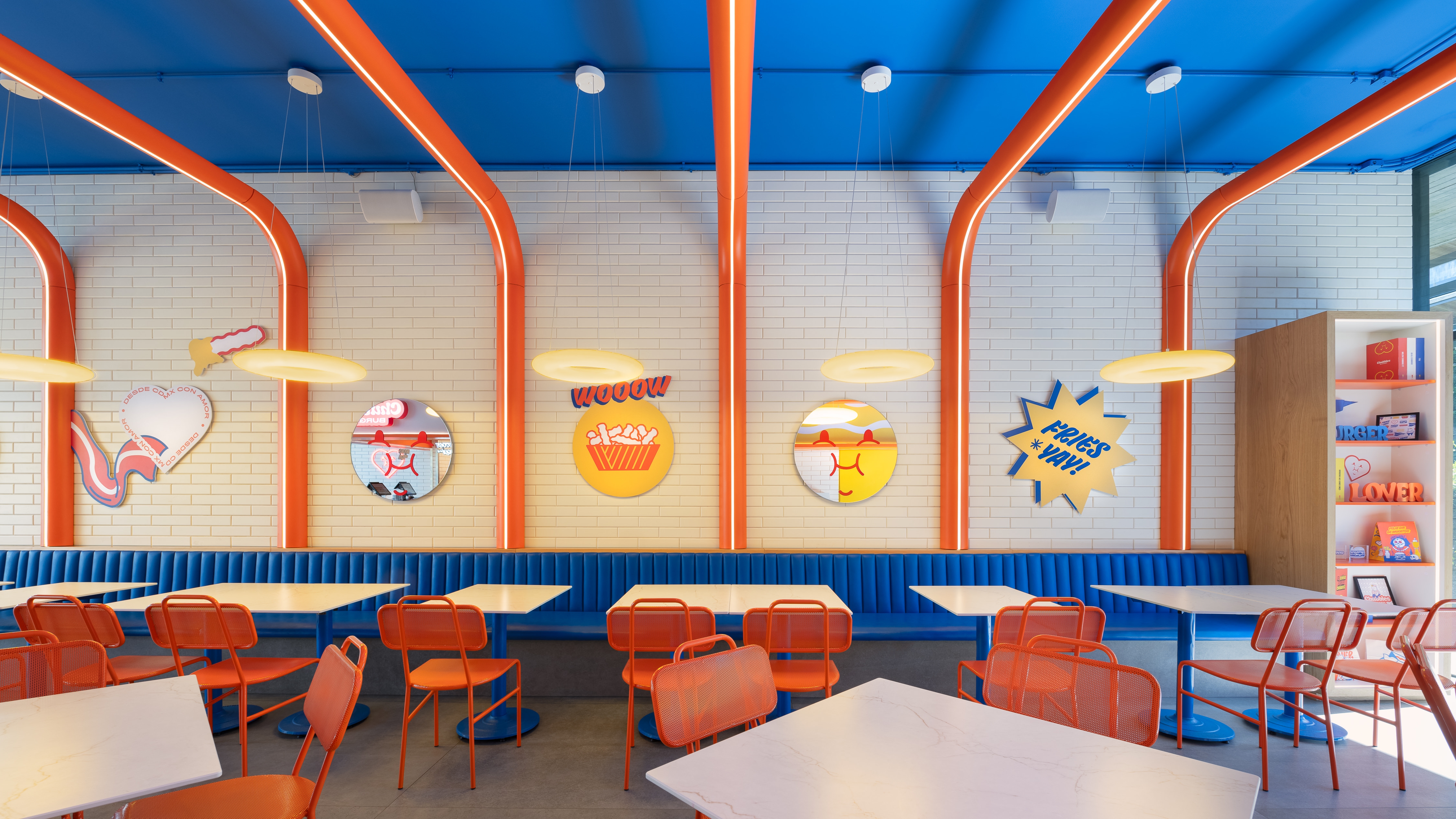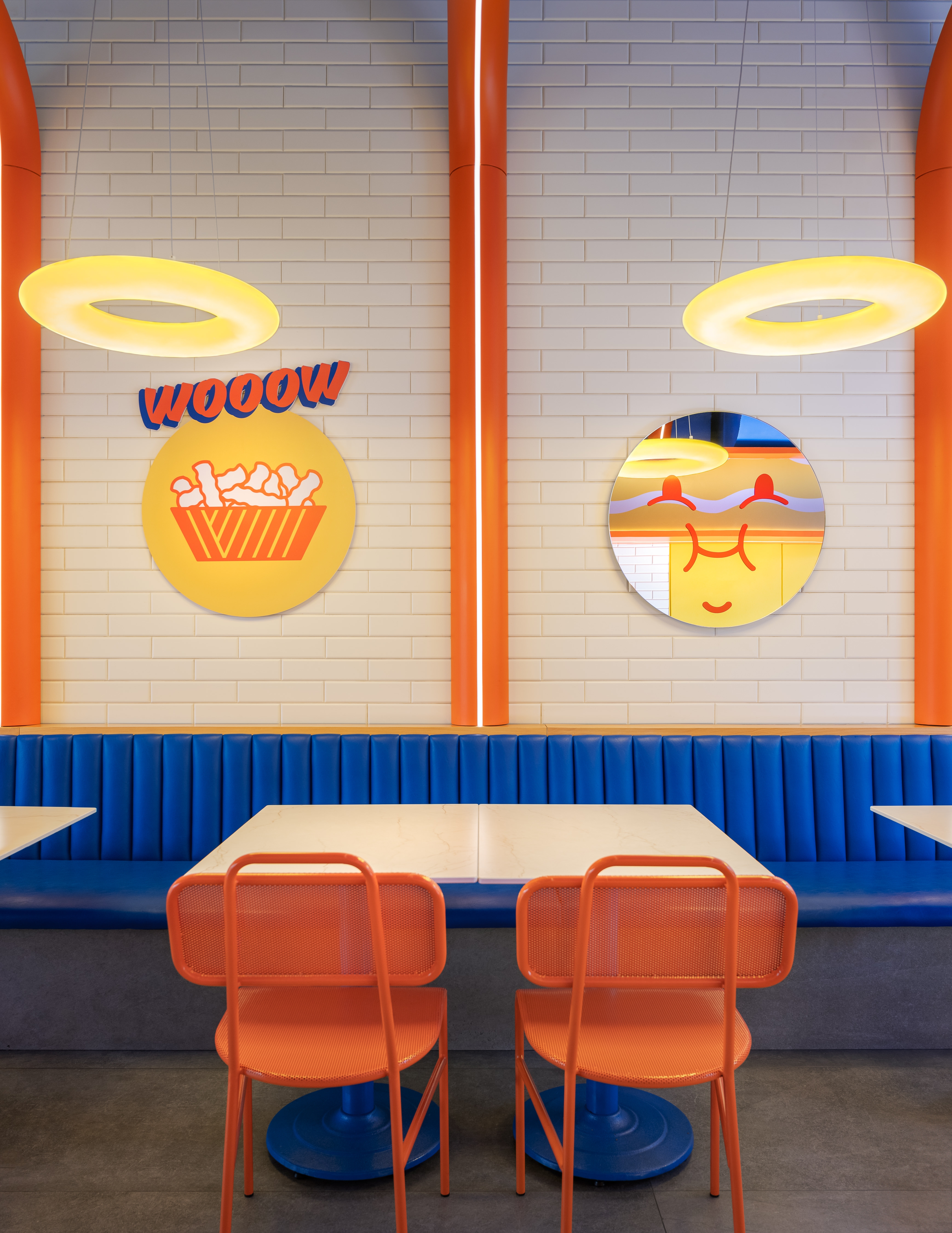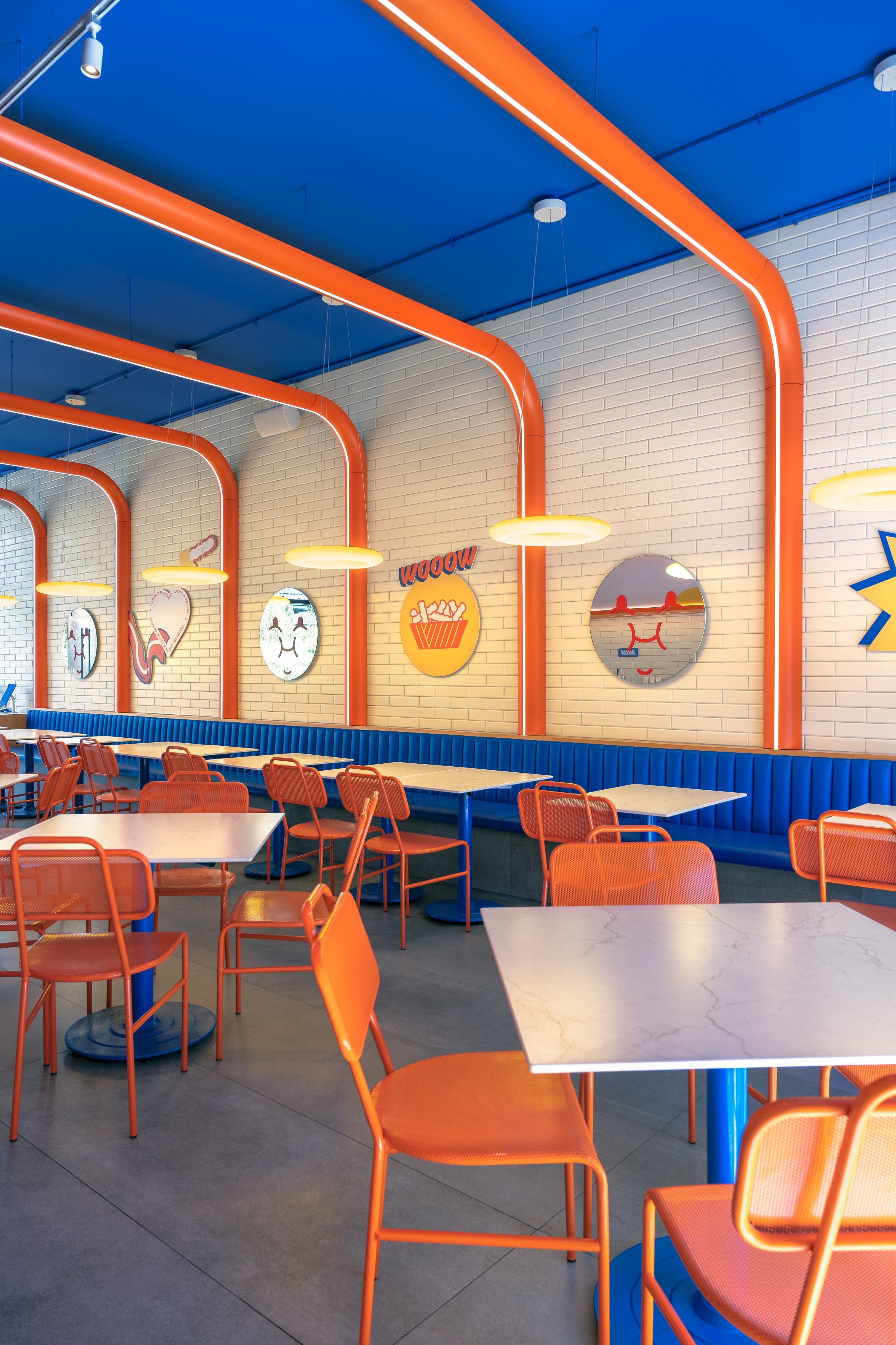 Inspired by Filiulfo—the brand’s cheerful mascot—the restaurant is envisioned as his home: a welcoming place where guests feel at ease. Soft, organic forms drawn from Filiulfo’s morphology shape the space. Orange ceiling arches create playful, enveloping perspectives, while fluid blue bar forms and smooth booths balance aesthetics and function.