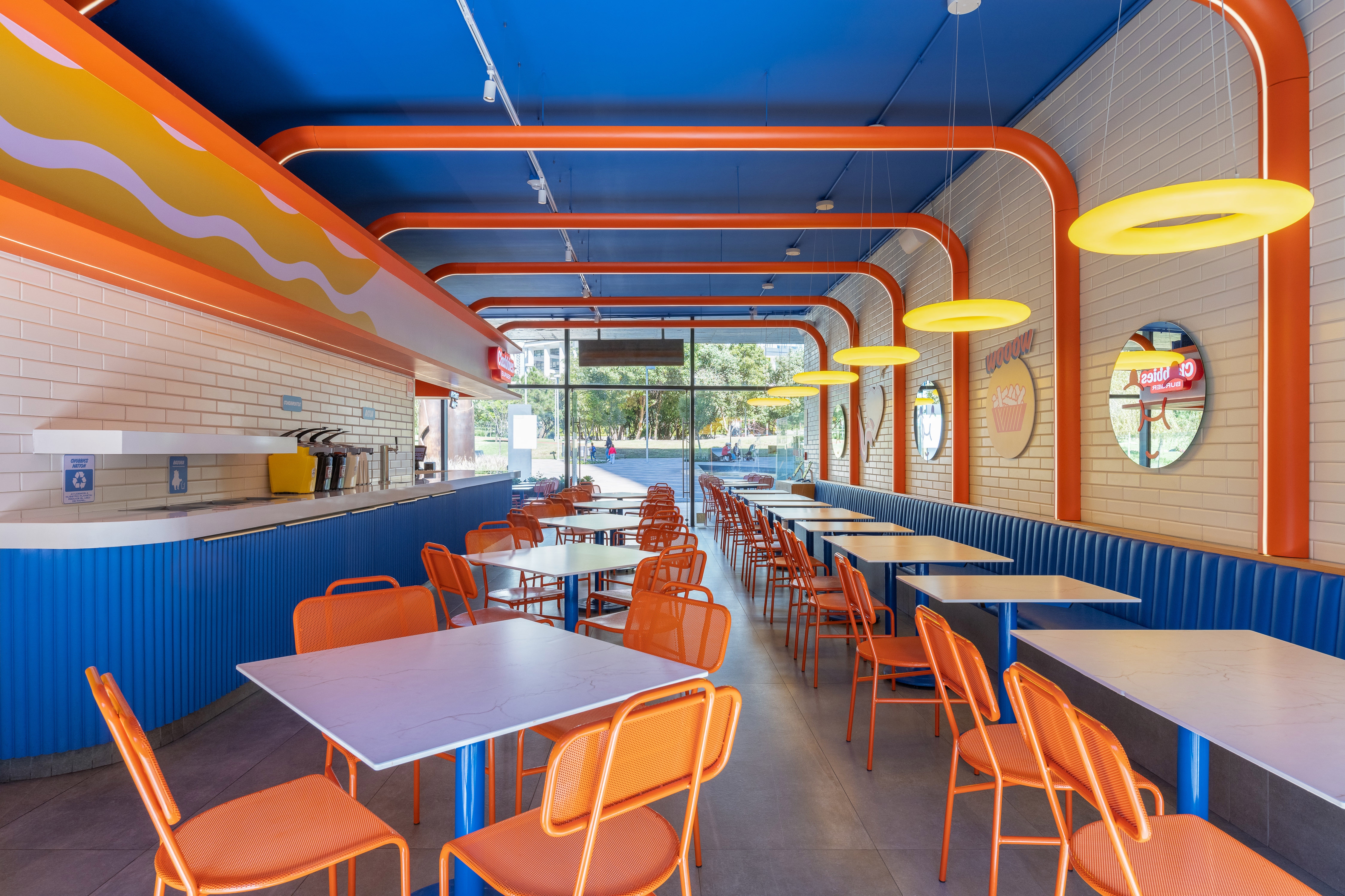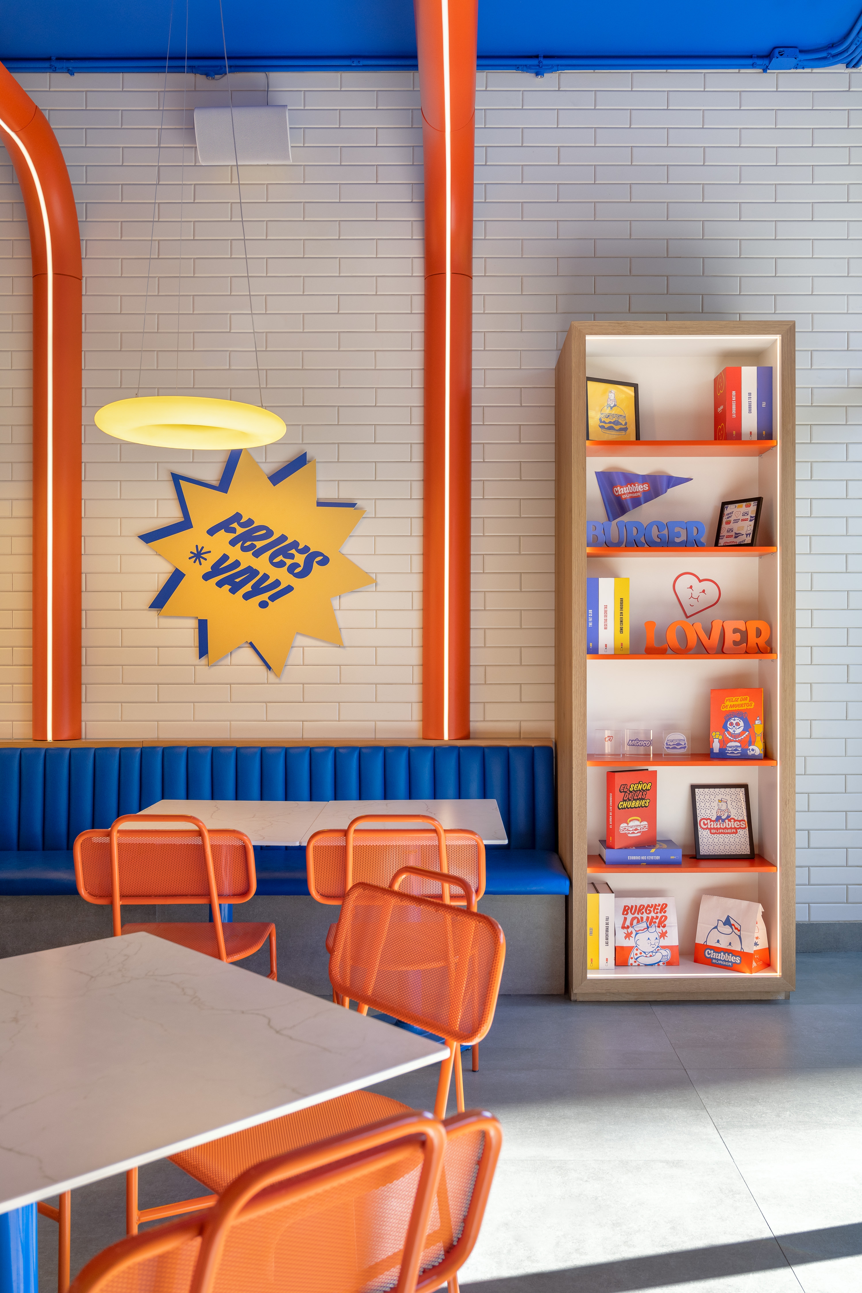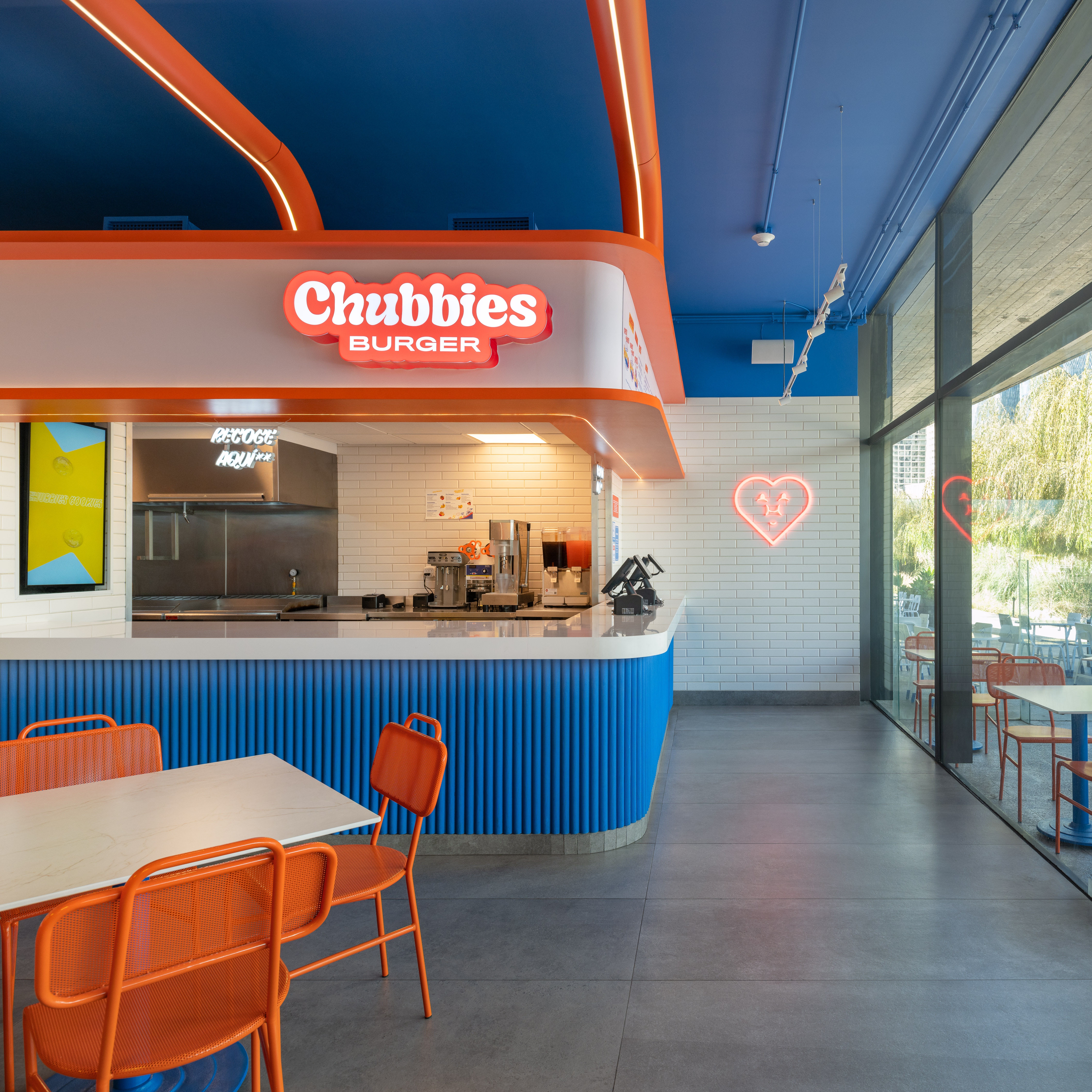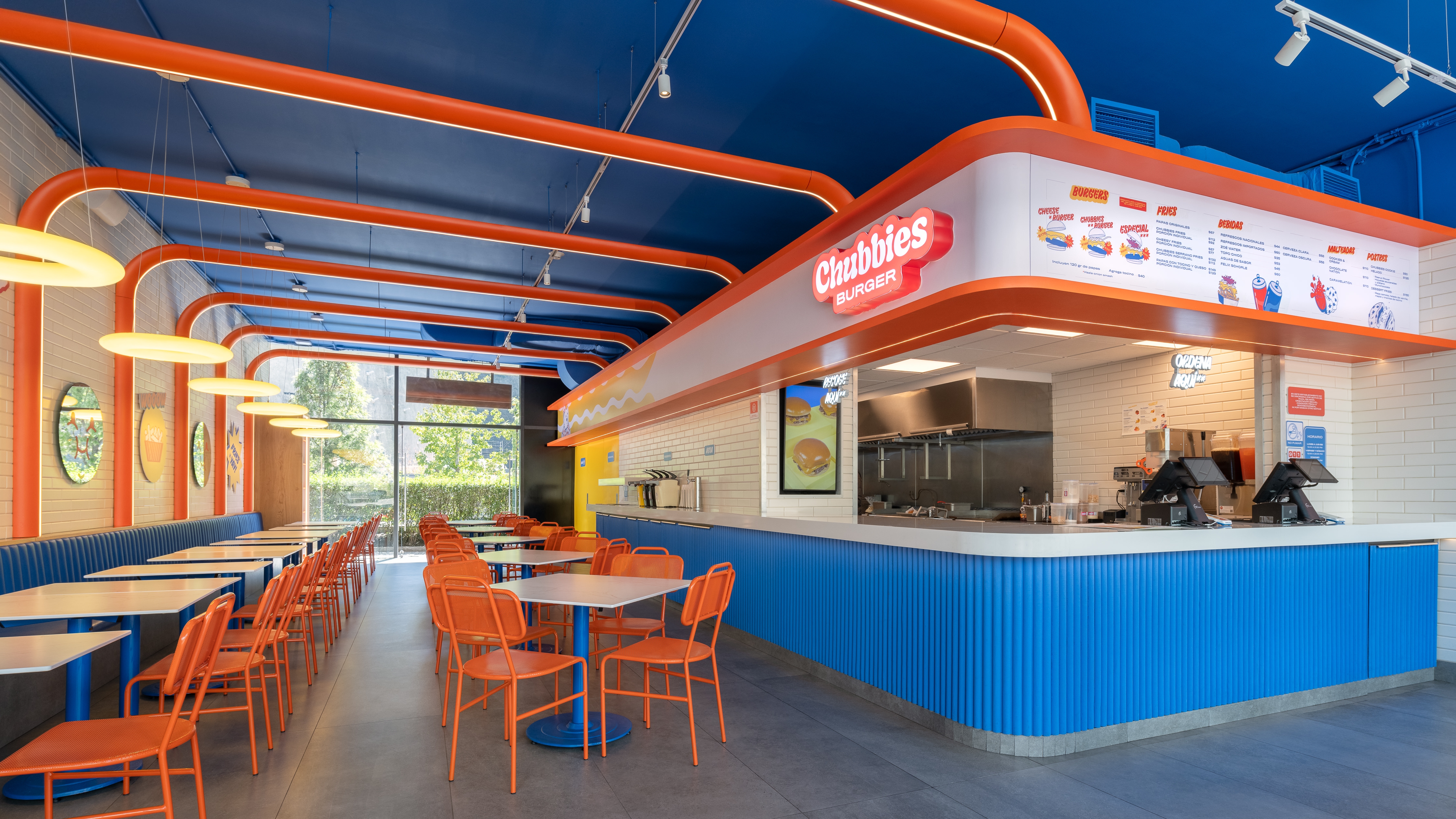 Opening onto the park’s fountains, the façade and terrace invite diners in. Flexible seating adapts to gatherings of any size, enhancing versatility. Materials, furniture, lighting, and colors echo the brand’s identity, uniting architecture and cuisine. Chubbies shows how thoughtful design elevates dining—making each visit memorable not only for its flavors but for the space that frames them.