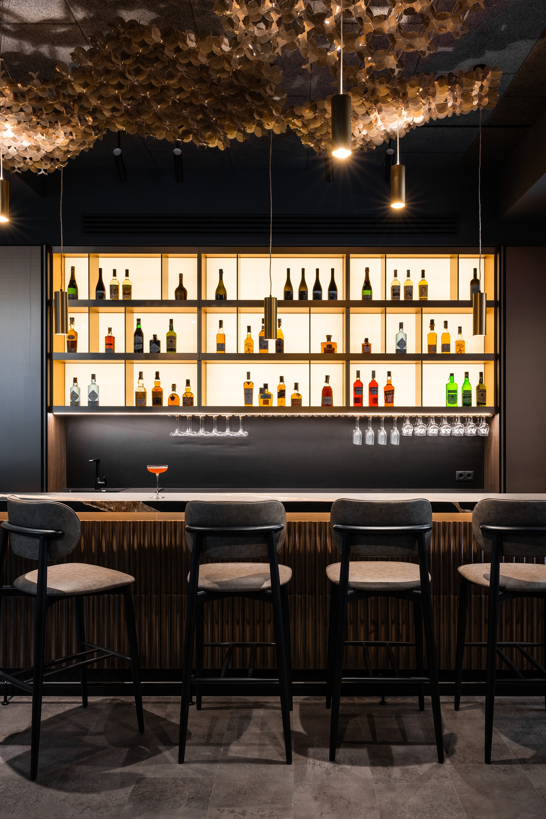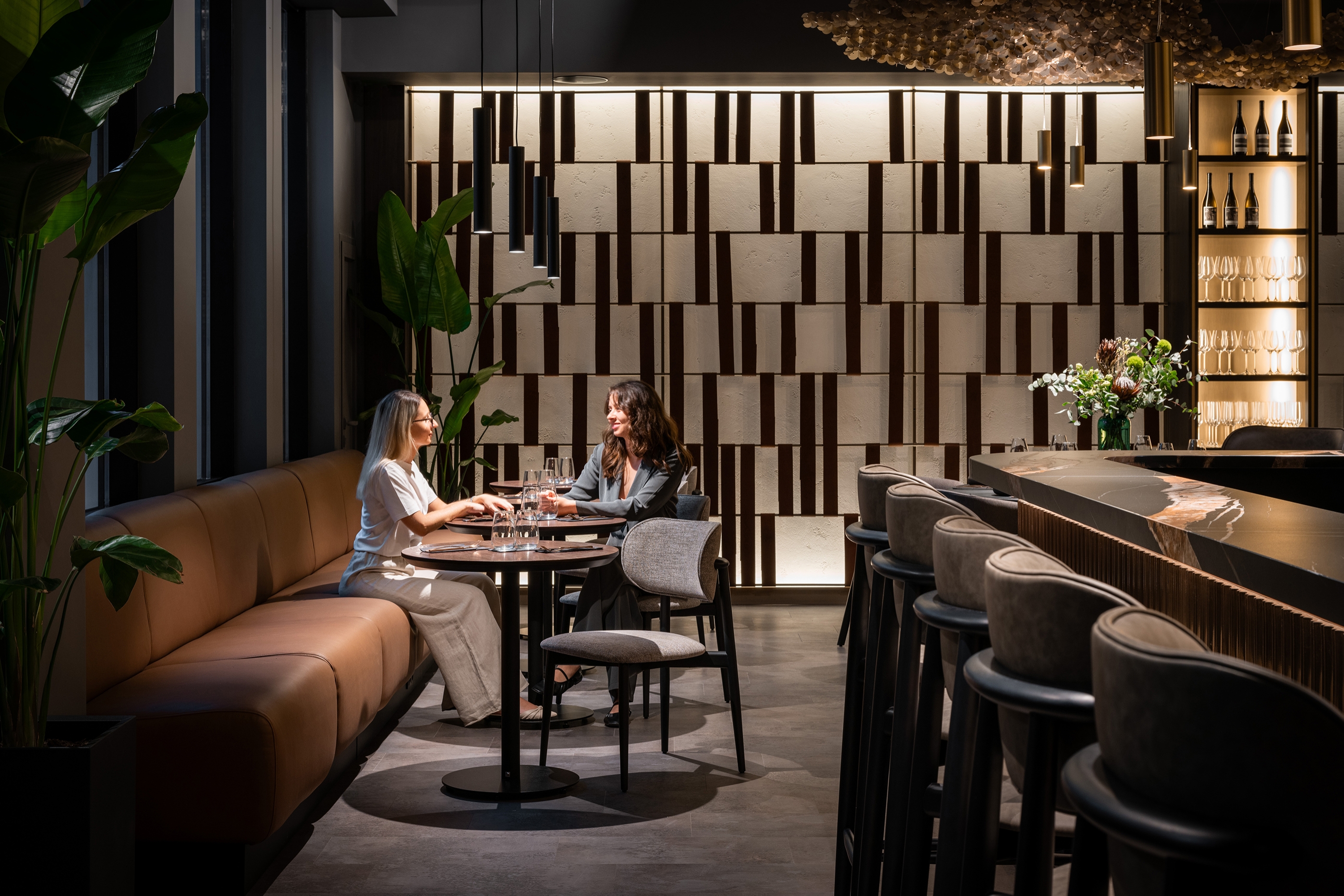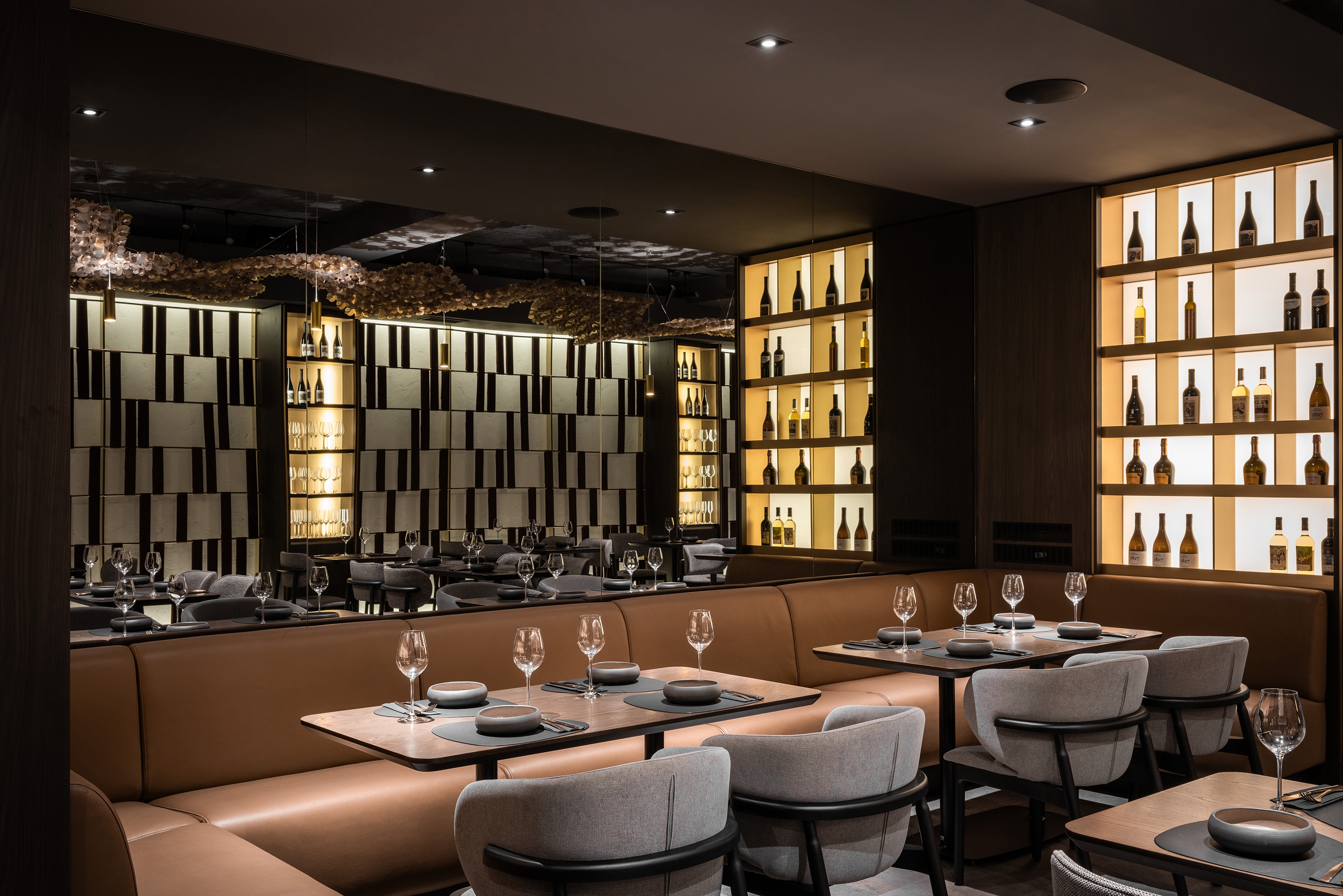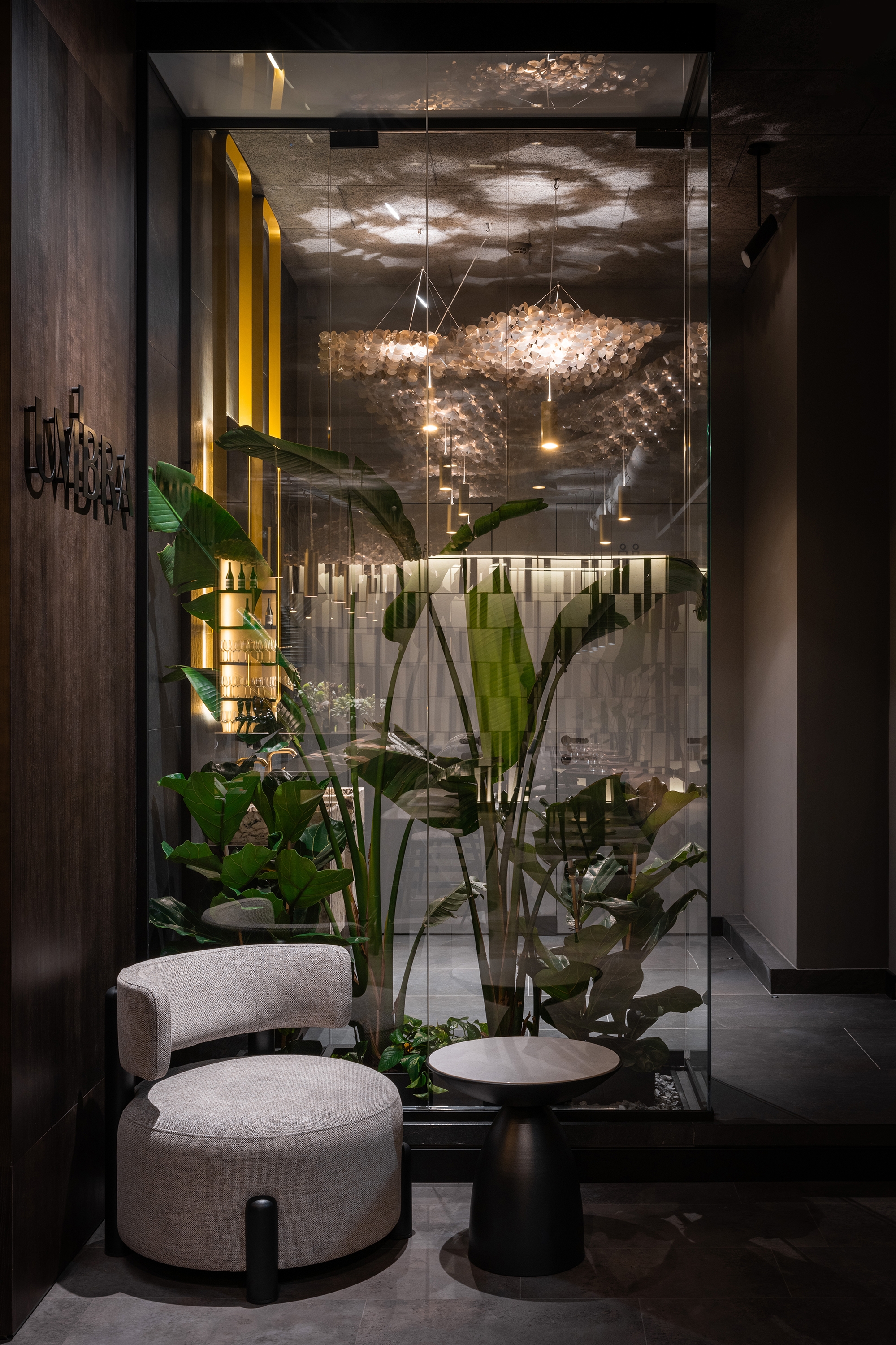 Umbra Restaurant transforms an underground space in the Regency Hotel into a sanctuary of understated luxury and refined intimacy. At its heart, a golden terracotta bar anchors the layout, guiding circulation and social interaction. The dining area unfolds with varied seating arrangements, while a softly lit planted vivarium offers a calm, contemplative pause. The design celebrates a sophisticated interplay of shadow and light: dark, textured surfaces are offset by golden accents, mirrors, and layered lighting, creating depth and visual intrigue. Every detail — from acoustic ceiling panels to tactile leather wall inserts — is crafted to enhance comfort, sensory experience, and elegance. By turning a basement into a luminous, flexible, and immersive environment, Umbra redefines how intimate hospitality spaces can feel expansive, vibrant, and memorable.