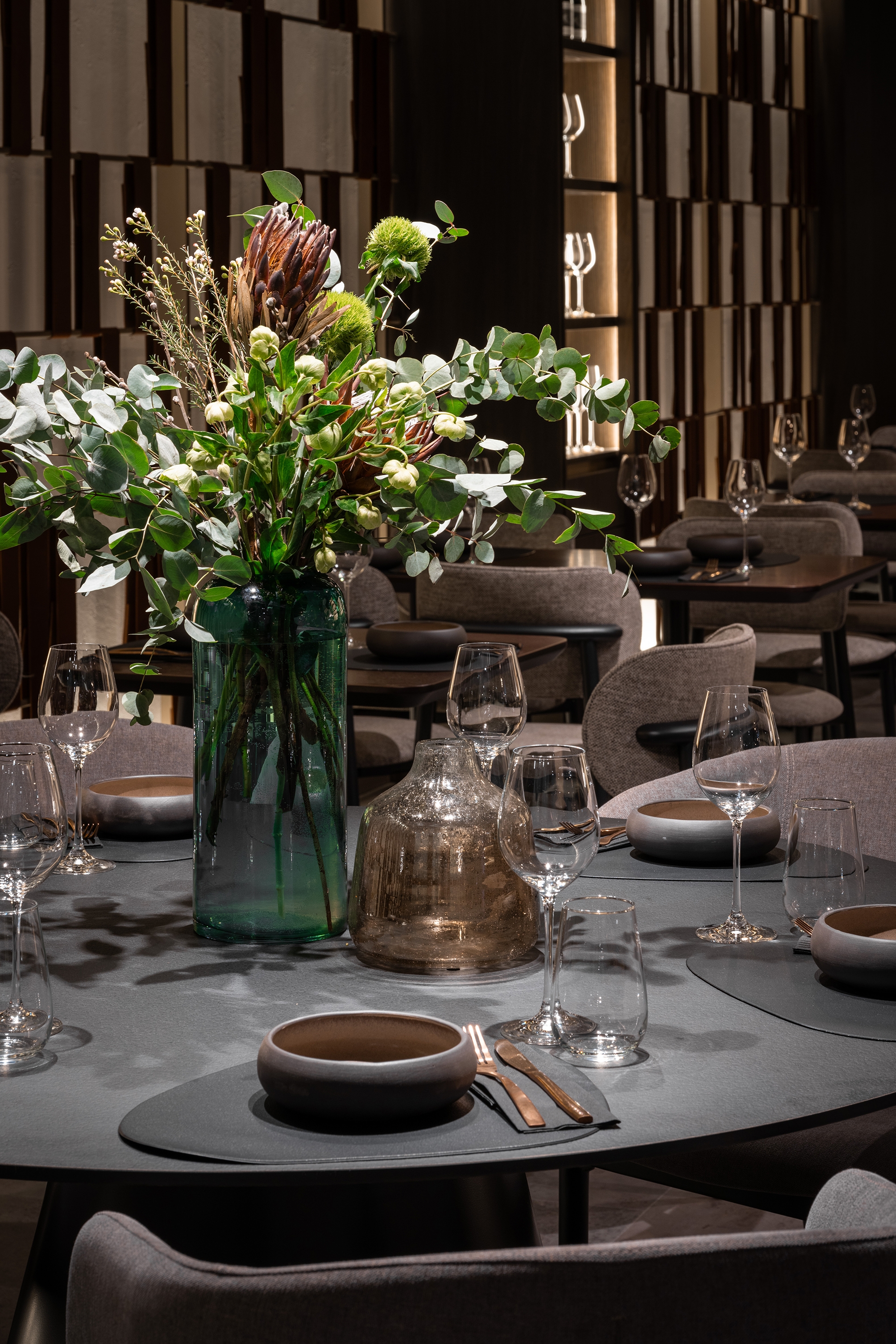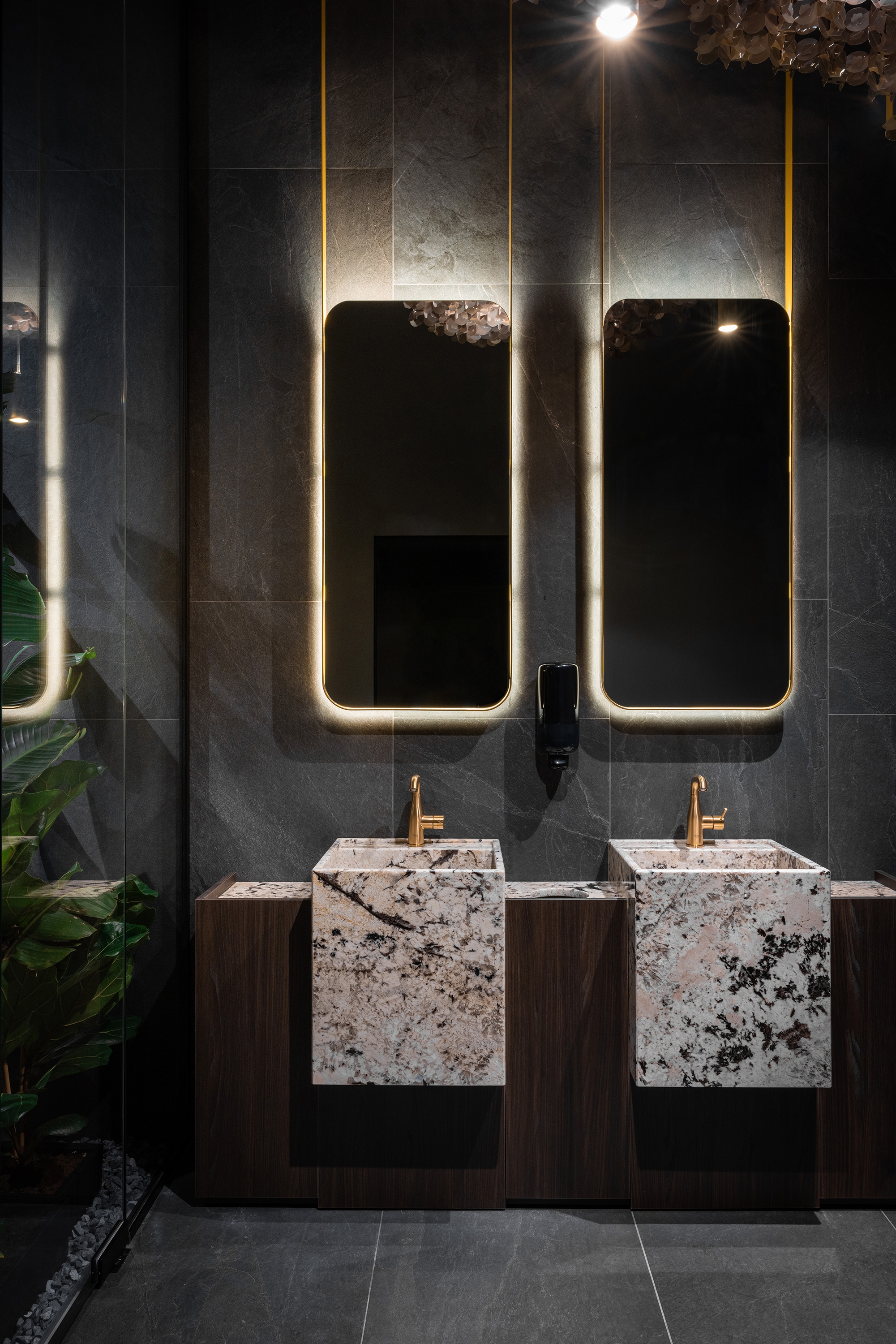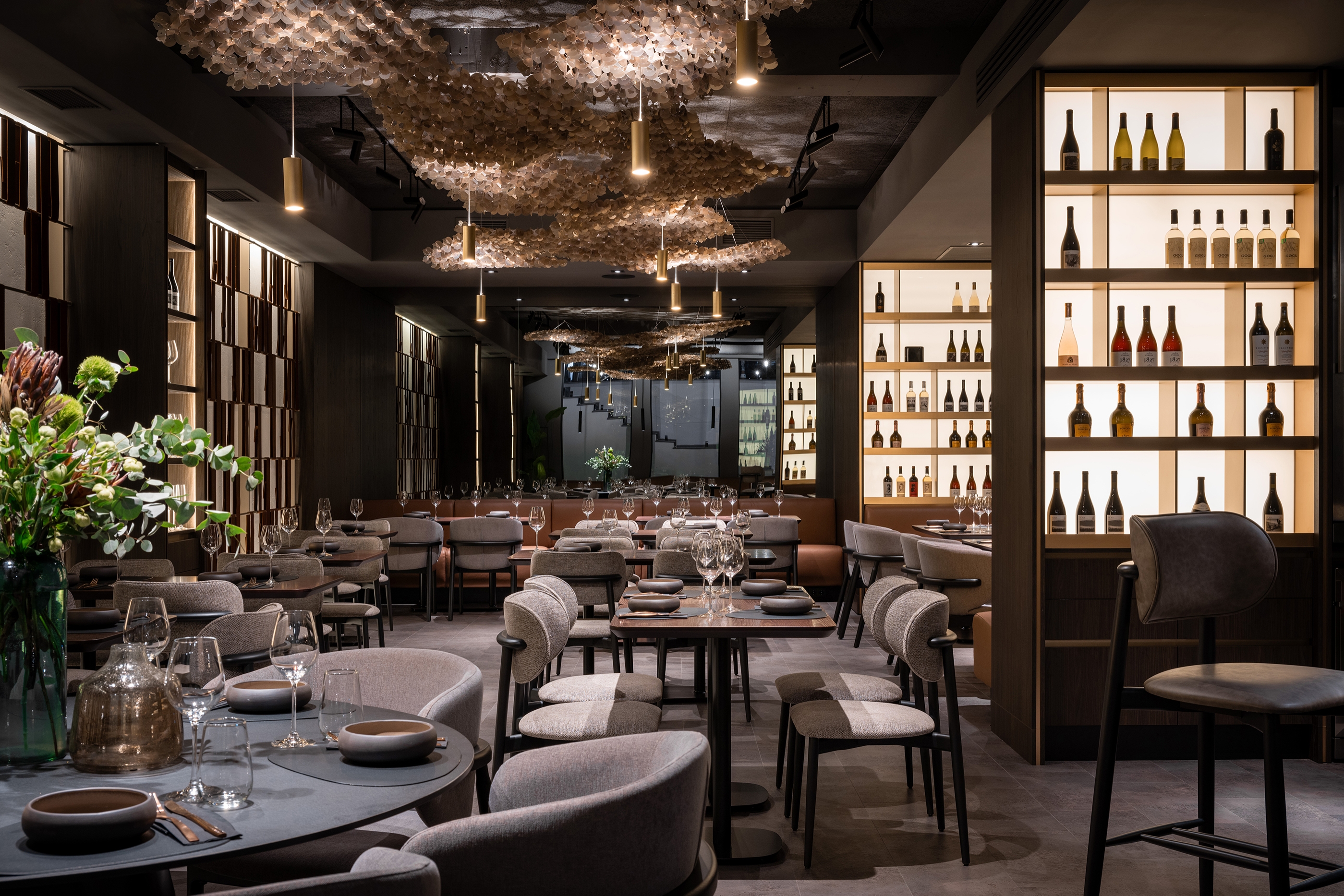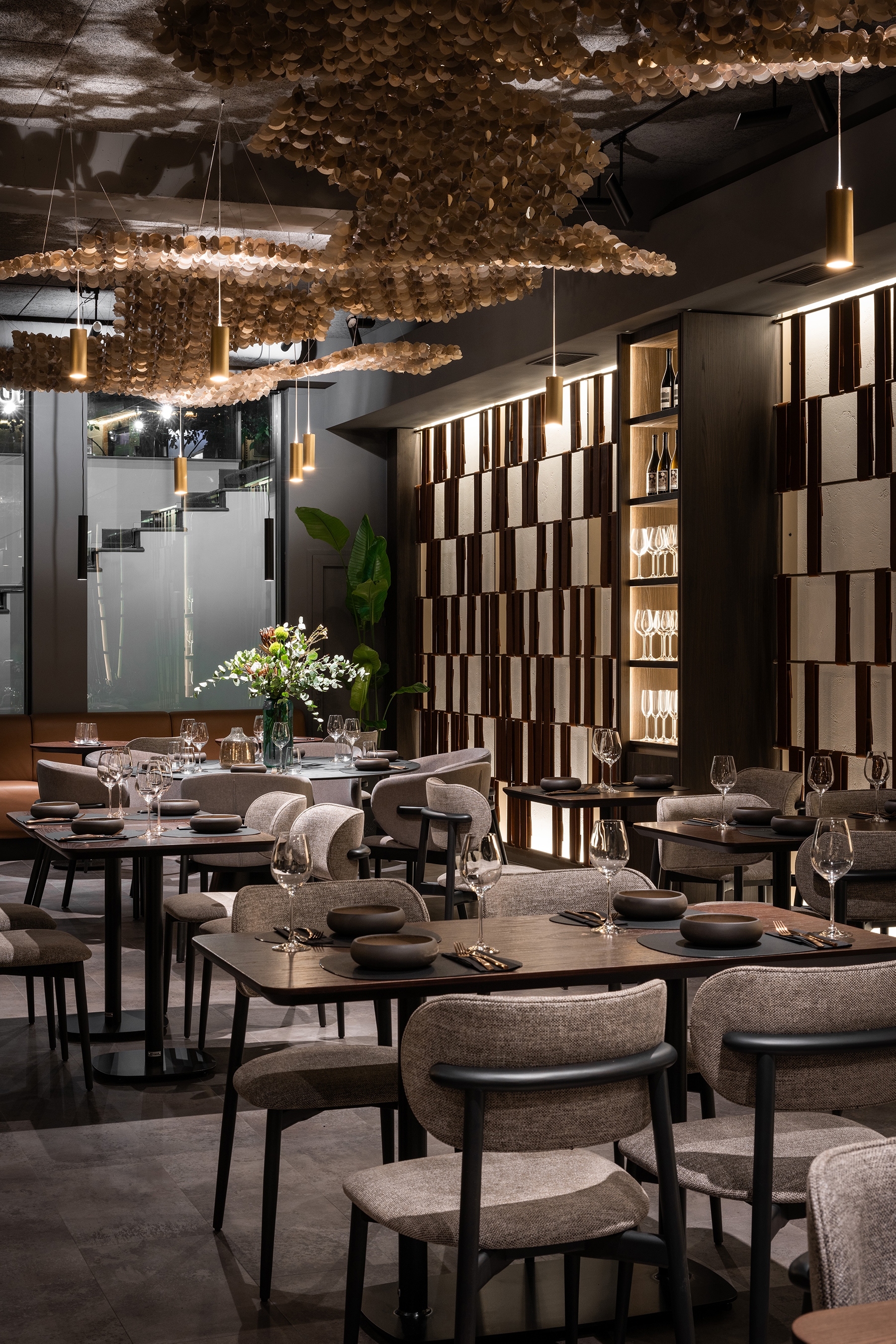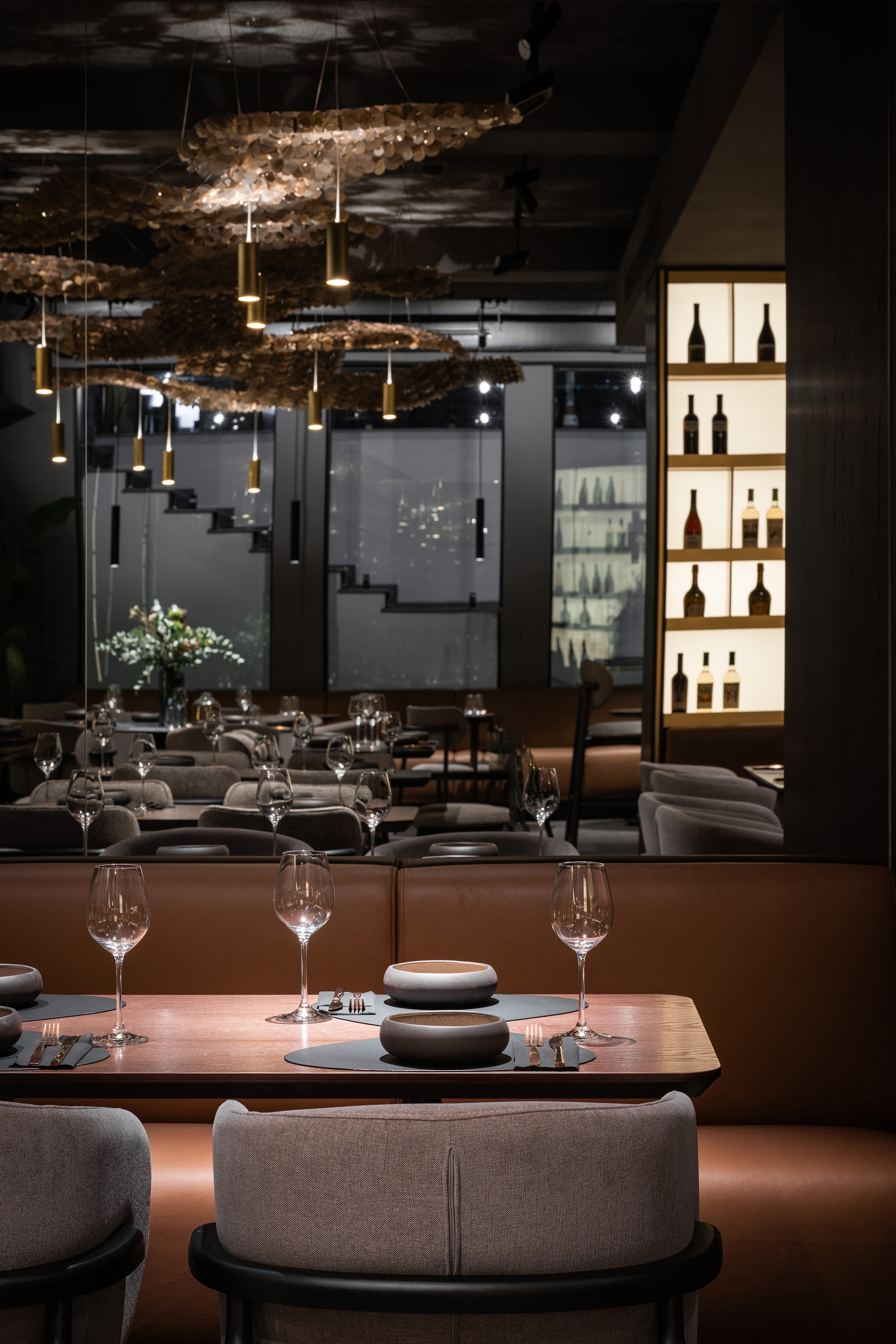 Umbra Restaurant transforms an underground space in the Regency Hotel into a sanctuary of understated luxury and refined intimacy. At its heart, a golden terracotta bar anchors the layout, guiding circulation and social interaction. The dining area unfolds with varied seating arrangements, while a softly lit planted vivarium offers a calm, contemplative pause. The design celebrates a sophisticated interplay of shadow and light: dark, textured surfaces are offset by golden accents, mirrors, and layered lighting, creating depth and visual intrigue. Every detail — from acoustic ceiling panels to tactile leather wall inserts — is crafted to enhance comfort, sensory experience, and elegance. By turning a basement into a luminous, flexible, and immersive environment, Umbra redefines how intimate hospitality spaces can feel expansive, vibrant, and memorable.