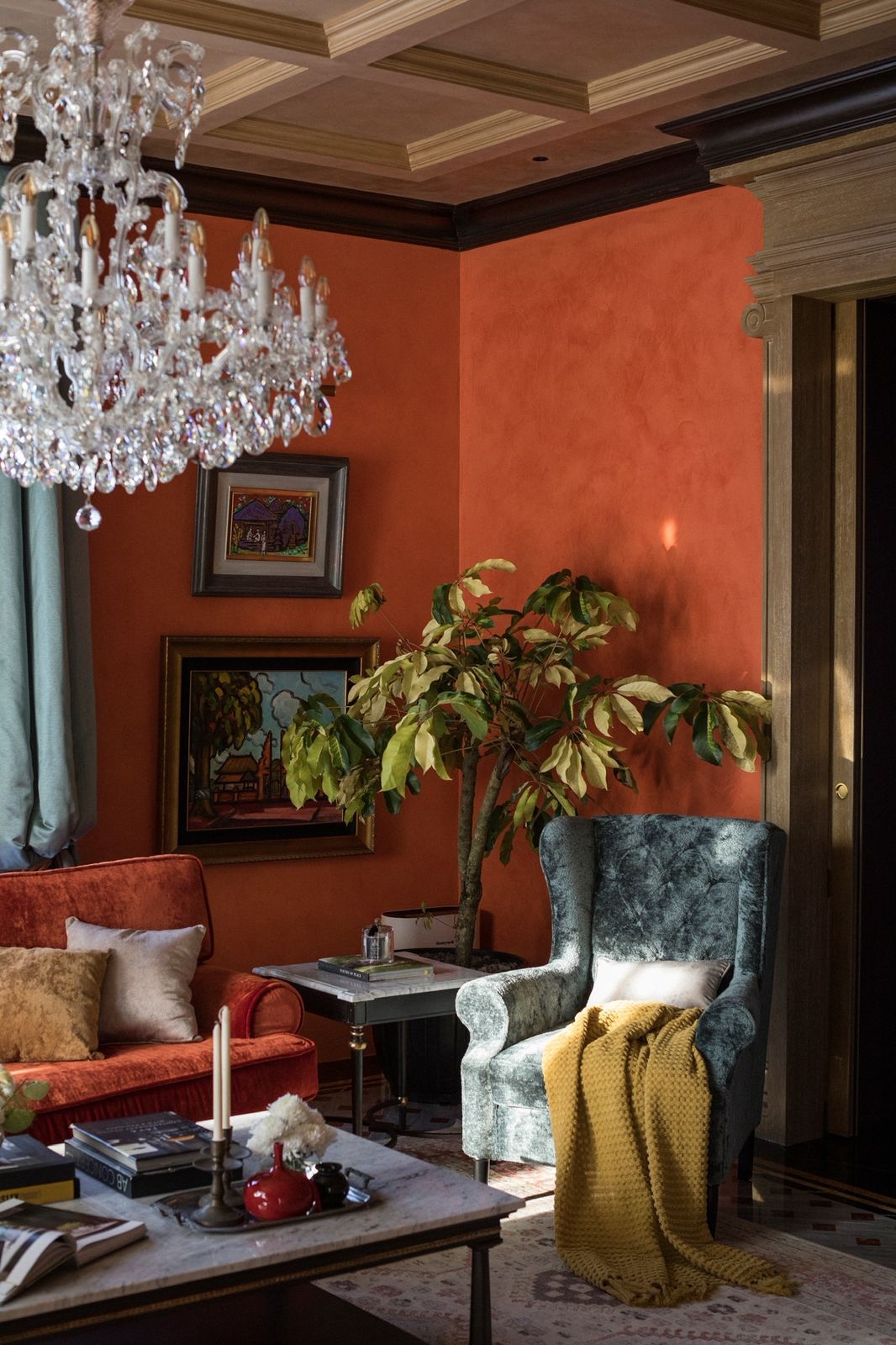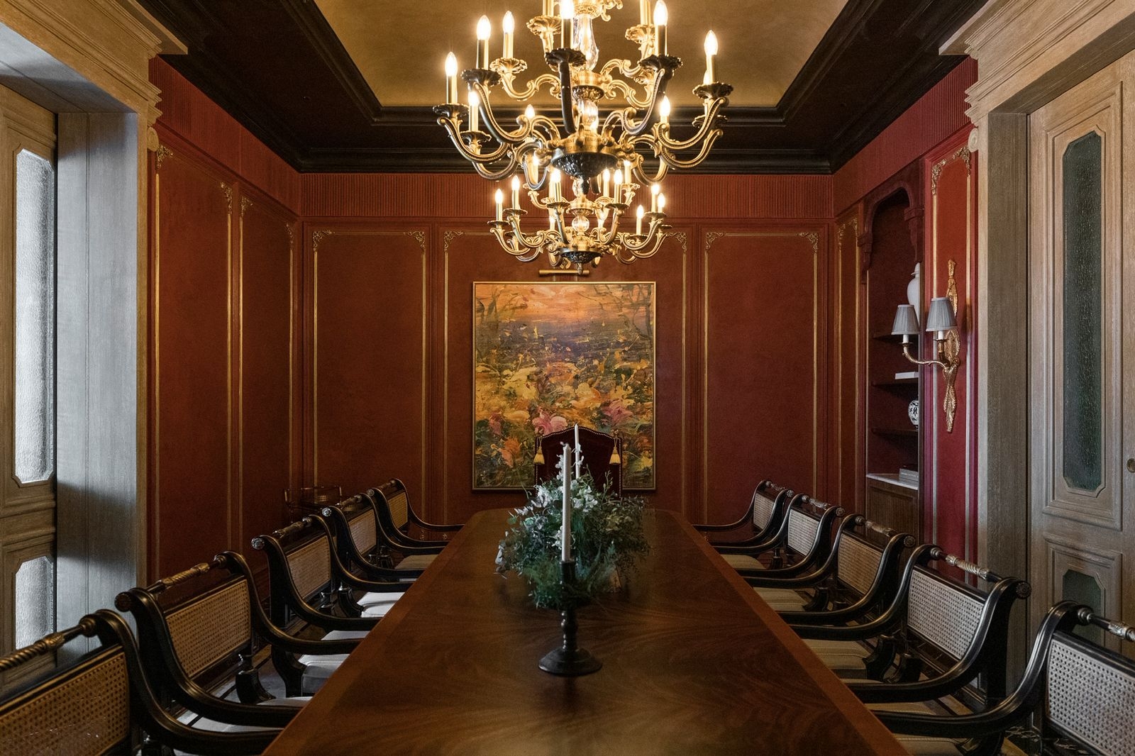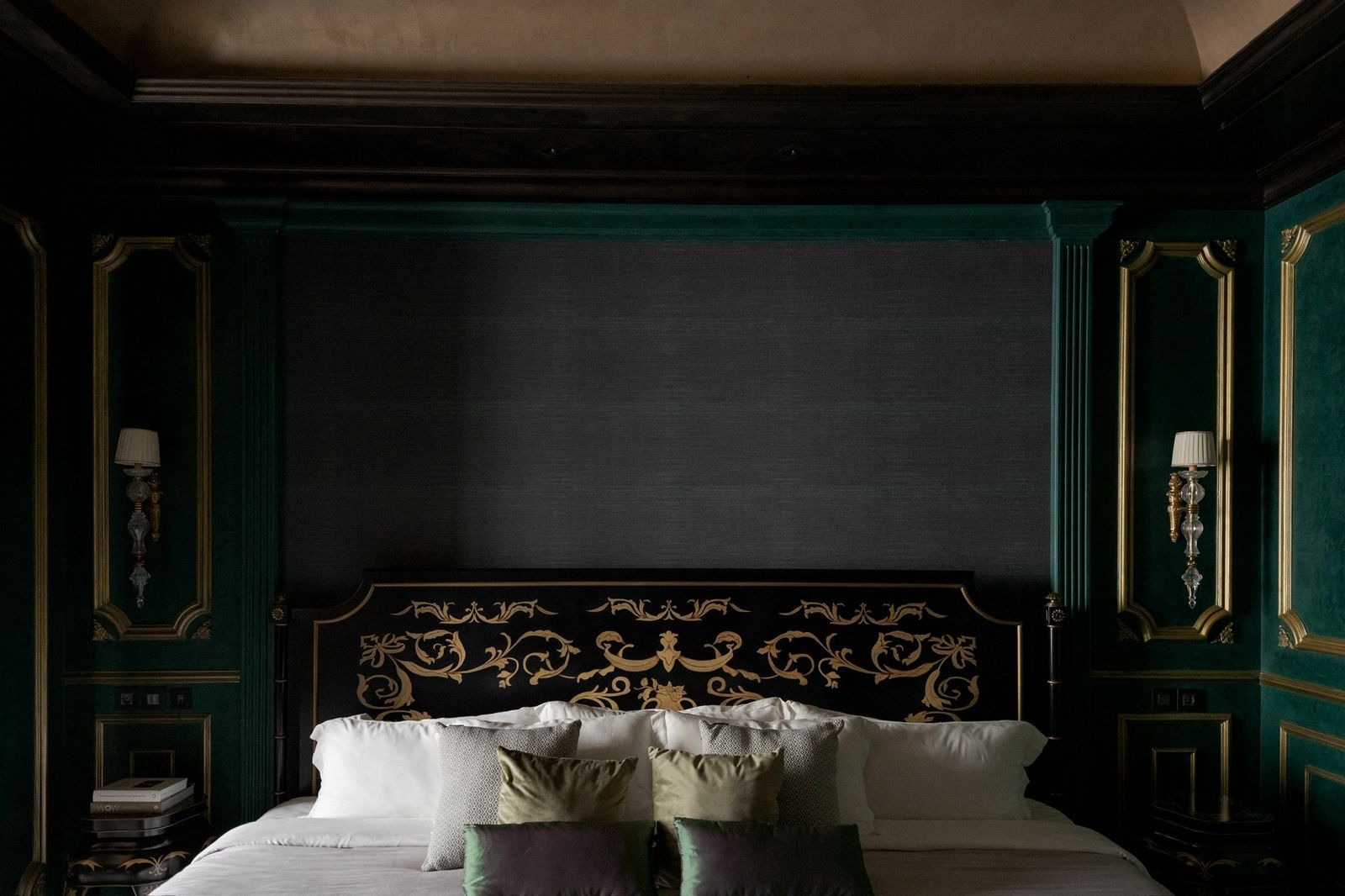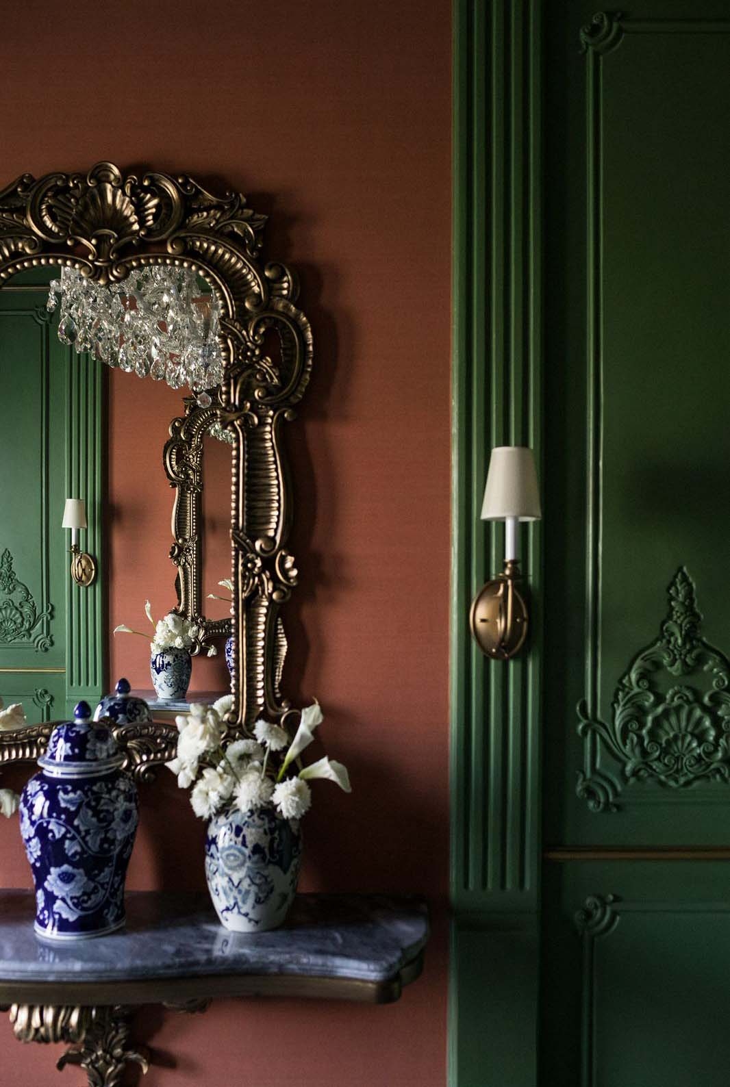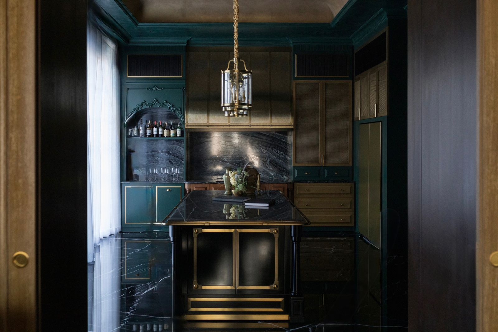 Conceived as a home that performs like a discreet private club, The Continental orchestrates arrival, ceremony, and retreat through a clear spatial narrative. A mansard silhouette and a glass-and -iron canopy announce identity and craft. Inside, a grand living room -red walls, turquoise drapery, chandelier -sets of theatrical tone, balanced by a more formal red-paneled dining room. A verdant spine stretches like a living artery through the heart of the house, layered with mirrors and chandeliers that echo depth and stir anticipation. Material richness is carried into an emerald -and -brass kitchen and a marble island, while curated antique vignettes weave cultural memory into the composition. Private quarters pivot to intimacy; a dark green and gold suite, a hushed spa/ massage room with carved timber, and a pool terrace edged in black -and -white checks deliver hospitality -grade comfort. Throughout, travertine, oak, burnished metals and tailored upholstery pair durability with tactility, creating a residence that is disciplined, dramatic and deeply livable.