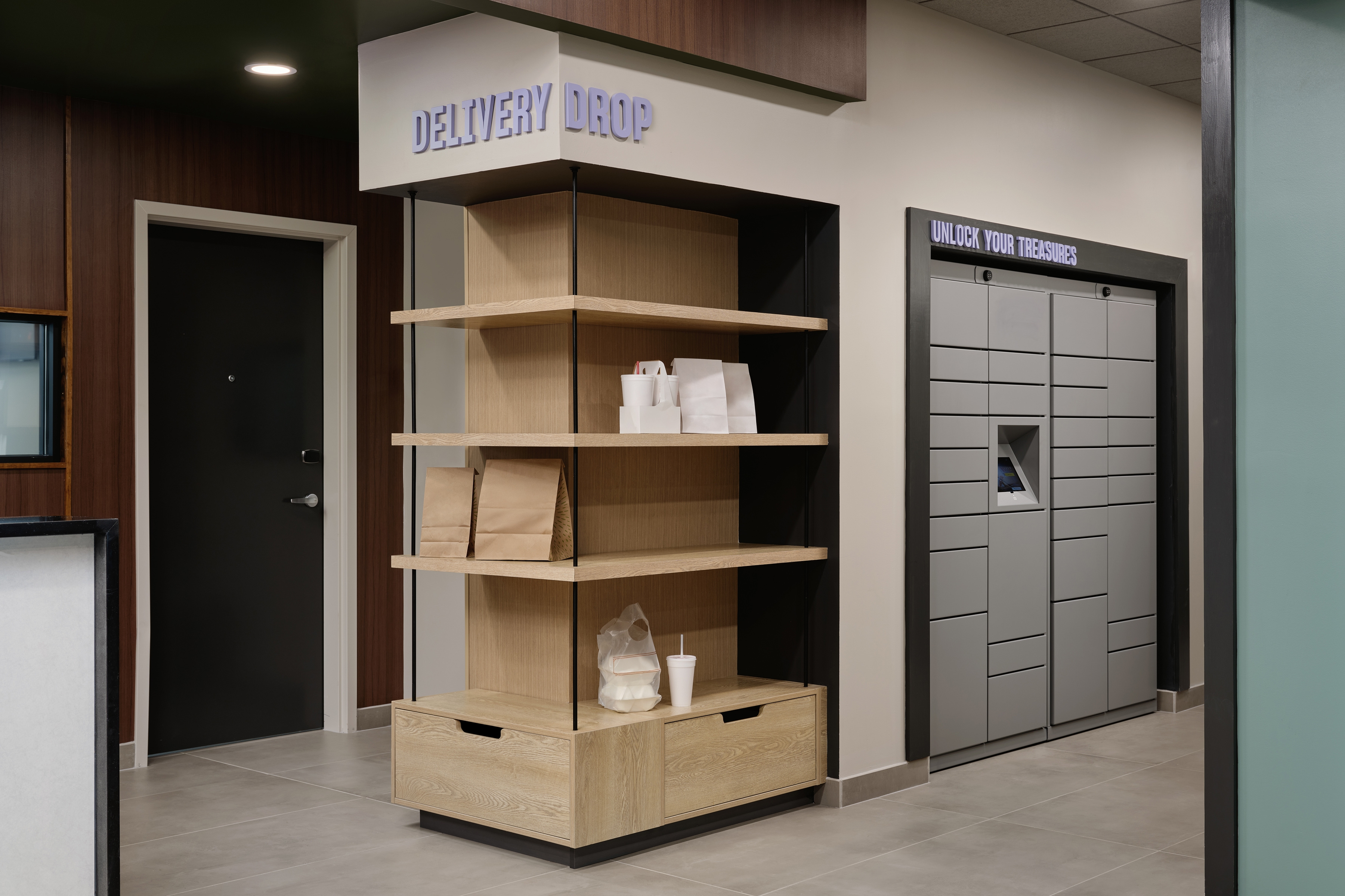 Once inside, Guests experience the hyperfunctional, one-stop public amenities space. It’s a streamlined space focused on amenities that mean the most to long-stay guests such as Guest Laundry, Community Buzz board, Retail market, Grab’n’go Breakfast, Front Desk, Delivery Drop & Lockers, Hydration Station, and Fitness.