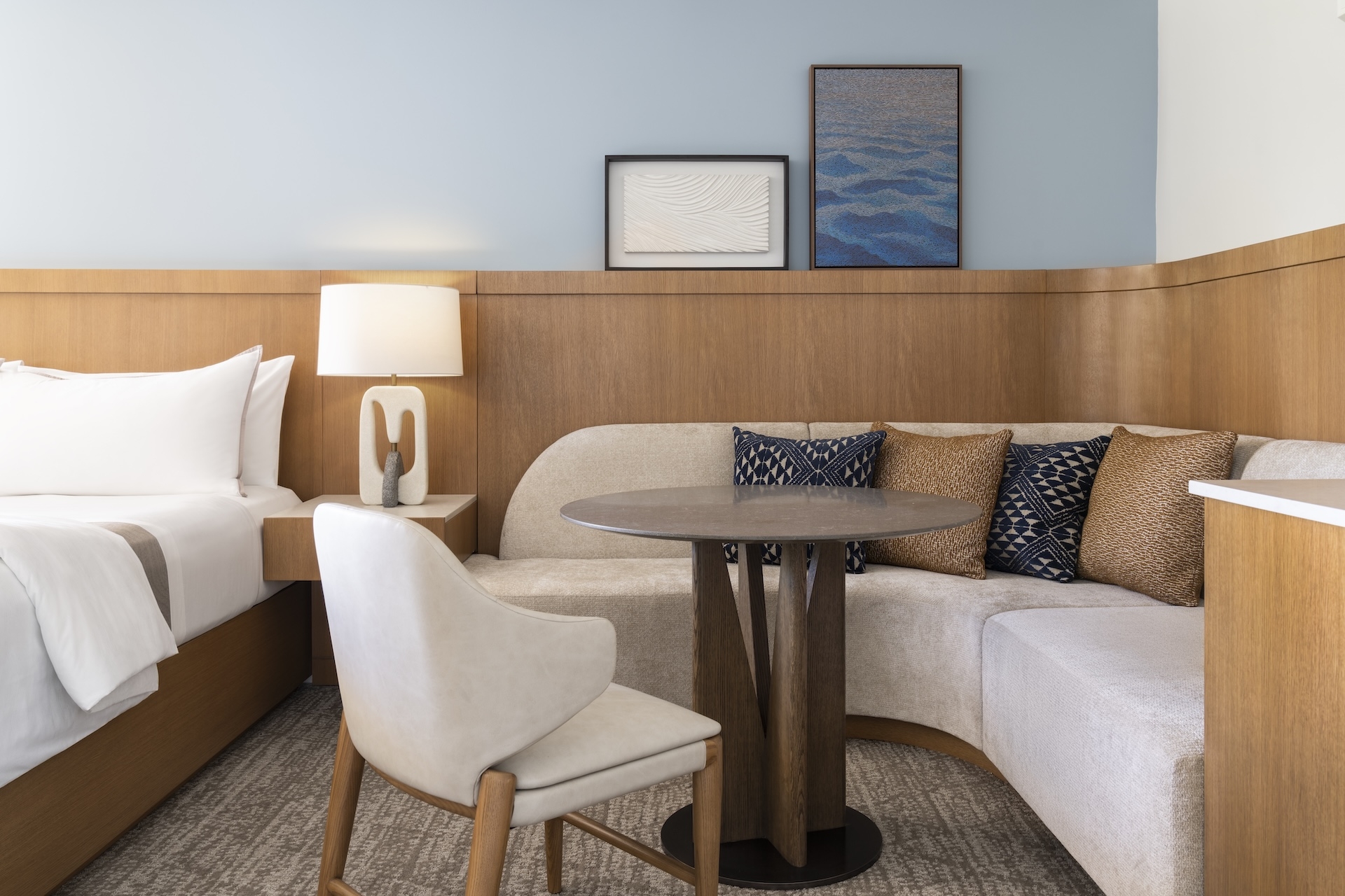 Known as the “First Lady of Waikiki,” Moana Surfrider is undergoing a transformative renewal that honors its 1901 Victorian soul while elevating every guest touchpoint. The refreshed Historic Lobby is light-filled and tranquil with curved seating, sculptural chandeliers and refined millwork; a custom light piece and botanical art echo the courtyard’s 128-year-old banyan. In the Tower Wing, reimagined rooms deliver serene modern beach luxury: clean, rhythmic patterns, warm metallics, integrated work zones and curved banquettes framed by lanais that extend living outdoors and views. Key design elements: biophilic cues drawn from banyan forms; a base palette inspired by where fresh and ocean water meet, layered with wing-specific accents; diffused and dappled lighting that softens edges and reveals detail; organic shapes and resilient materials calibrated for oceanfront life today. Upcoming phases extend this design approach into the Banyan and Diamond wings and introduce a new oceanfront event space, unifying the property ahead of its 125th anniversary on 3/11/26. The design renews heritage with clarity, comfort and craft: Waikiki’s past and present in effortless dialogue.
