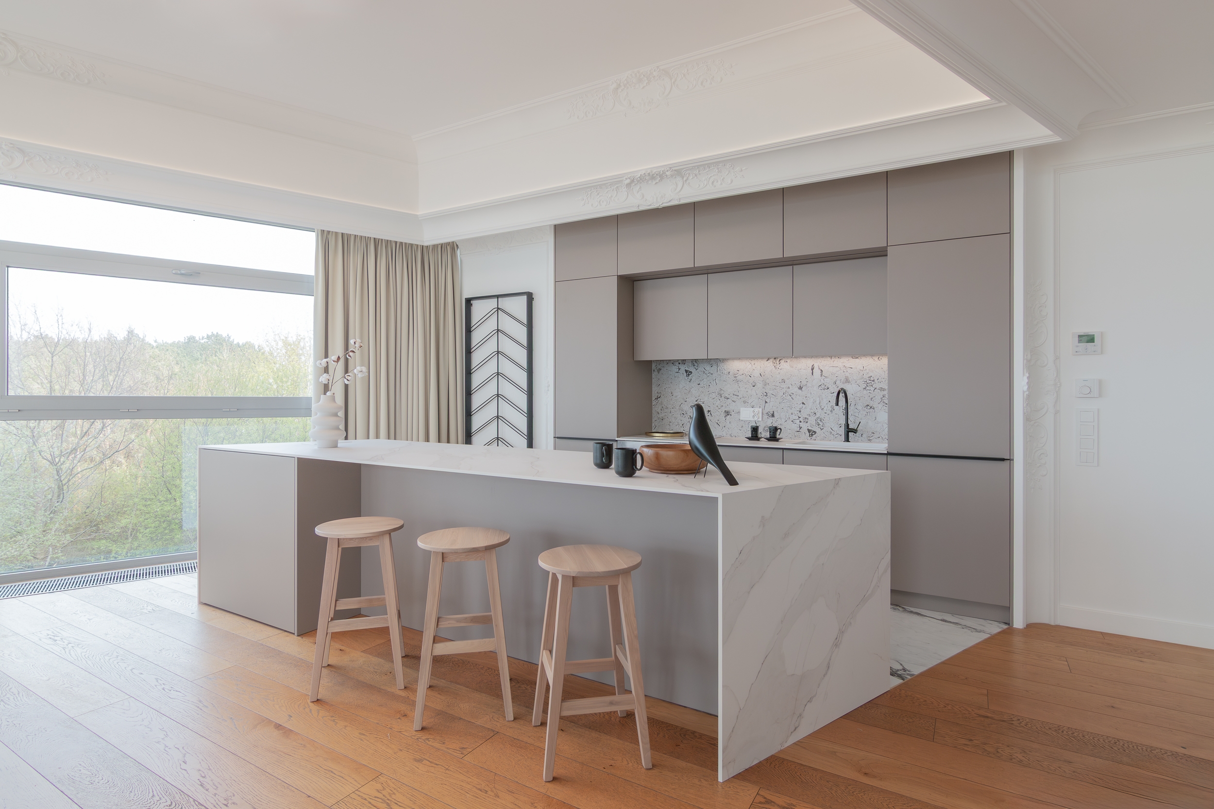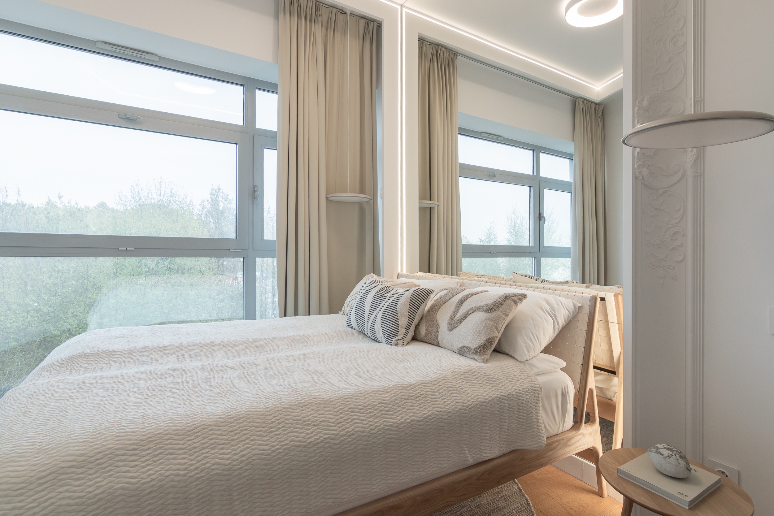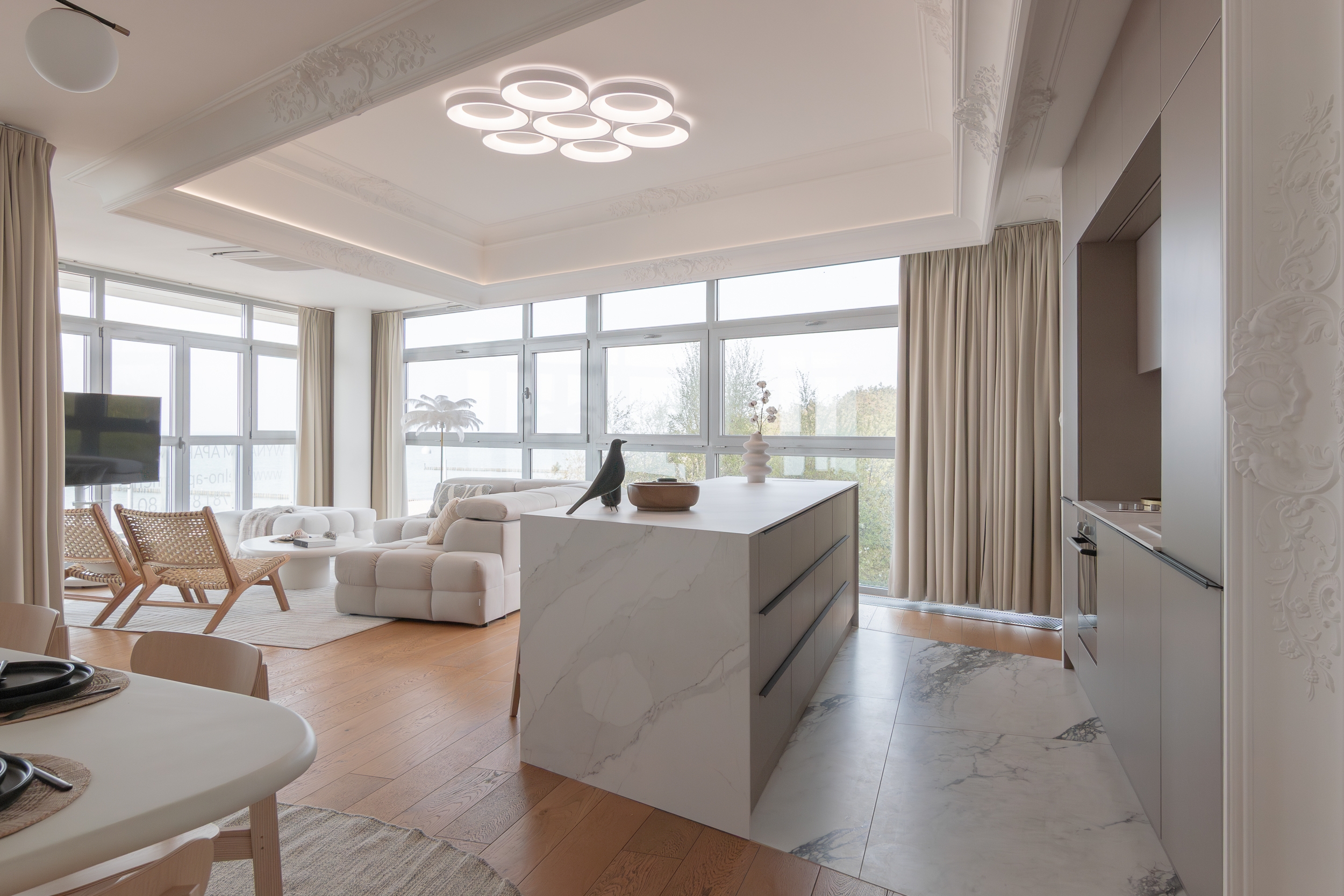 Both in the living area and the private area, the view outside the window plays the leading role. The living area with a lounge, kitchenette and dining room has been complemented with carefully selected furniture that does not disturb the atmosphere of the place. The kitchen is dominated by a monumental island covered with natural marble, where you can have a quick breakfast or cook an exquisite dinner. The private area consists of two almost symmetrical guest bedrooms with a bathroom.These rooms also have a relaxing atmosphere, bathed in subdued, warm tones and varied textures of natural materials.