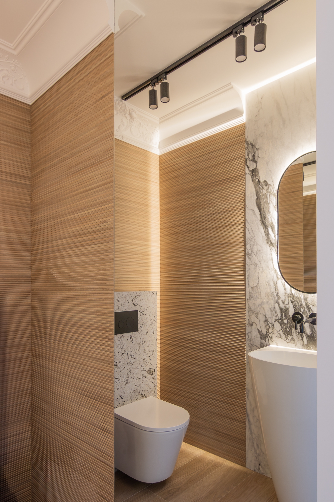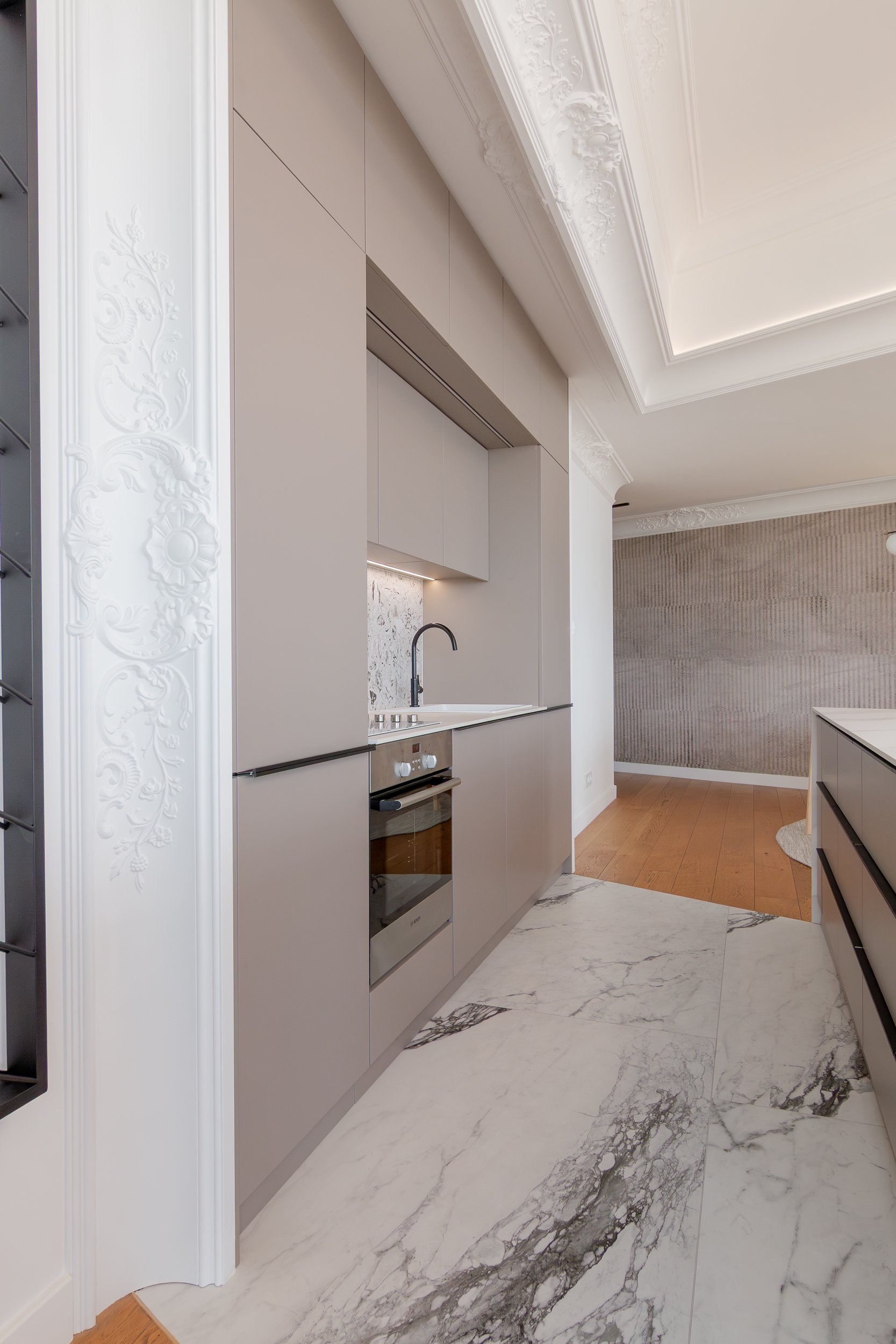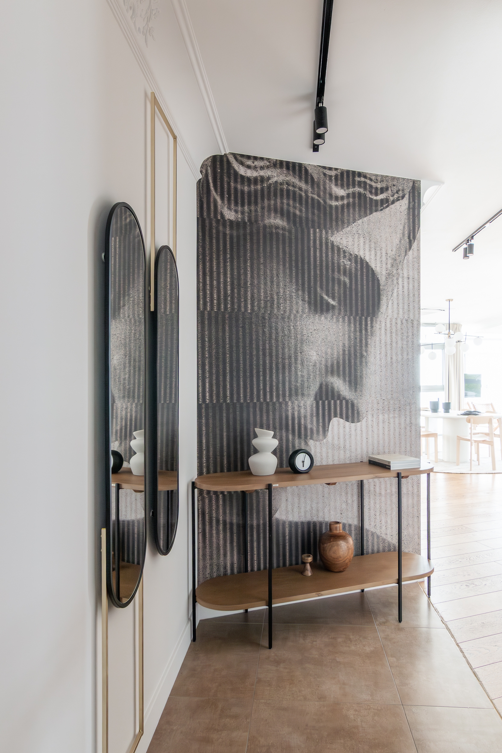 Both in the living area and the private area, the view outside the window plays the leading role. The living area with a lounge, kitchenette and dining room has been complemented with carefully selected furniture that does not disturb the atmosphere of the place. The kitchen is dominated by a monumental island covered with natural marble, where you can have a quick breakfast or cook an exquisite dinner. The private area consists of two almost symmetrical guest bedrooms with a bathroom.These rooms also have a relaxing atmosphere, bathed in subdued, warm tones and varied textures of natural materials.