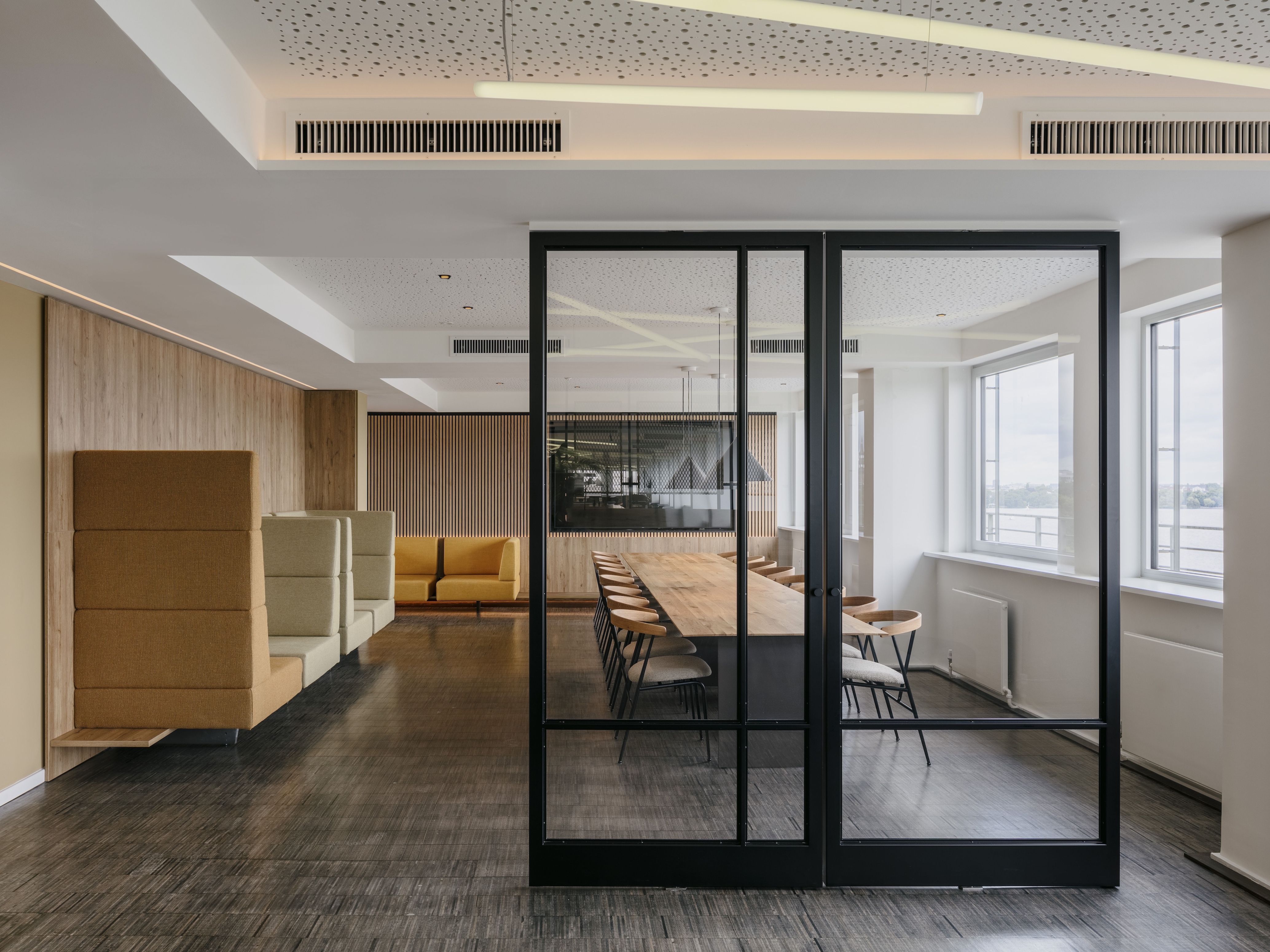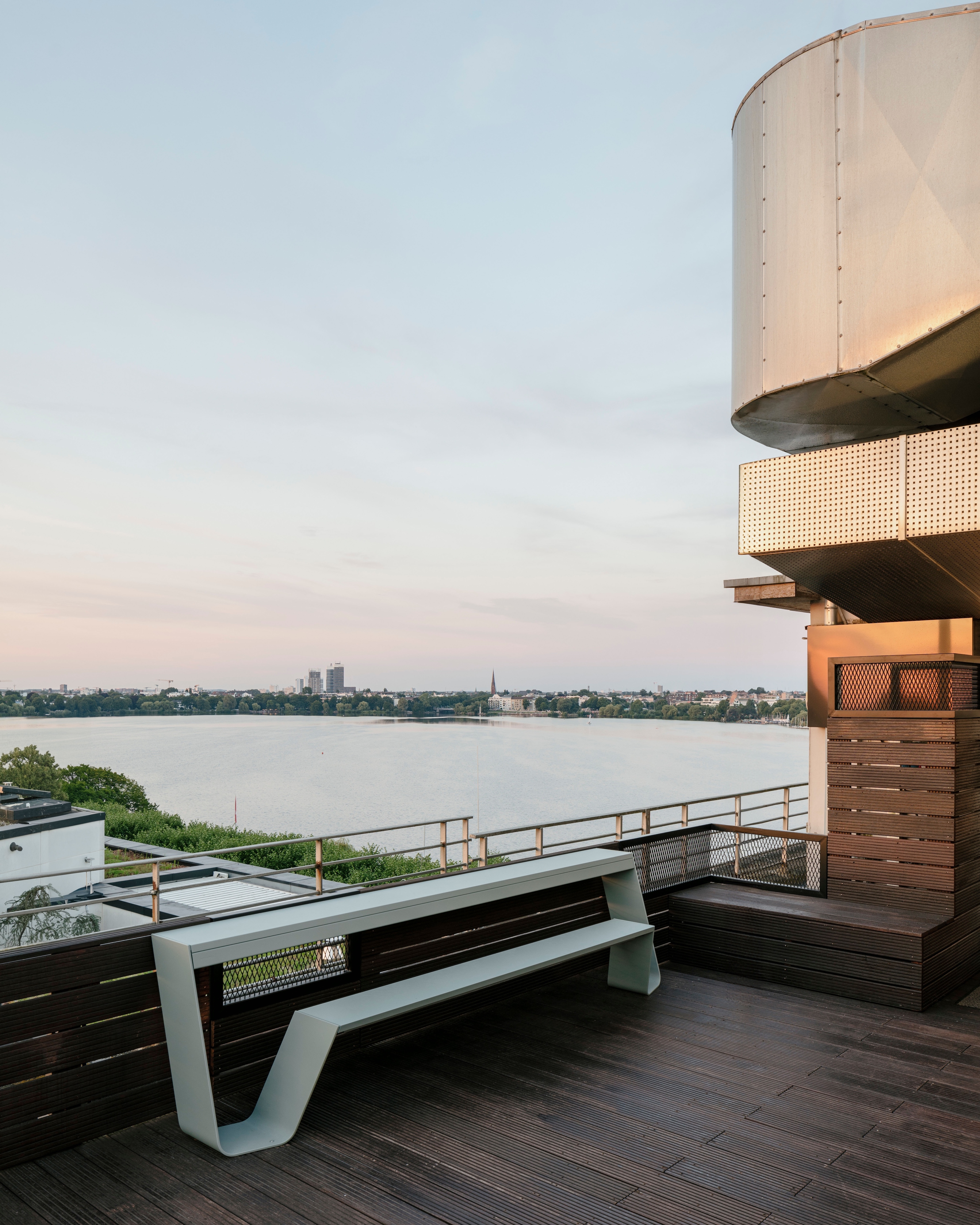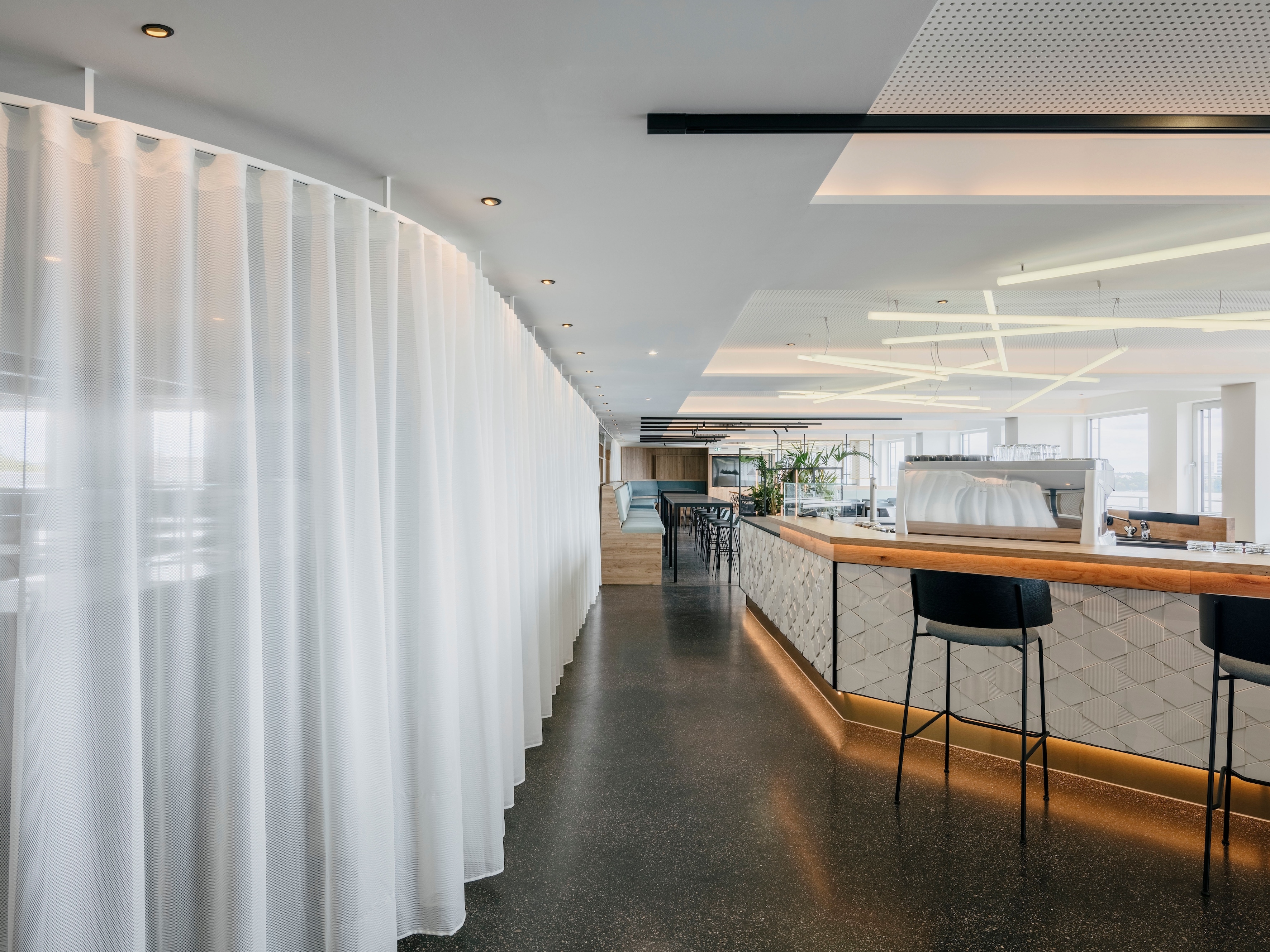 As part of the modernisation of BAT Germany’s Hamburg headquarters, the former canteen was transformed into the versatile club restaurant "Seven" on the seventh floor – with a roof terrace and a view of the Außenalster.