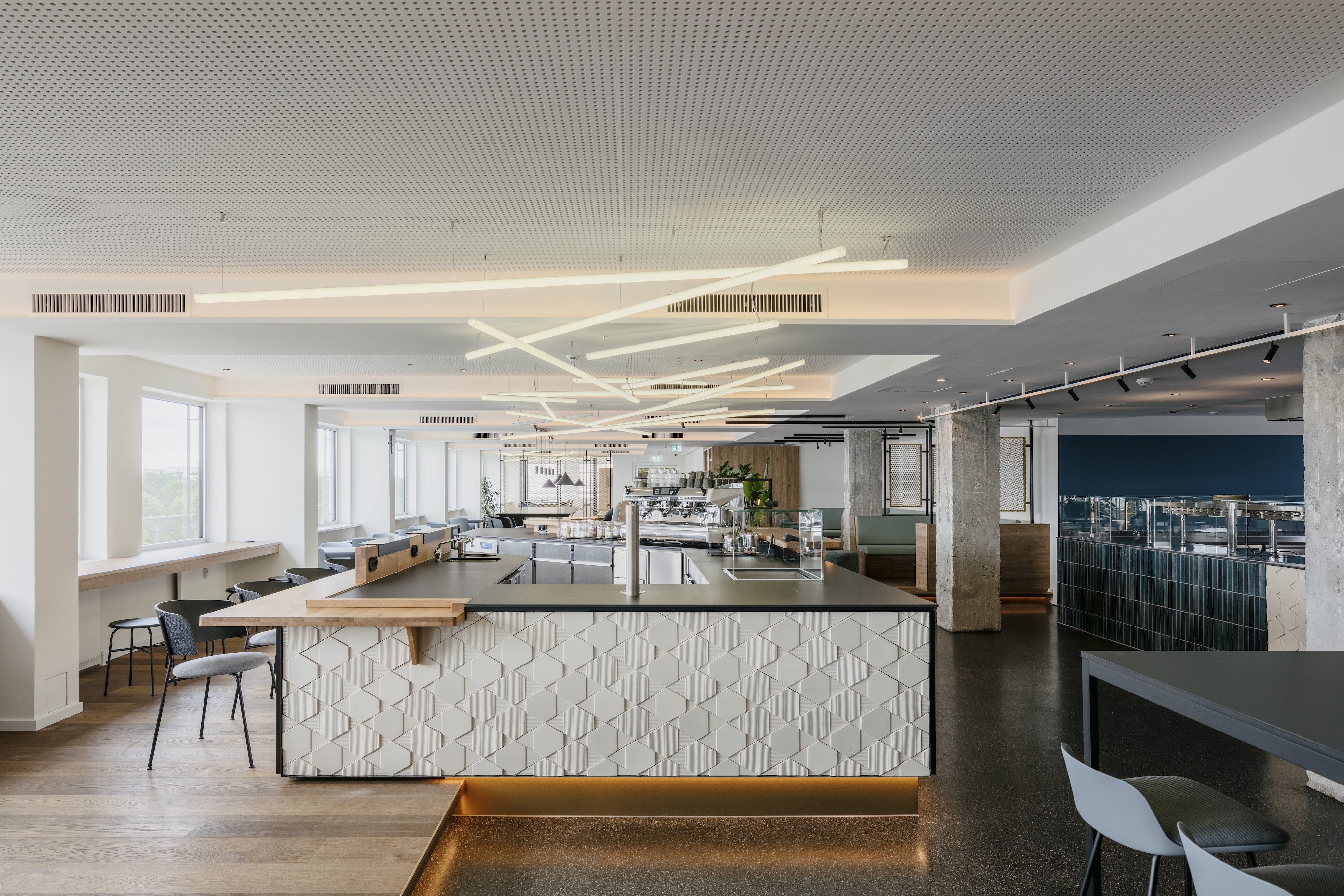 The goal was to create a space that meets the diverse needs of around 350 employees and goes far beyond the classic canteen concept. "Seven" can be many things: breakfast room, meeting place, retreat, office, or bar – depending on the time of day, the occasion and the mood.