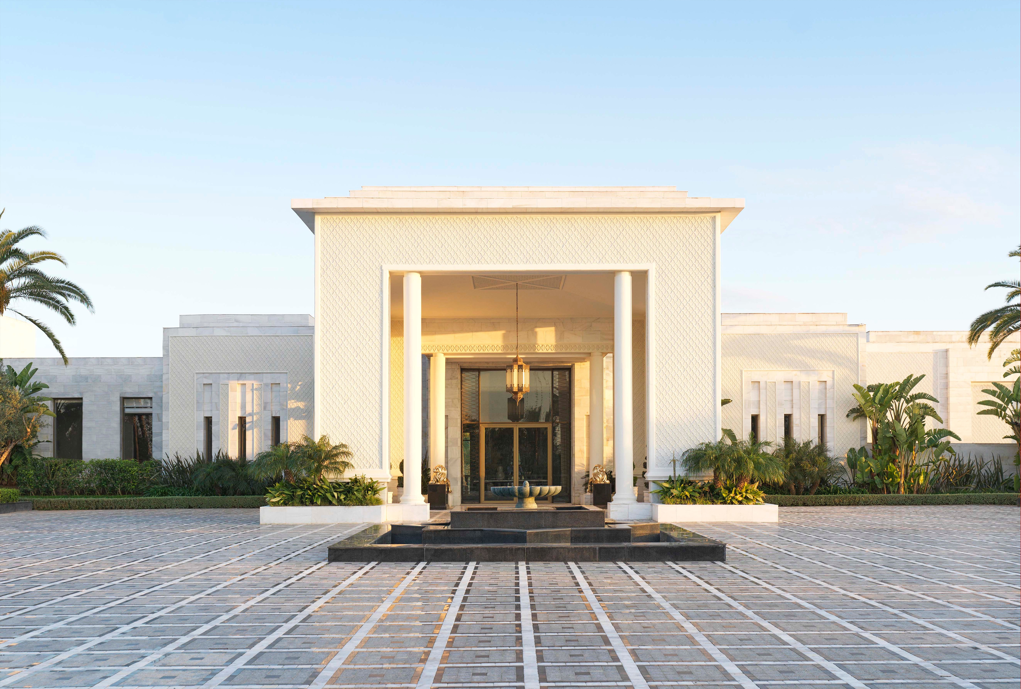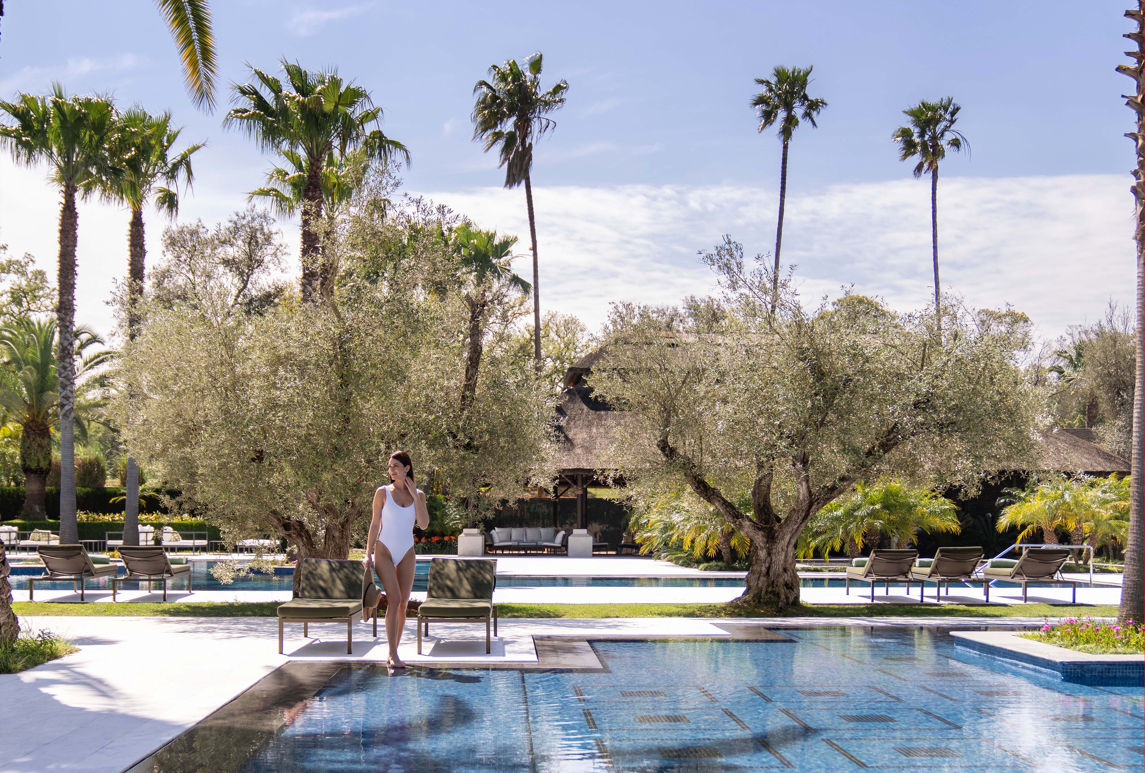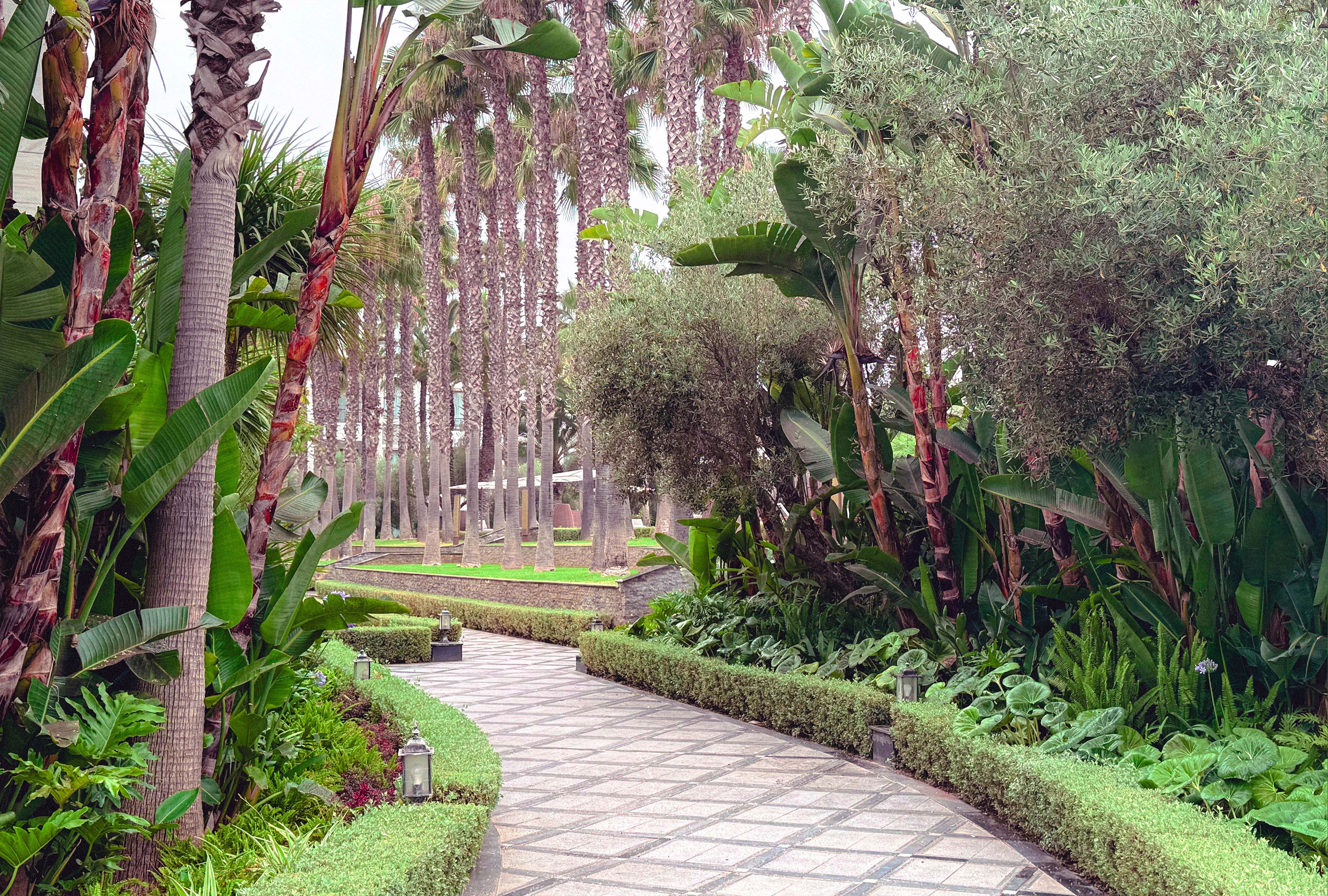 Within this framework, palm groves, olive clusters and clipped hedges shape shaded courtyards, water courts and fragrant paths. Guests arrive through a reflective pool shaded by ancient olives, while geometric paving and flowing rills recall Rabat’s historic gardens. At the heart of the resort, a palm-lined pool deck shimmers with mosaic tiles, cabanas and intimate sun terraces. Across the property, outdoor dining terraces, event lawns and the spa’s tropical courtyards extend a lush, contemplative atmosphere evoking the timeless ideal of an earthly paradise.