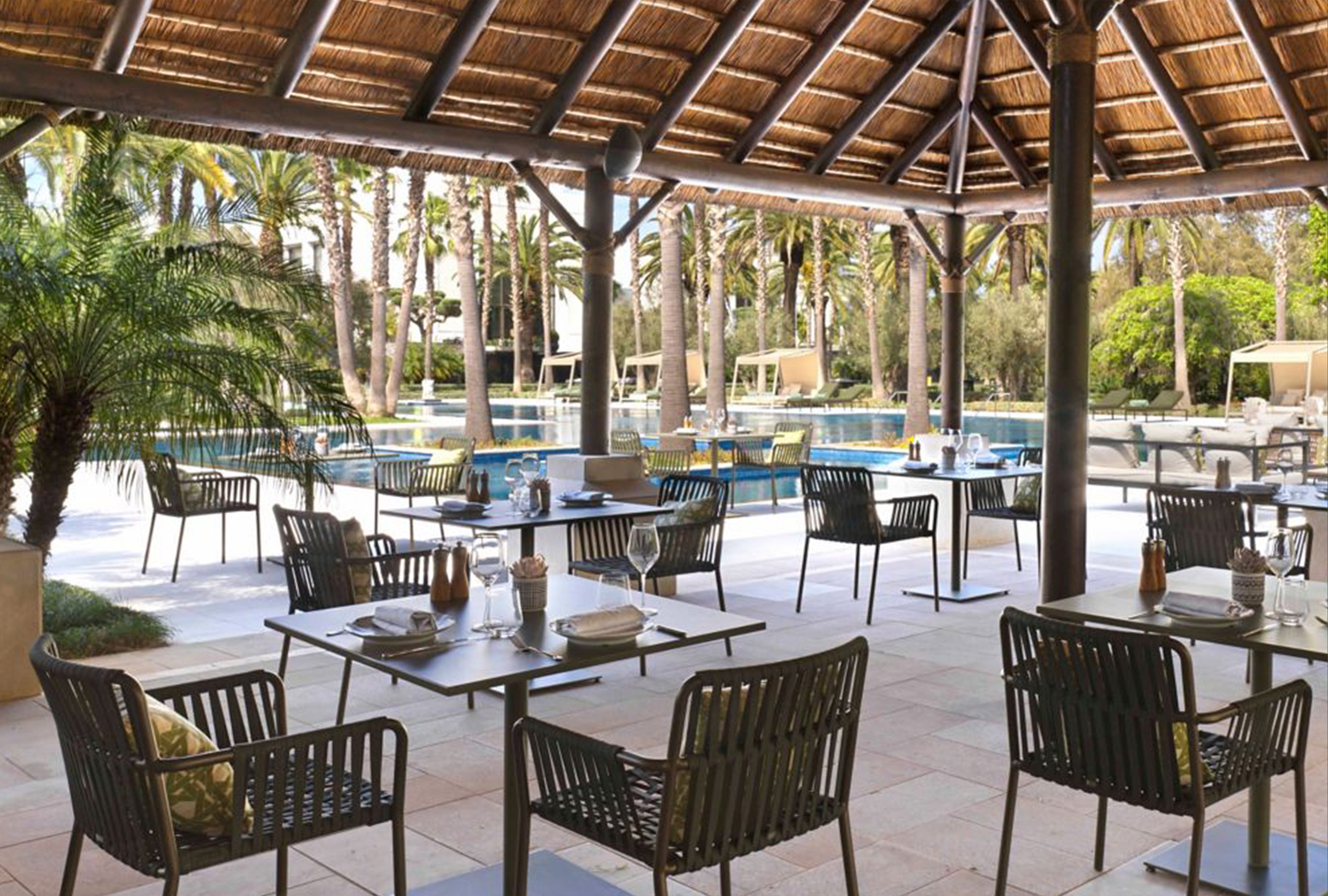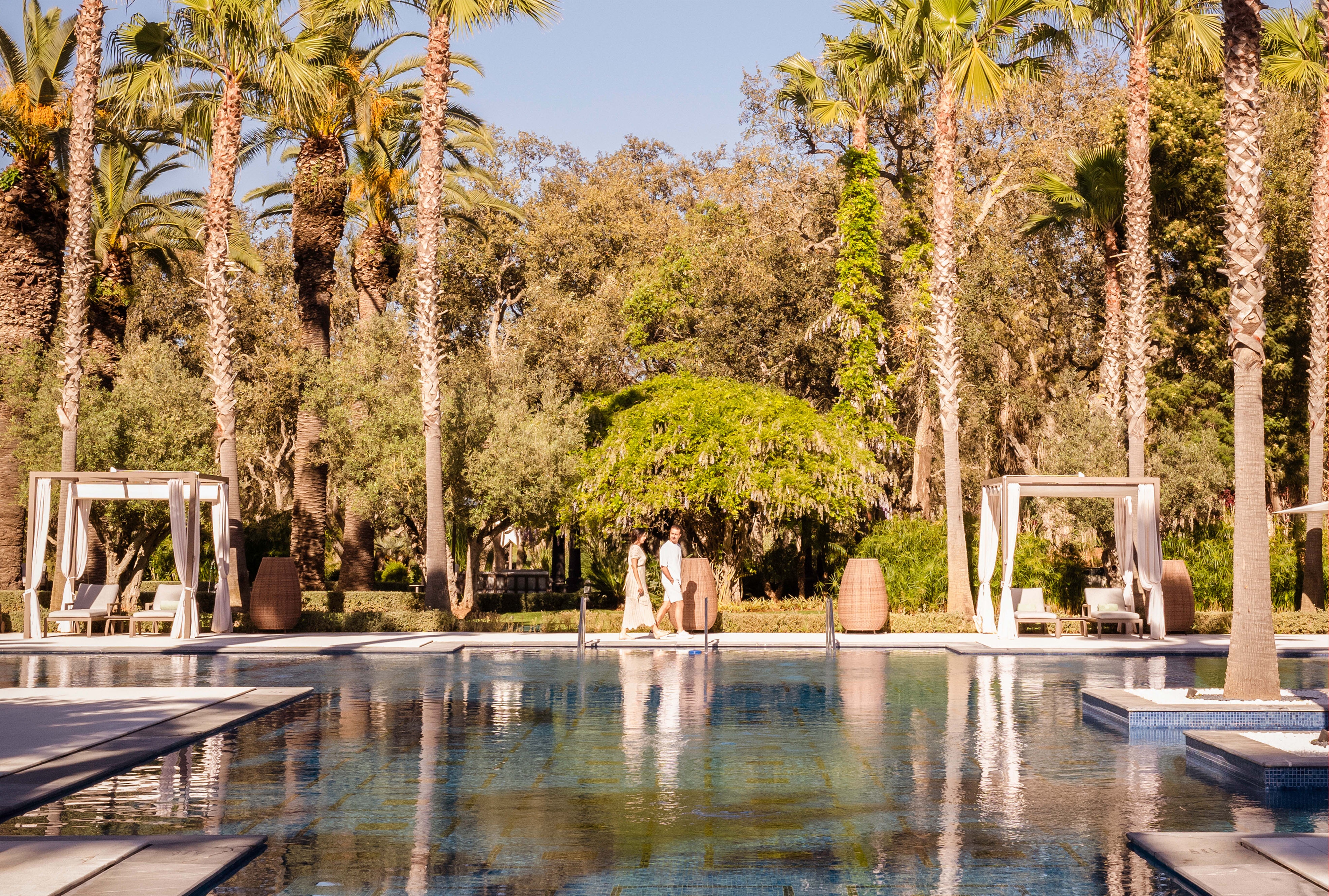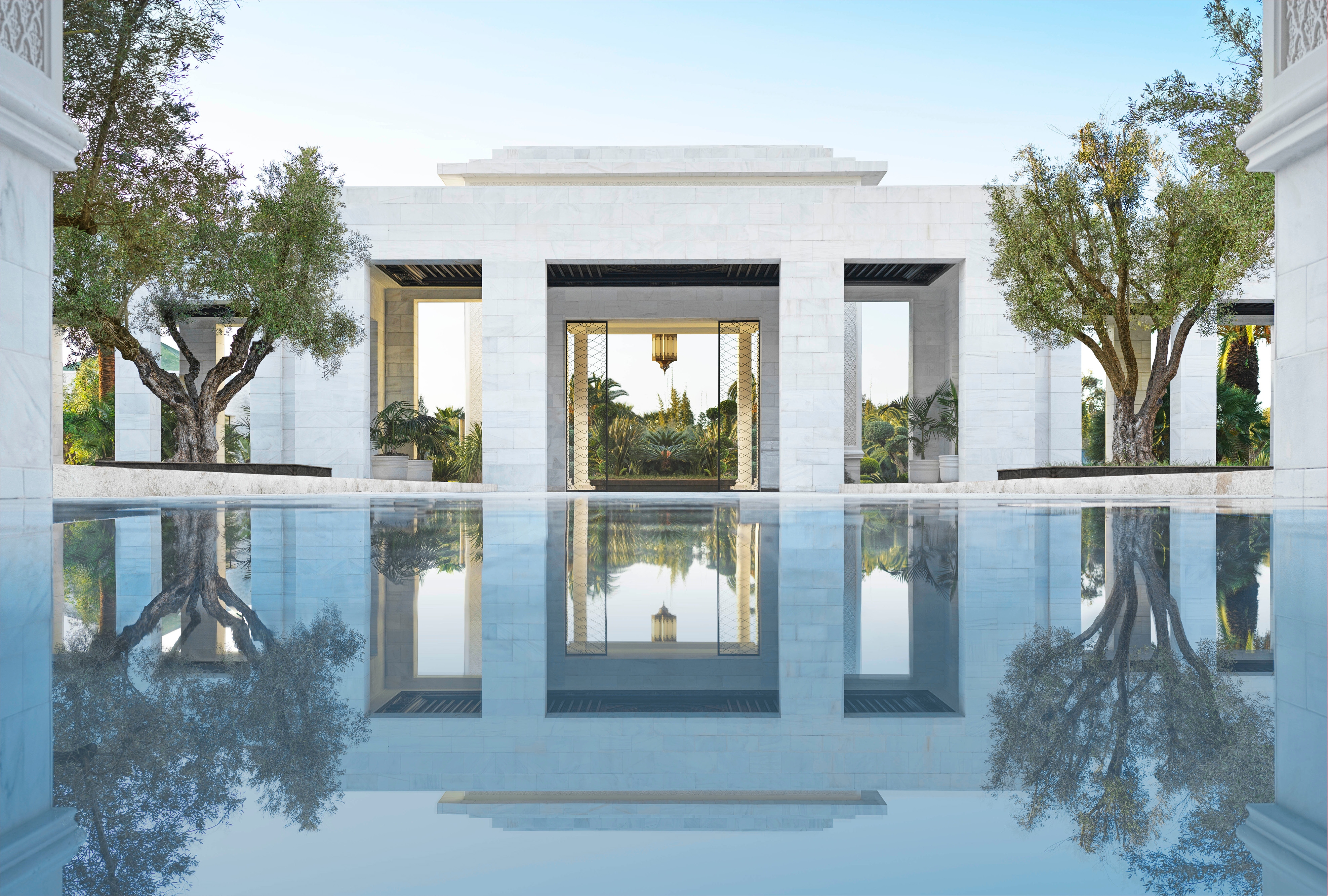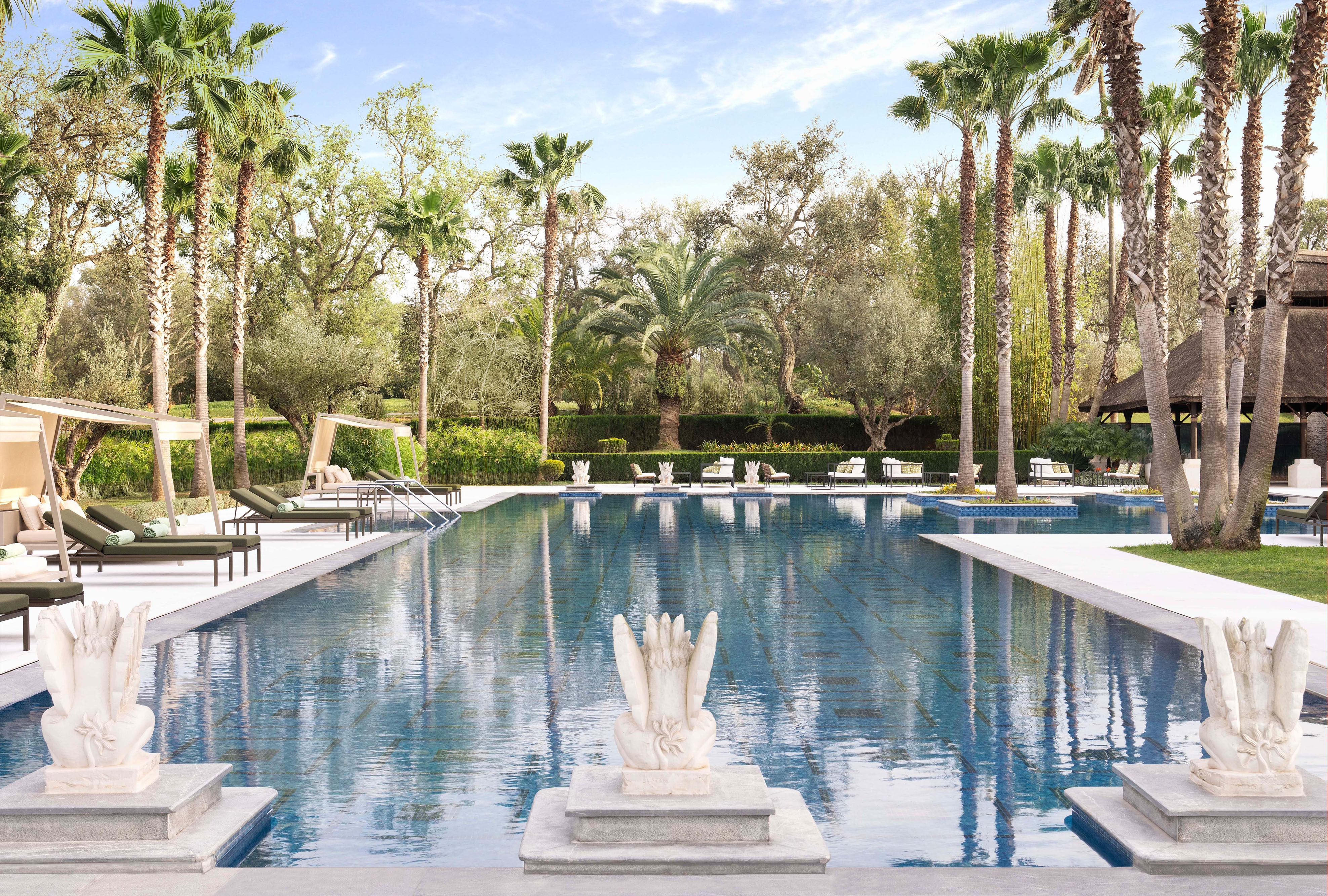 Within this framework, palm groves, olive clusters and clipped hedges shape shaded courtyards, water courts and fragrant paths. Guests arrive through a reflective pool shaded by ancient olives, while geometric paving and flowing rills recall Rabat’s historic gardens. At the heart of the resort, a palm-lined pool deck shimmers with mosaic tiles, cabanas and intimate sun terraces. Across the property, outdoor dining terraces, event lawns and the spa’s tropical courtyards extend a lush, contemplative atmosphere evoking the timeless ideal of an earthly paradise.