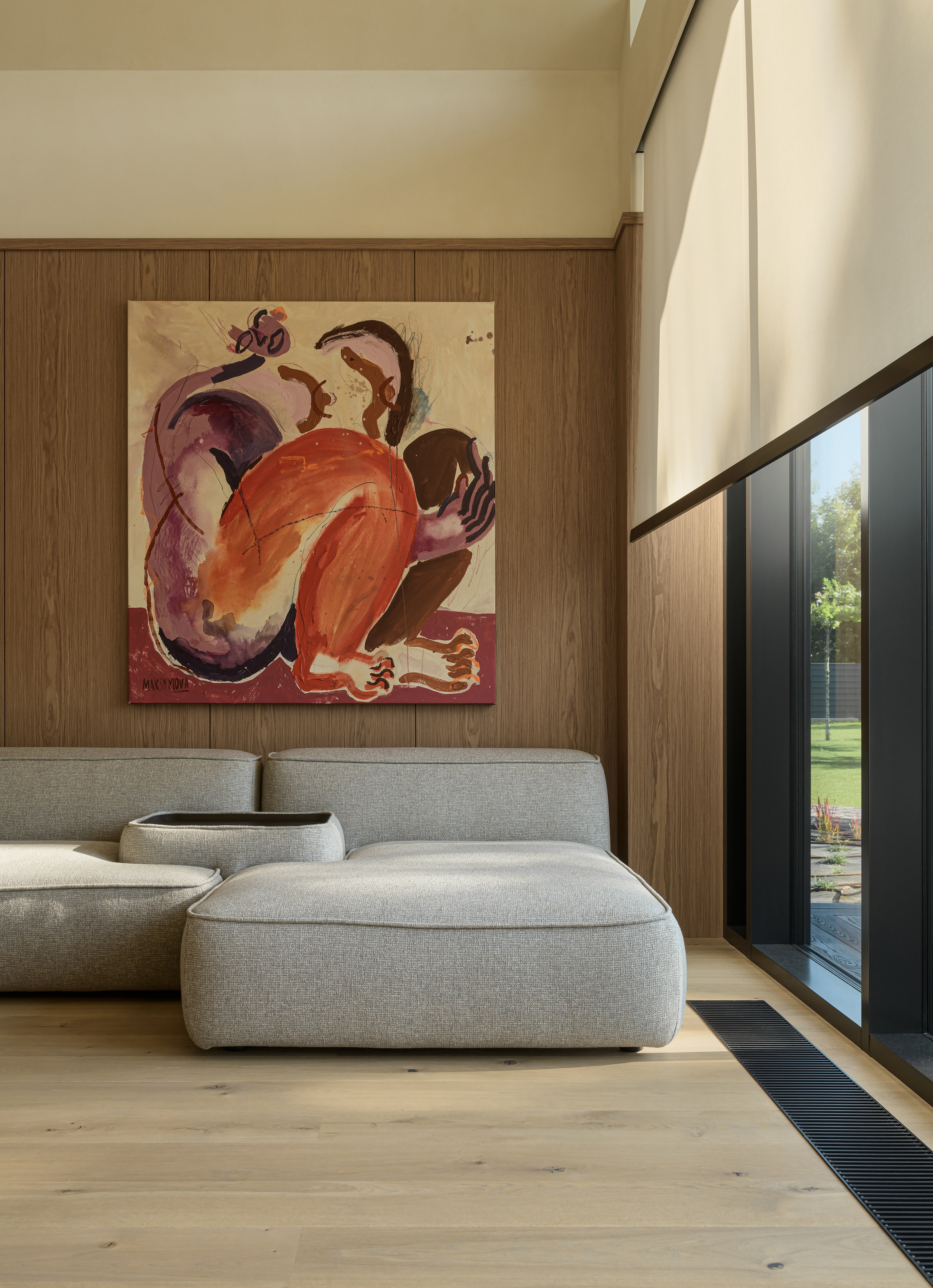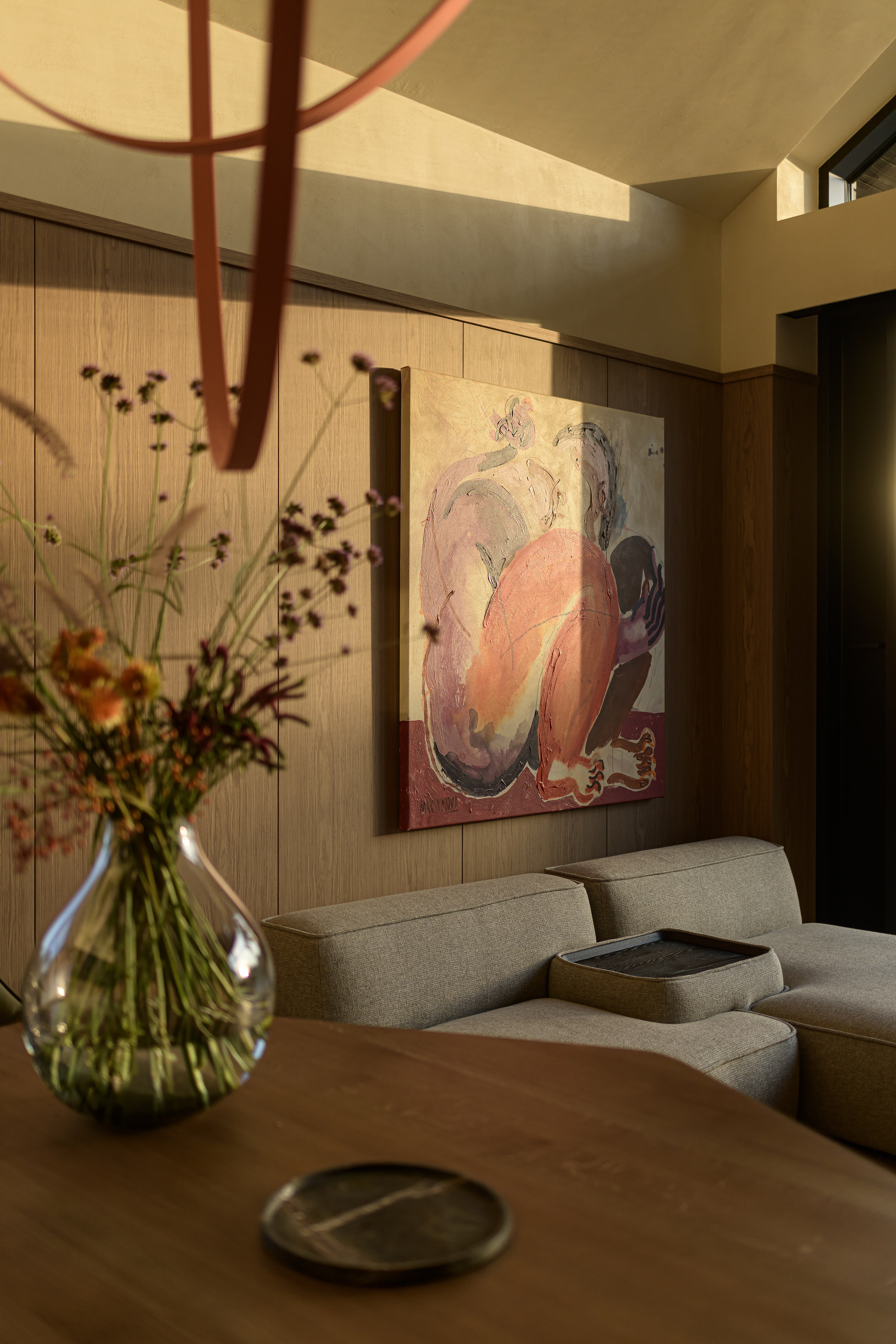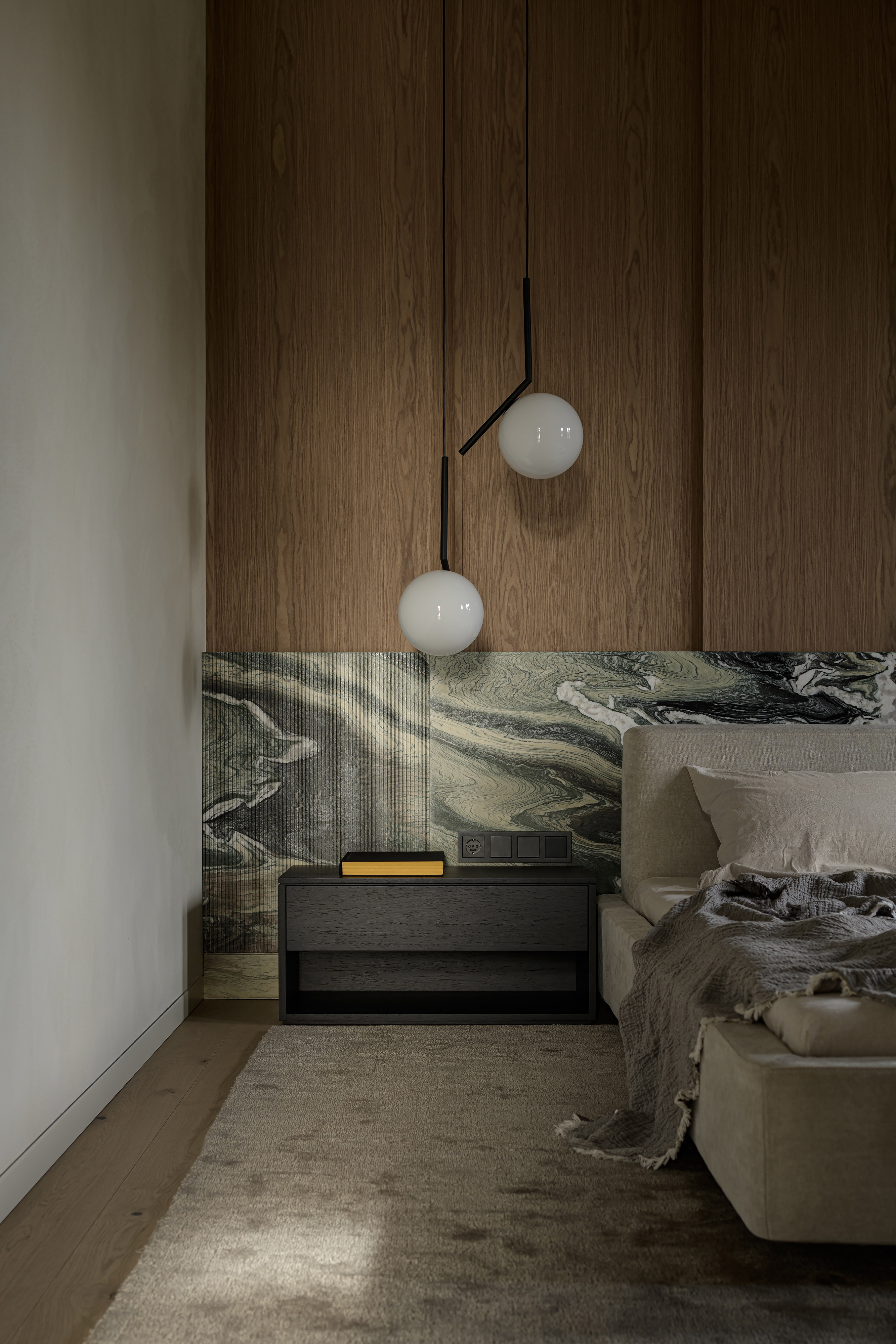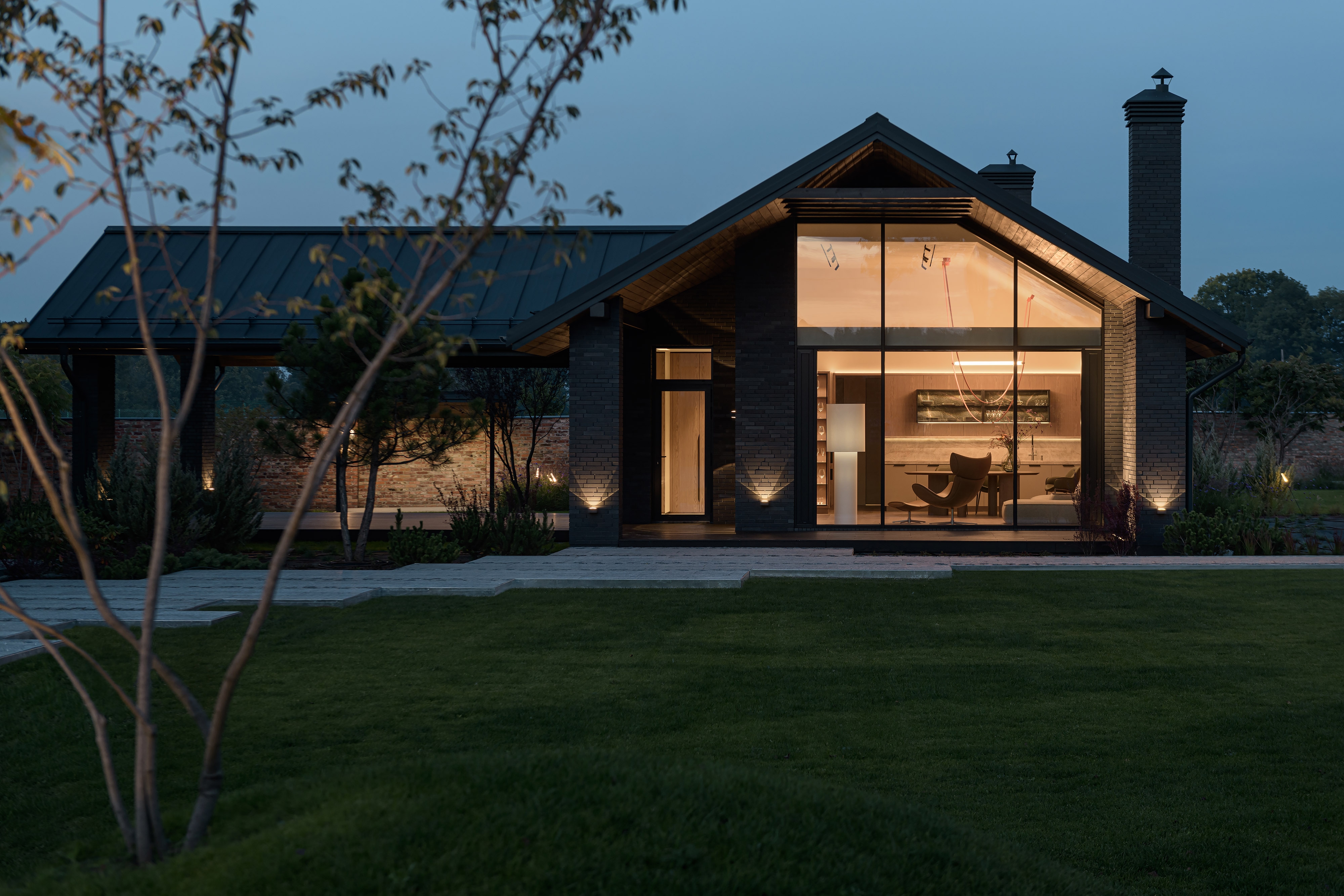 This countryside guesthouse is conceived as a retreat of lightness and calm, offering a pause to restore balance after the fast city rhythm. Panoramic windows of the living room dissolve the boundary between interior and garden, filling the space with natural light by day. By night, it transforms into a sanctuary of comfort and quiet reflection about contemporary Ukrainian art. Clean lines and tactile materials - stone, wood, and soft textures - create an atmosphere of refined simplicity and silence.
