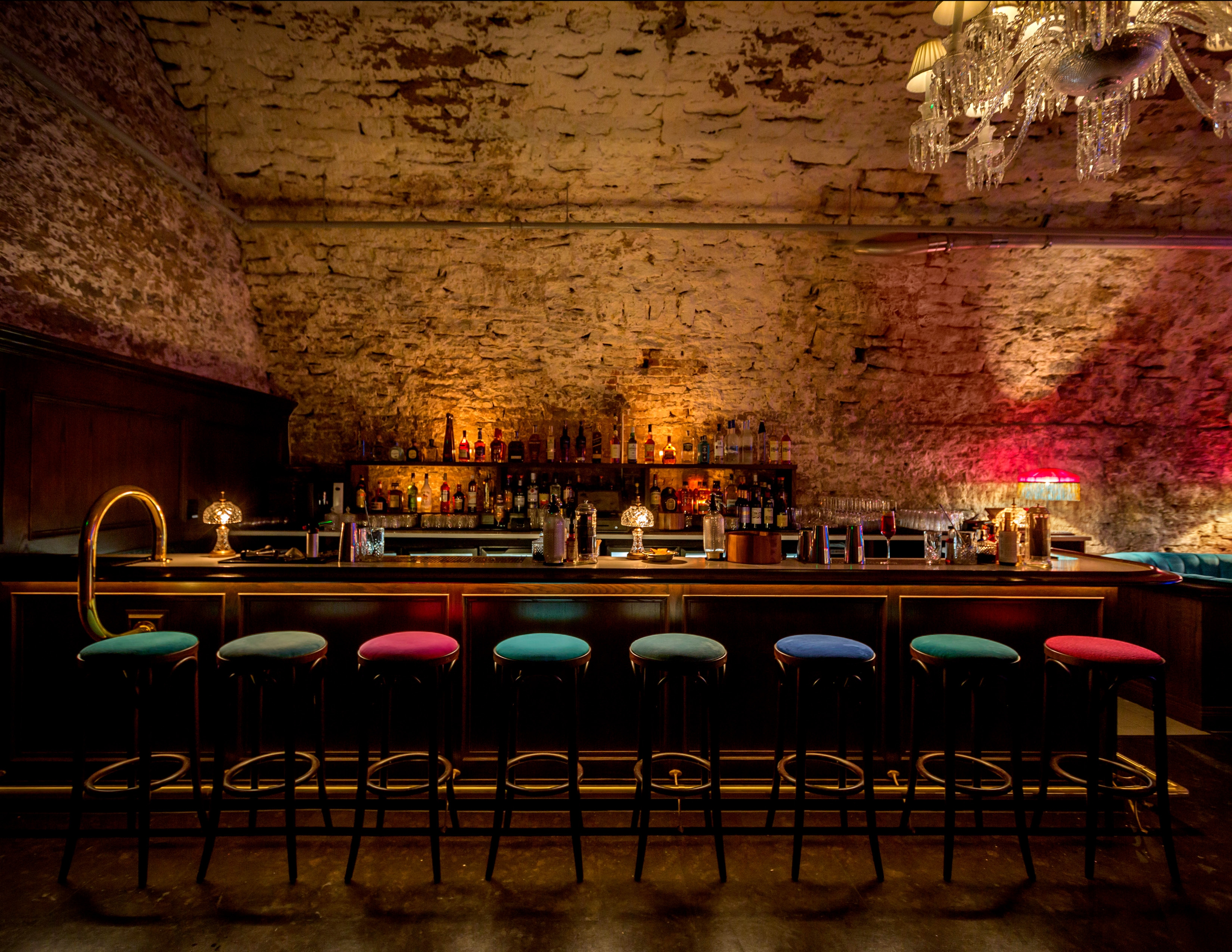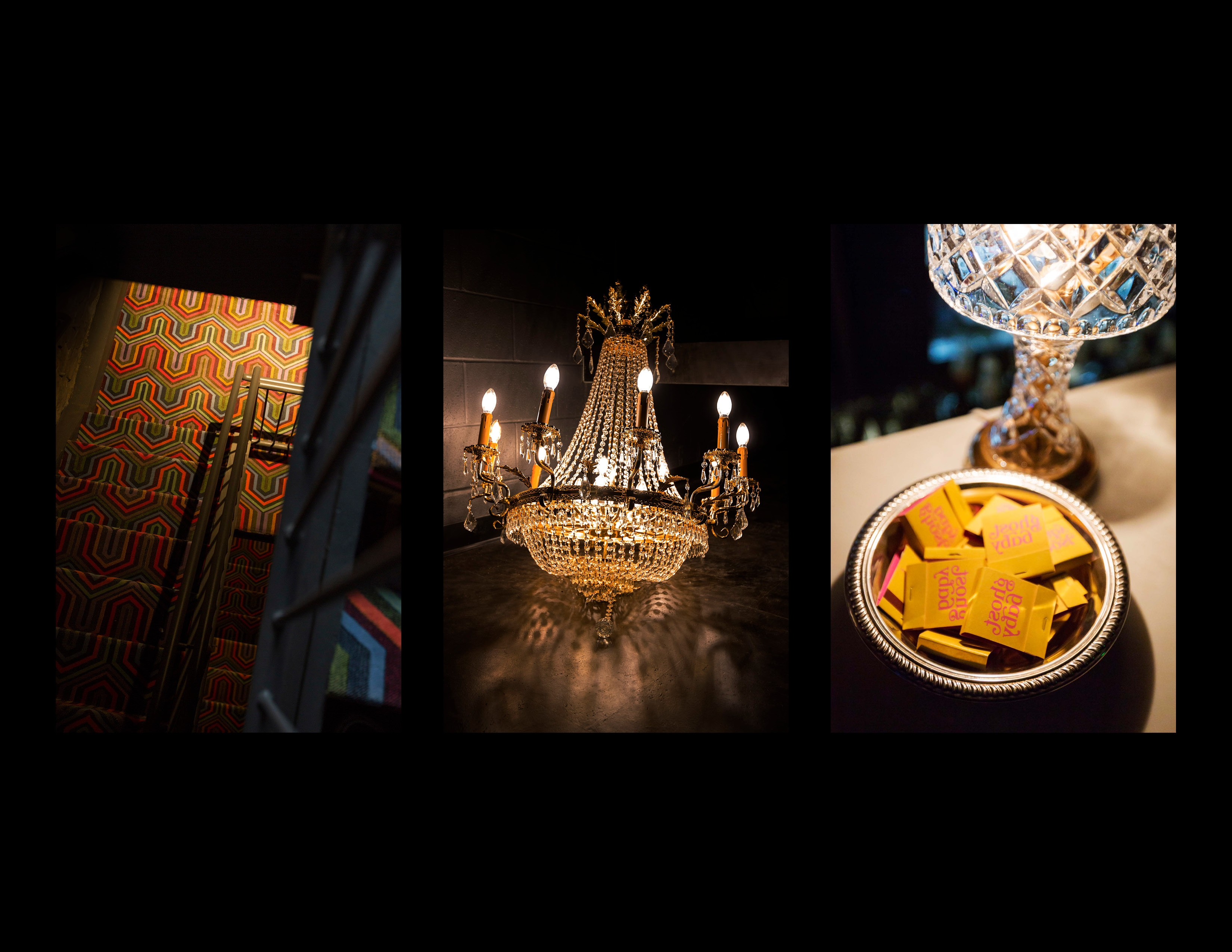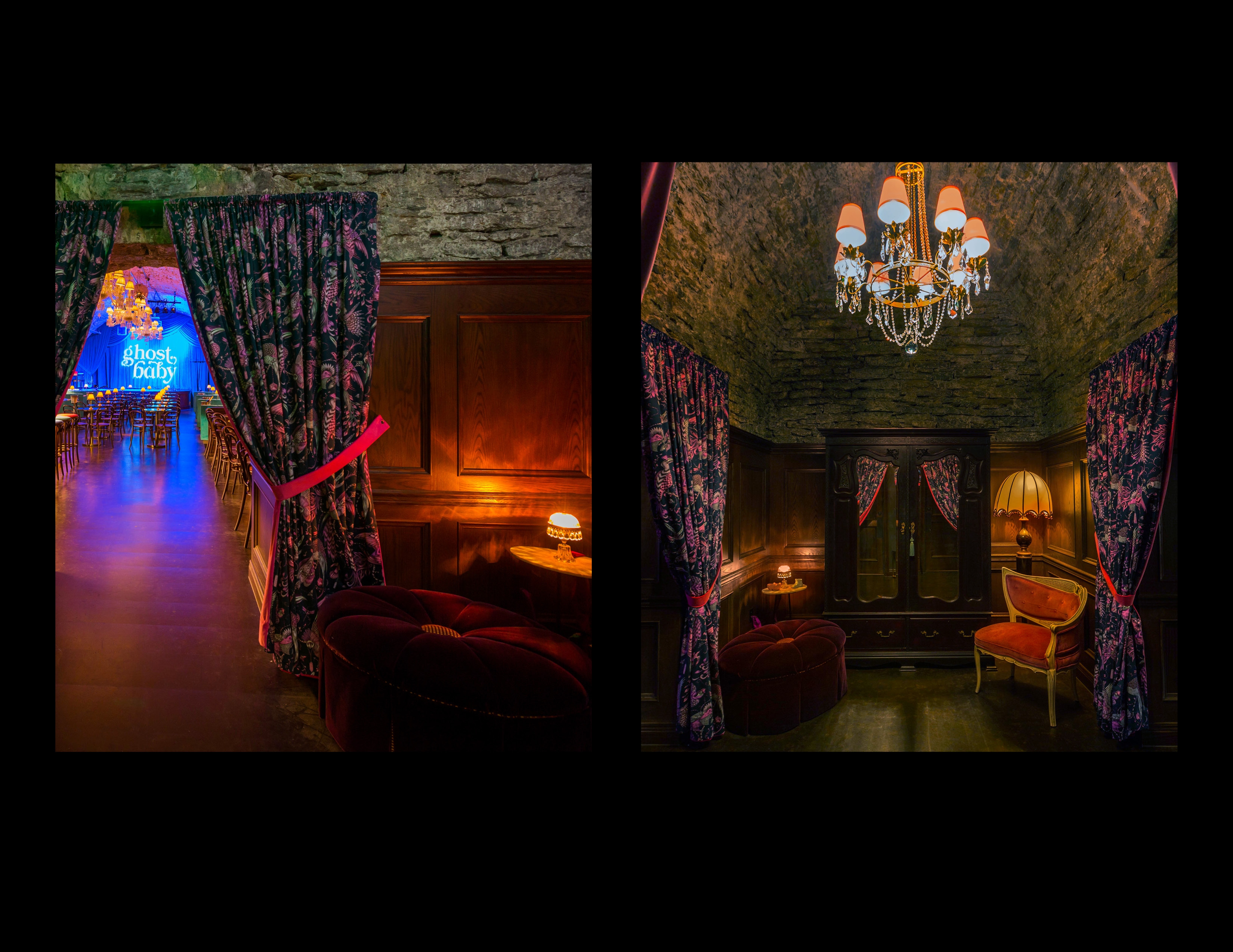 From an urban neighborhood sidewalk lined with lit facades, an unassuming storefront bathed in amethyst moonlight coquettishly conceals a latent lagering tunnel 30 feet below — where time, temperature, and the experience are all carefully curated. Over 150 years ago, brewing companies were the life blood of Cincinnati and relied on underground tunnels for aging beer. One supposedly haunted tunnel remained vacant since the 1850's until the renaissance of Cincinnati’s Over-the-Rhine district beckoned it toward resurrection. Enter Ghost Baby. The journey, in and down, brings patrons into a blended fantasy of vibrant social movements – the roaring 20’s and the psychedelic 70’s. Descending a winding, kaleidoscopic stair creates a sense of distance from the world above. Guests may convene on the plush sofas surrounding the public anteroom or pull up to the lively fringed bar. The chamber beyond has become a live music club softened by the hushed intimacy of perimeter banquette seating. As sound resonates along rubble stone vaults, framed by swagged draperies and oscillating light, Ghost Baby reanimates the spirit of Cincinnati’s subterranean past.