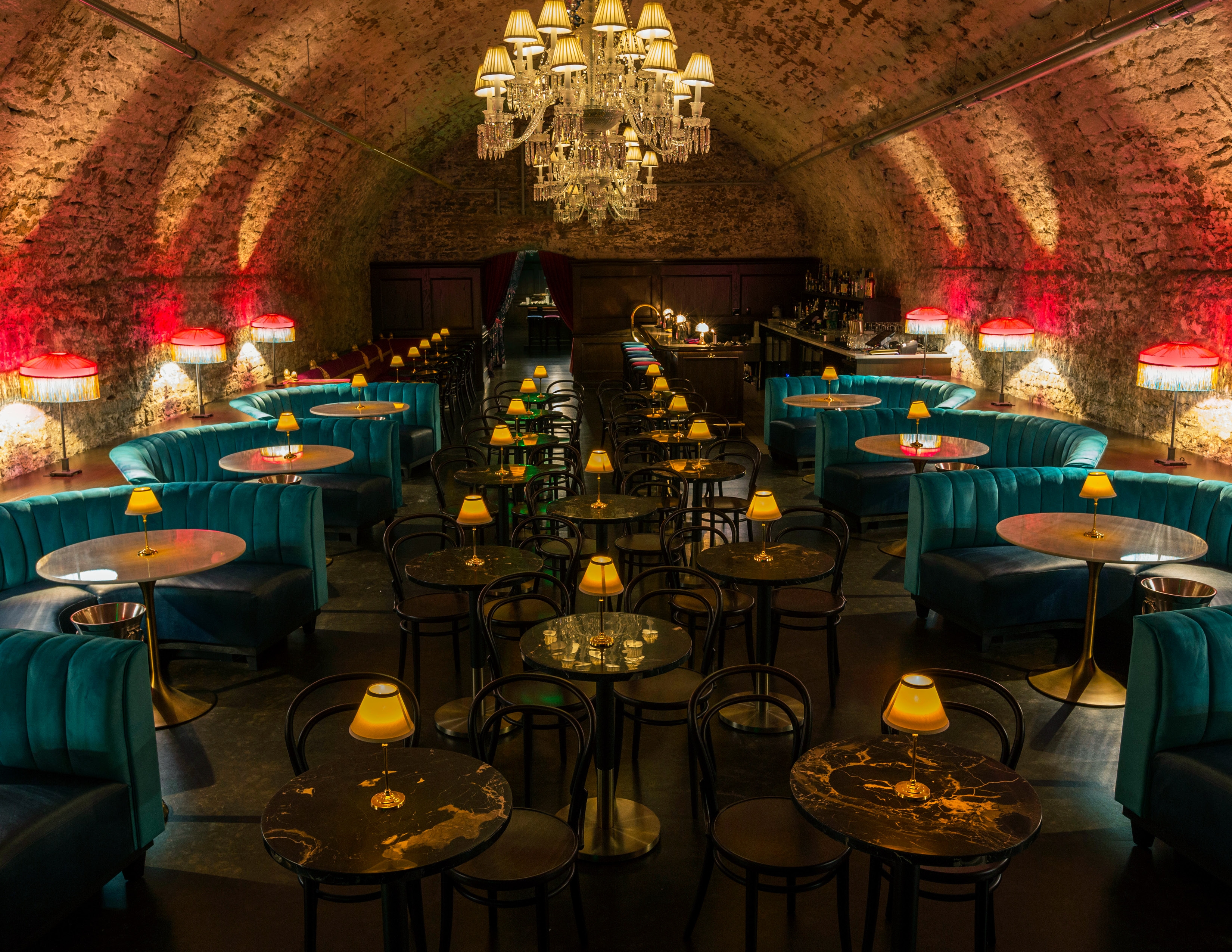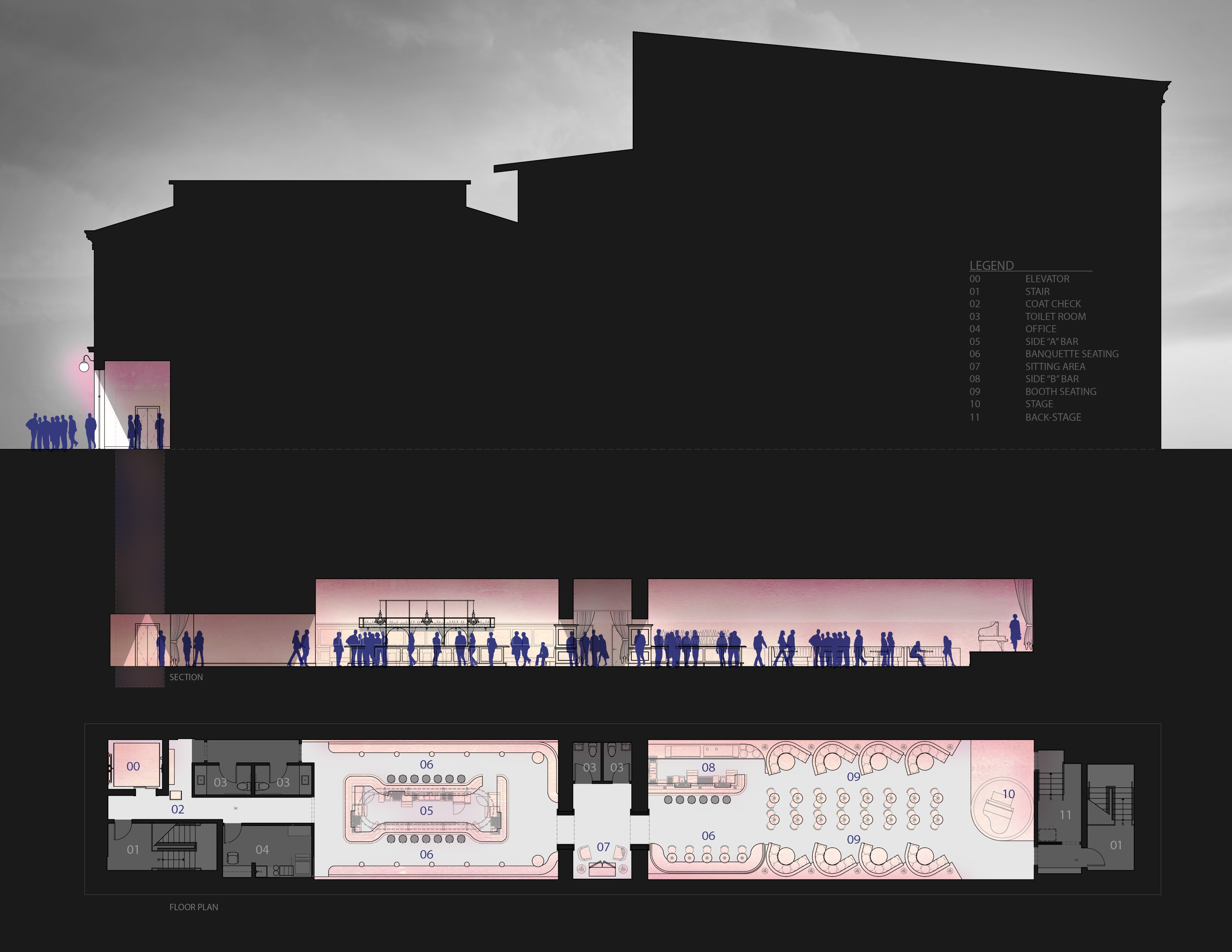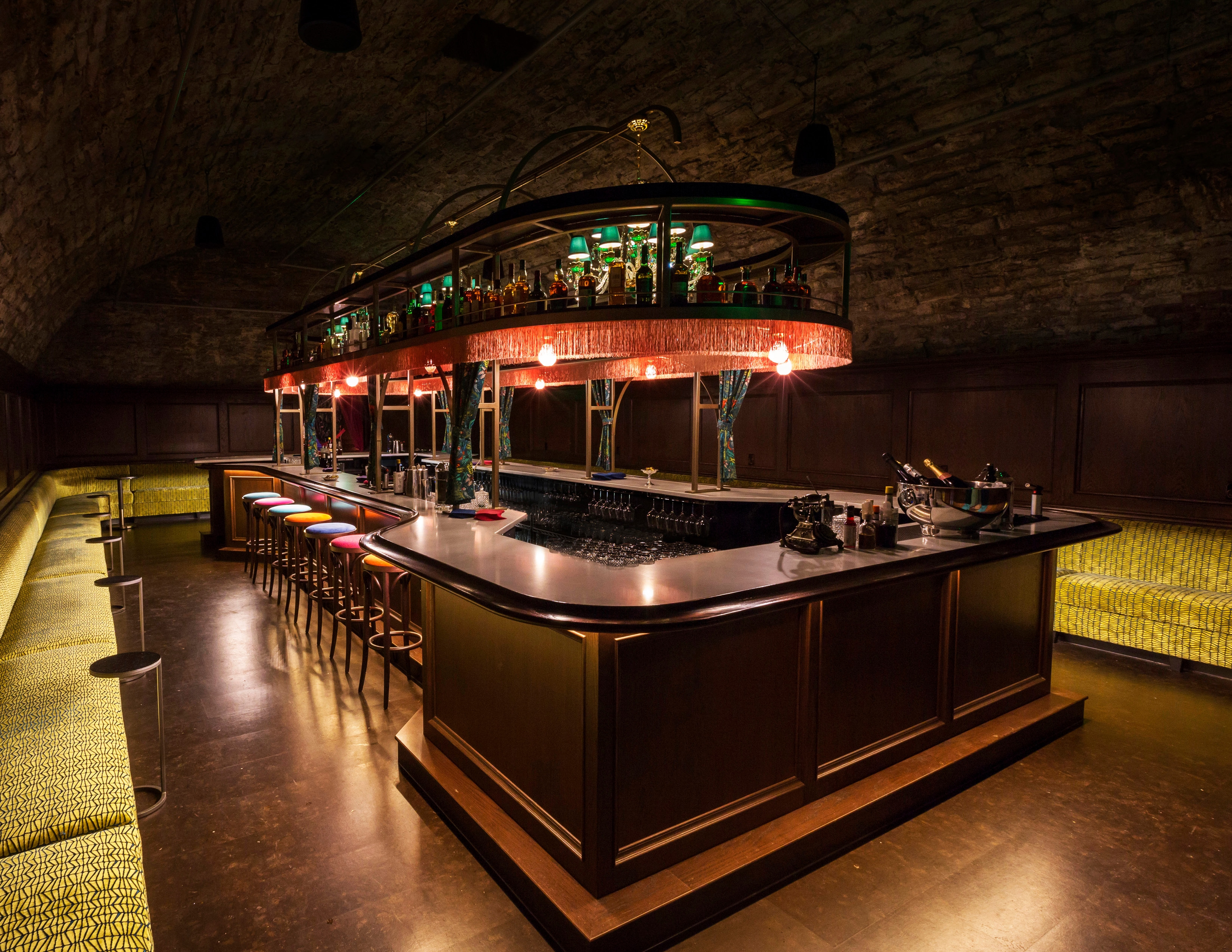 From an urban neighborhood sidewalk lined with lit facades, an unassuming storefront bathed in amethyst moonlight coquettishly conceals a latent lagering tunnel 30 feet below — where time, temperature, and the experience are all carefully curated. Over 150 years ago, brewing companies were the life blood of Cincinnati and relied on underground tunnels for aging beer. One supposedly haunted tunnel remained vacant since the 1850's until the renaissance of Cincinnati’s Over-the-Rhine district beckoned it toward resurrection. Enter Ghost Baby. The journey, in and down, brings patrons into a blended fantasy of vibrant social movements – the roaring 20’s and the psychedelic 70’s. Descending a winding, kaleidoscopic stair creates a sense of distance from the world above. Guests may convene on the plush sofas surrounding the public anteroom or pull up to the lively fringed bar. The chamber beyond has become a live music club softened by the hushed intimacy of perimeter banquette seating. As sound resonates along rubble stone vaults, framed by swagged draperies and oscillating light, Ghost Baby reanimates the spirit of Cincinnati’s subterranean past.