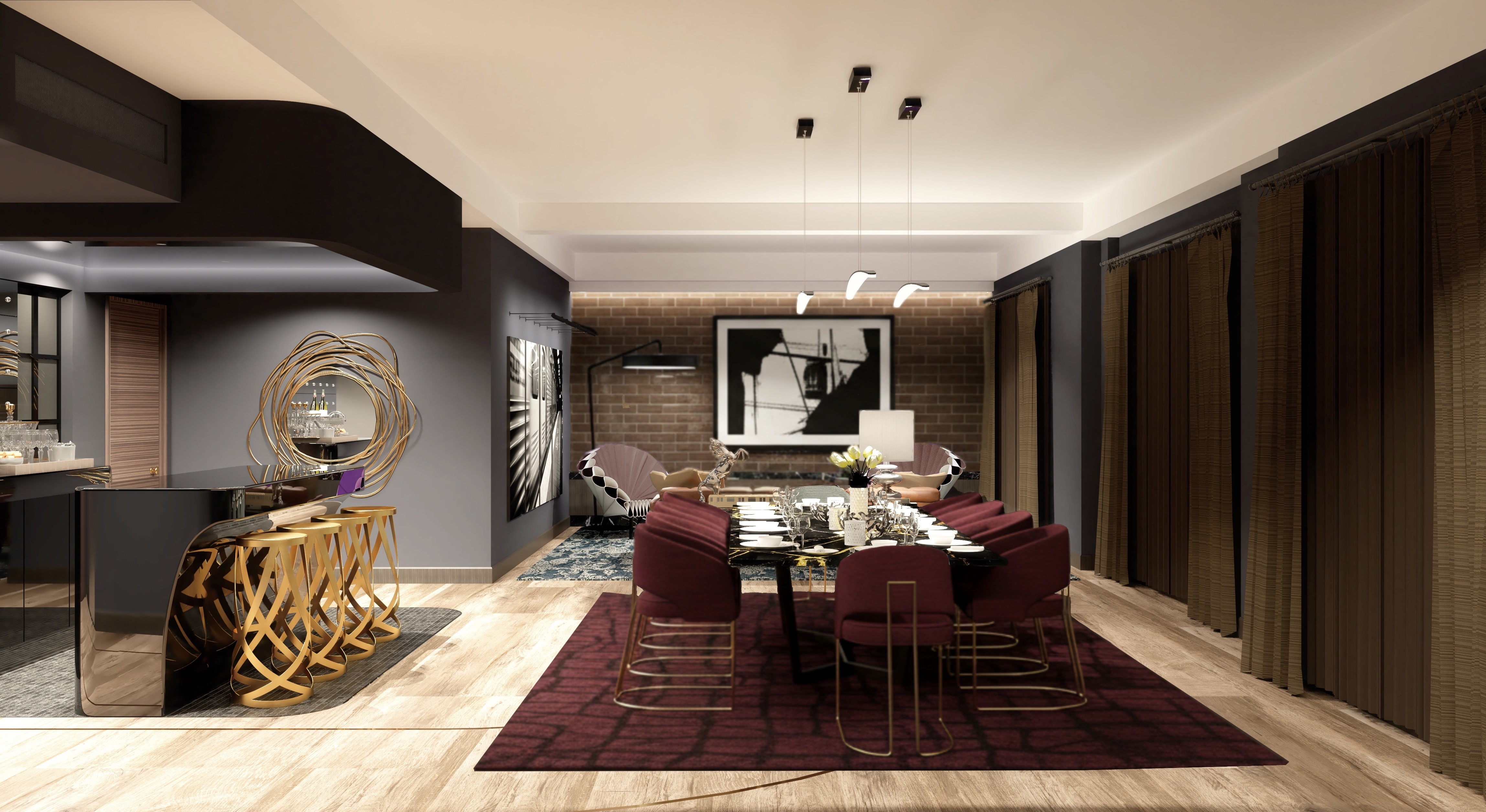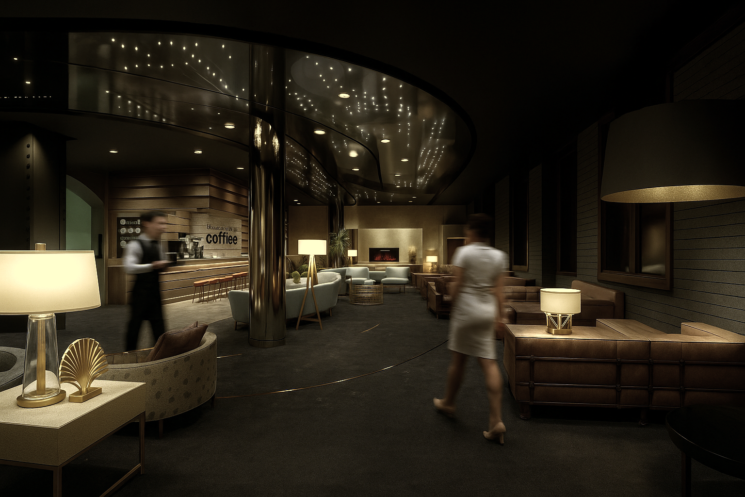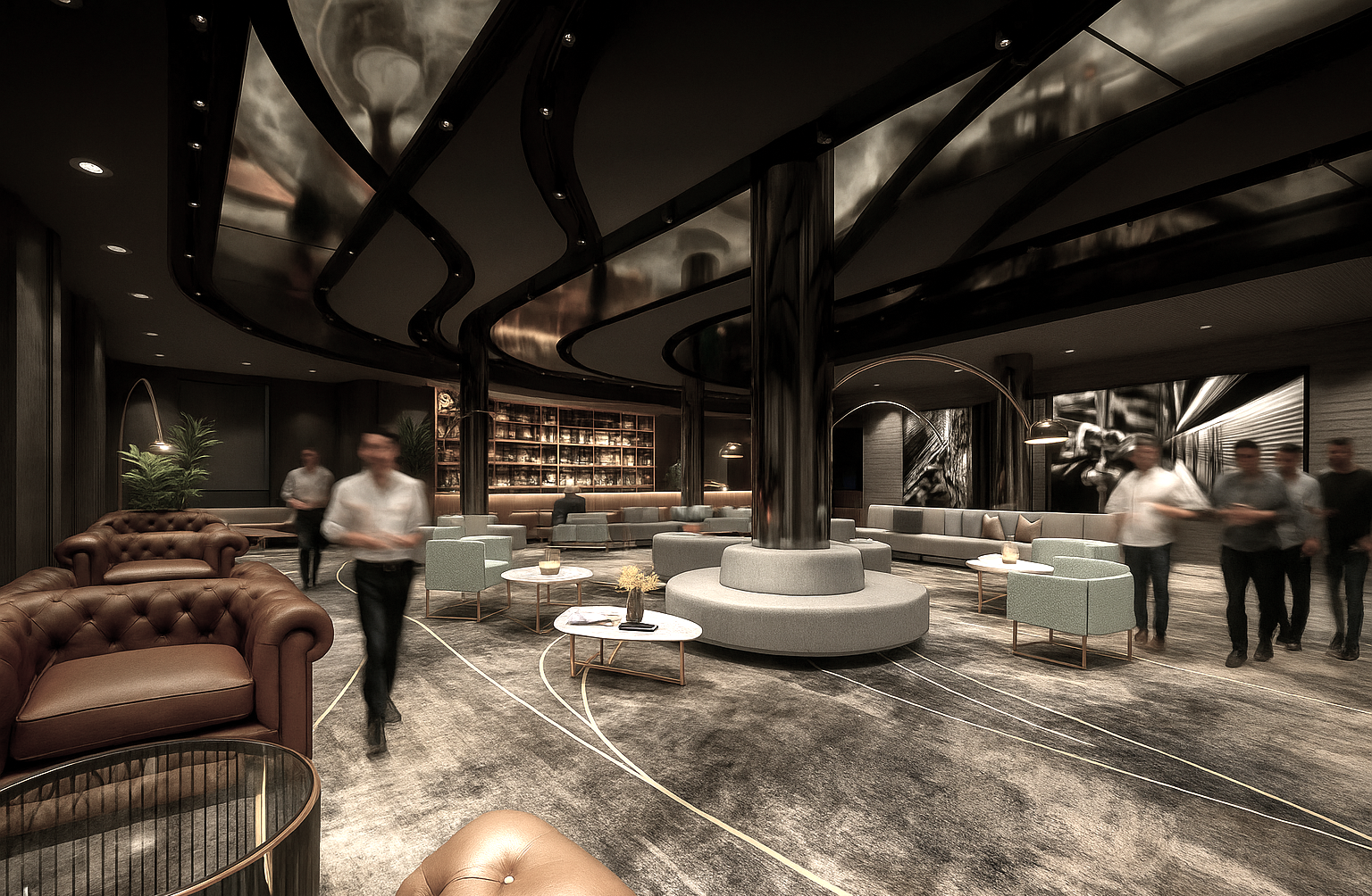The underground restaurant continues the narrative with tunnel-like forms, dark tones, and warm lighting inspired by subway platforms and the glow of nighttime Manhattan. In the lobby, reflective materials and curved lines create a sense of motion, while elegant details add depth and sophistication. The all-day dining lounge elevates the experience further, offering a brighter, more relaxed atmosphere.