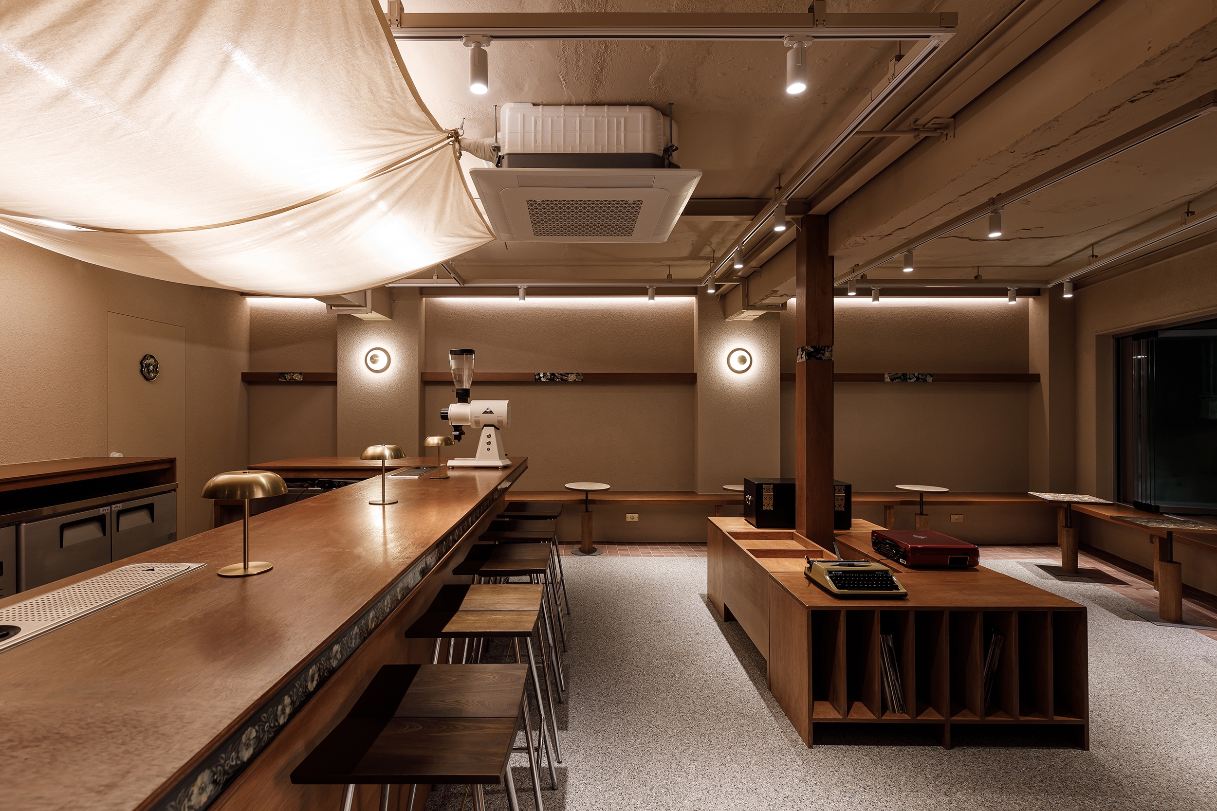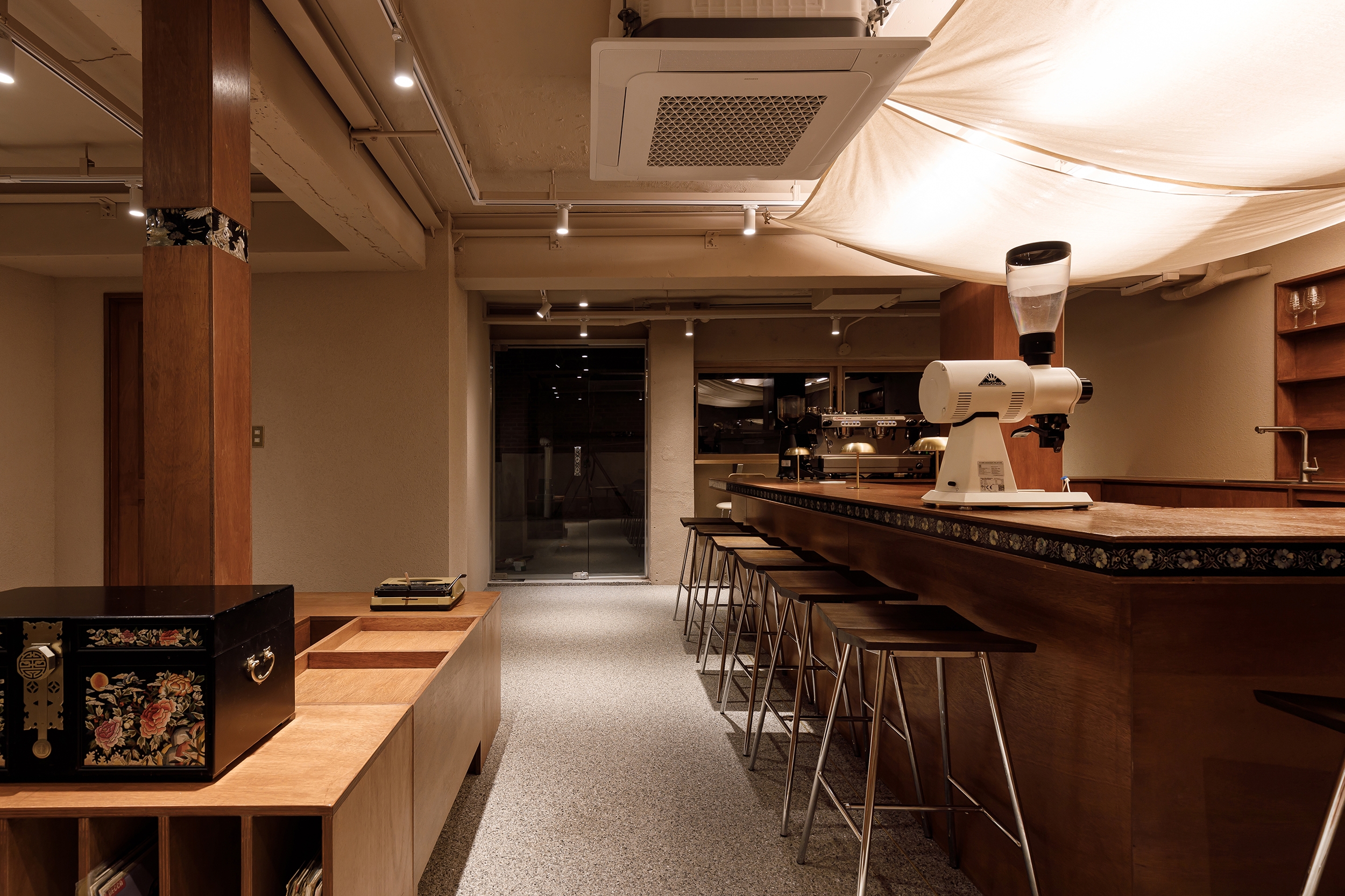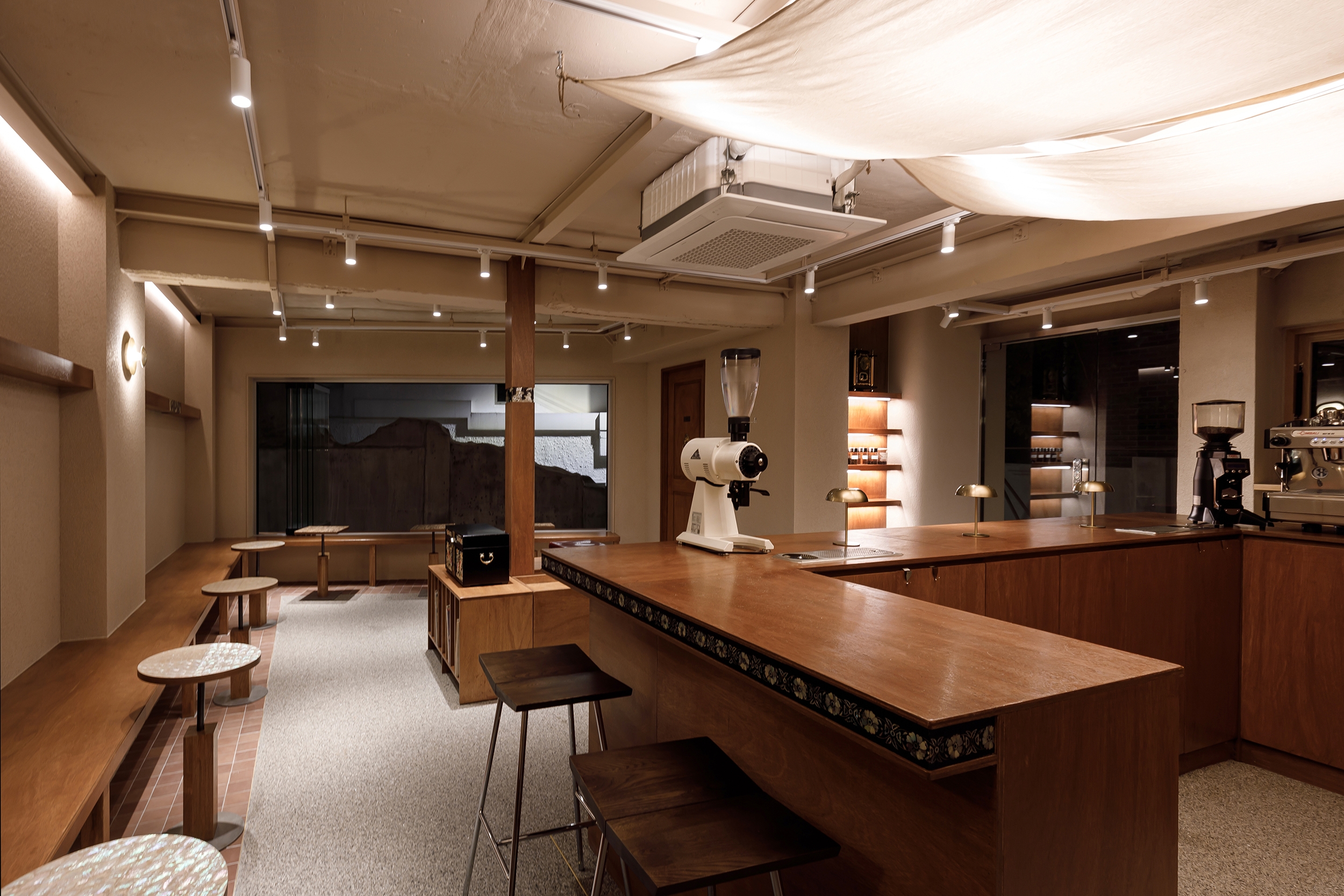 In Café Gaebang, the coffee bar is placed at the center of the space so guests seated around the perimeter can view the entire café at a glance. To highlight this central area, the ceiling was designed as a canopy, evoking the festive mood of a madangnori celebration.