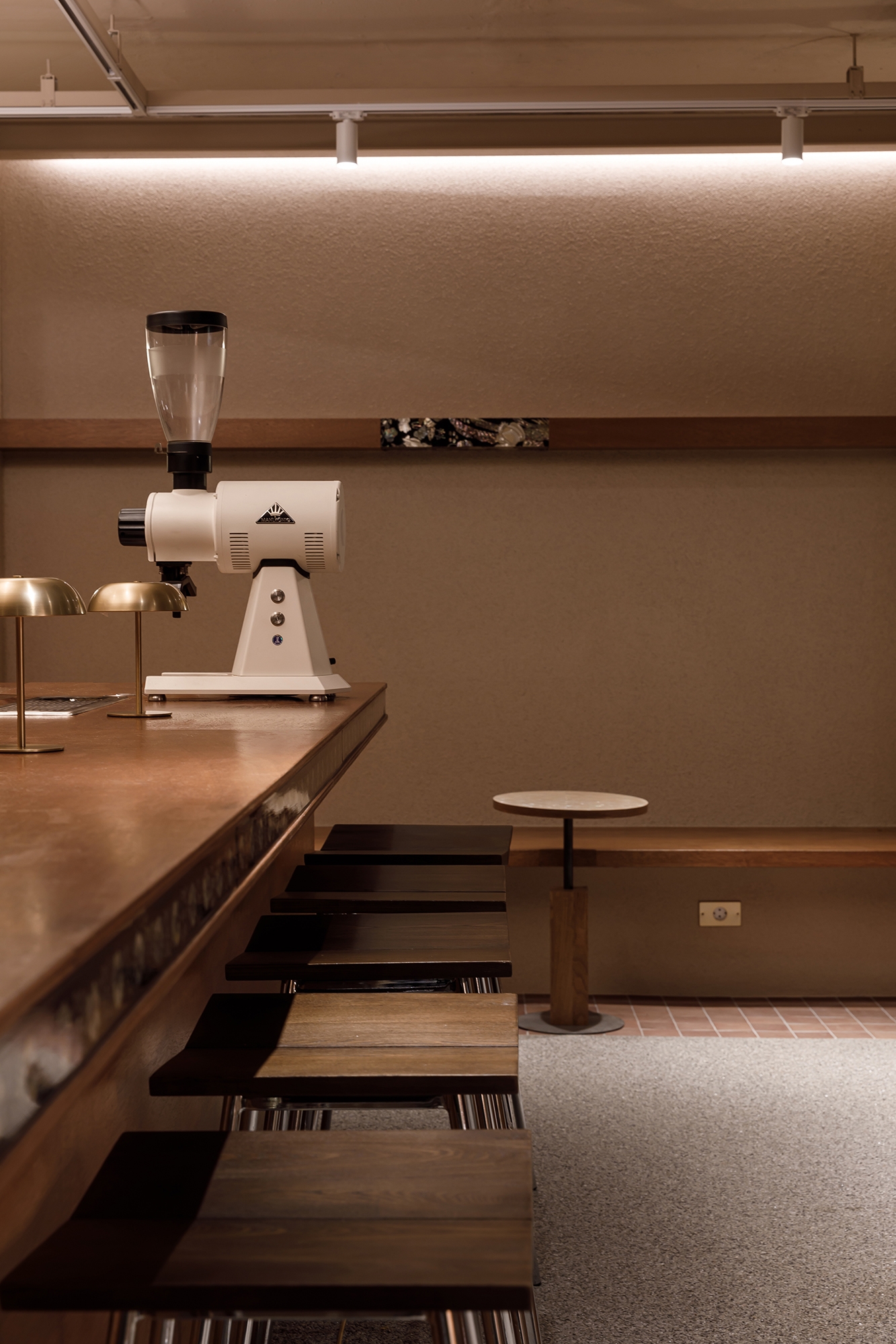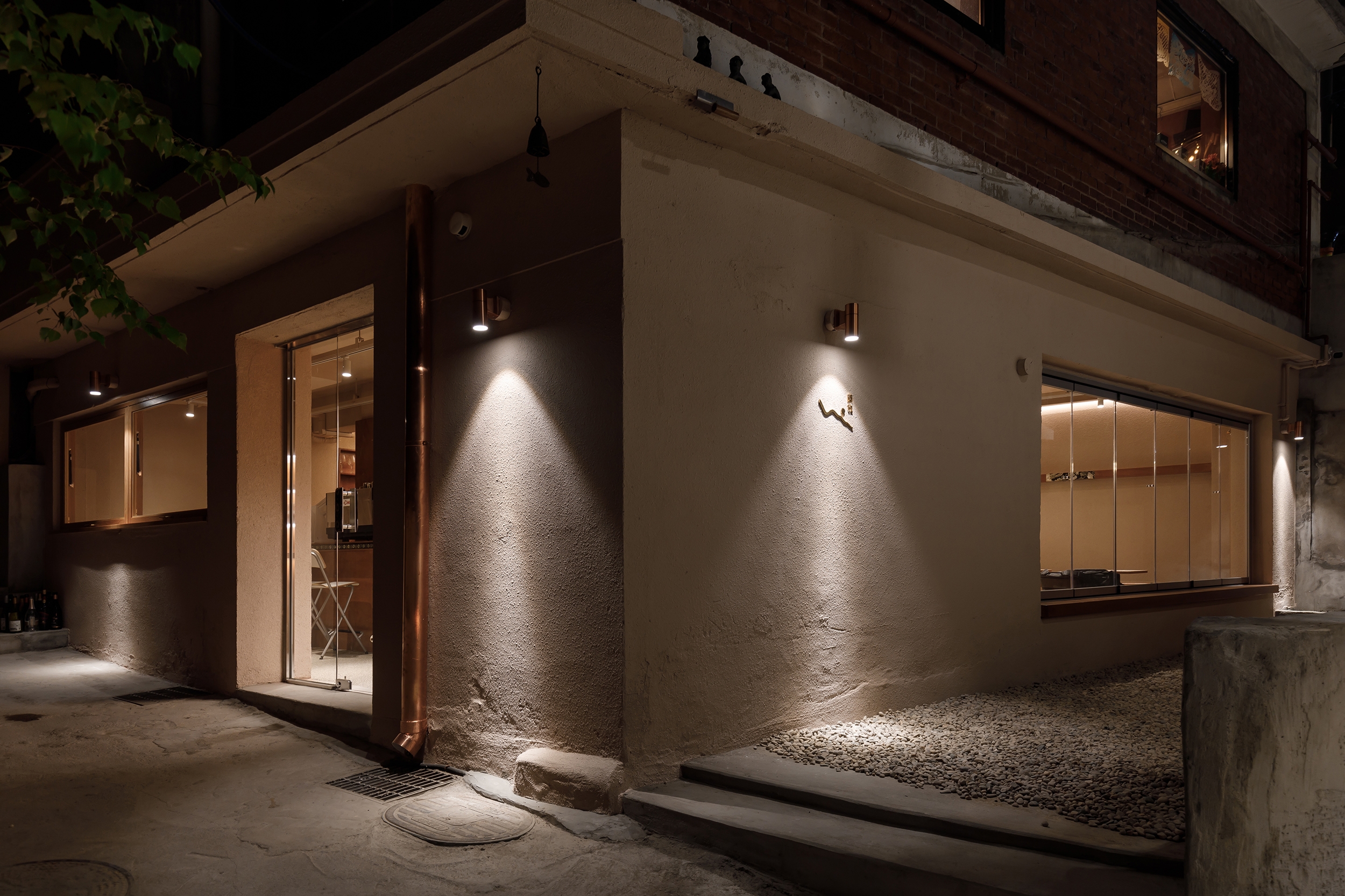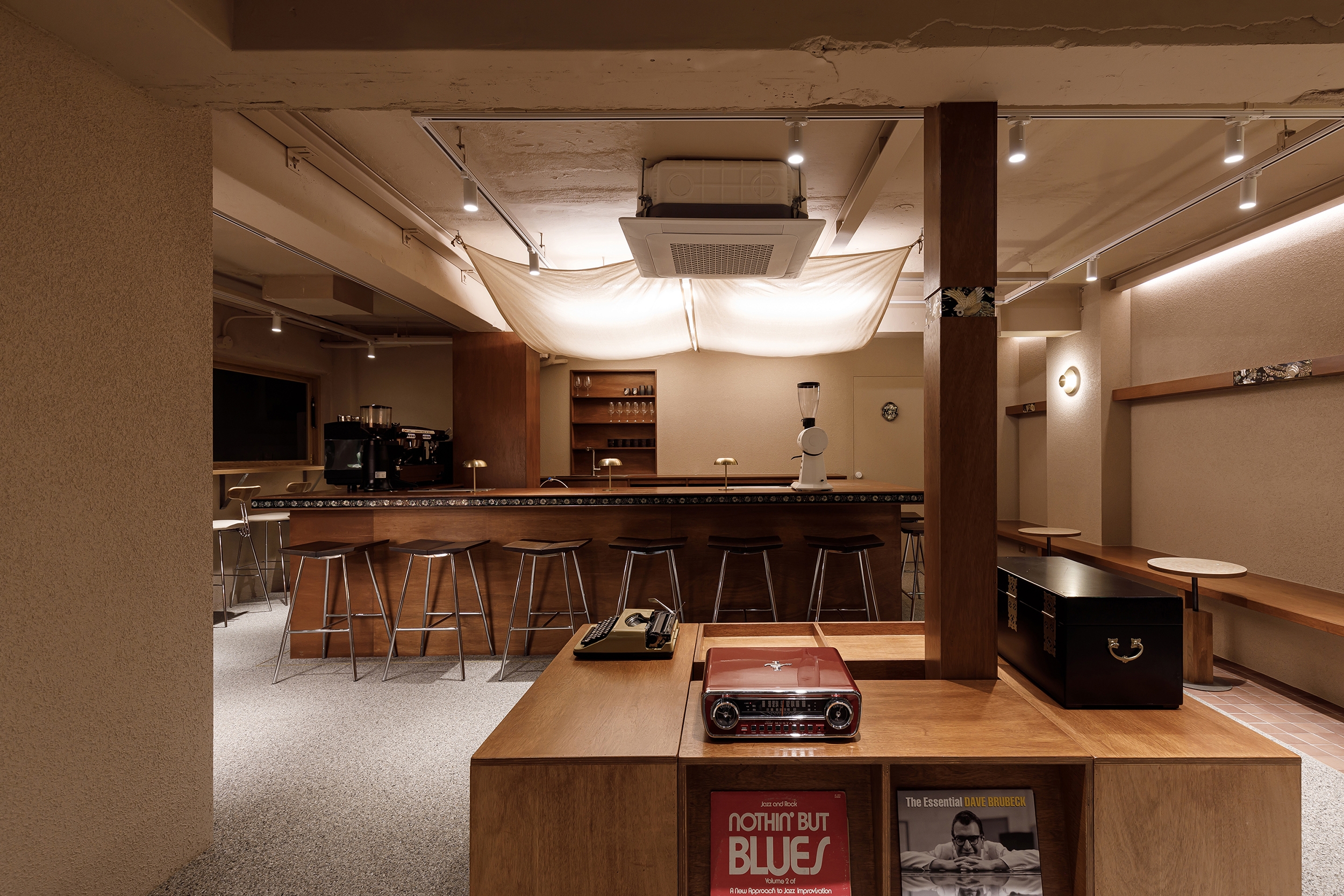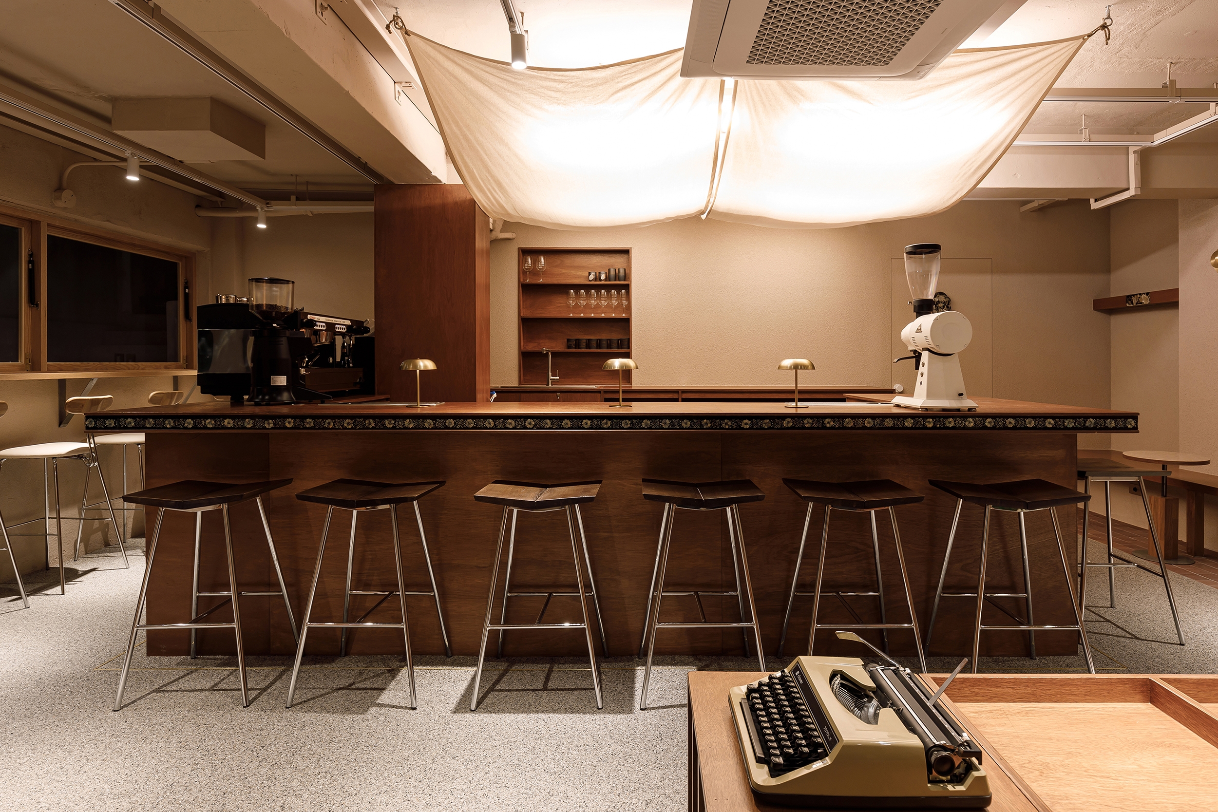 In Café Gaebang, the coffee bar is placed at the center of the space so guests seated around the perimeter can view the entire café at a glance. To highlight this central area, the ceiling was designed as a canopy, evoking the festive mood of a madangnori celebration.