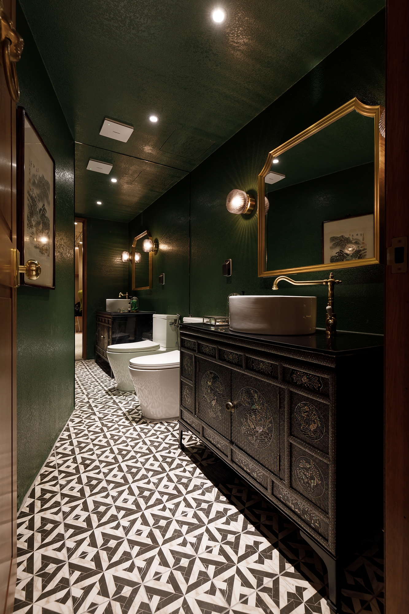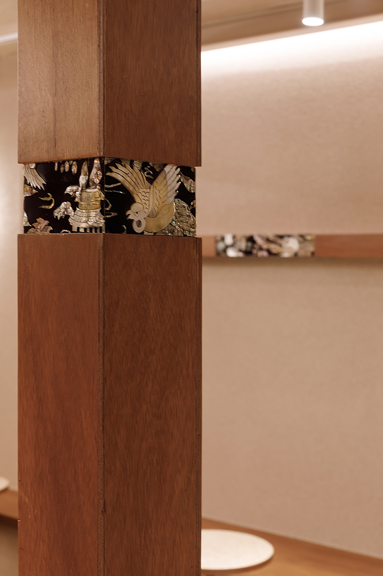 Narrative elements tied to Korean culture continue throughout the design. The mother-of-pearl furniture subtly reveals traces of the past through its decorations, handles, and patterns, inviting curiosity and storytelling.