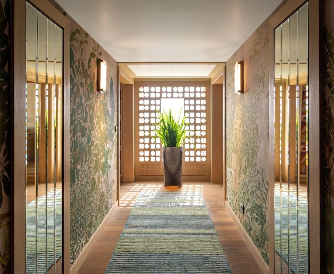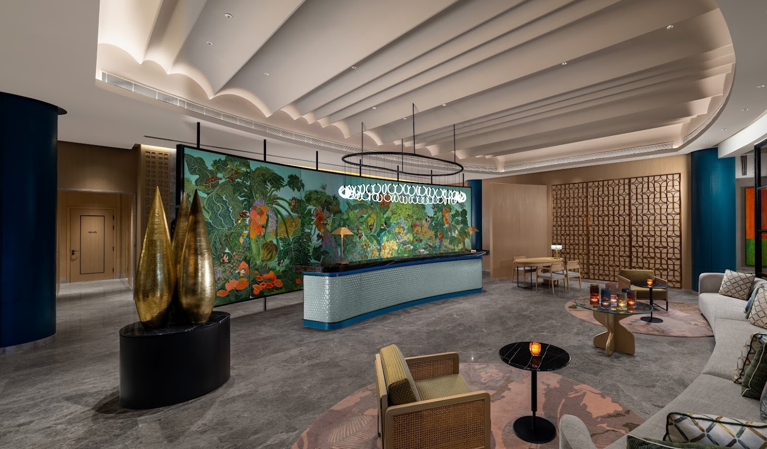 Arrival unfolds beneath a double-height lobby, anchored by a lush jungle-themed mural and bold accents of orange, aqua, and vermilion, setting a dynamic tone.