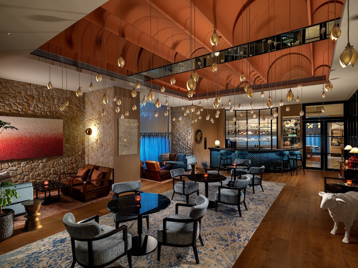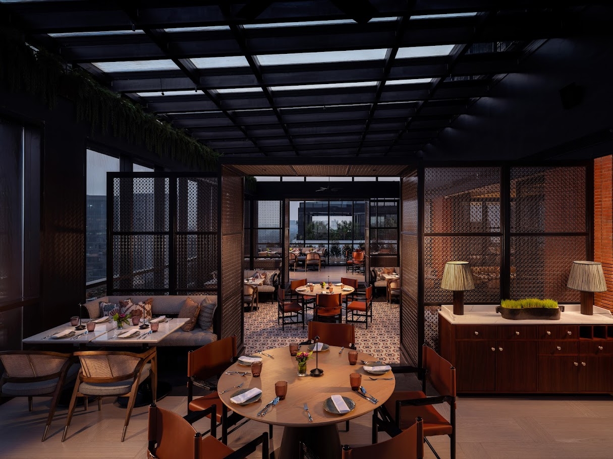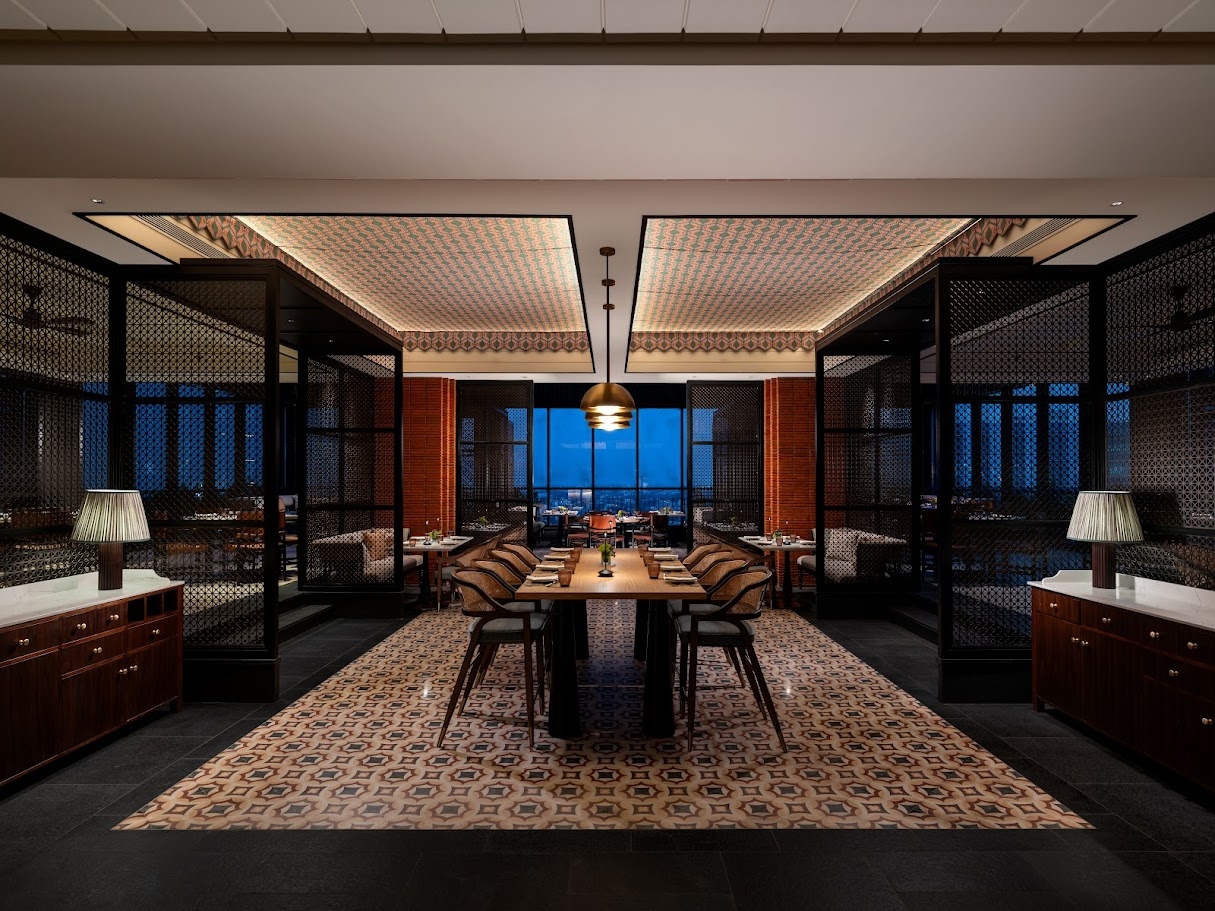 Rooftop venues, from the expressive Indian restaurant Up North to the tranquil Living Lounge, frame city and sky views while integrating greenery and light.