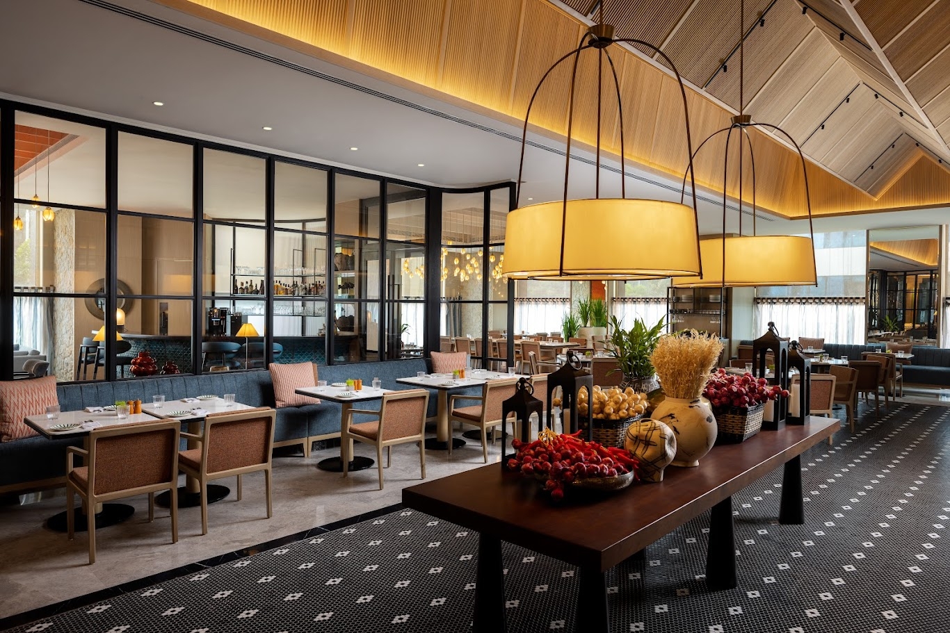 Public areas, such as lobby, bar, and restaurants, flow visually through glazed partitions, layered transparencies, and strategic circulation, balancing social energy with intimacy.