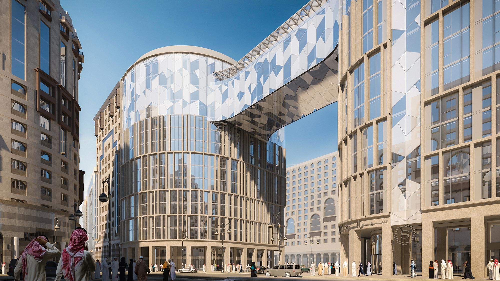 Located across two compact plots linked by shaded colonnades, the project enhances Madinah’s walkable urban fabric. The sky bridge, positioned above a major city artery, symbolises progress and creates a recognisable architectural identity.