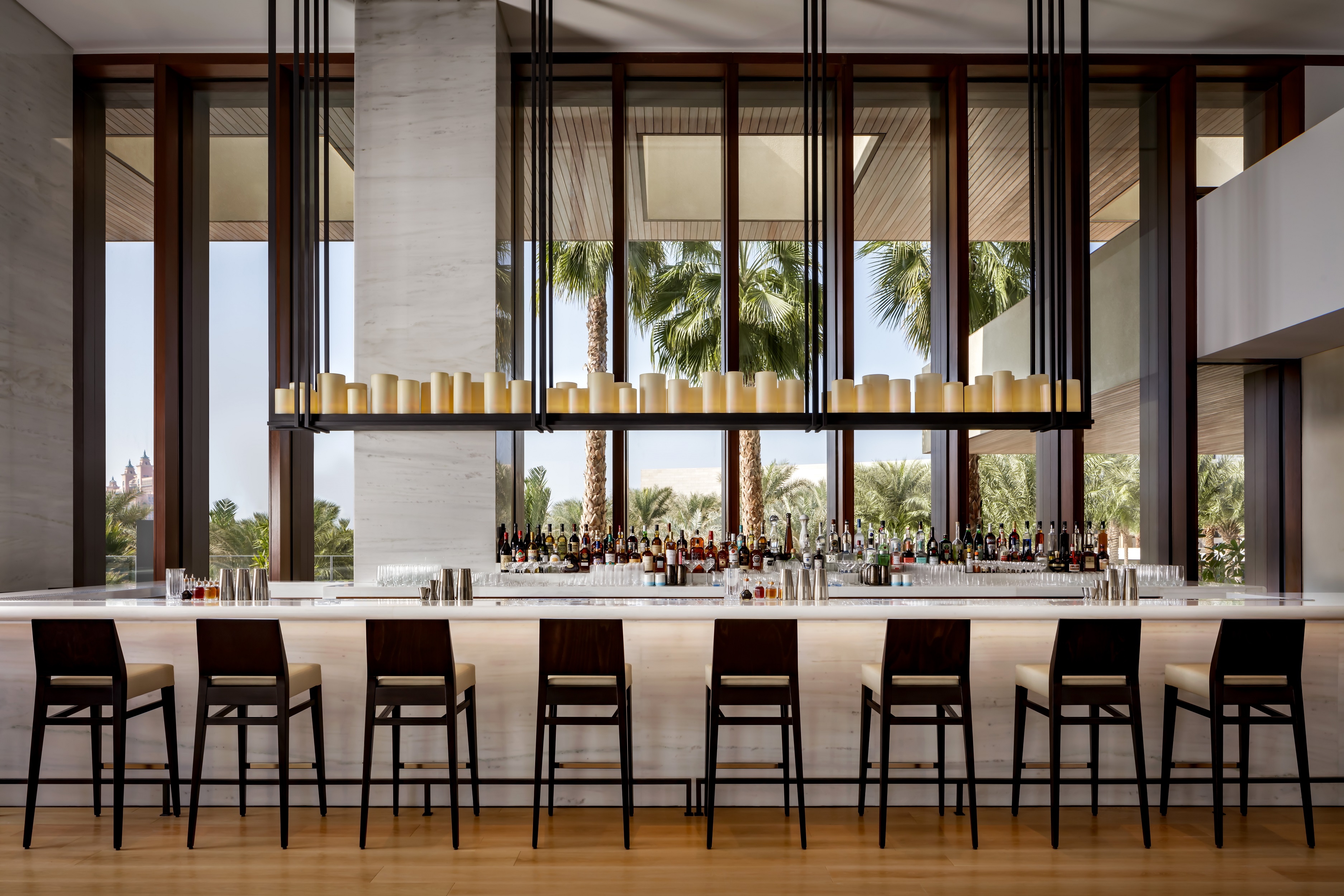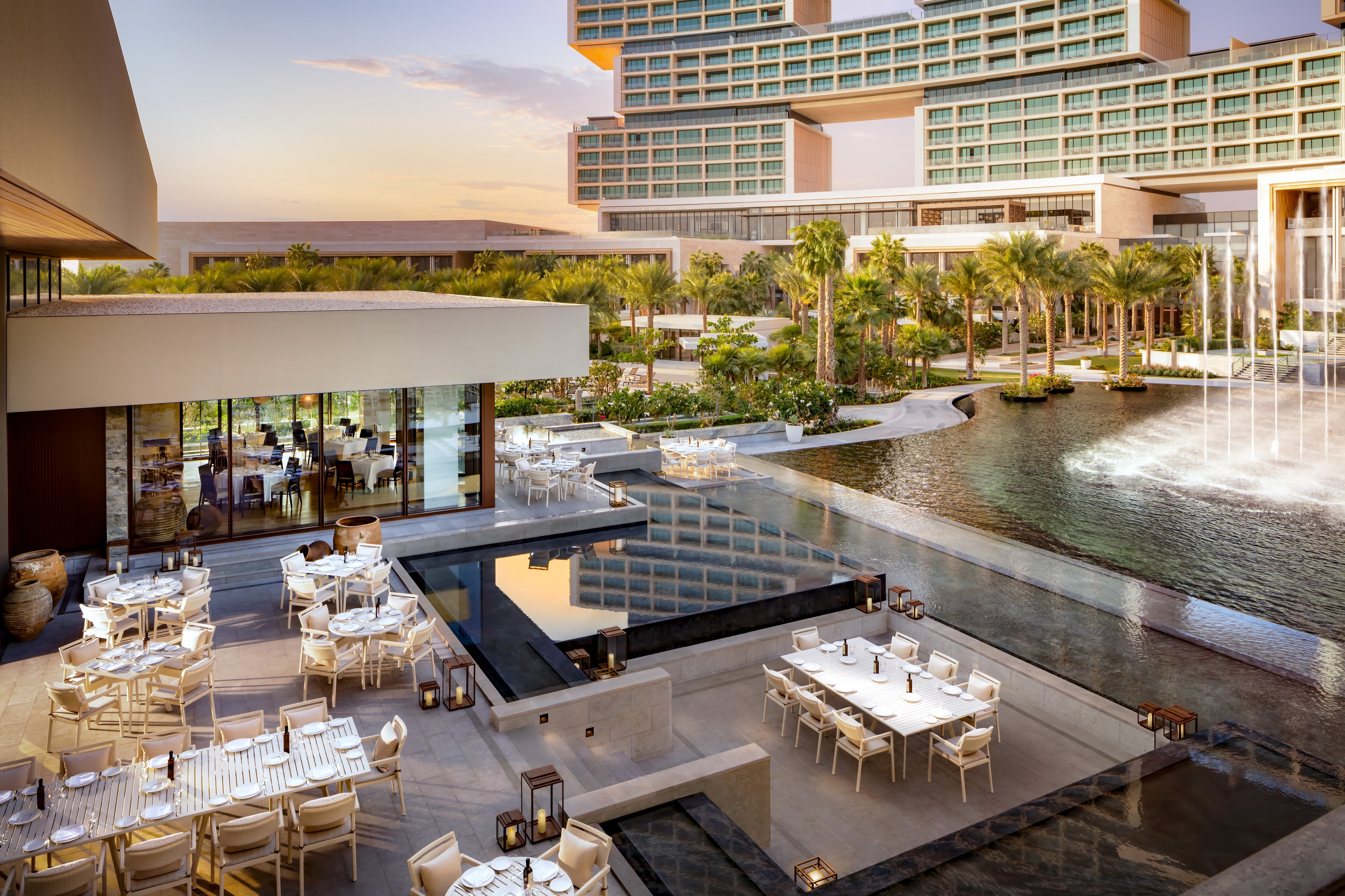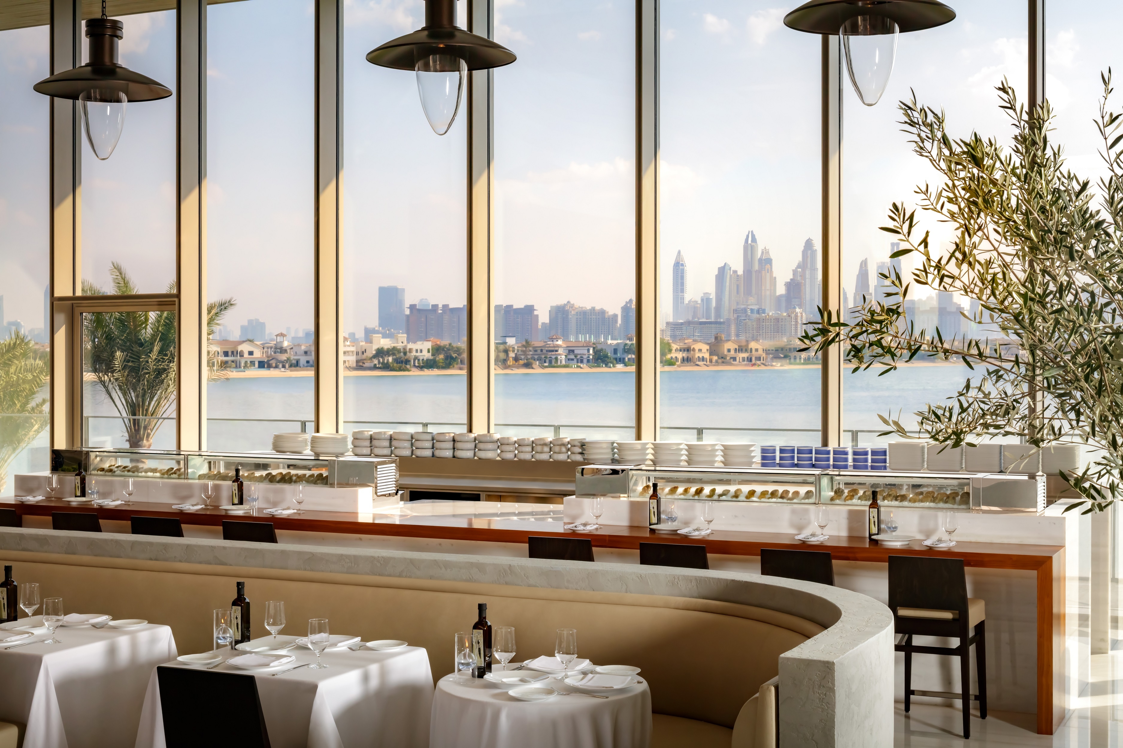 estiatorio Milos at Atlantis The Royal in Dubai is positioned to capture views of the resort’s Main Water Feature show and the skyline, creating a theatrical dining experience. Natural light fills the double-height dining room through a large skylight and operable doors, seamlessly connecting the interior with the outdoors.