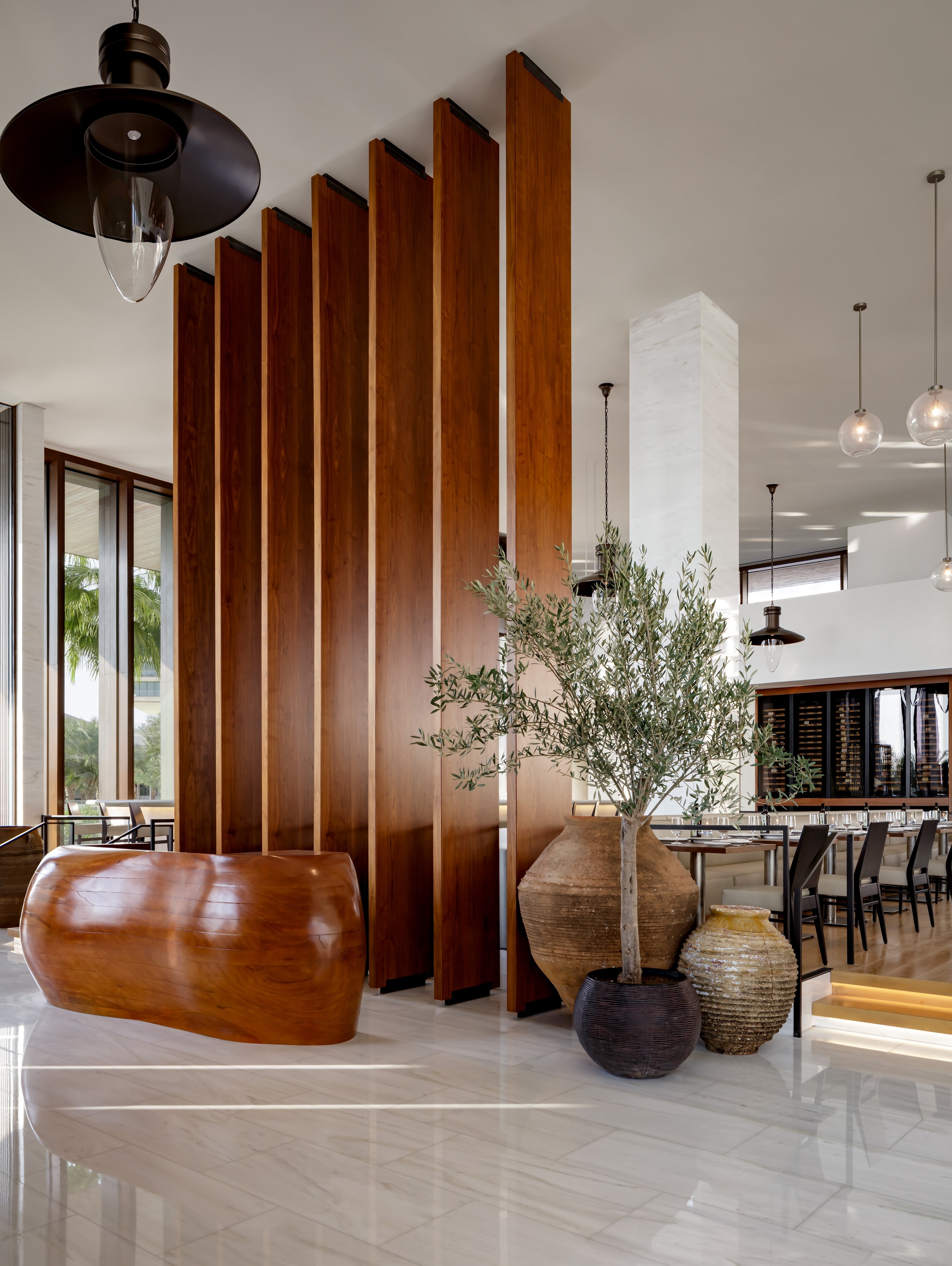 Guided by chef Costas Spiliadis’s commitment to purity and exceptional ingredients, the material palette features warm oaks, walnut wood, and Pentelikon marble from the famed Greek quarry that supplied the Parthenon. Clean lines, custom blown-glass pendants, and an active bar, sushi bar, and expo kitchen surround guests with energy and spectacle.