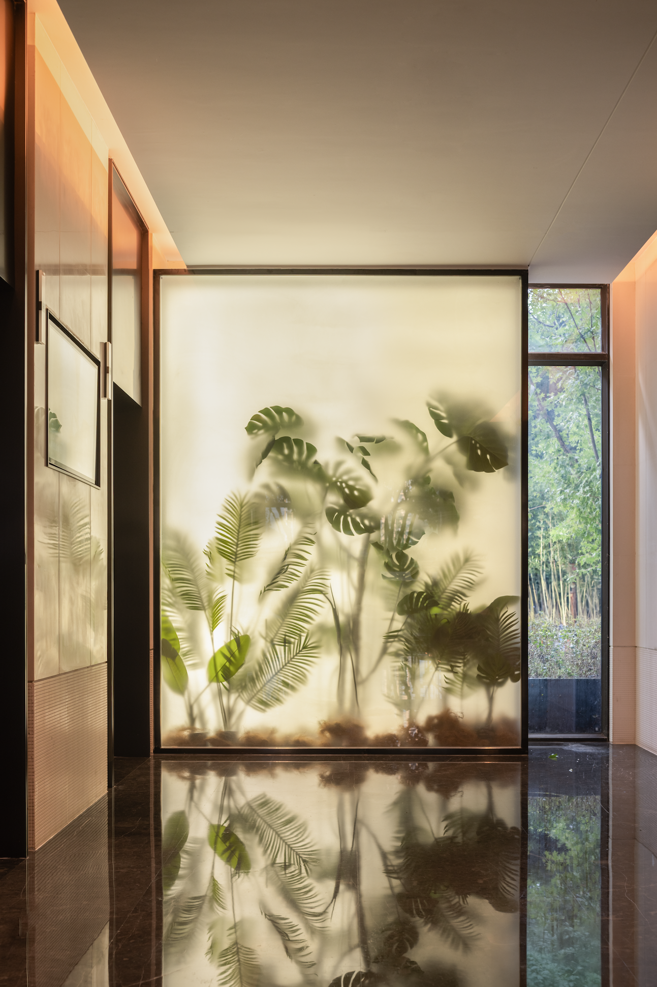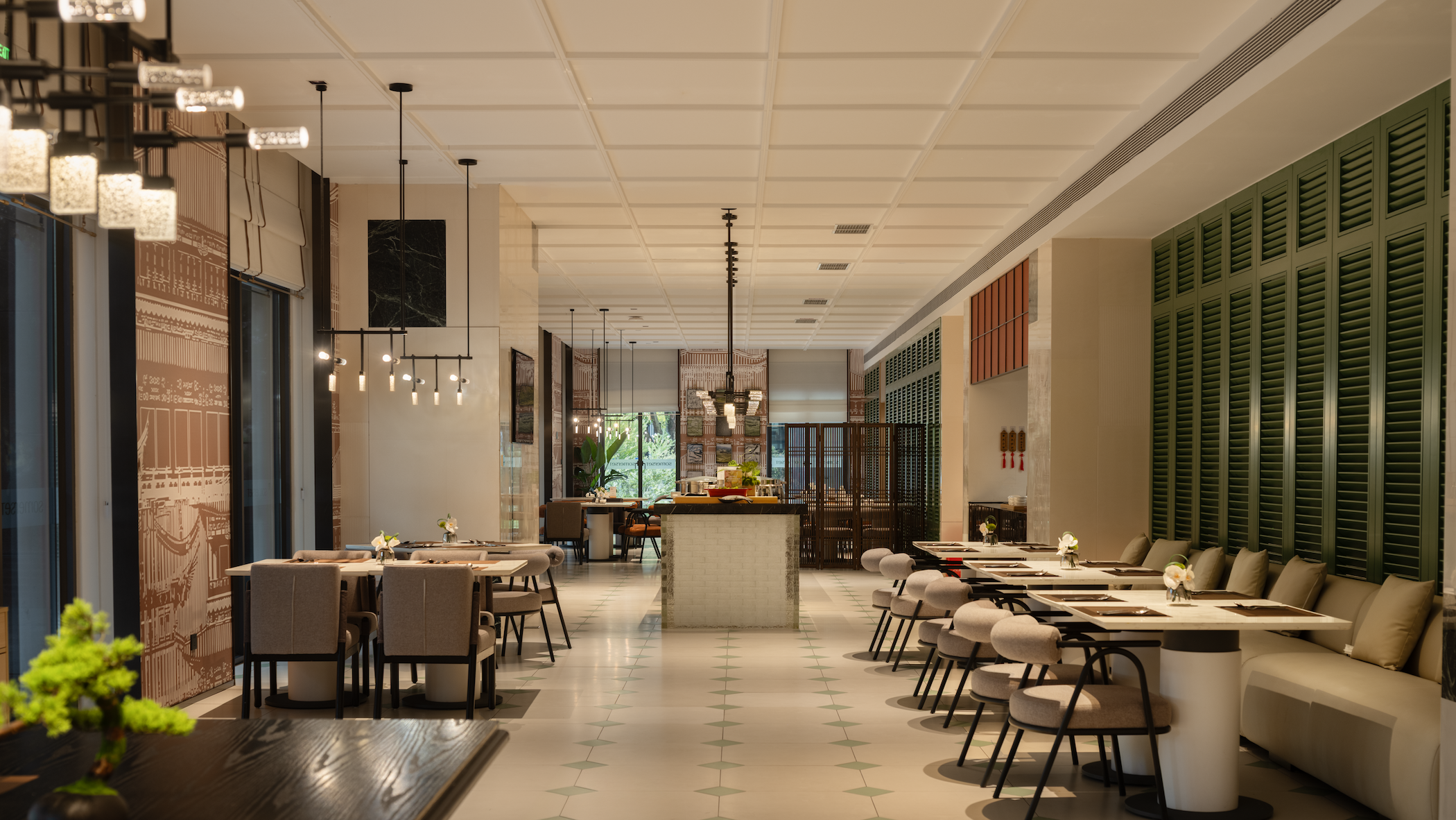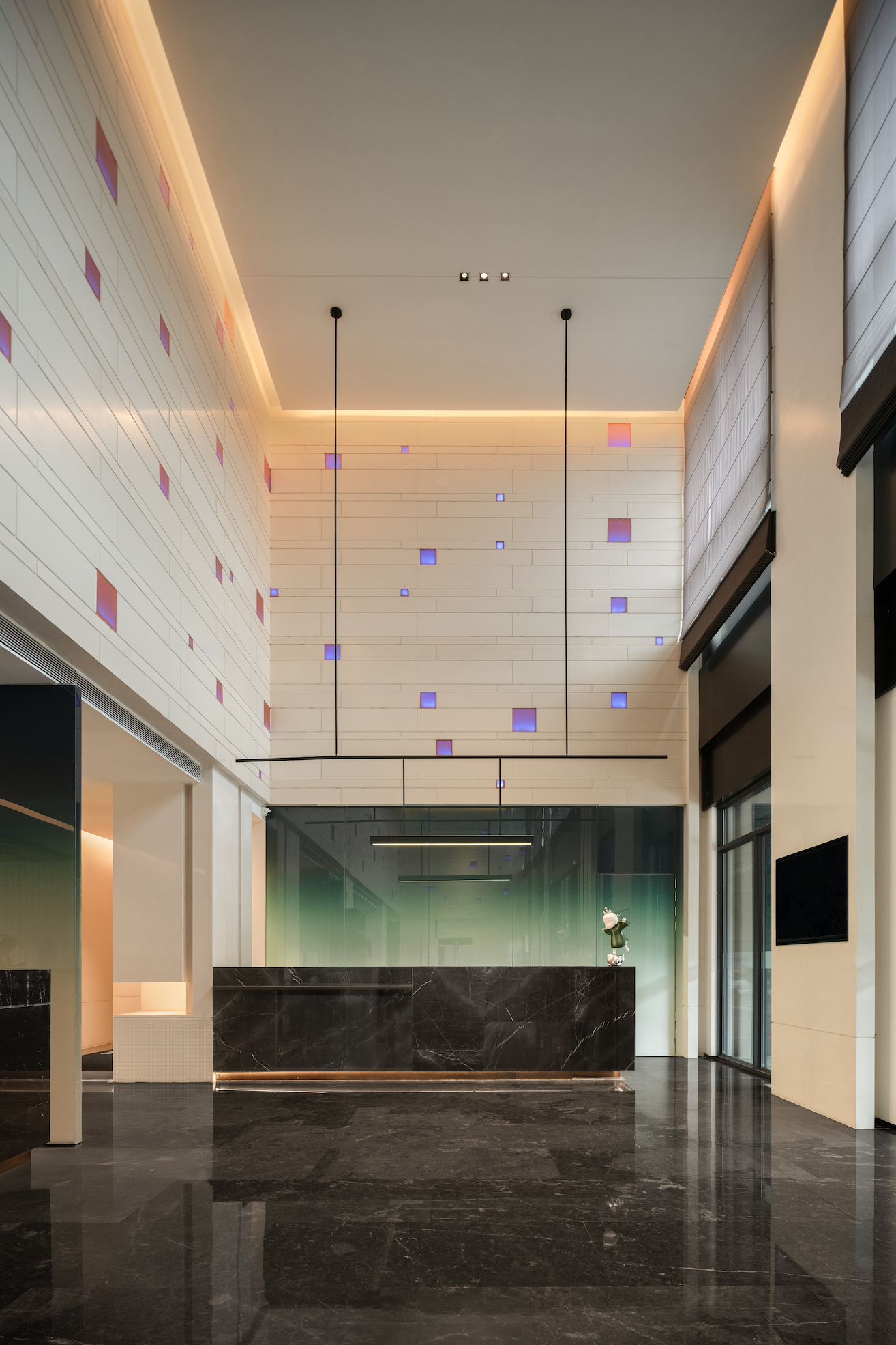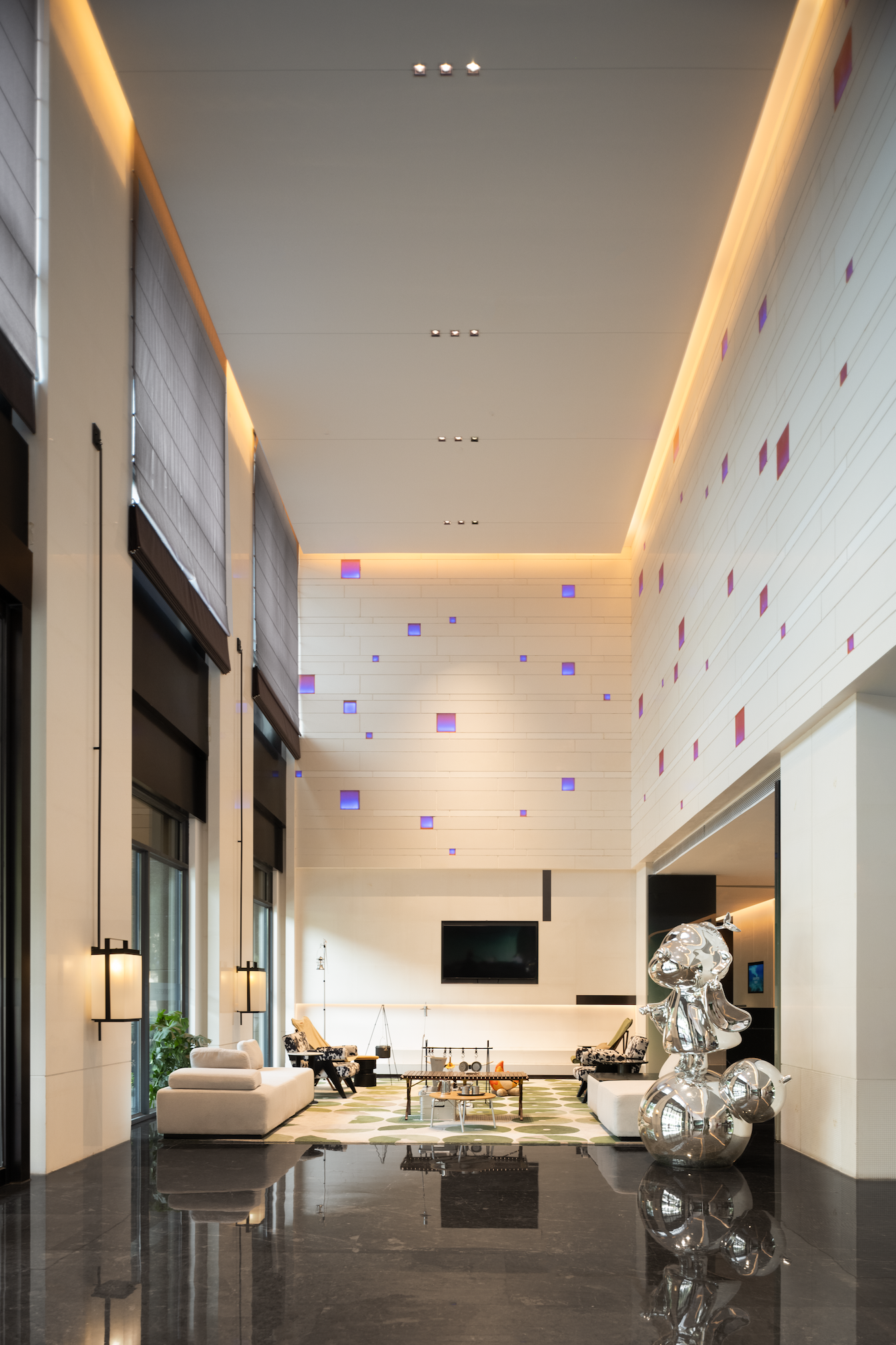 The design inspiration for the lobby comes from Chongqing's local culture and nature, integrating local memory with contemporary living. The dominant green hue extends the outdoor lawns into the interior. The modern minimalist style and lofty ceiling invite the wind to partake in daily life.