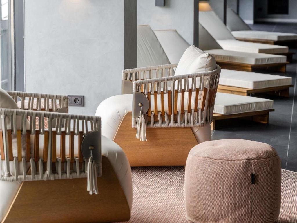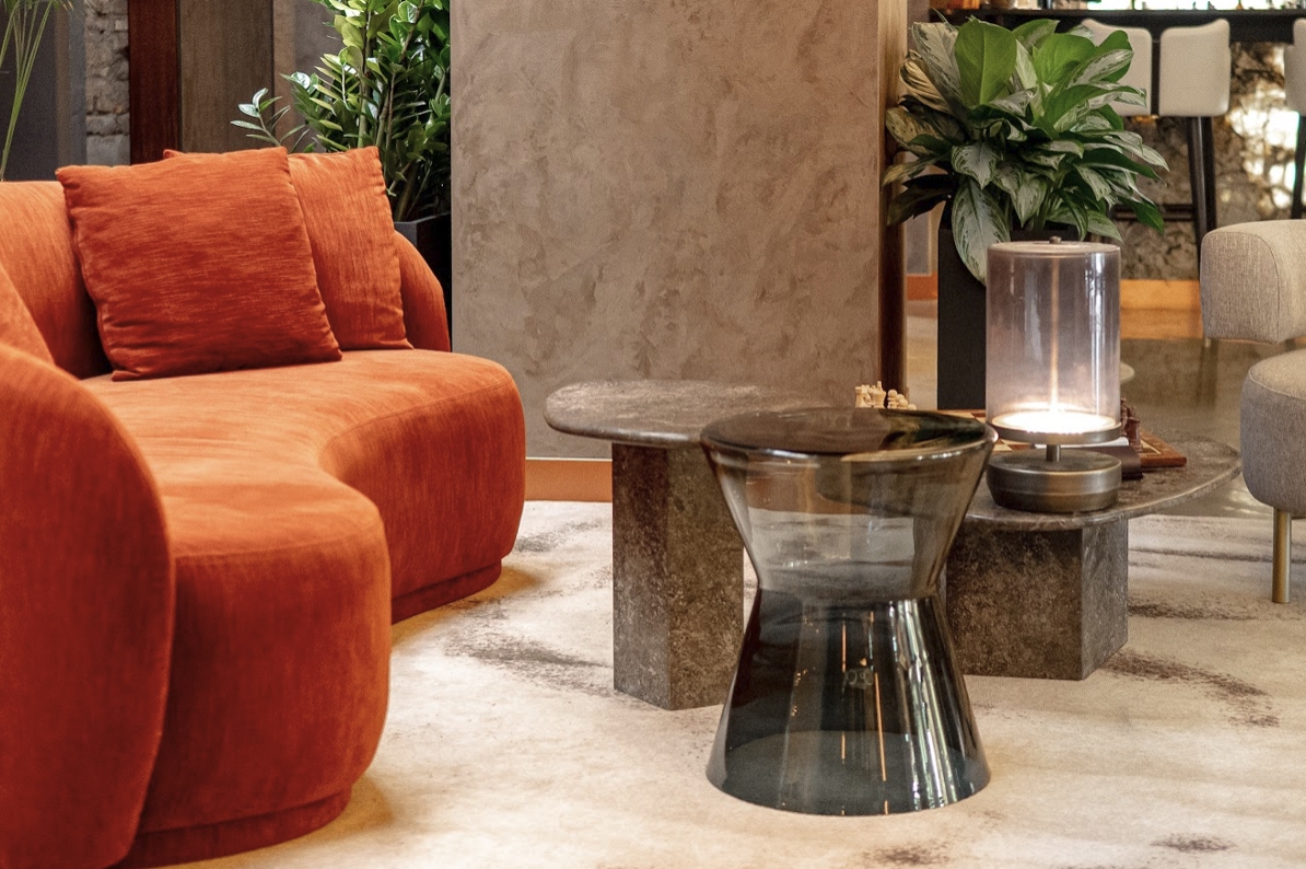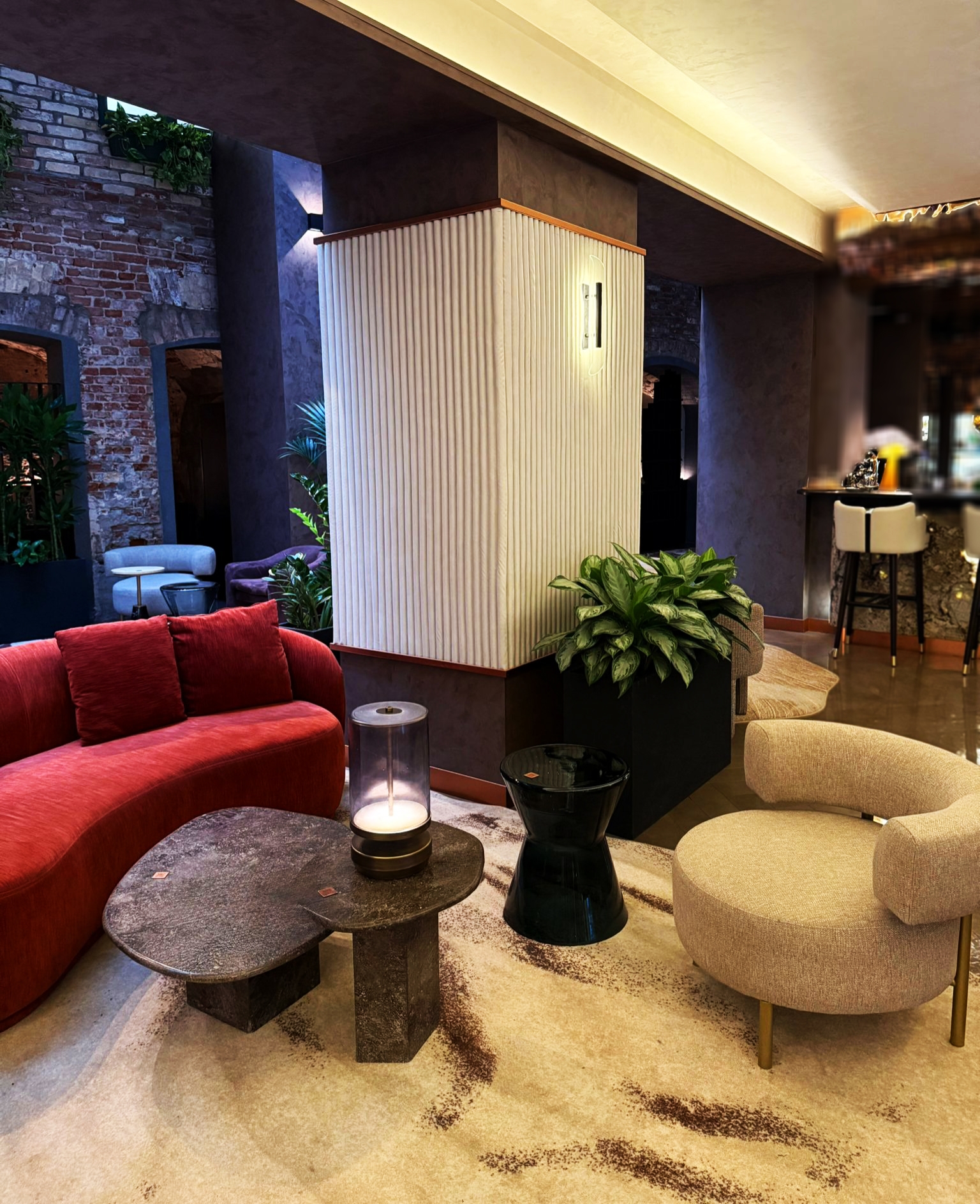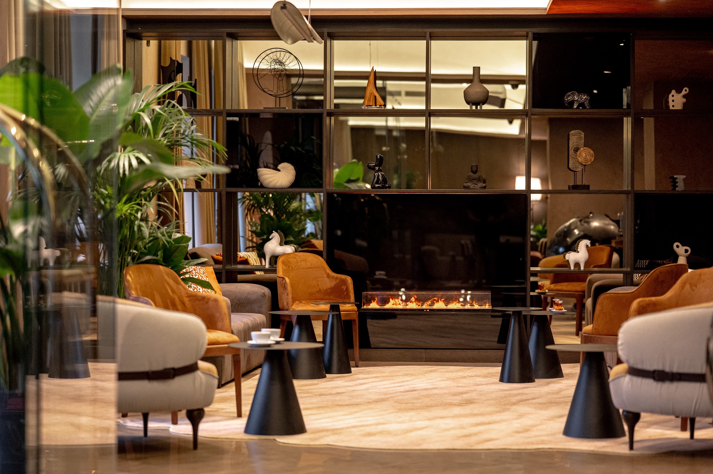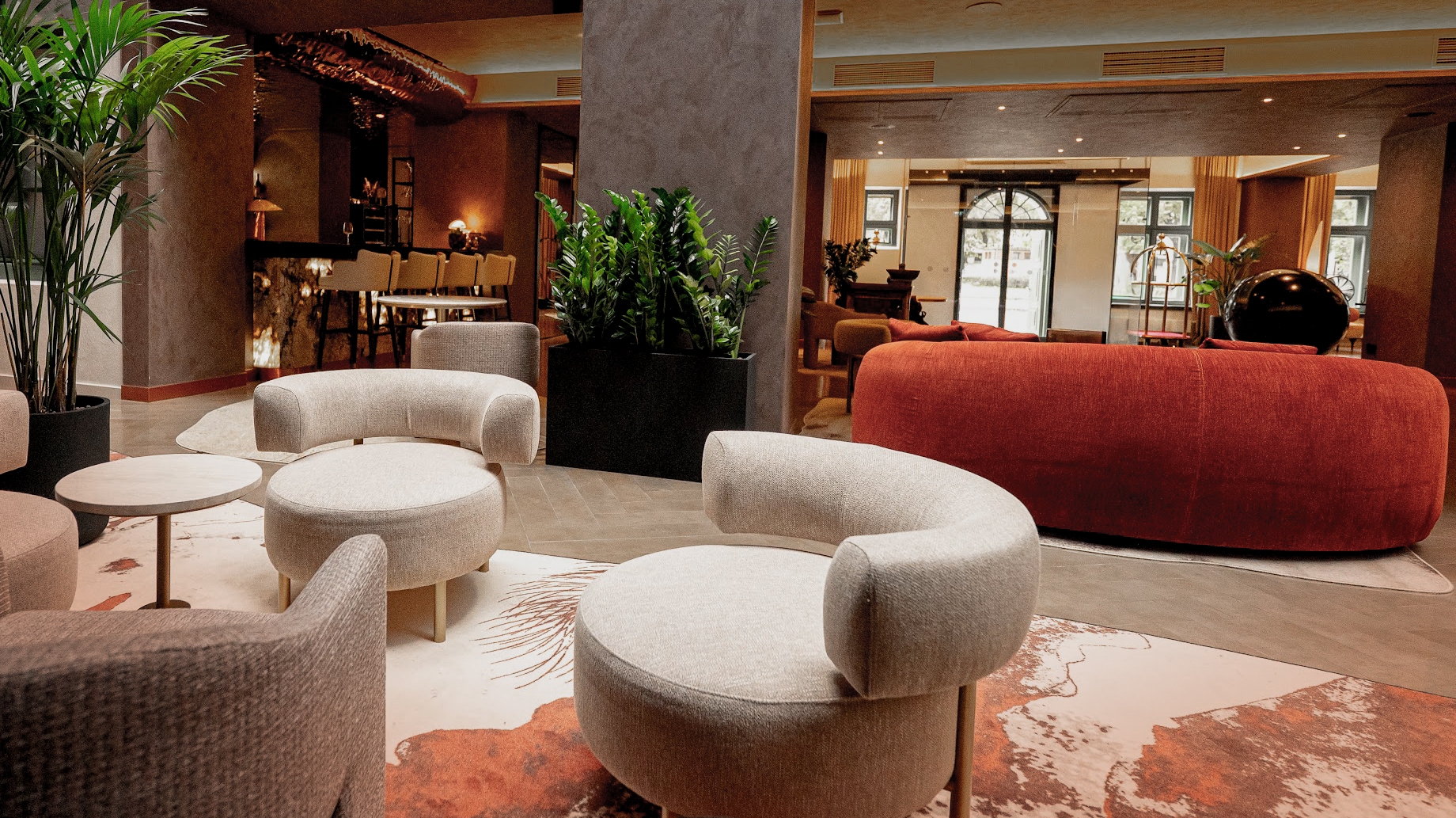 Nature is present throughout the interiors through biophilic design. Organic forms appear in wallpaper graphics, furniture shapes, artworks and carpet patterns, introducing a sense of softness, movement and natural rhythm. Architecture forms the second layer of the story, creating a dialogue between old and new. References to the building’s history are expressed through leather details and subtle equestrian-inspired accents rooted in the region’s cultural heritage.