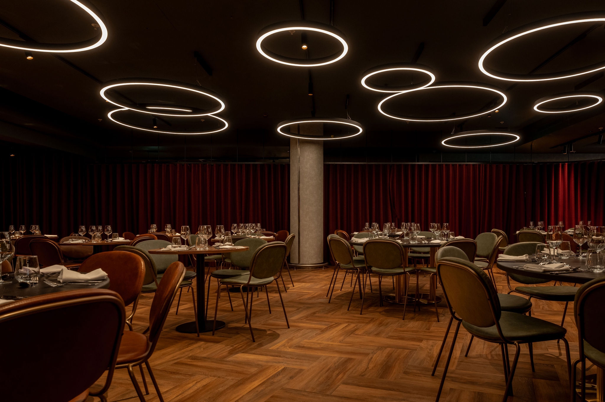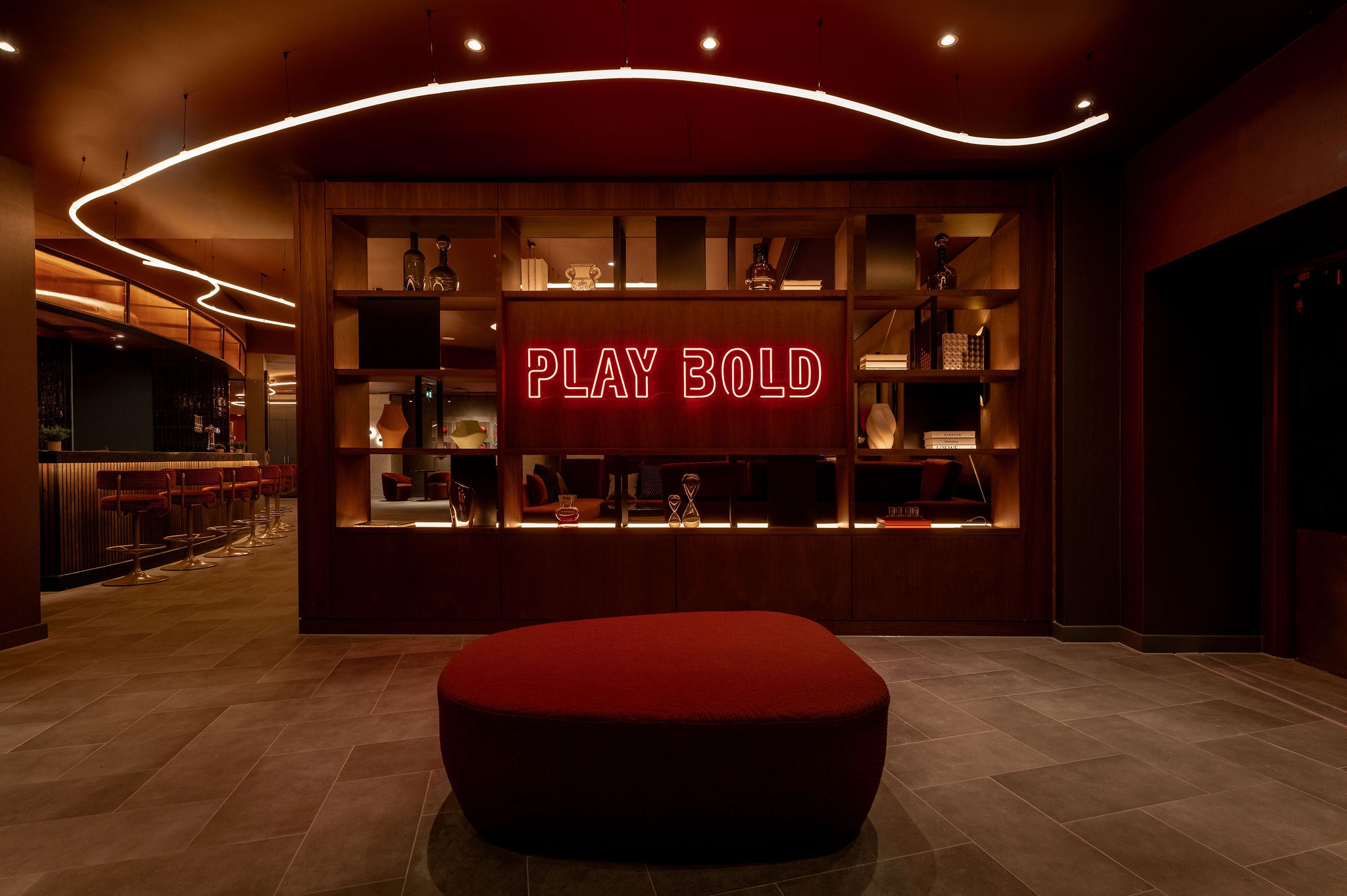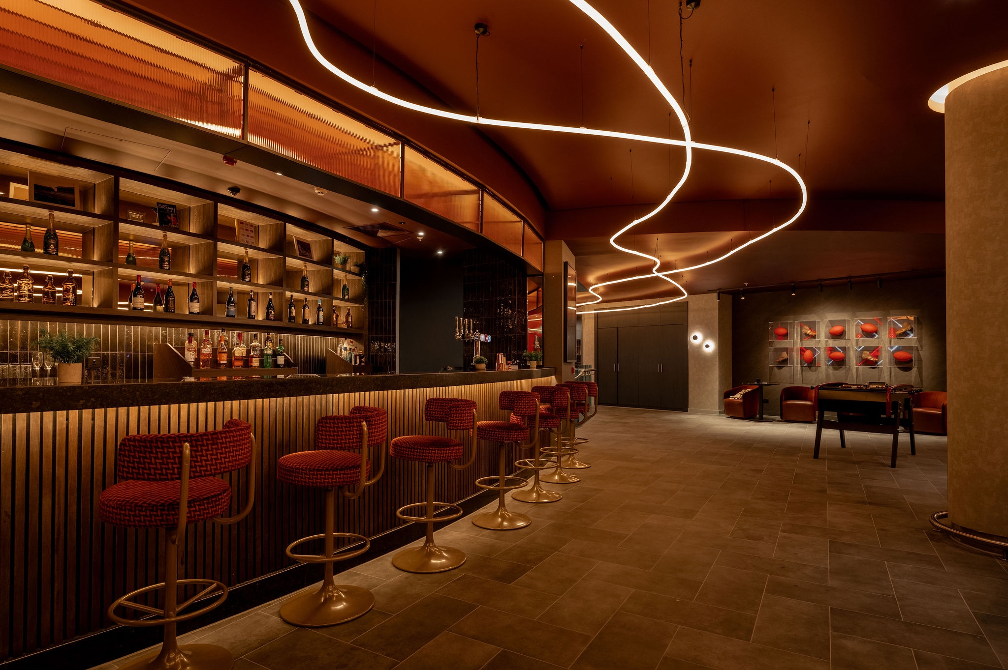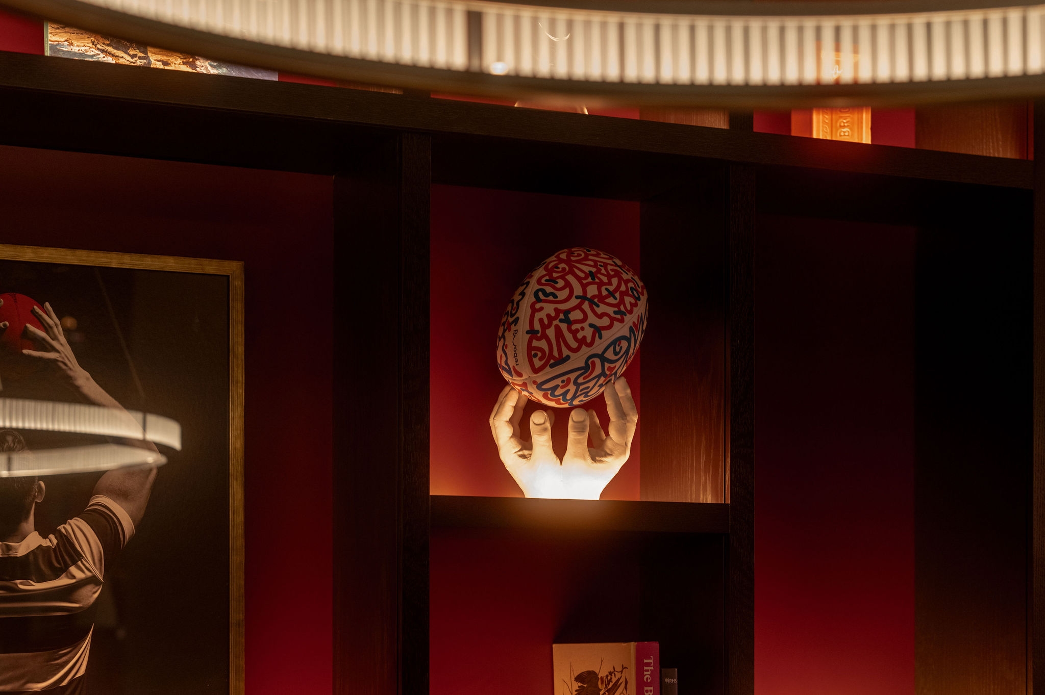 The design features dramatic light installations that express the movement in rugby games, material references to historic rugby equipment, dramatic colour contrasts and bespoke sculptural installations, celebrating women’s rugby.