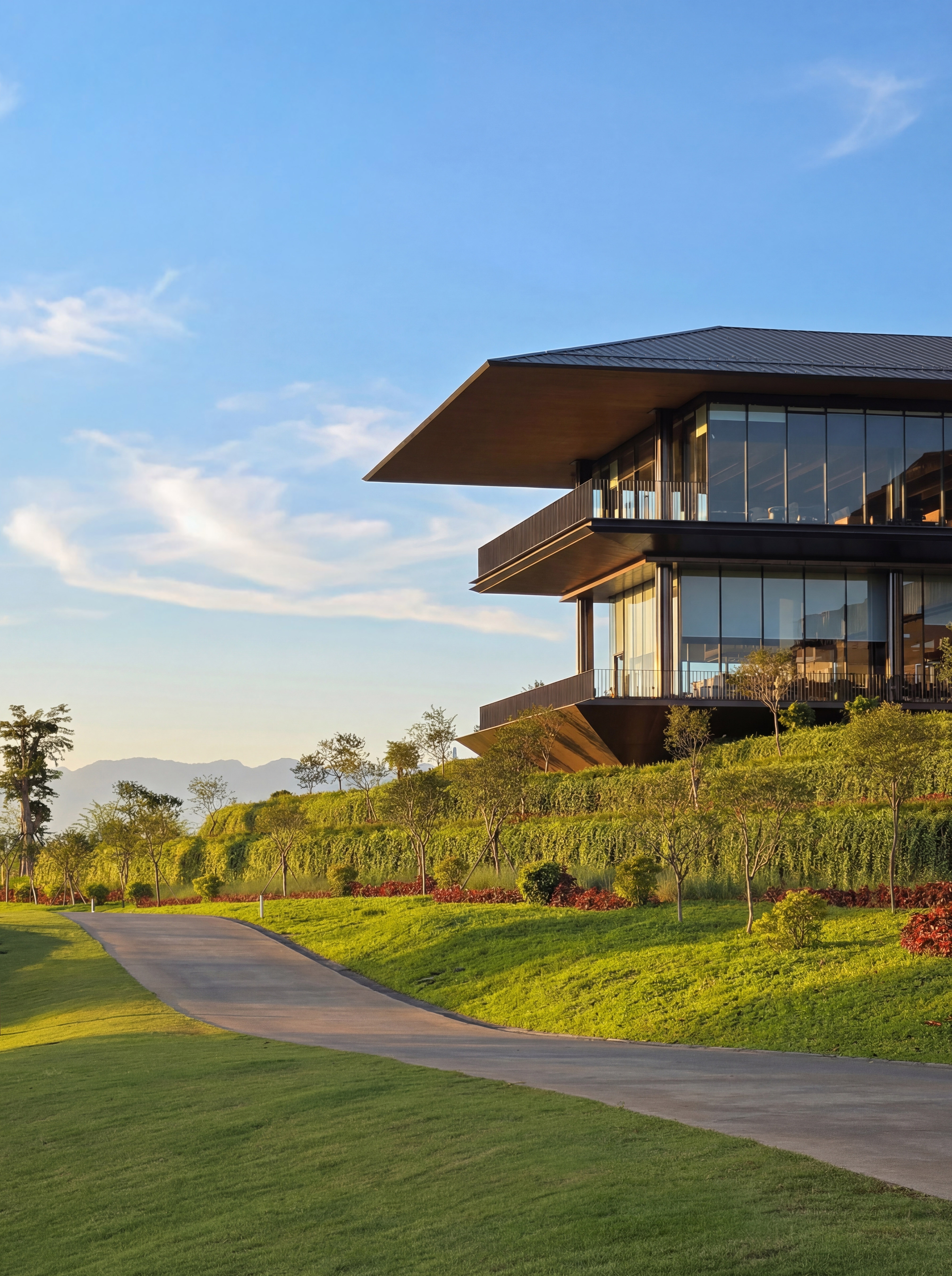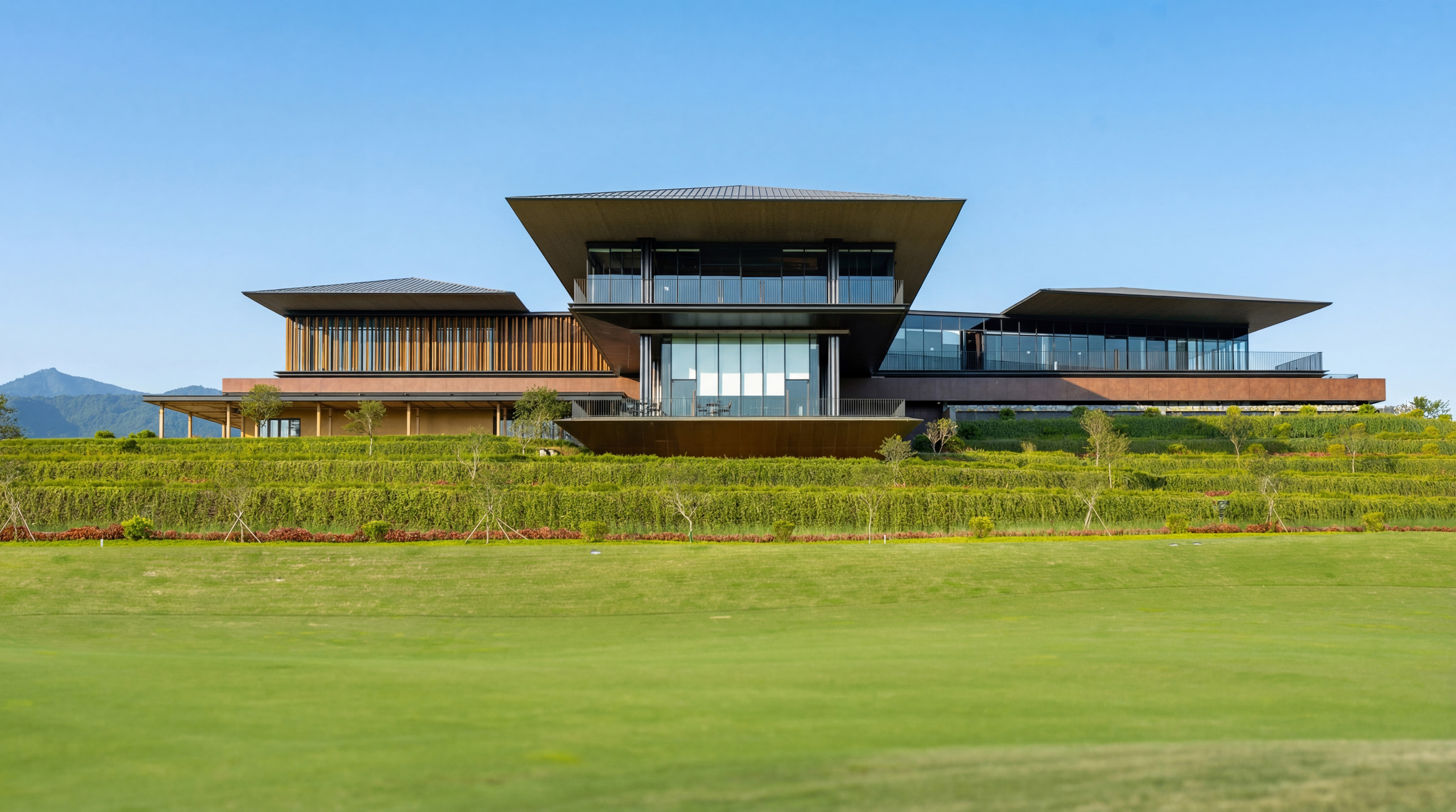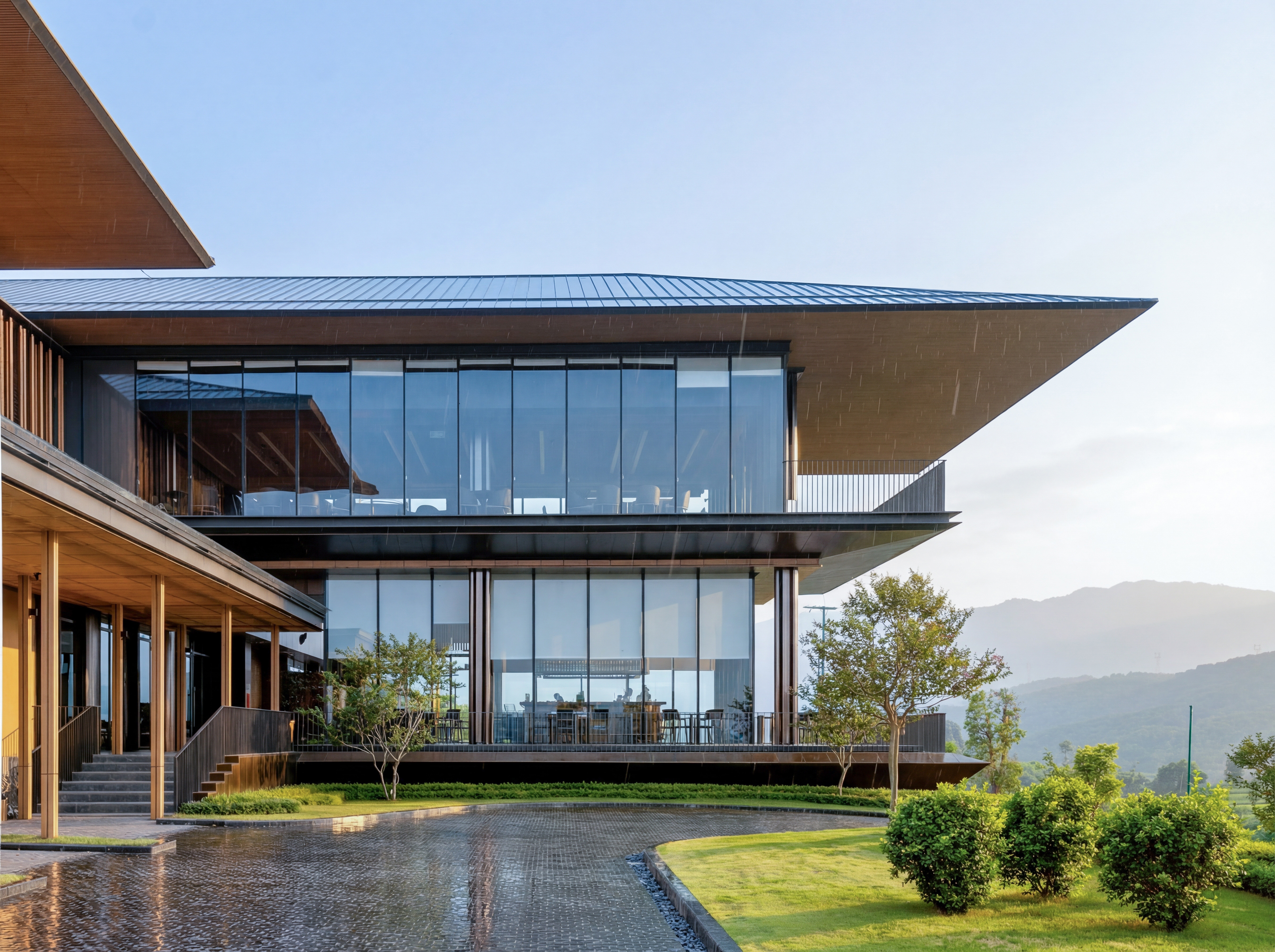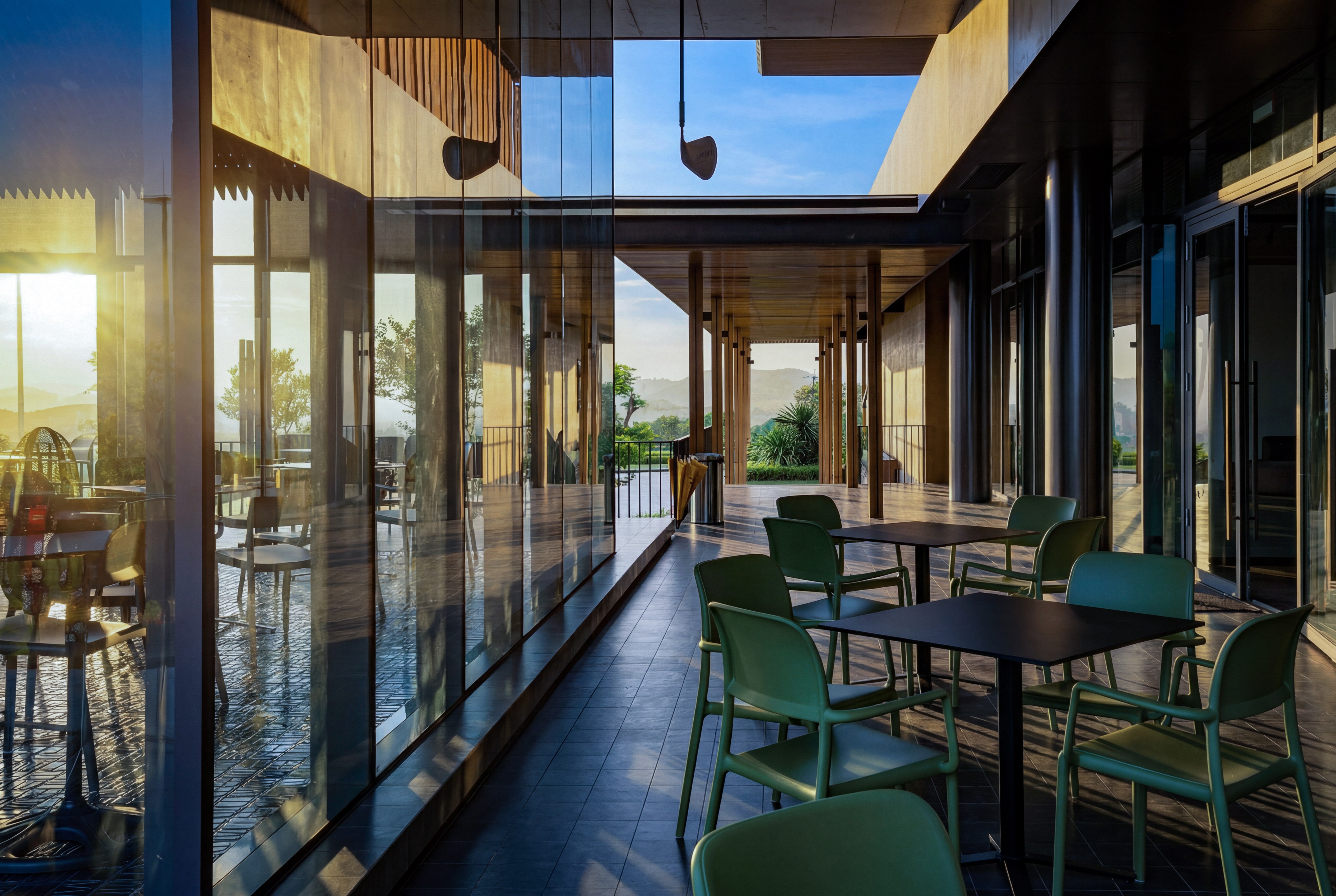 As the architectural focal point of the development, the Clubhouse shares a unified architectural and landscape language with other components of the golf complex through a steel structural system, while the material palette combines metal and wood to convey modern refinement and warmth aligned with contemporary hospitality.