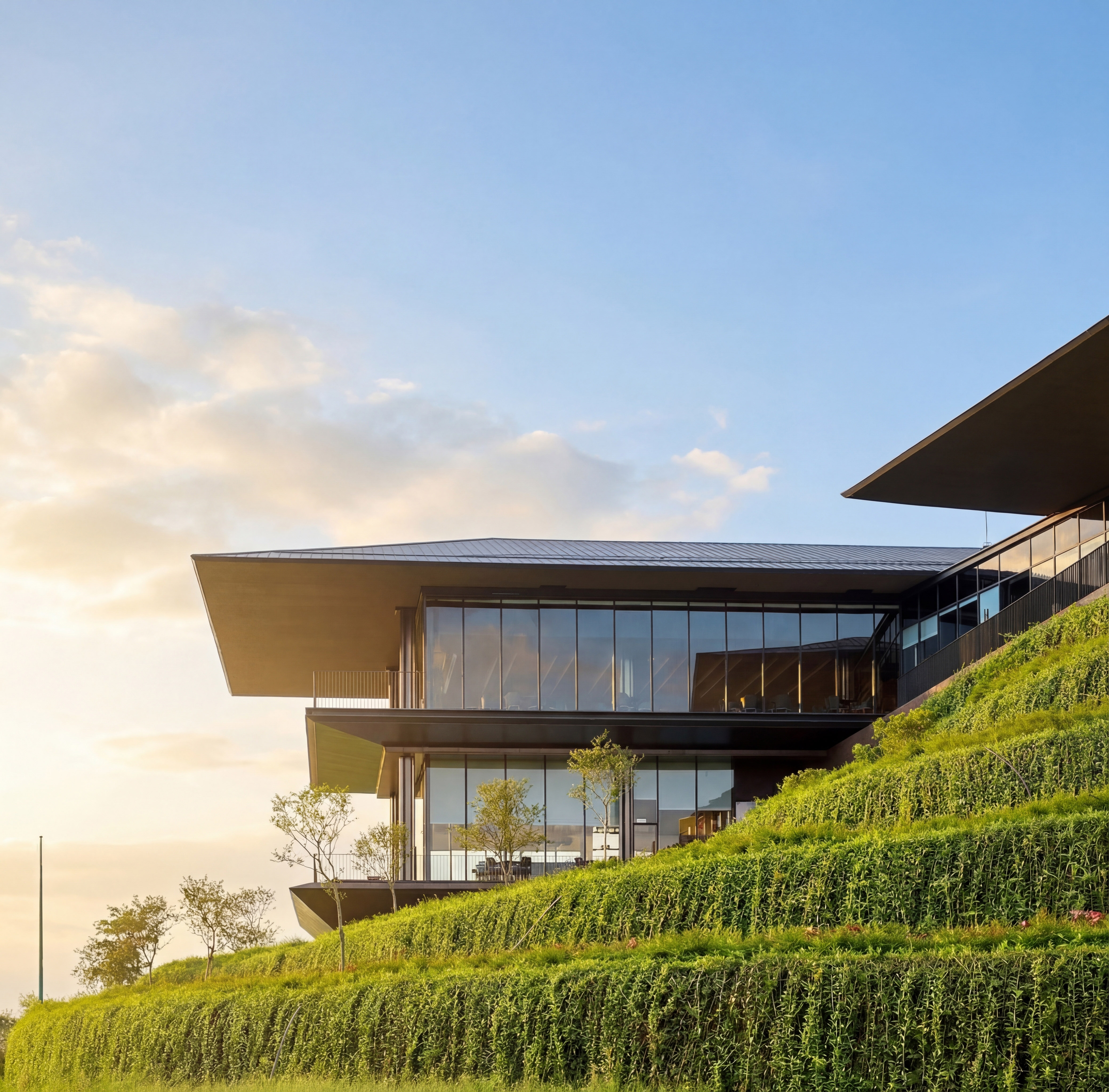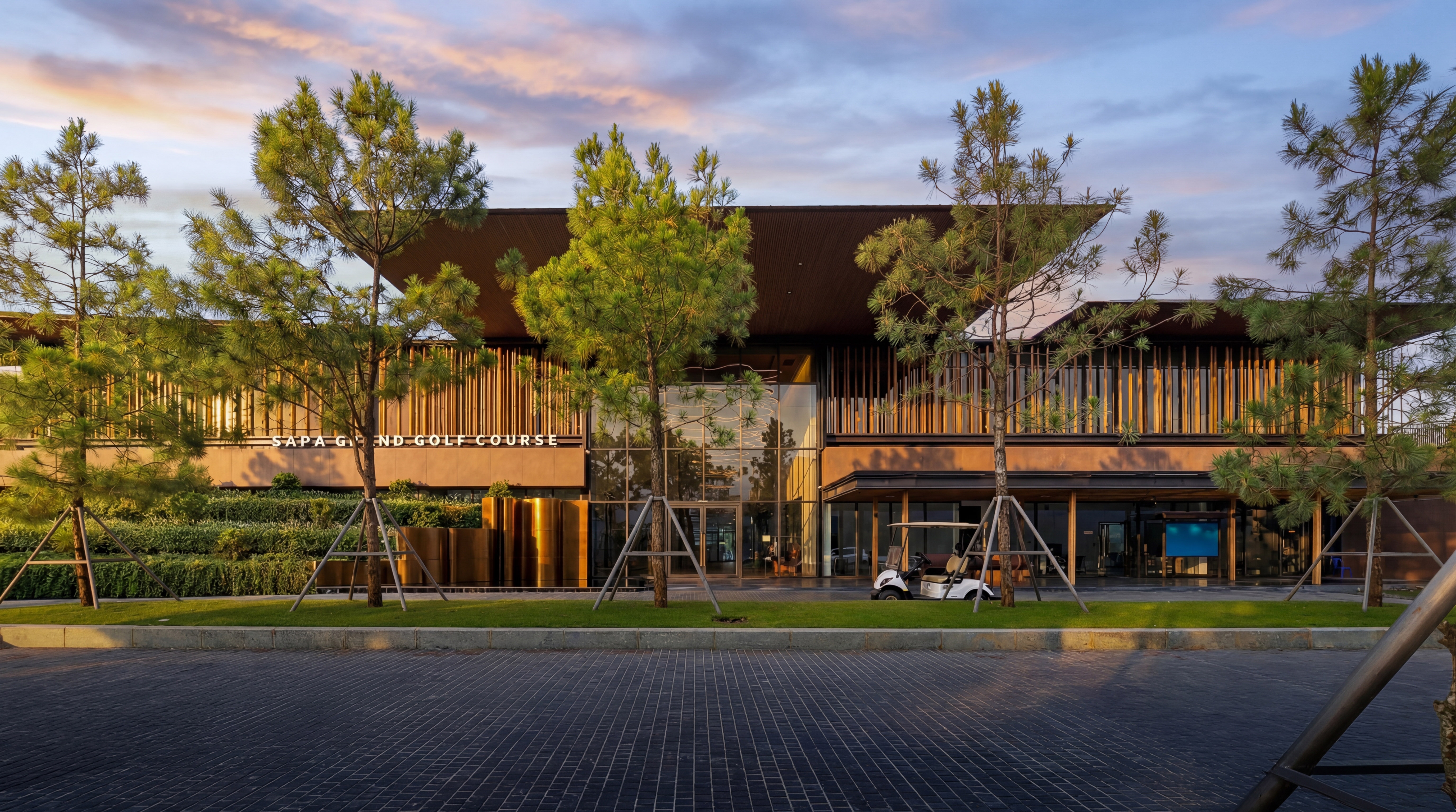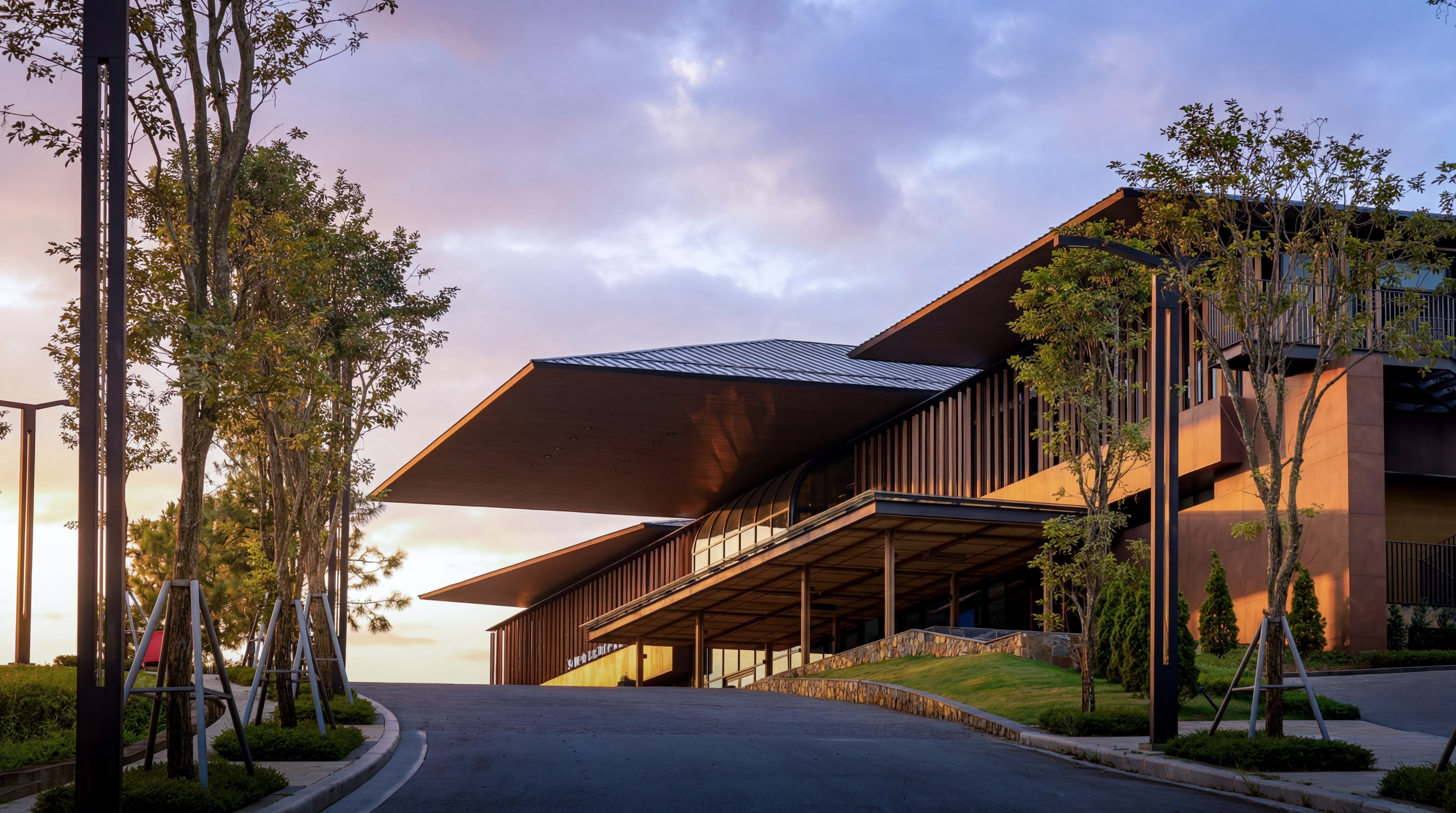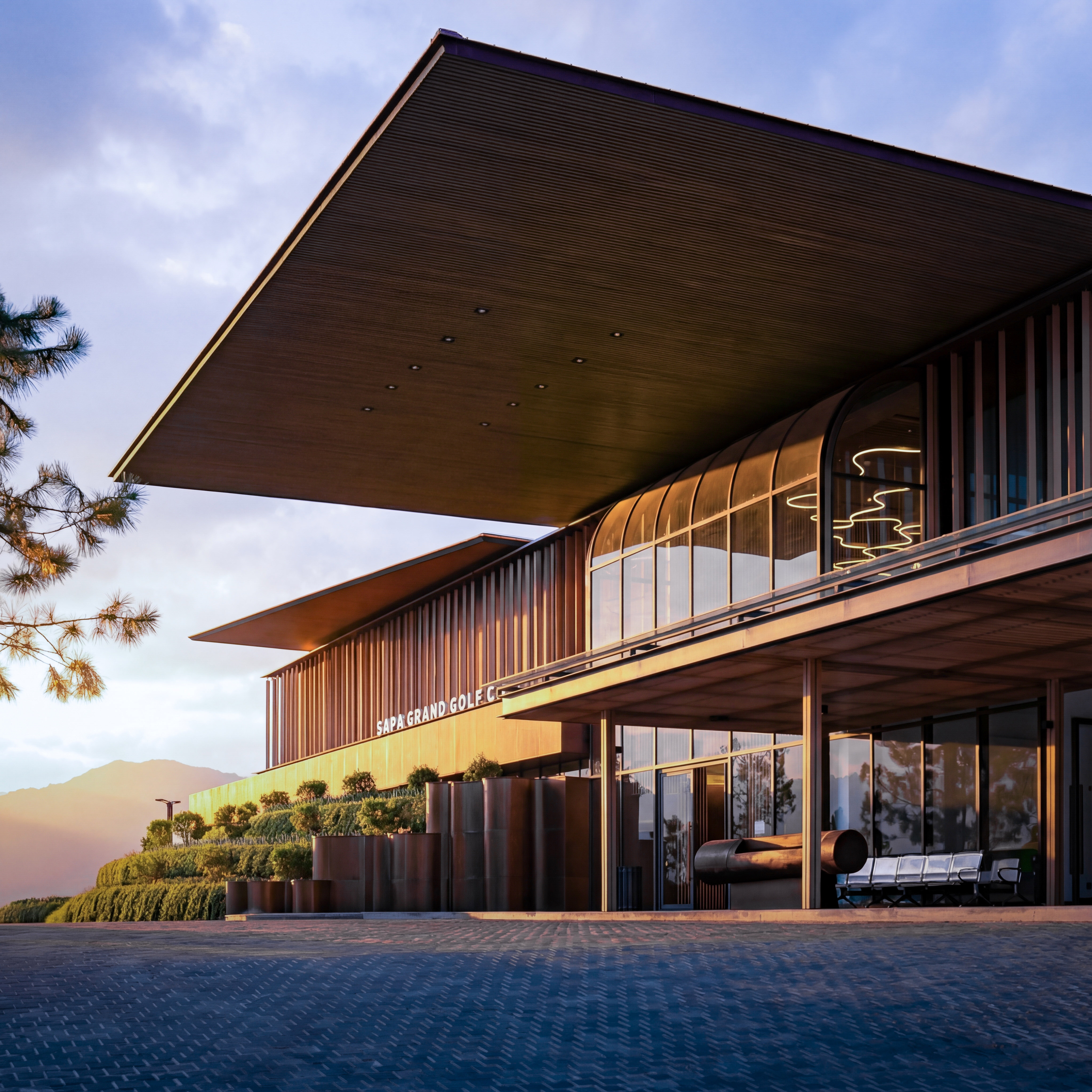The Clubhouse at Sa Pa Grand Golf Course is composed as a series of modern functional box volumes extending from the existing structural framework and sheltered beneath a floating roof system above a terraced landscape plinth. The composition is inspired by the understated forms of village roofs and cultivated hillsides of the Northwest mountainous region. Large roof planes and canopies project outward with strong cantilevers, lightly covering the functional areas.