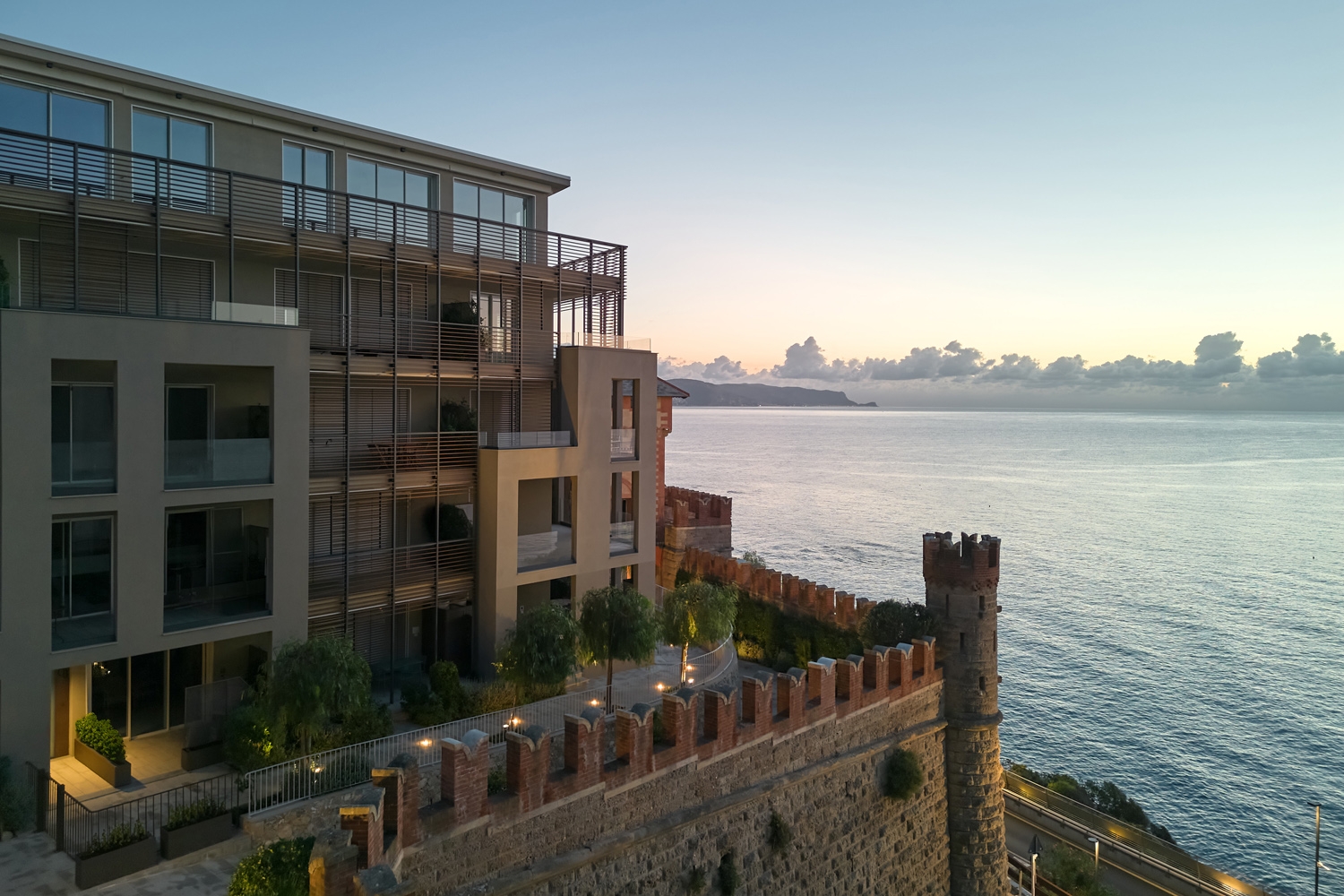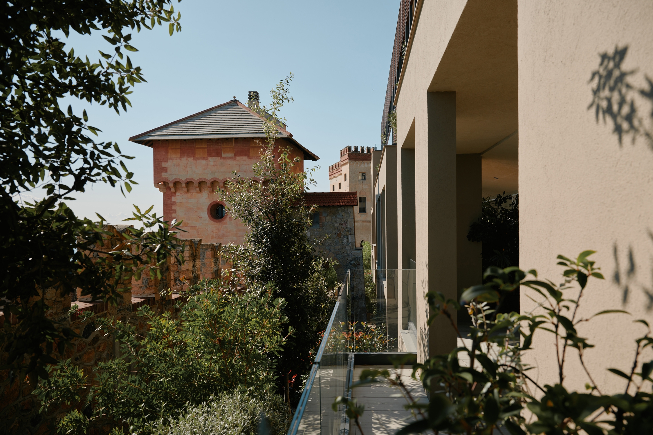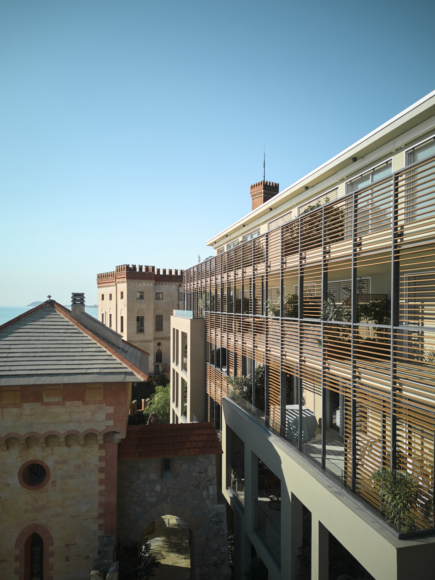 The project seeks a constant dialogue between ancient and past, with a decomposition of volumes on a technological backdrop in stave and glass in antithesis to the crenellated walls and towers of the castle. The new building observes the sea and blends into the greenery, hides between the walls and reveals itself to the observer who reaches and enters the complex.