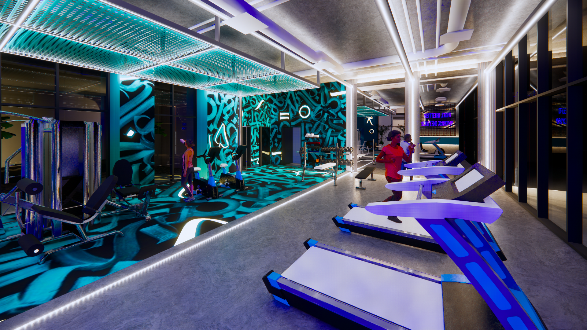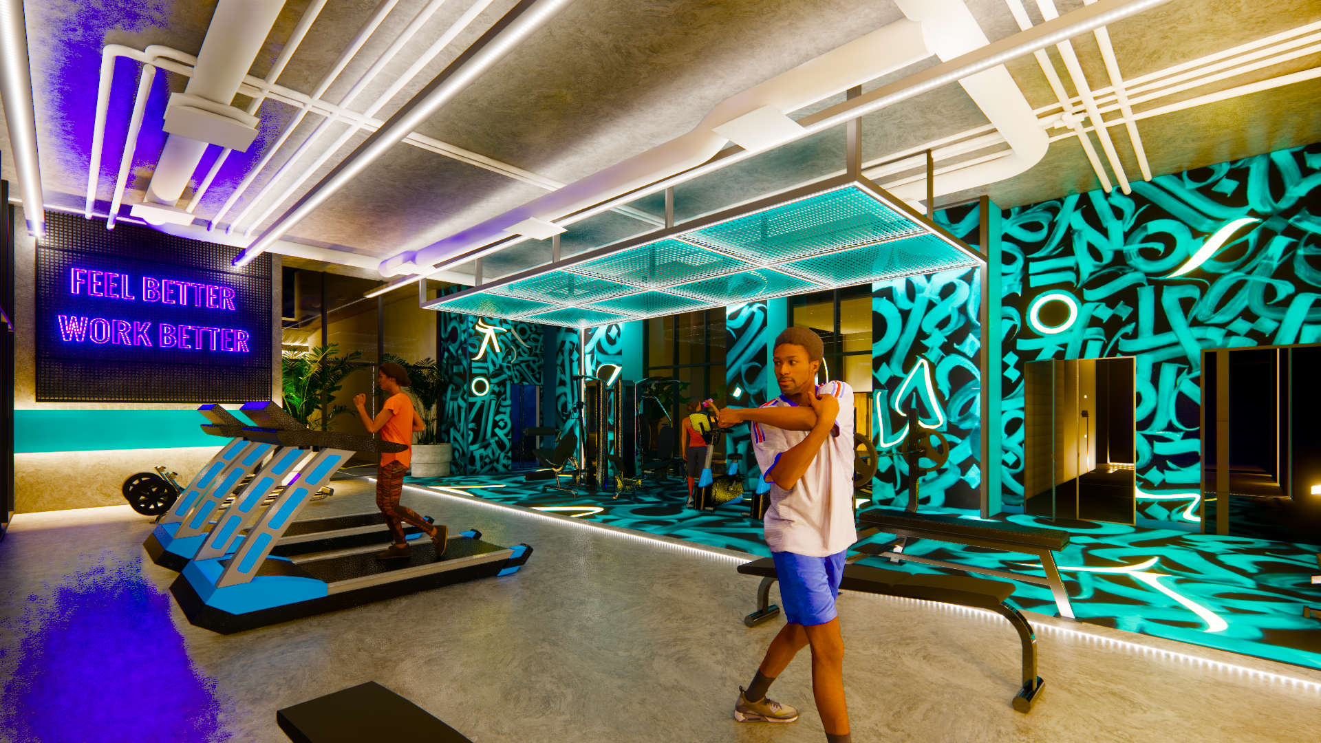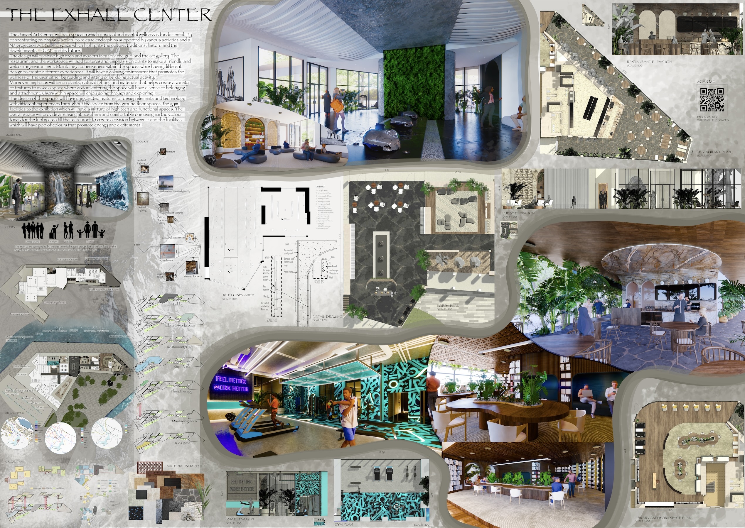 The design will combine high-tech and modern ideas for the gym and the art gallery. The restaurant and the workspace will add textures and emphasis on plants to make a friendly and welcoming environment. Maintaining cohesiveness within the spaces while having different design to create different experiences. It will have a calming environment that promotes the wellness of the user either by reading and sitting or by doing actual activity.