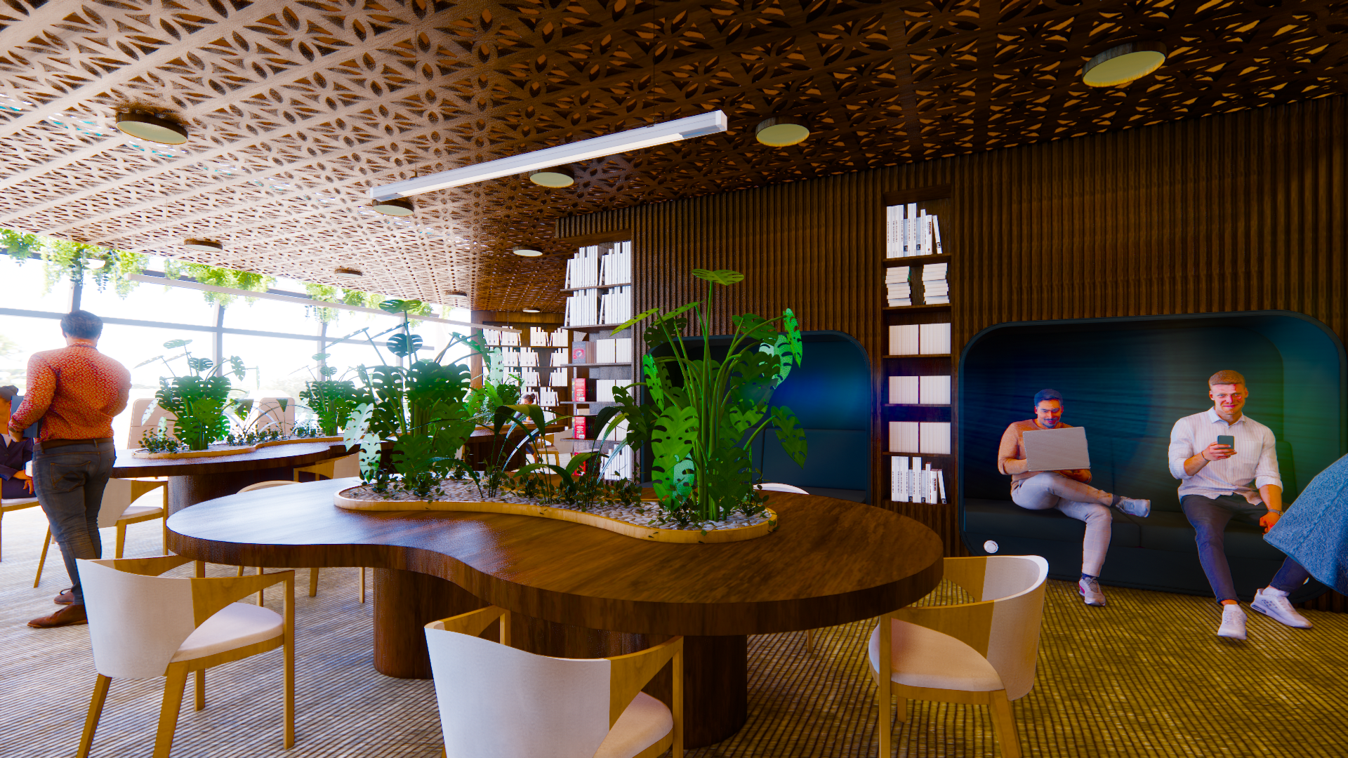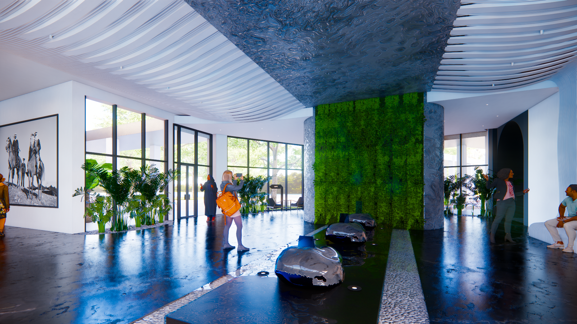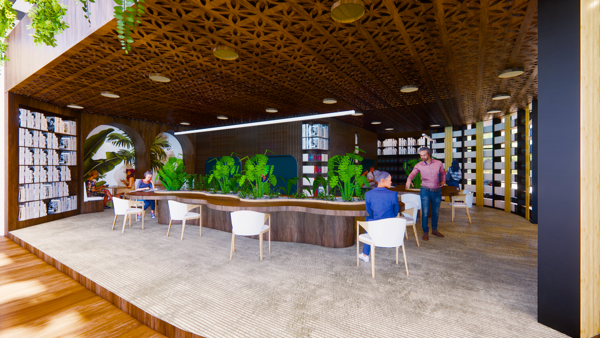 The design will combine high-tech and modern ideas for the gym and the art gallery. The restaurant and the workspace will add textures and emphasis on plants to make a friendly and welcoming environment. Maintaining cohesiveness within the spaces while having different design to create different experiences. It will have a calming environment that promotes the wellness of the user either by reading and sitting or by doing actual activity.