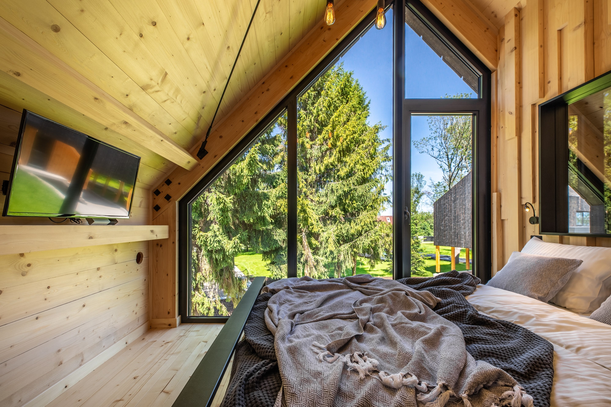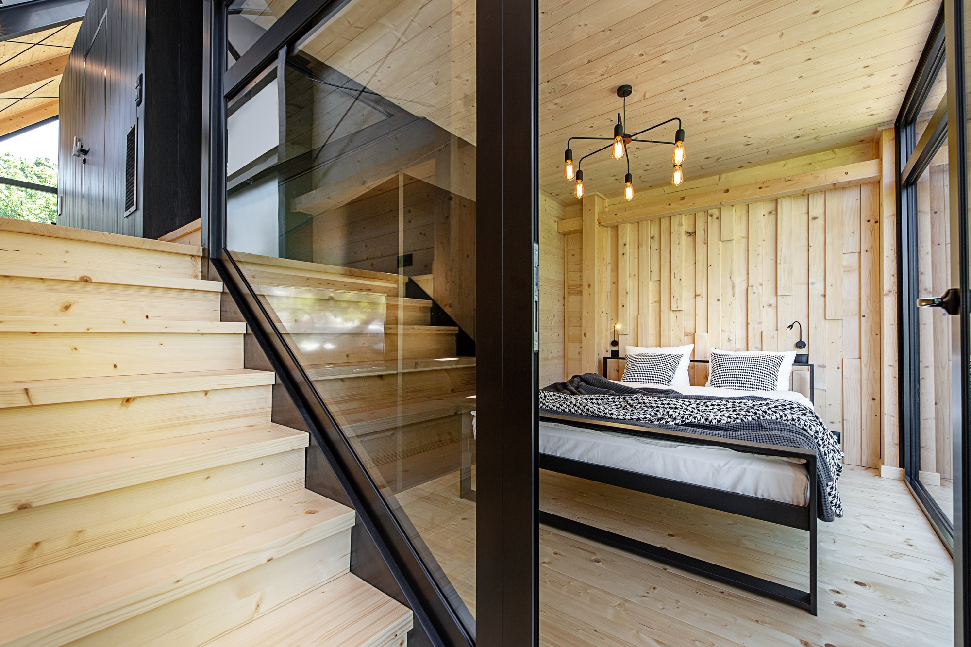 The interior concept derives directly from the architecture’s character – inside of buildings with black facades, the designers placed smaller, distinctive black houses which contain a kitchen, a bathroom and wardrobes. This allowed for a visual division of houses into functional areas. A visible wooden construction, in a natural pine colour, forms a living room with a large glass facade; while surrounding the black house with grey concrete tiles which resemble typical hexagon pavers, help distinguish passageways and dining area.