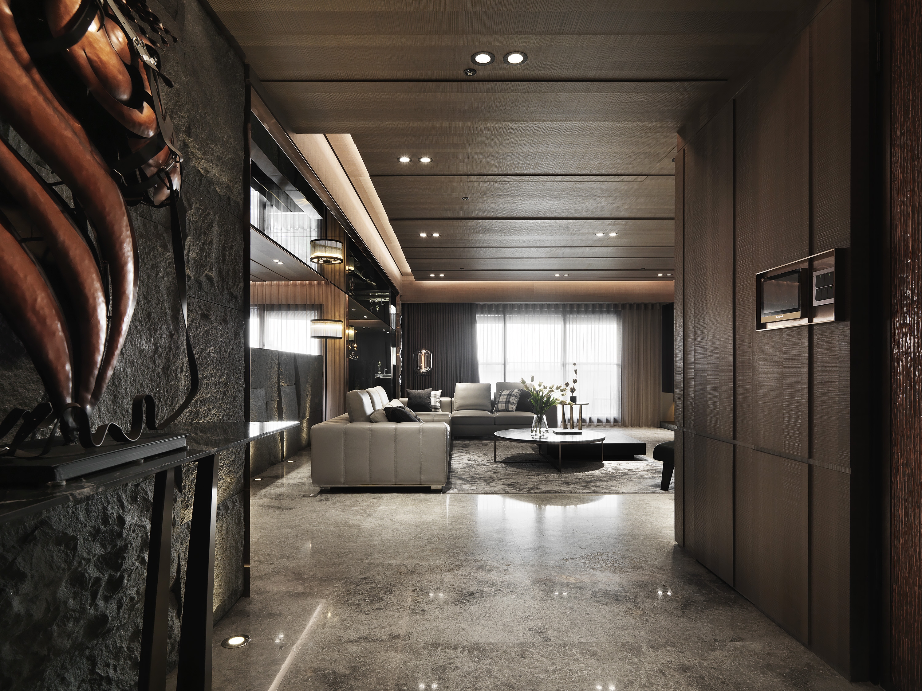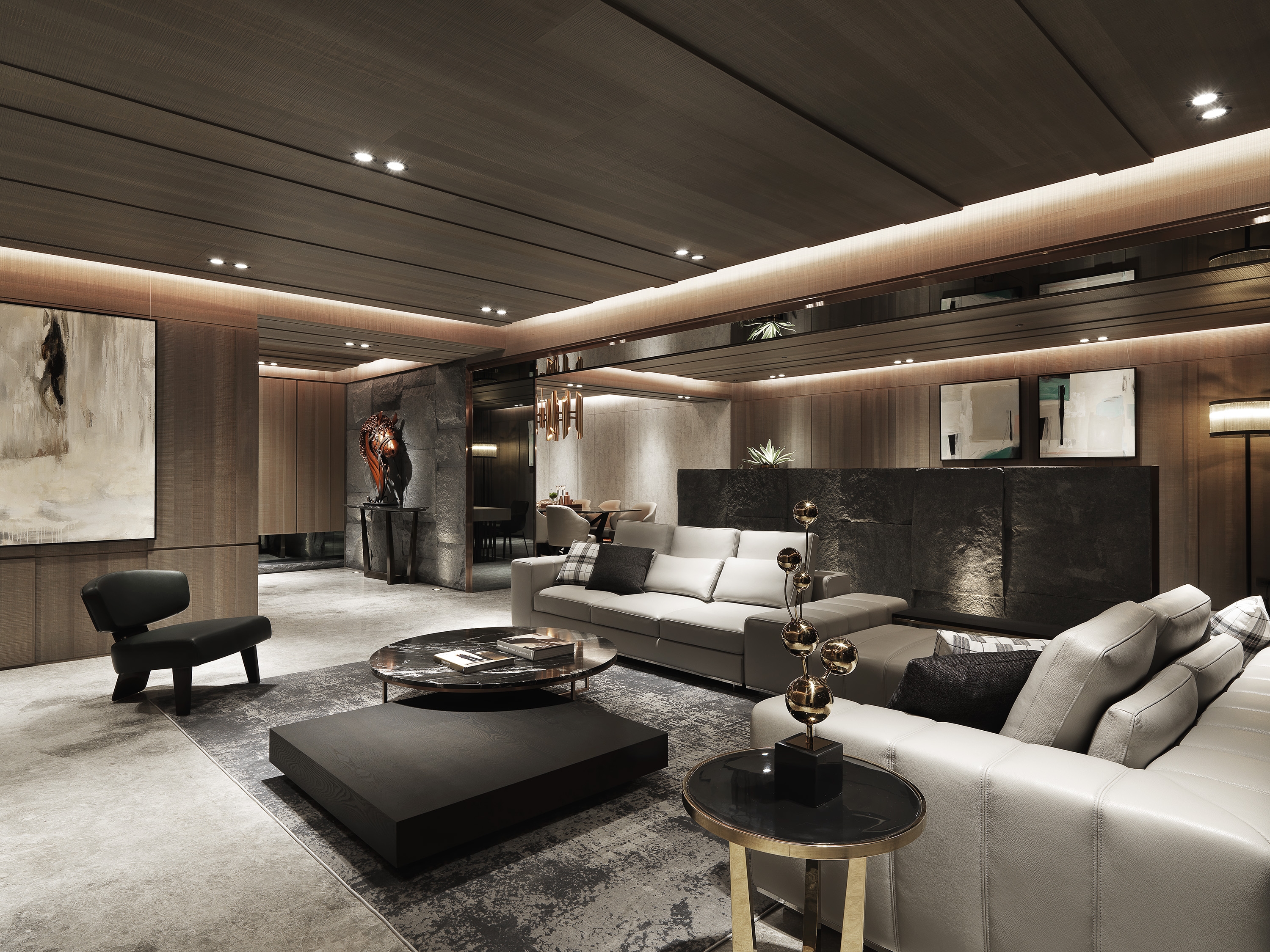 From the entrance of the gate into the entrance to place the end-view artwork to the front, leading into this mysterious space, the television wall using large stone to present, so that the visual focus gathered, the space atmosphere using a calm color system, so that the mind at ease, with some mirror decoration, dotting the bright and expanded effect of the space, the ceiling is staggered with wooden panels stacked together,