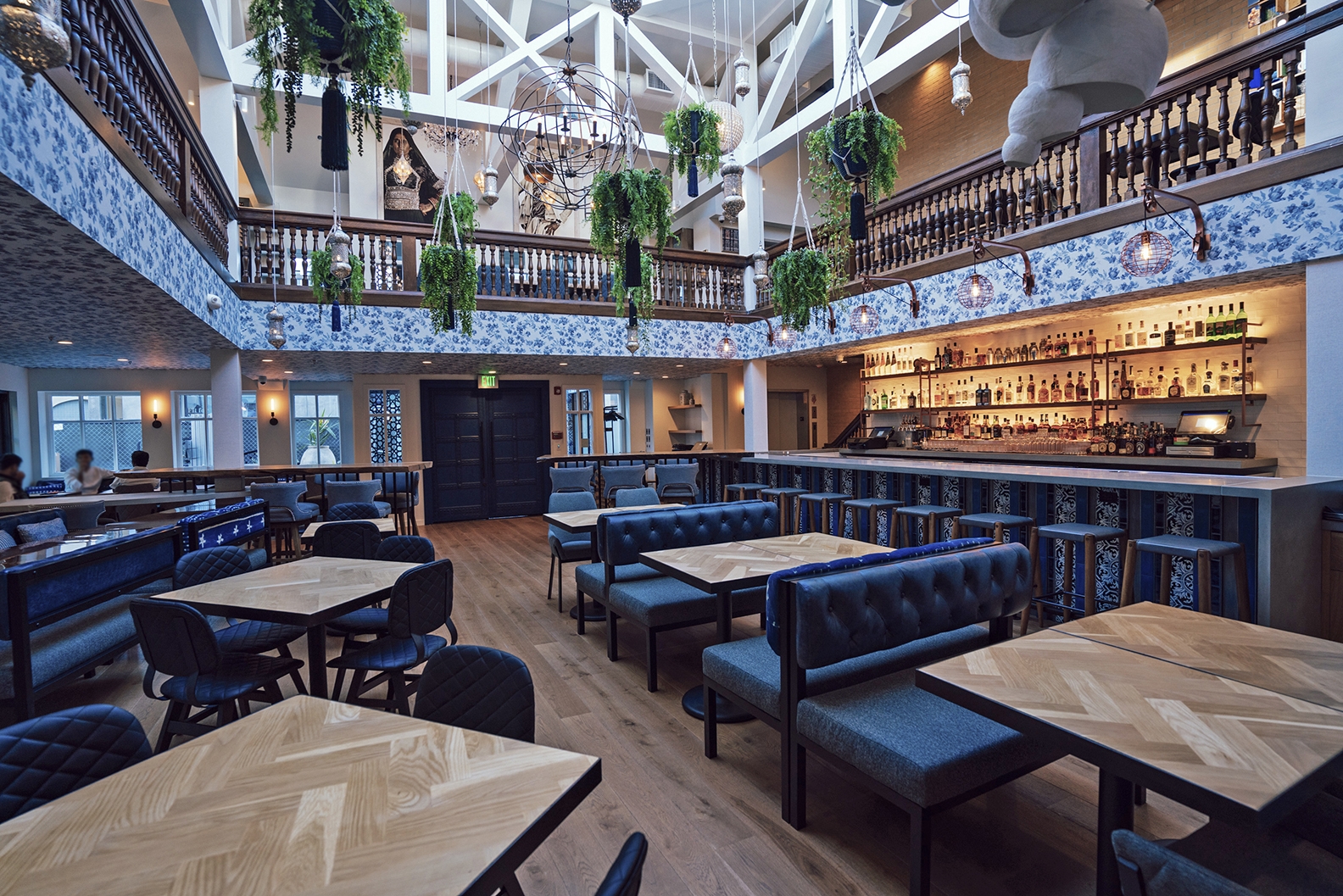 We created a transition from the downtown pedestrian alley into the vintage-inspired interiors is done through a shocking blue entryway. A hand-carved wood door painted a deep indigo blue is surrounded on all sides (including the floor) by random patterned blue and white tiles. An eclectic array of light fixtures, from brass Indian drops to crystal chandeliers, lights your way to the journey ahead.