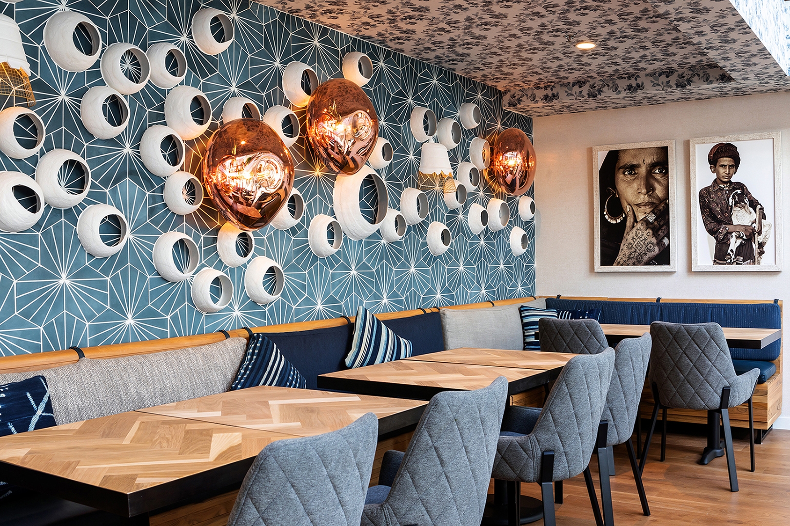 The intention was to design a restaurant that was upscale, yet comfortable enough for people to visit multiple times a month. Our approach was to evoke the senses through color, texture and pattern, while staying true to the deep-rooted heritage found in Indian culture. The indigo colors and textures hint to how the original textiles where dyed and processed generations ago. Combining these elements, along with more refined details, created a truly sophisticated yet welcoming space.
