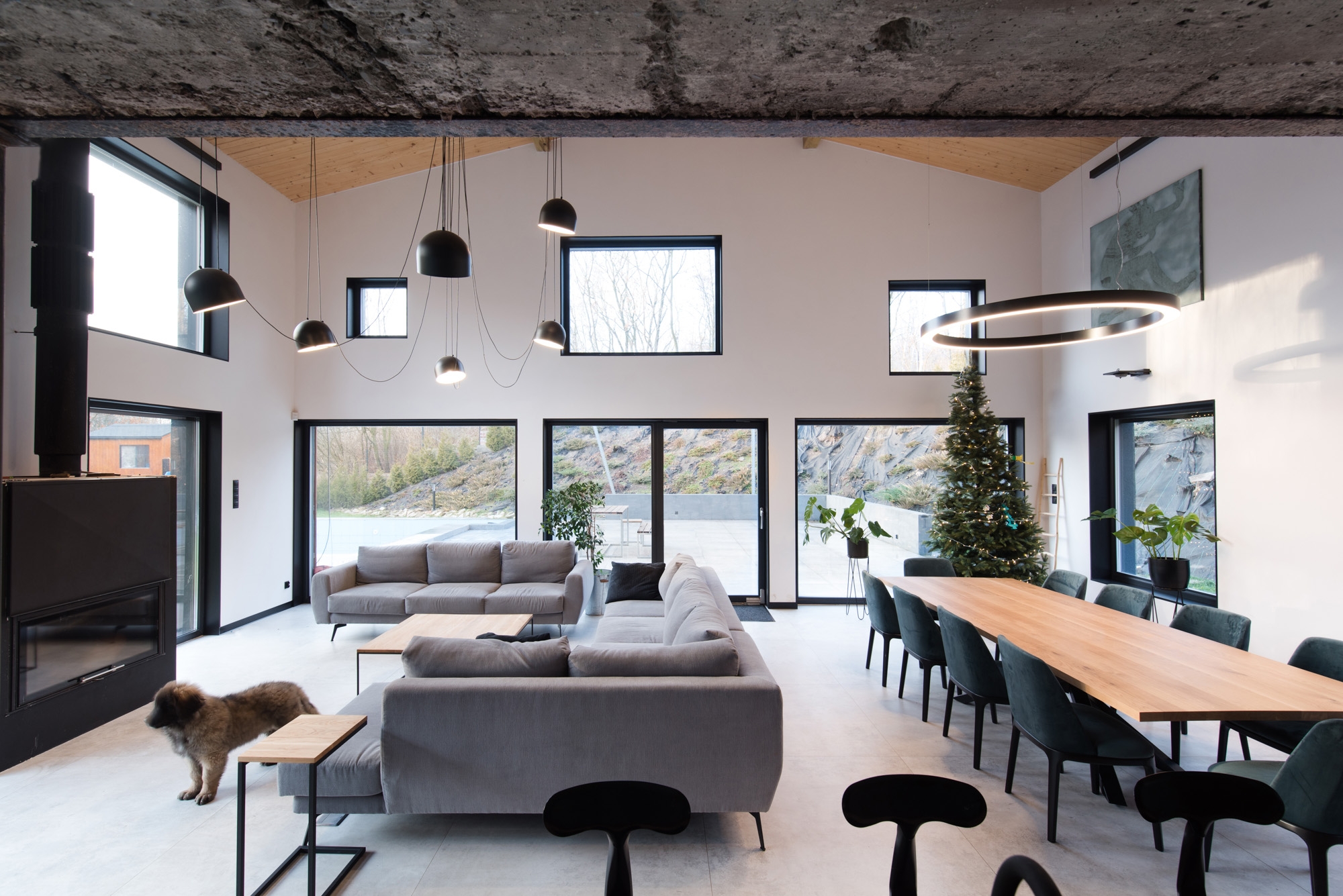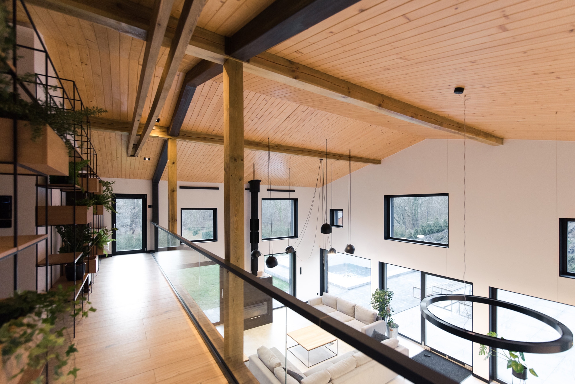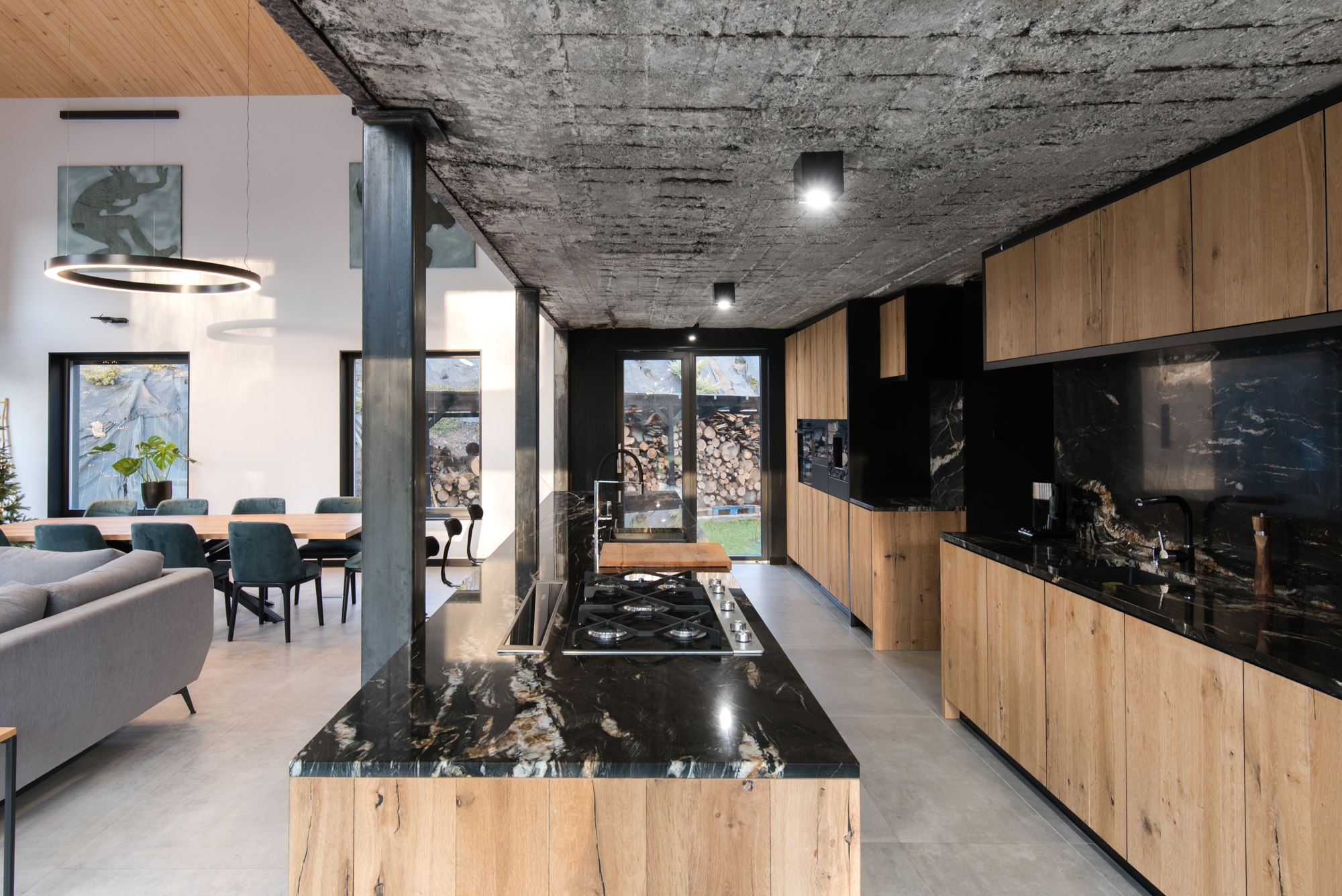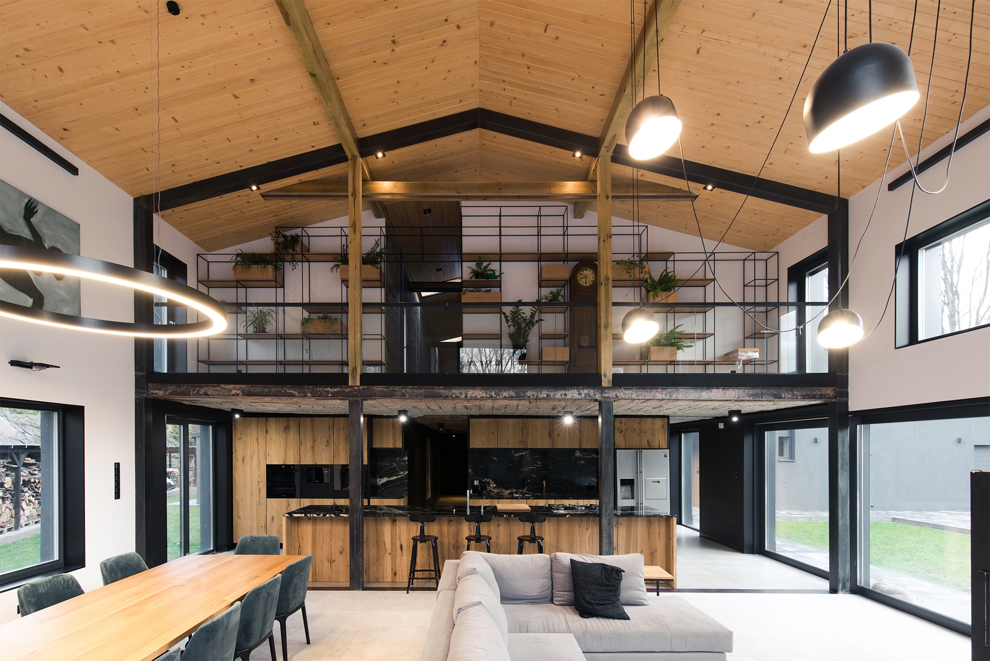 The main structure of the building was shortened by four structural fields, of which two fields formed an external terrace, and another two made room for a double-height living room. The original structure and shape of the barn is clearly visible from the living room, where we have an exact cross-section of the building in the form of a mezzanine.