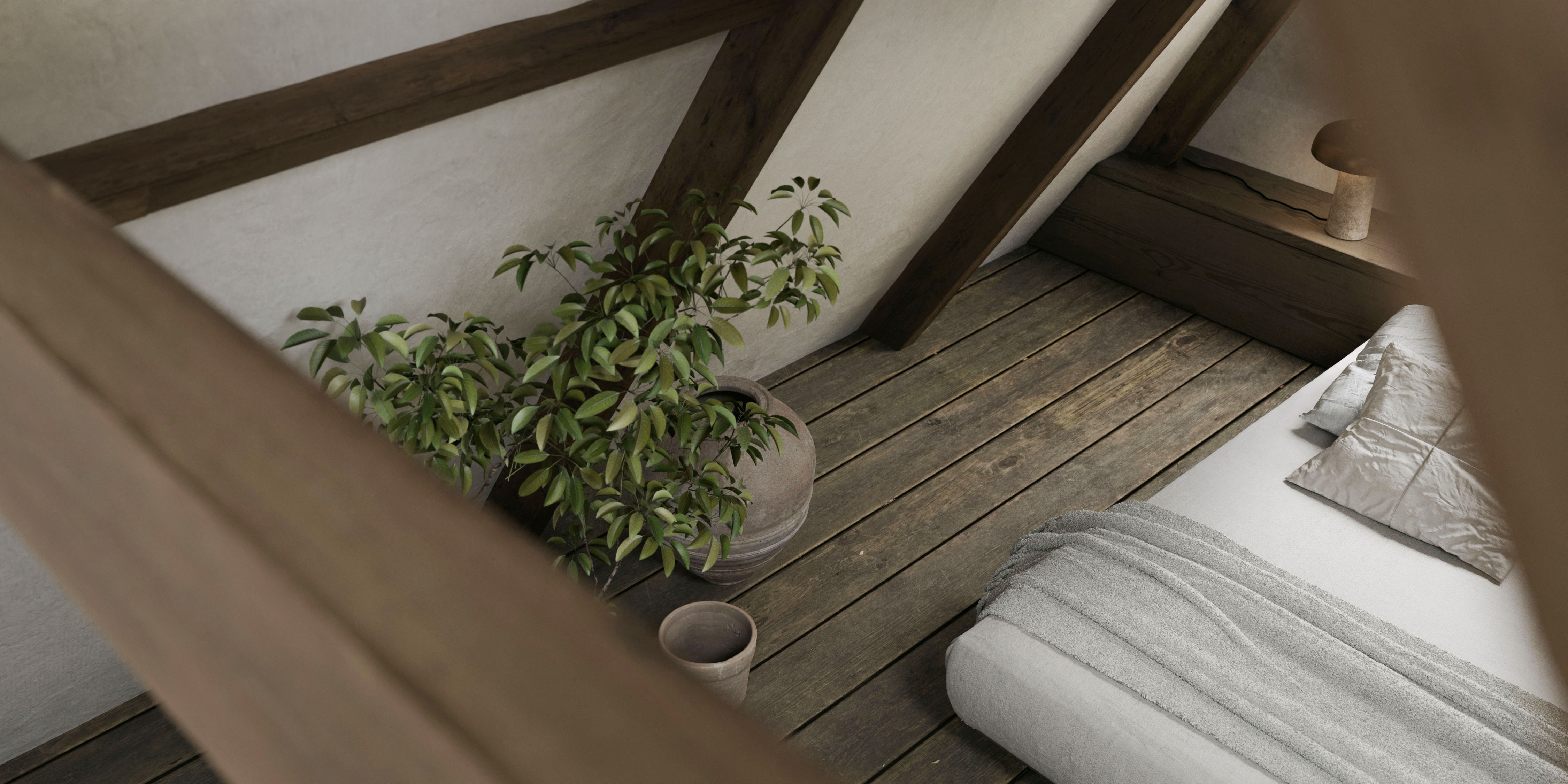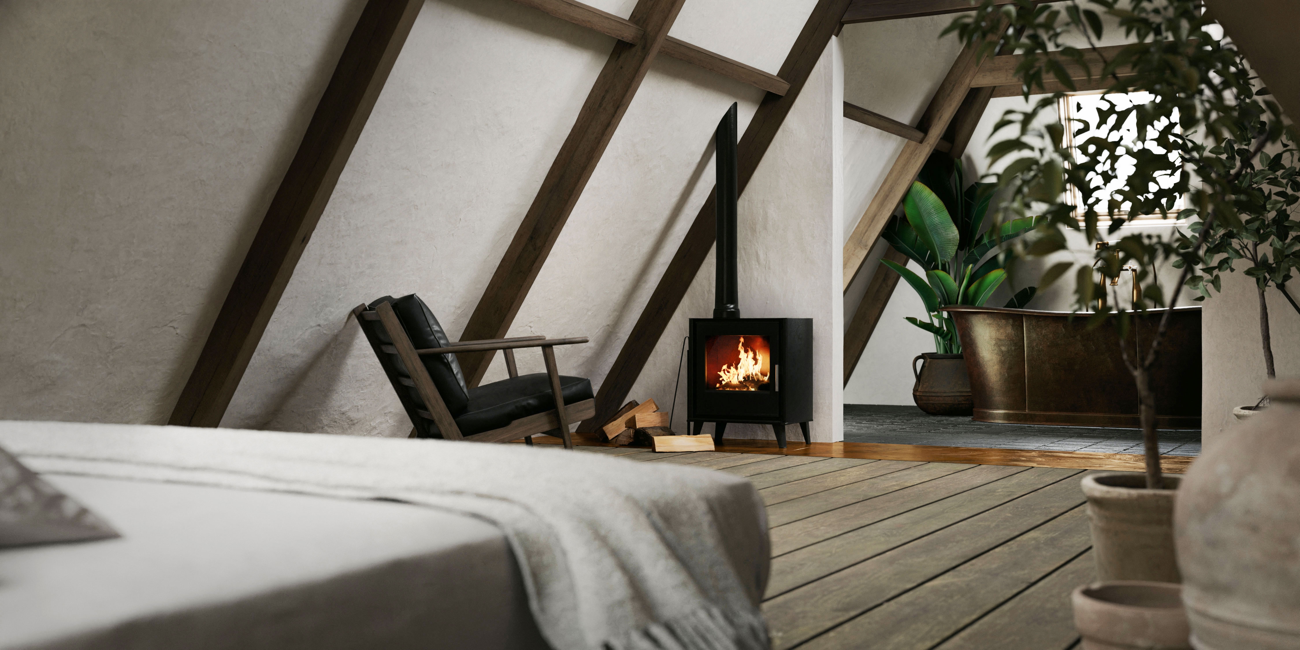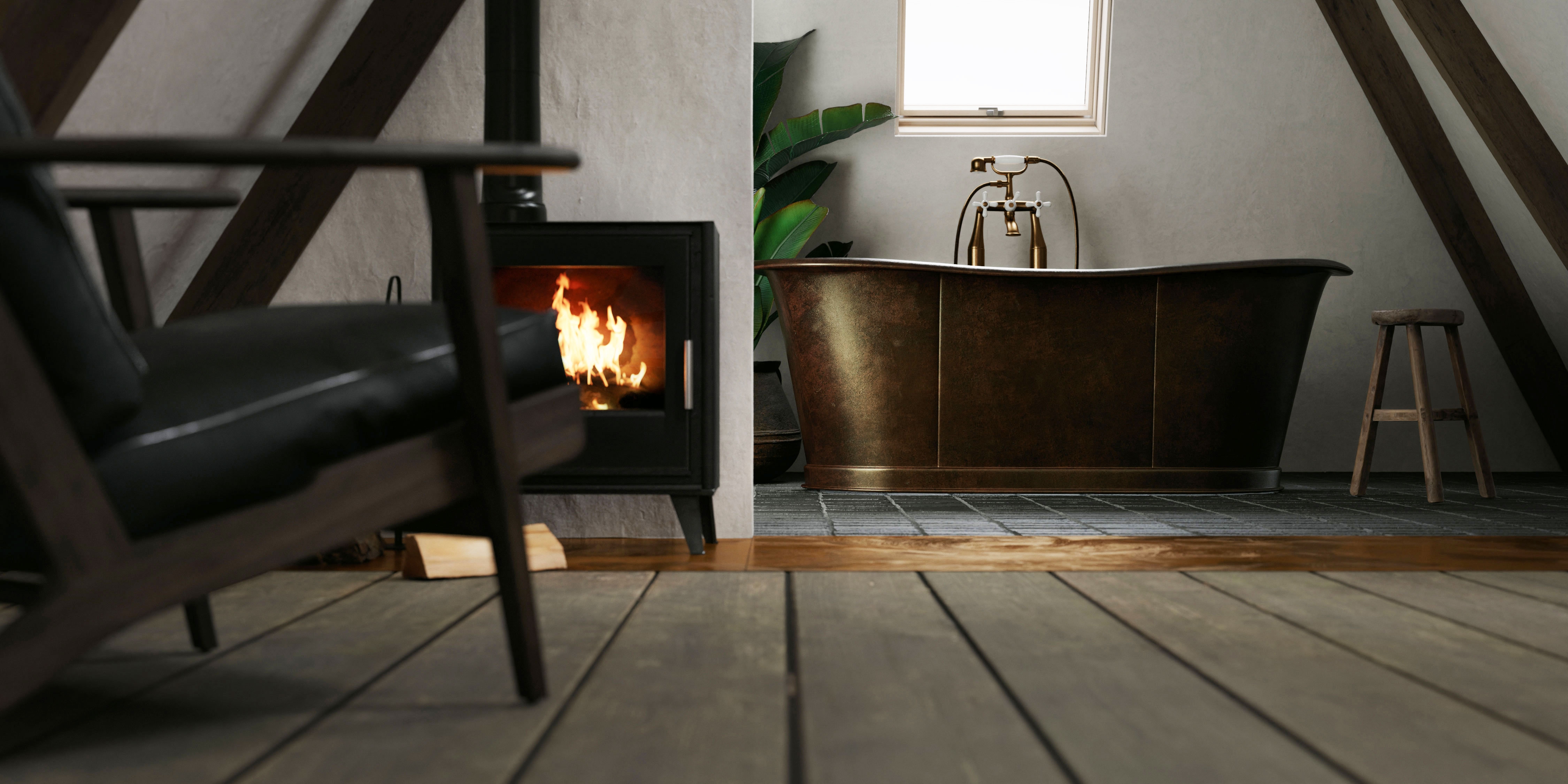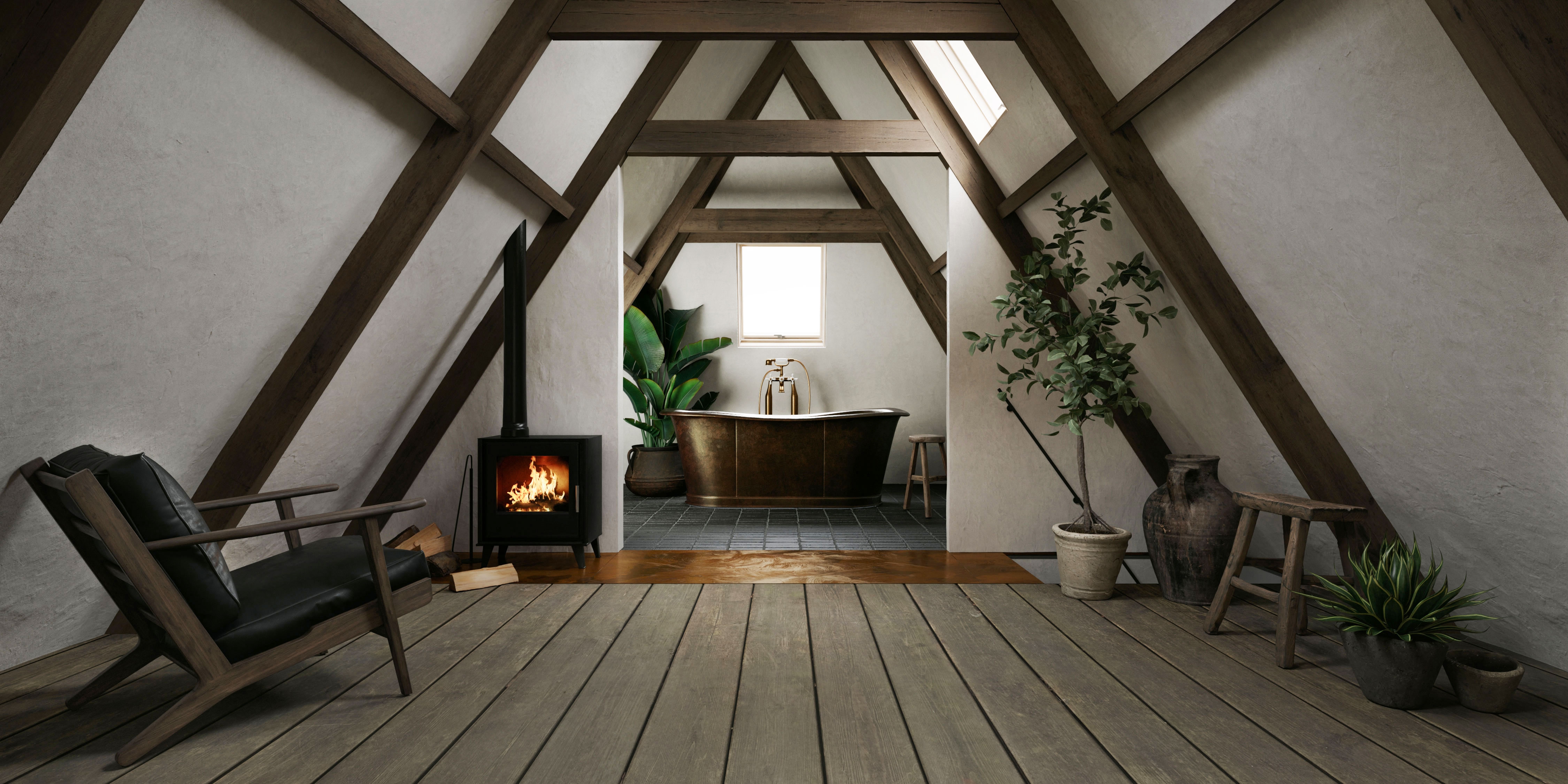An enchanting 18th century building, was the inspirational canvas for MINIMUC to an atmospheric attic bedroom. A long corridor connects the main residence with the ‘Achterhuis’; the back-house. A smaller, separate building made for all the secondary needs. Its unused for years attic, was turned into a bedroom for all the family’s guests. Climbing up the staircase, a little fire corner welcomes you resting on an aged copper slate; an alluring entrance, yet fully protective of the original pine floor. On the left side, a double bed waits for you to recharge. Above it, a large opening makes sure you don’t miss the 800m2 garden view. On the right, her majesty; an antique brass bathtub standing audacious in the middle of a blue stone covered floor. The space offers a journey through time. The eclectic interior acts as a refreshing trimming to the aged building. With respect to the 18th century building’s heritage, intact remain all the original materials. The new additions were selected with sustainability in mind. Design choices imbue a sense of serenity and simplicity, formulating an emotional environment. The originality of the space speaks for itself; we just had to mute the noise.