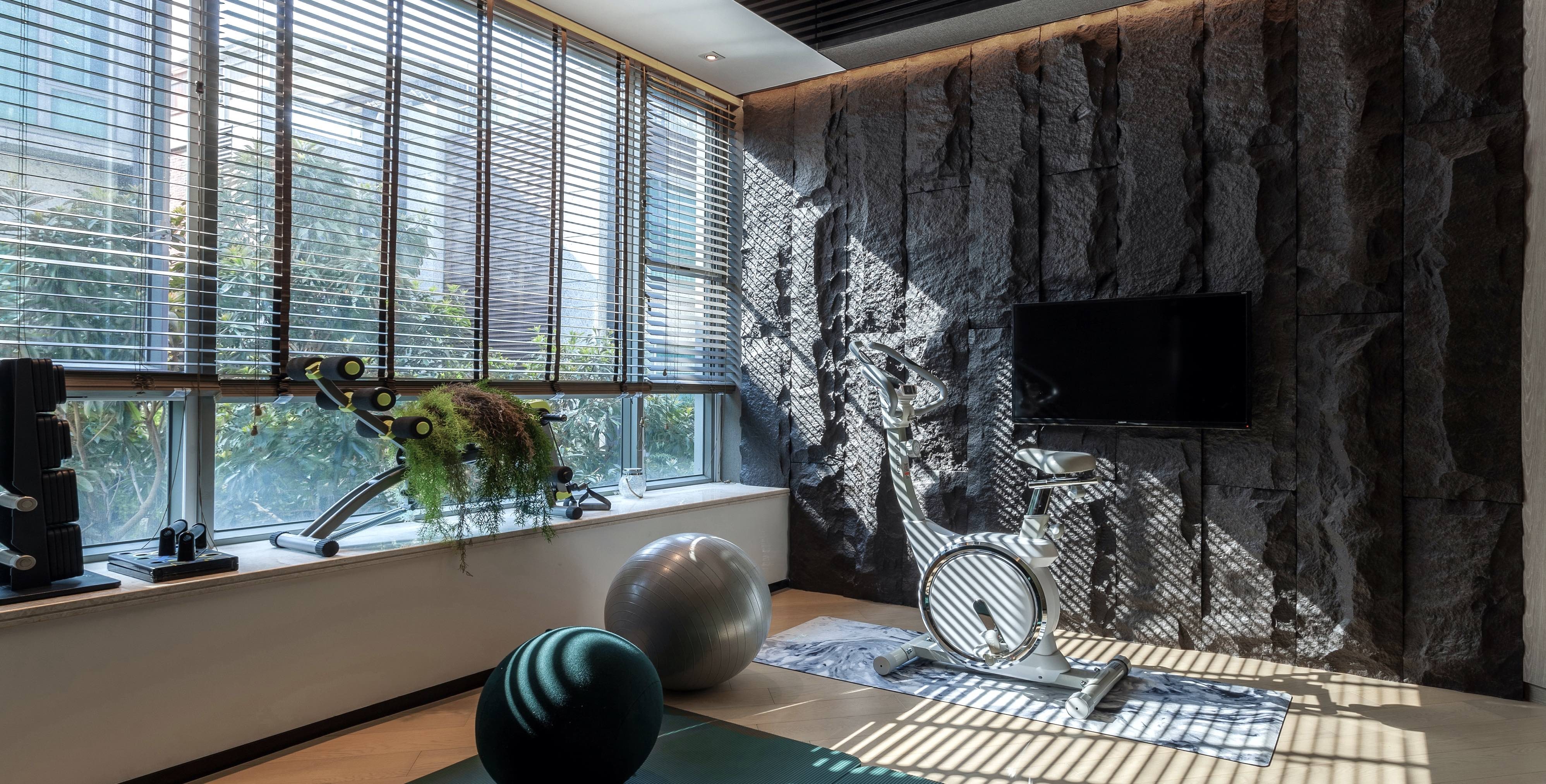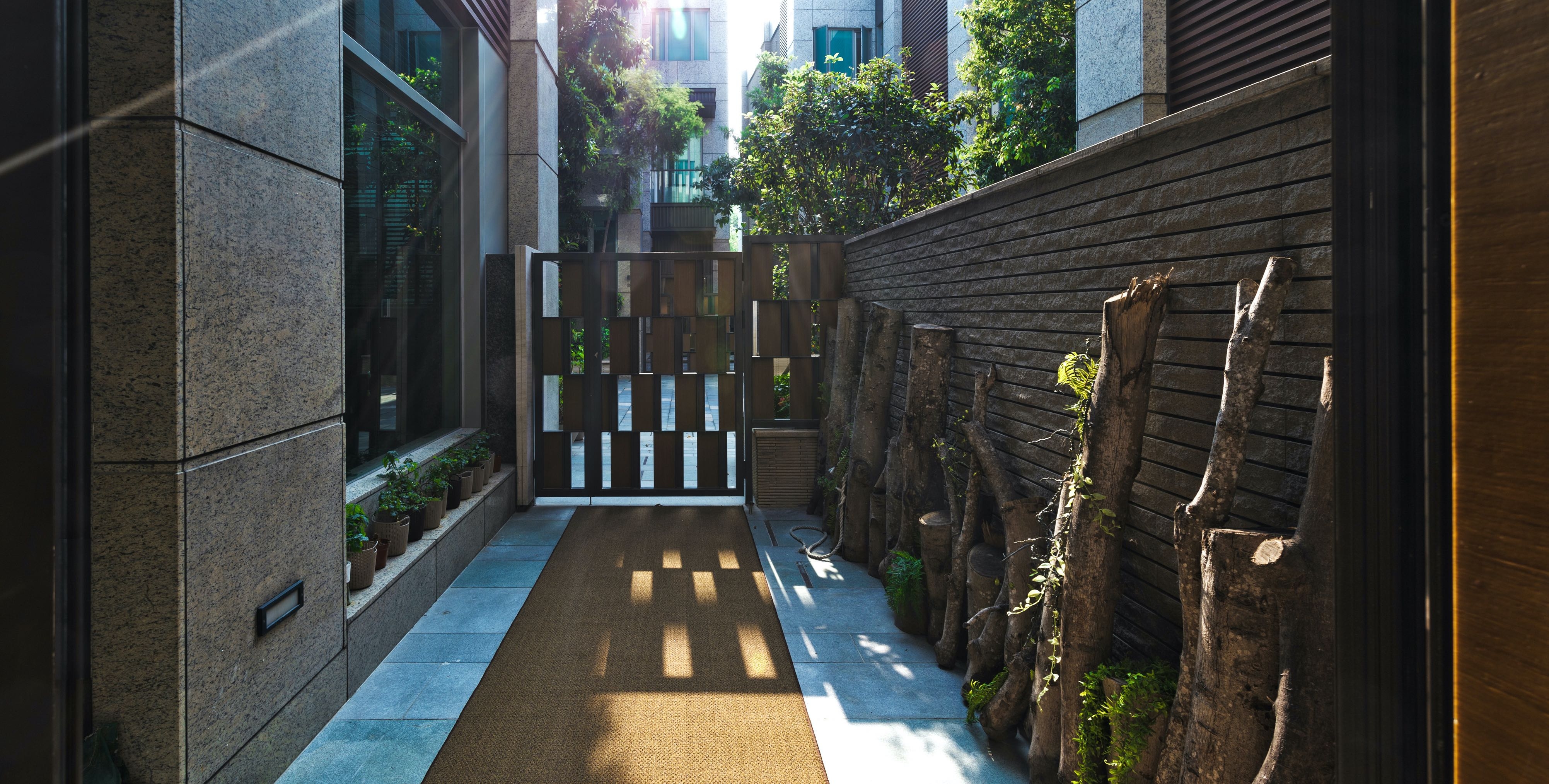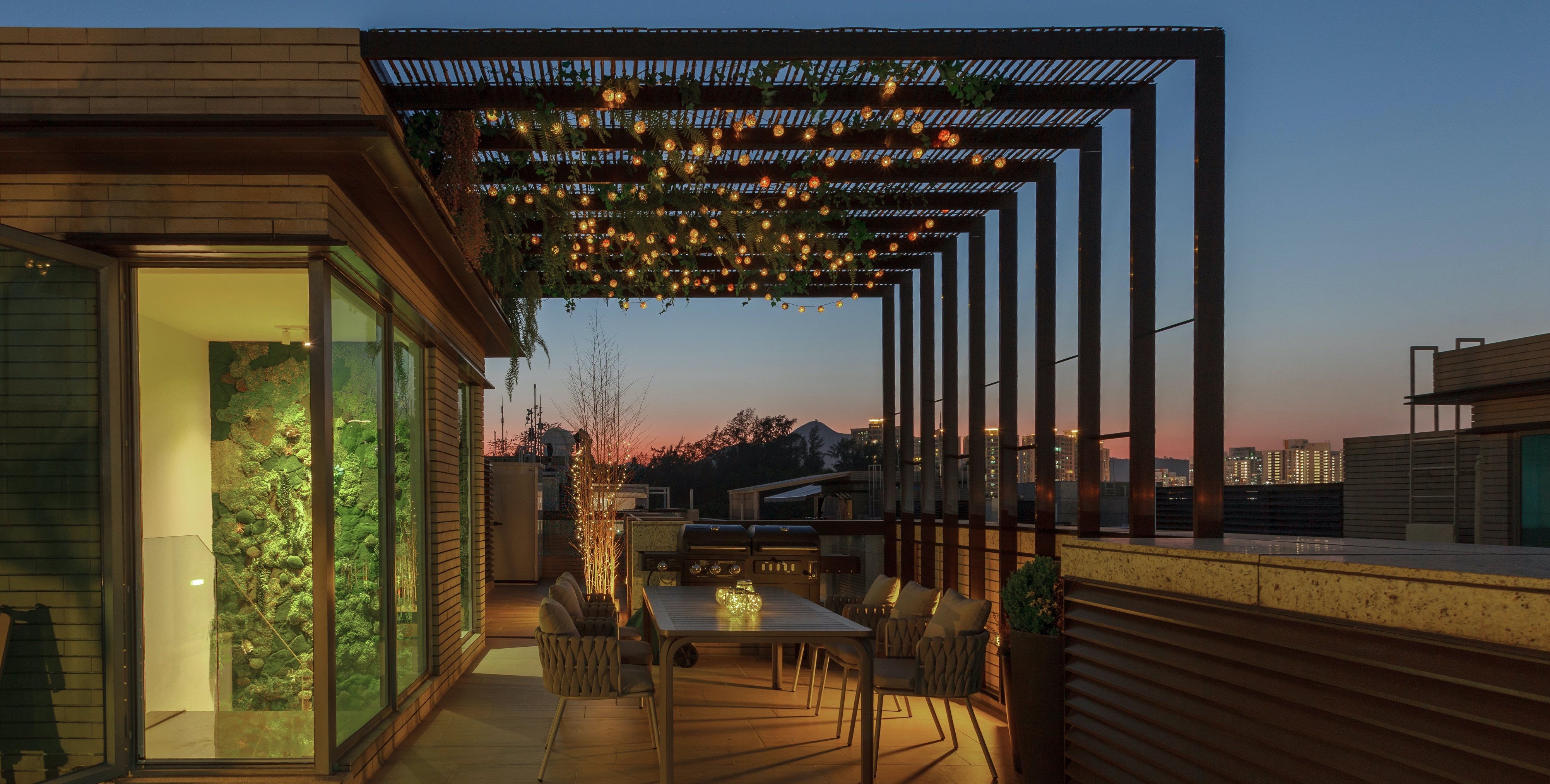 Leafy deep turtle green used throughout the master bedroom suit, where is complemented with a linen cane chestnut cabinets. Consistent with nature ethos, second bedroom suits conscientiously selecting earthy colours. The roof terrace and garden were spreading the shades of foliage. Taking cues from the surrounding mountain, adding vine-knitted frames, grass and pot-plants soothe the soul.