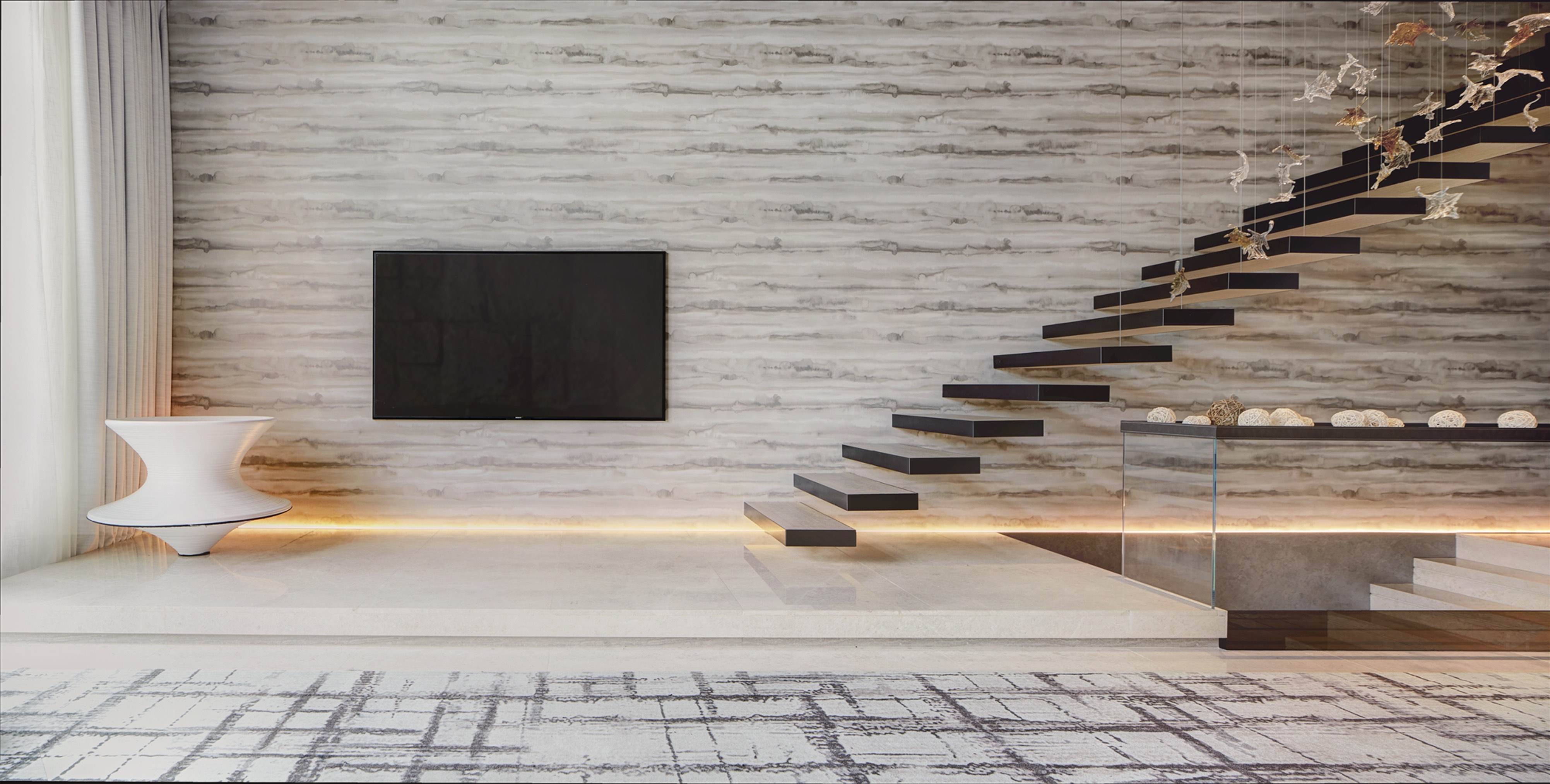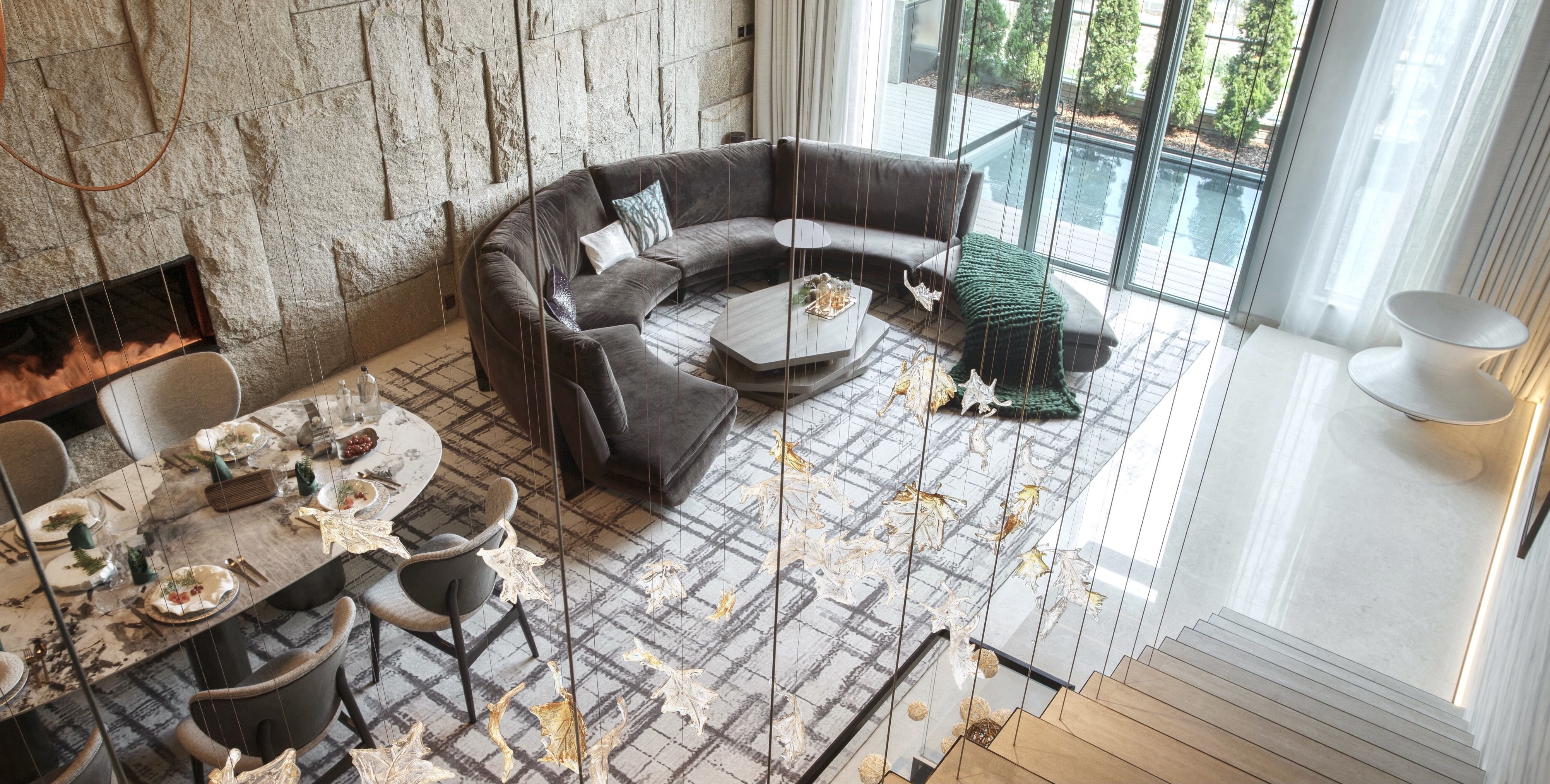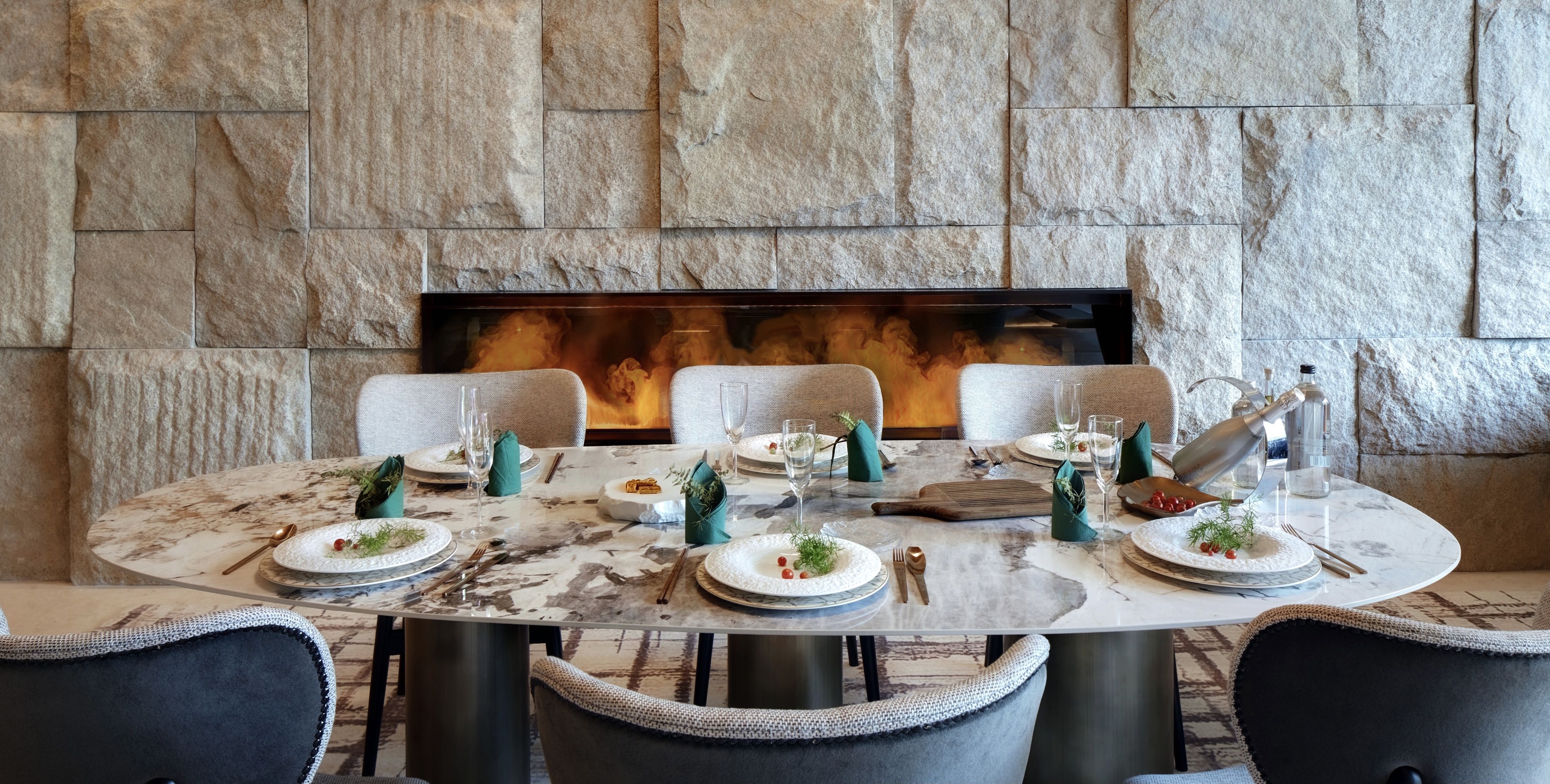 Main Dining room and living room at the ground floor, furnished with rich texture expose stonewall with a Nordic London-green rug and an electric steam fireplace as feature. The seamless marble-like dining table and customised giant curvely couch keeps guests cosy and relaxed.